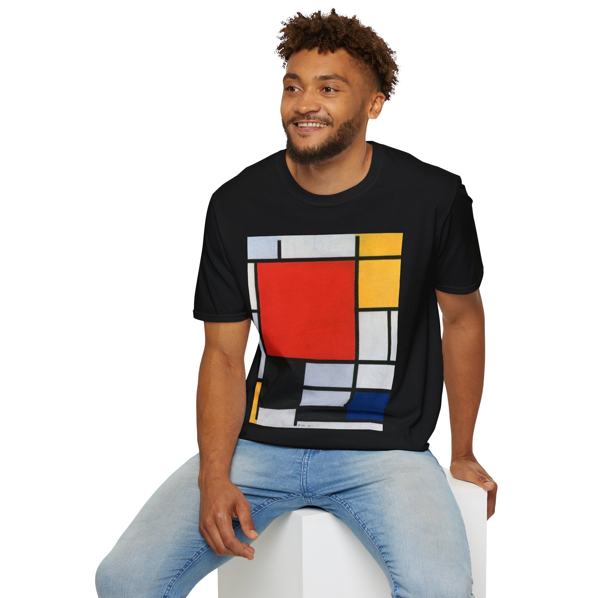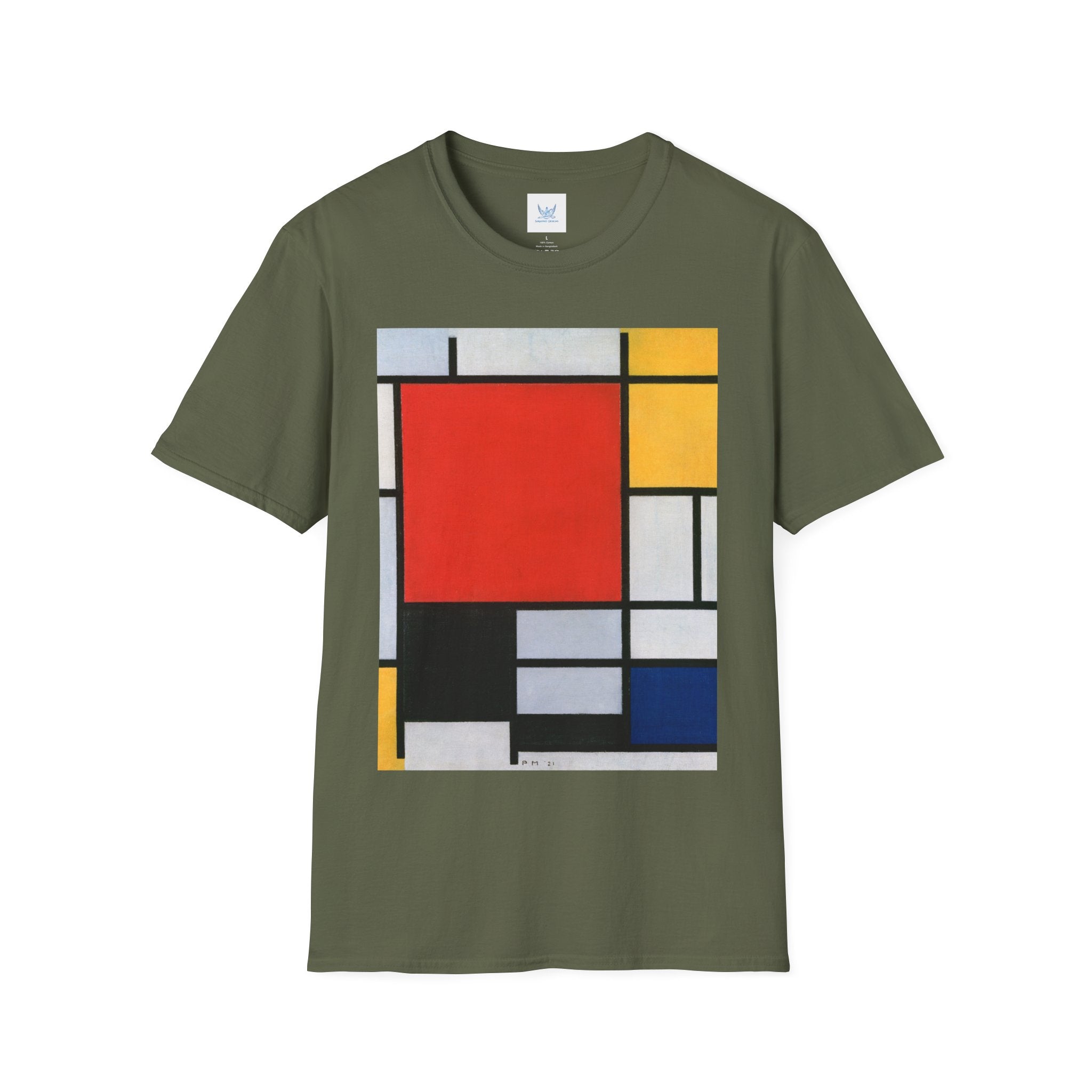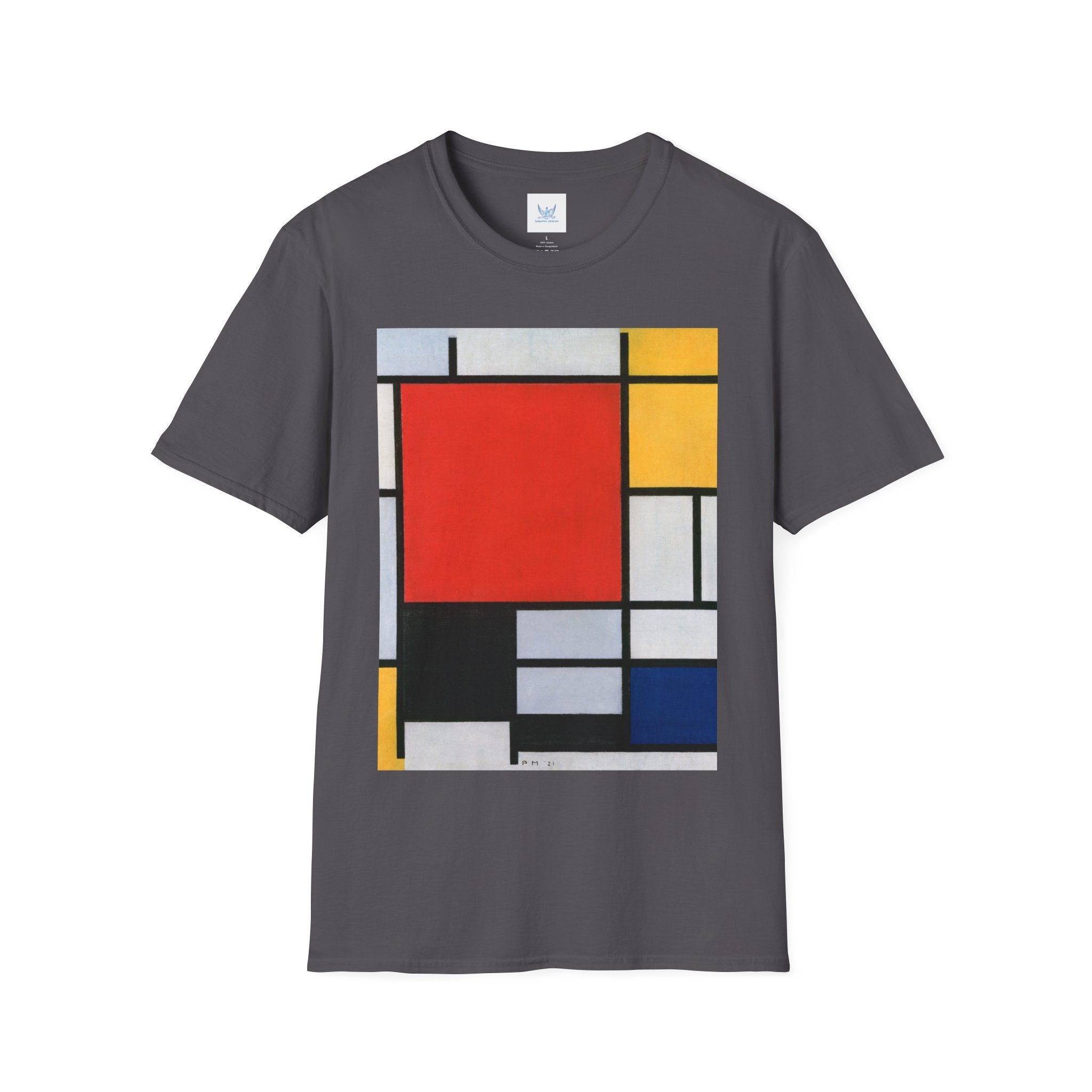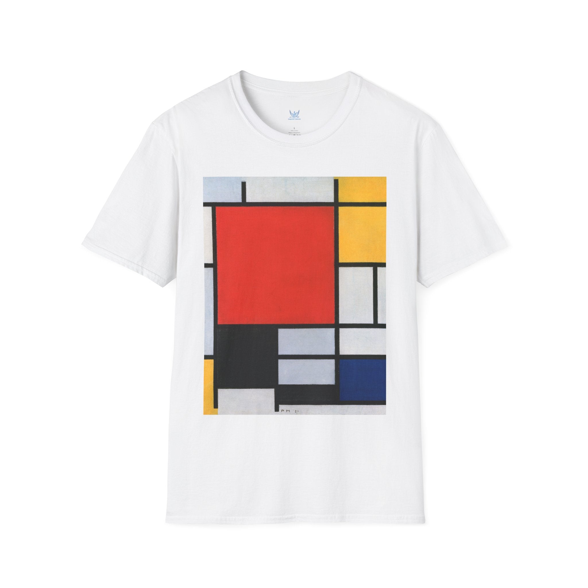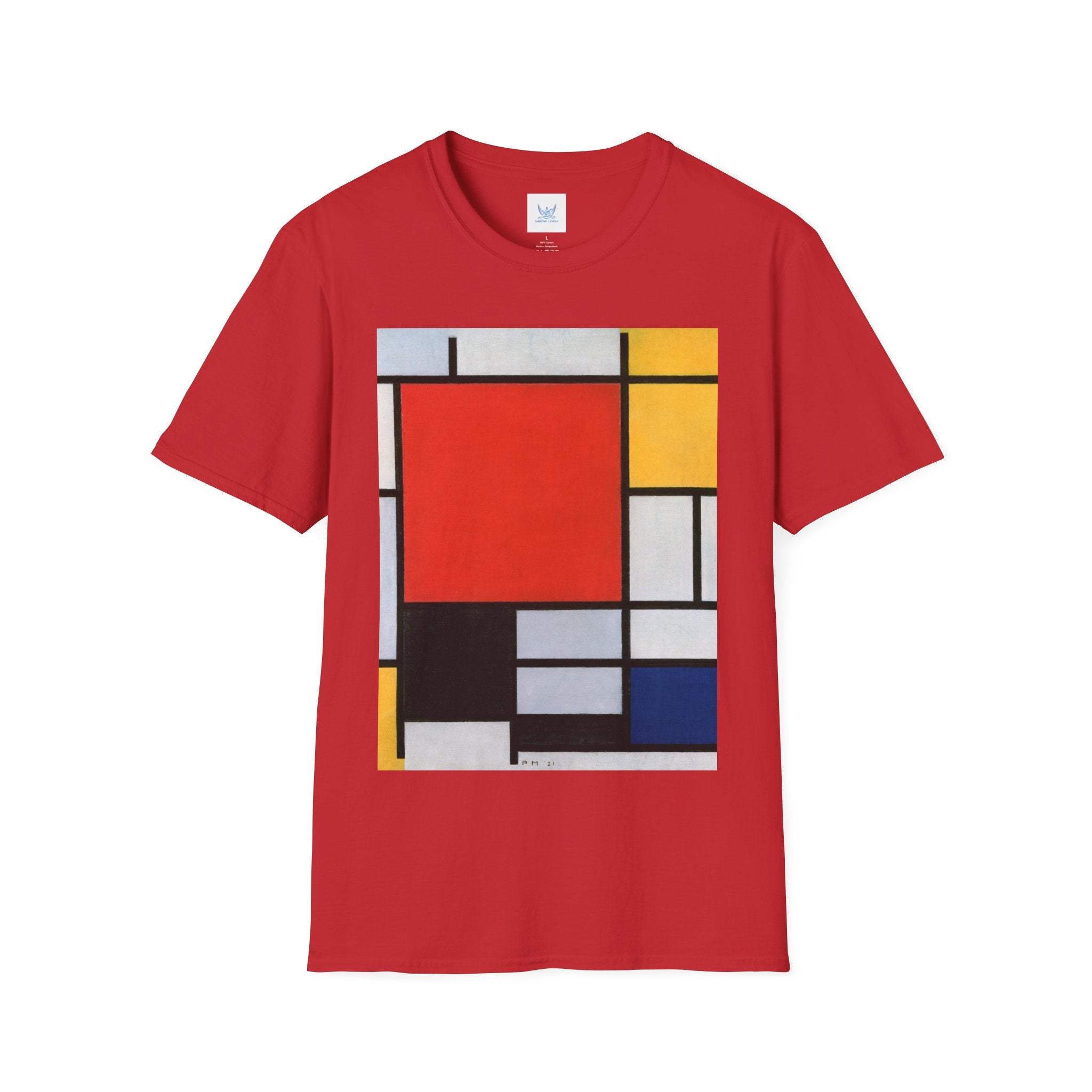 Composition with Red, Yellow, Blue, and Black Softstyle T-Shirt offers a wearable tribute to Mondrian’s genius — a perfect blend of art, balance, and style.