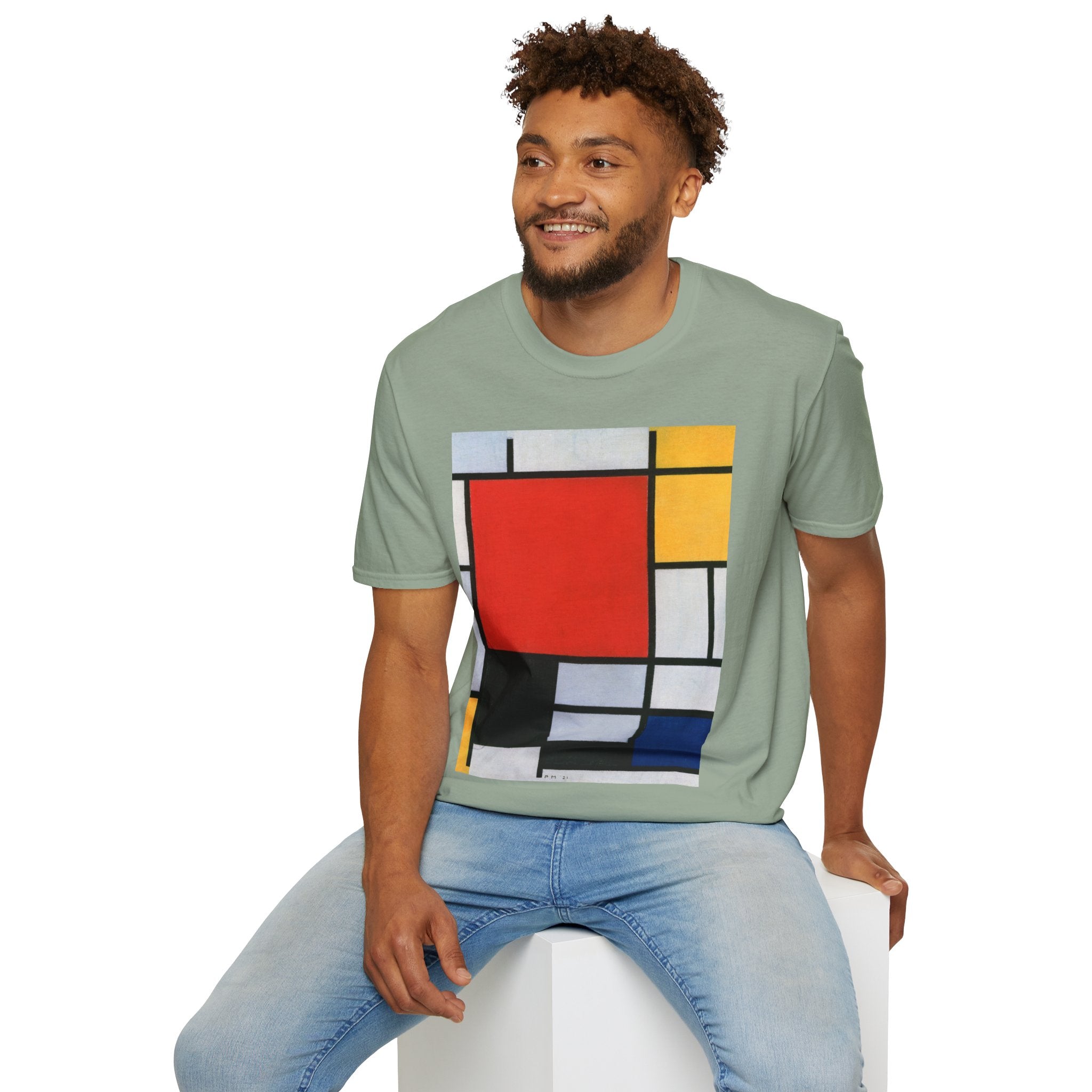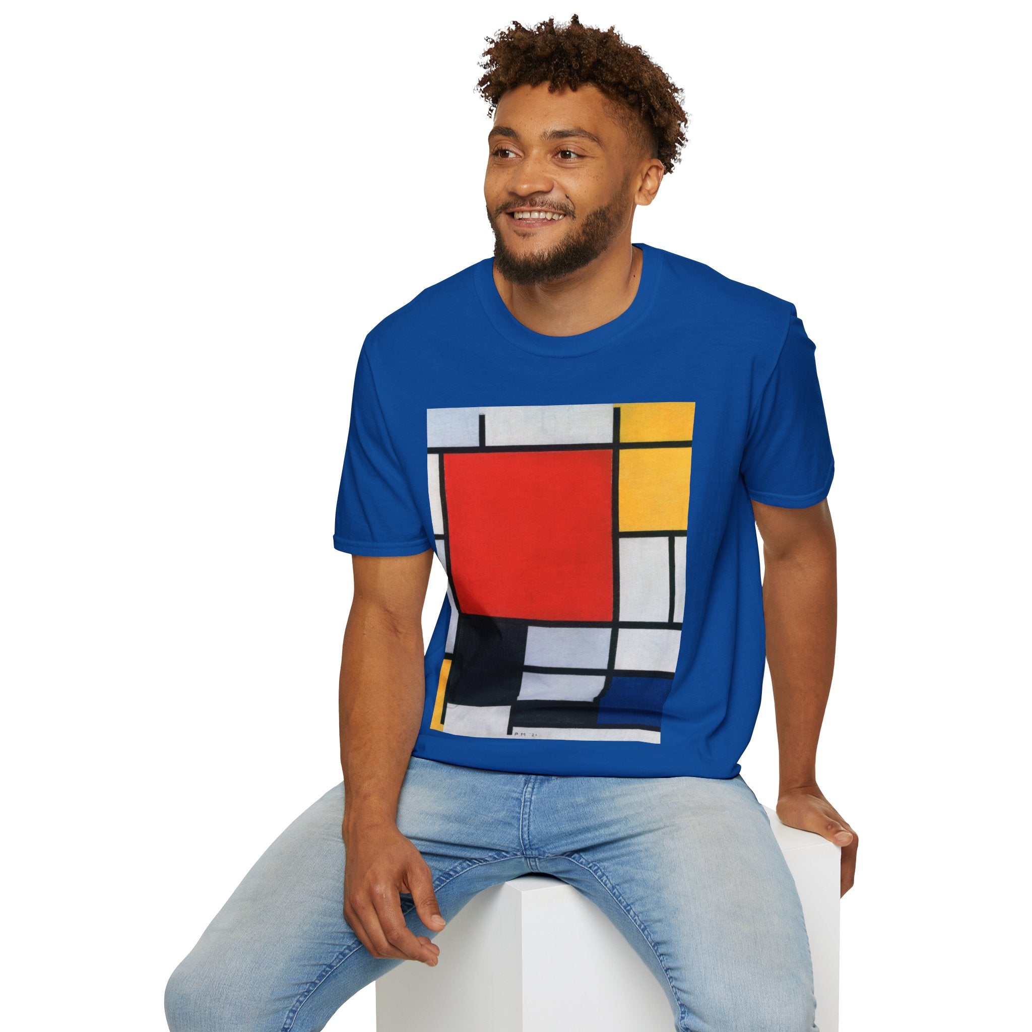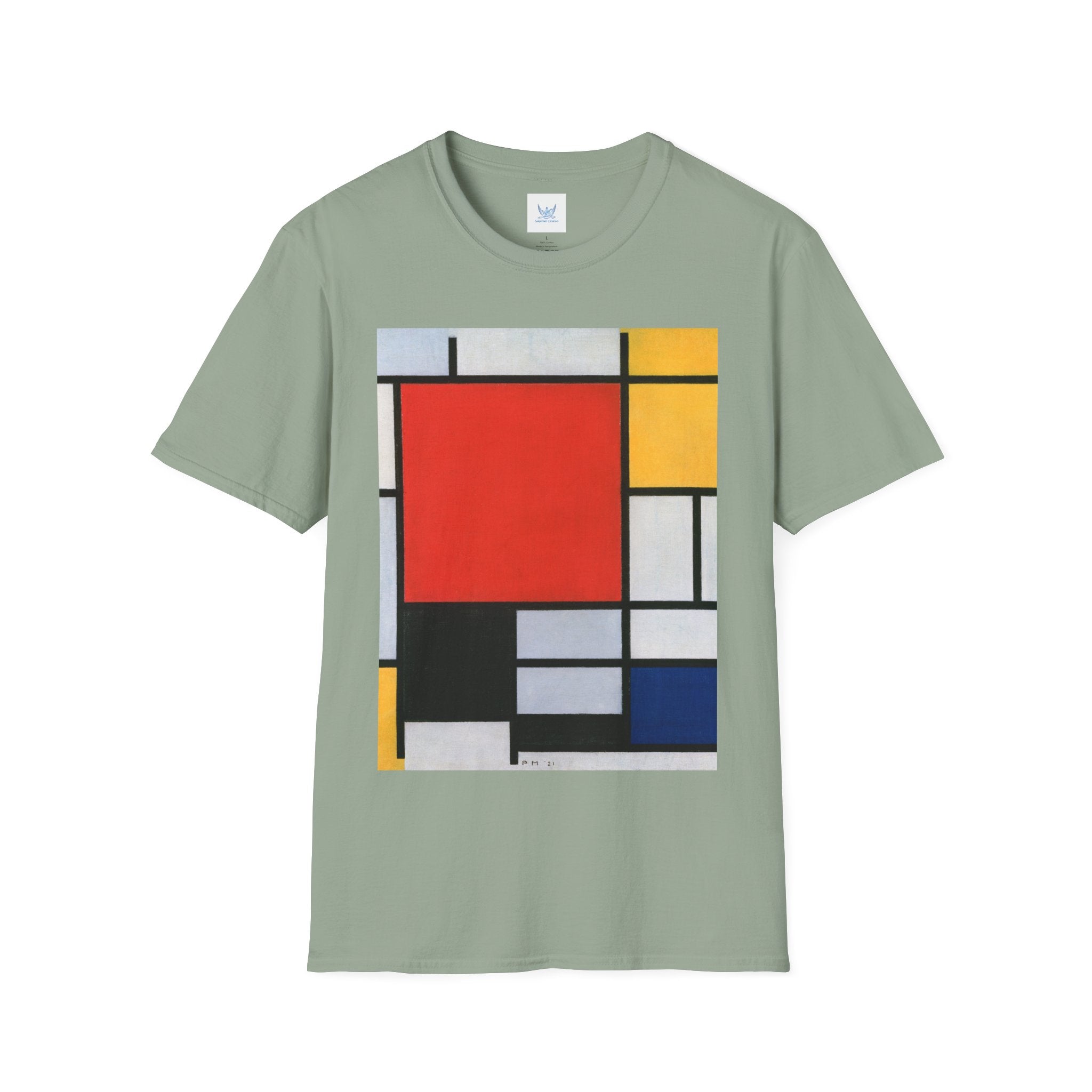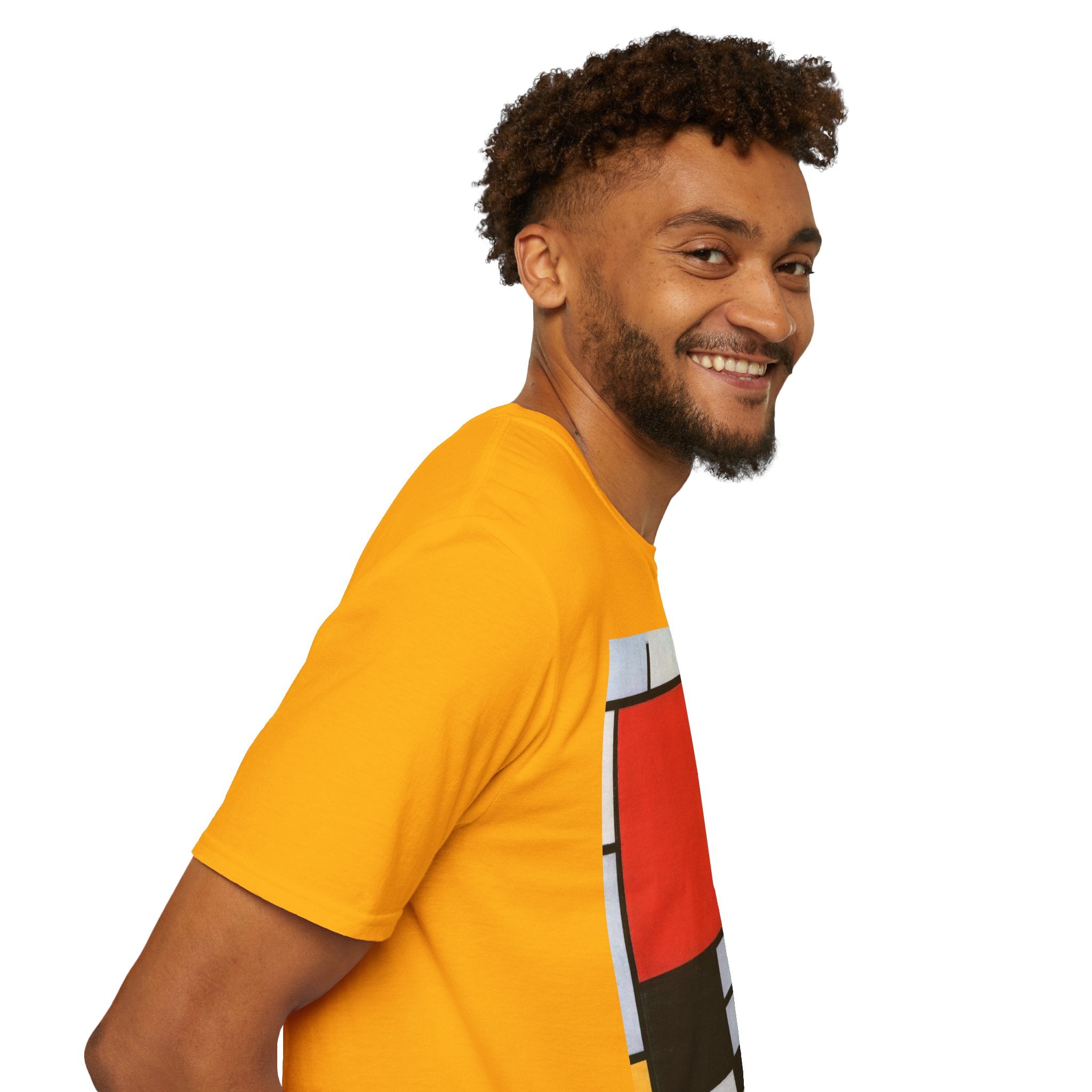 Composition with Red, Yellow, Blue, and Black Softstyle T-Shirt offers a wearable tribute to Mondrian’s genius — a perfect blend of art, balance, and style.