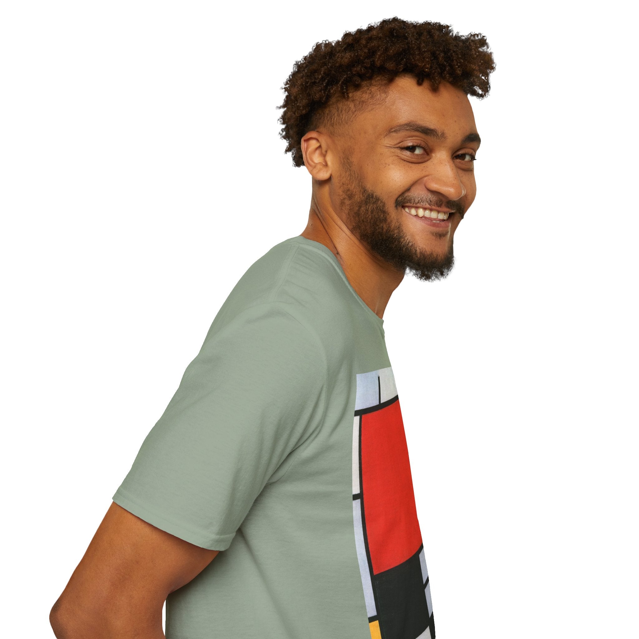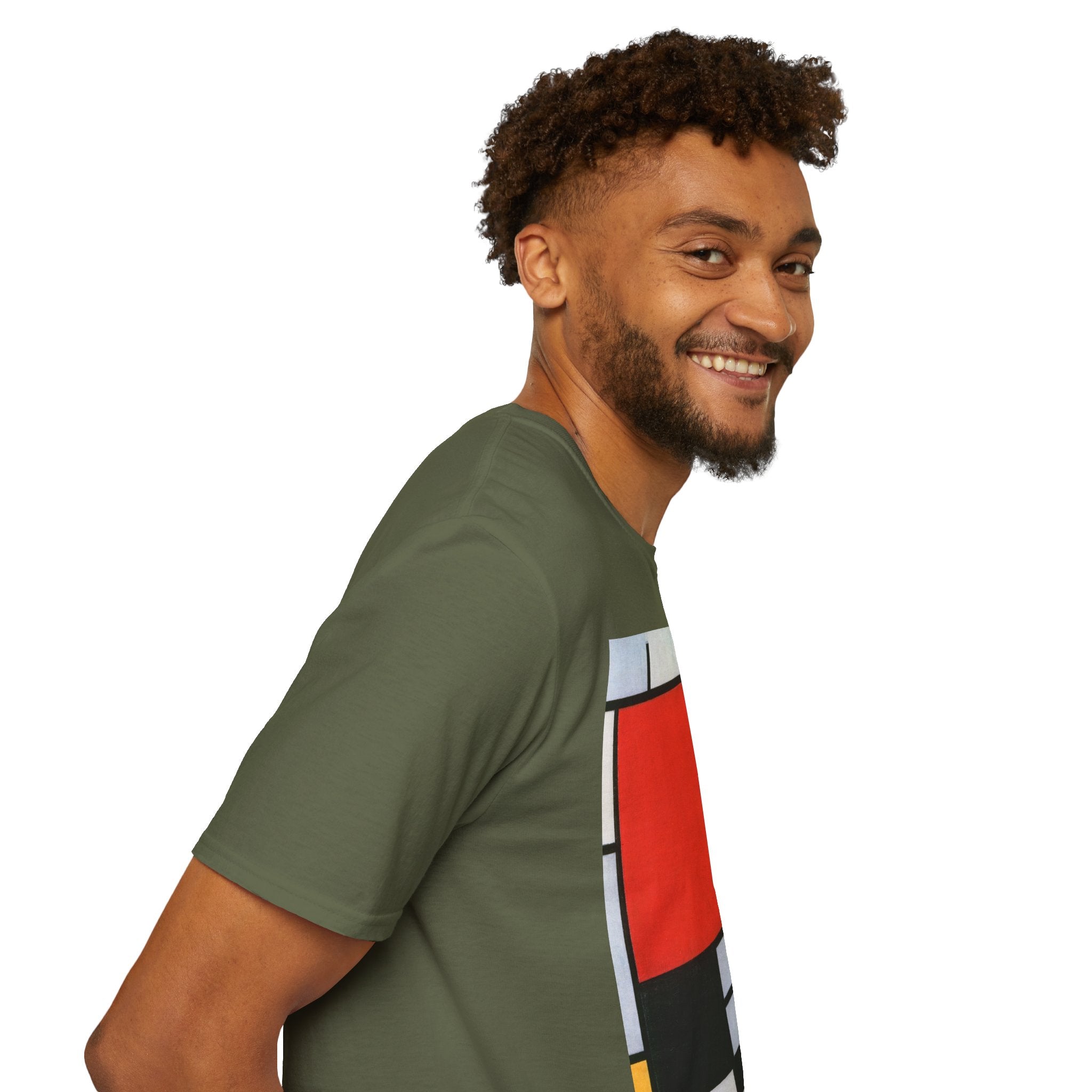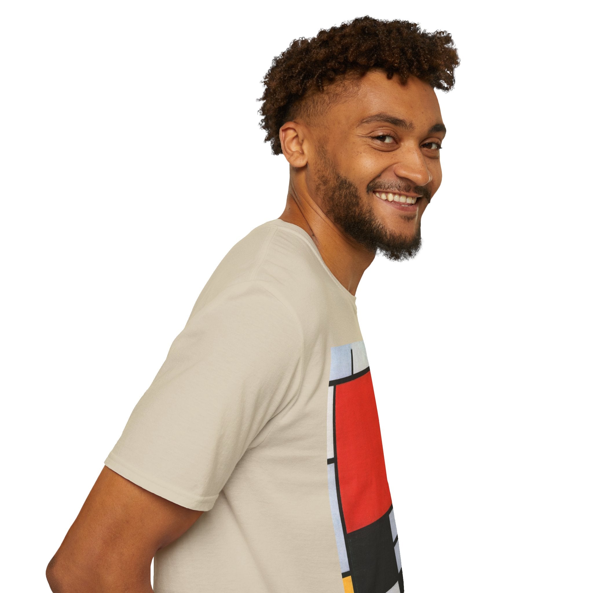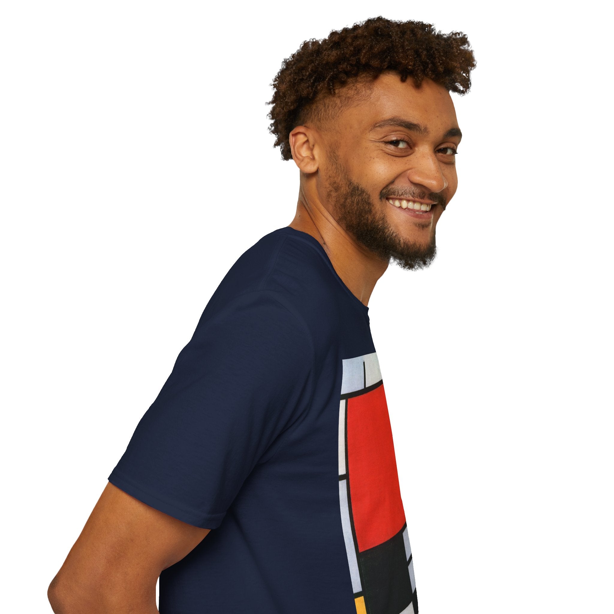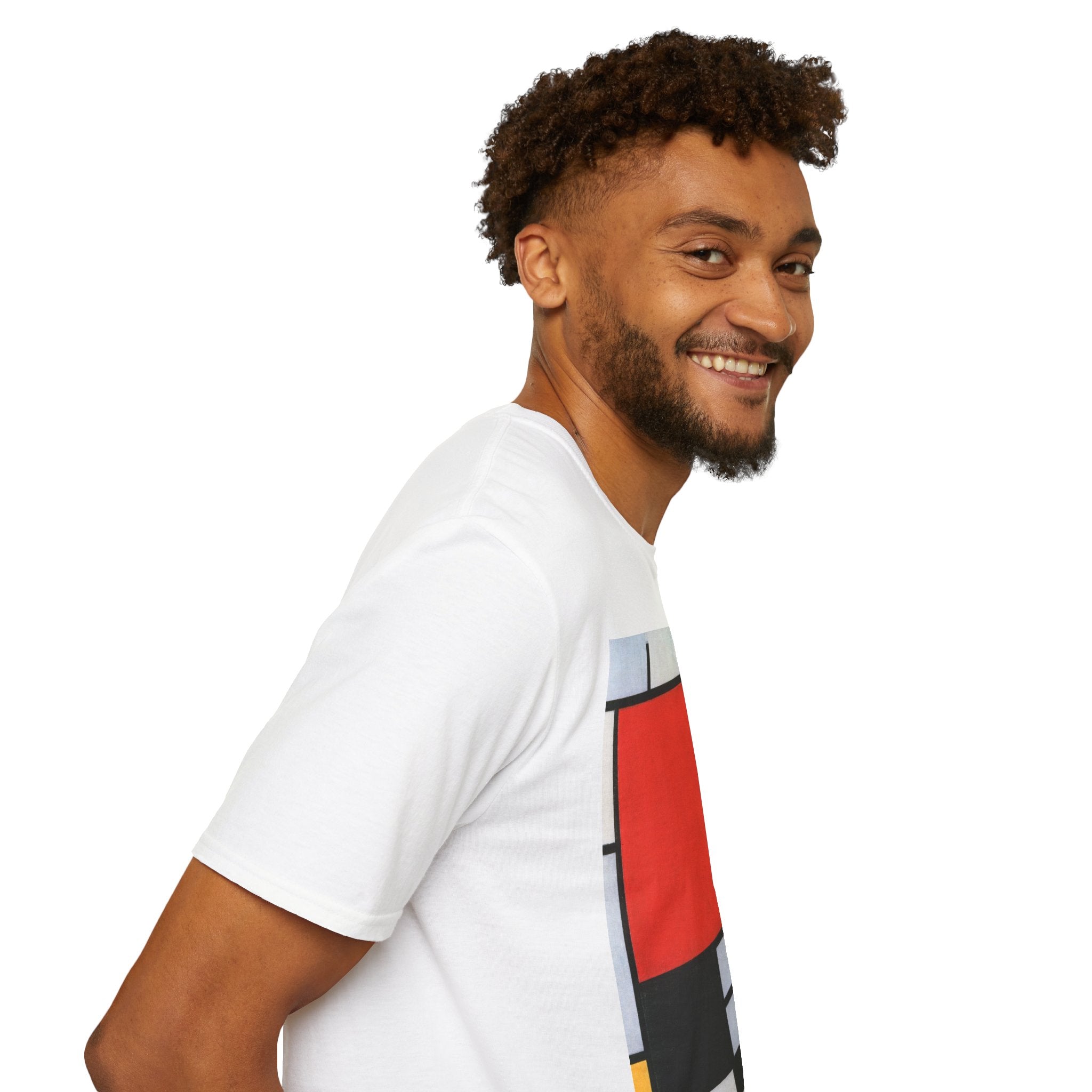 Composition with Red, Yellow, Blue, and Black Softstyle T-Shirt offers a wearable tribute to Mondrian’s genius — a perfect blend of art, balance, and style.