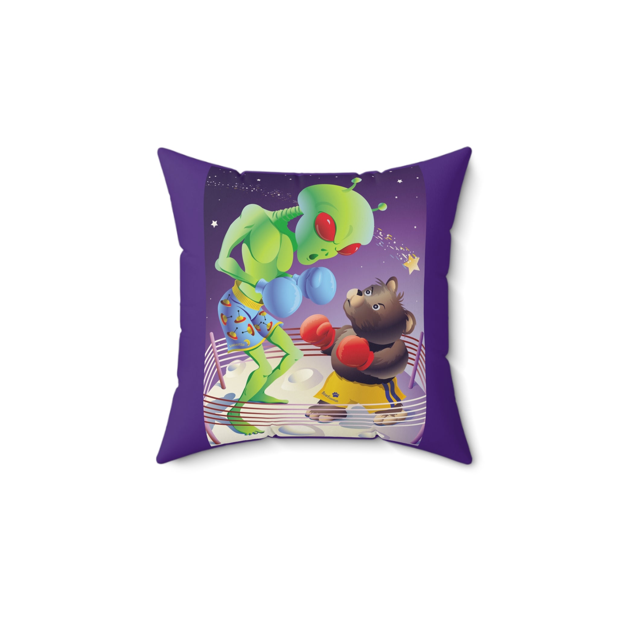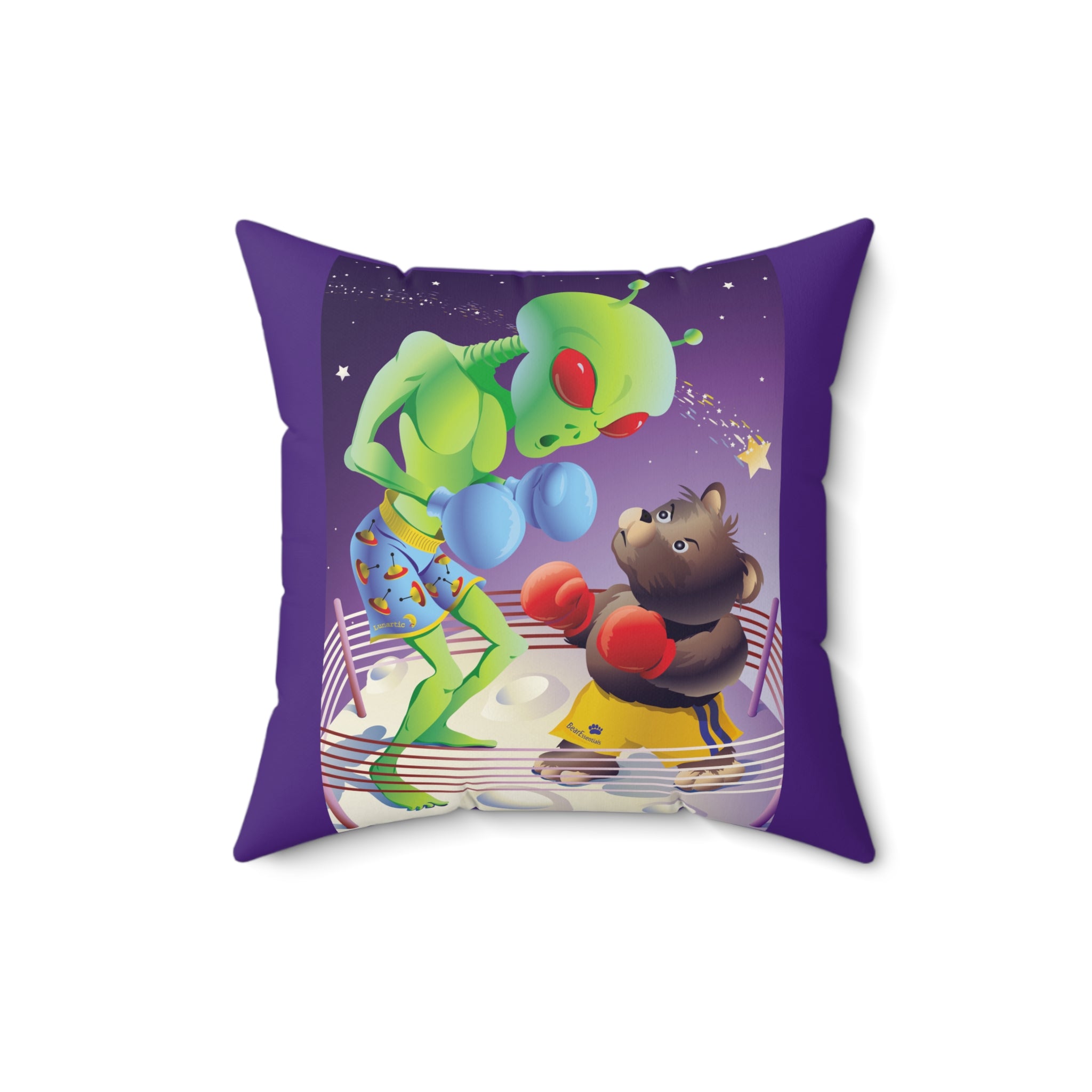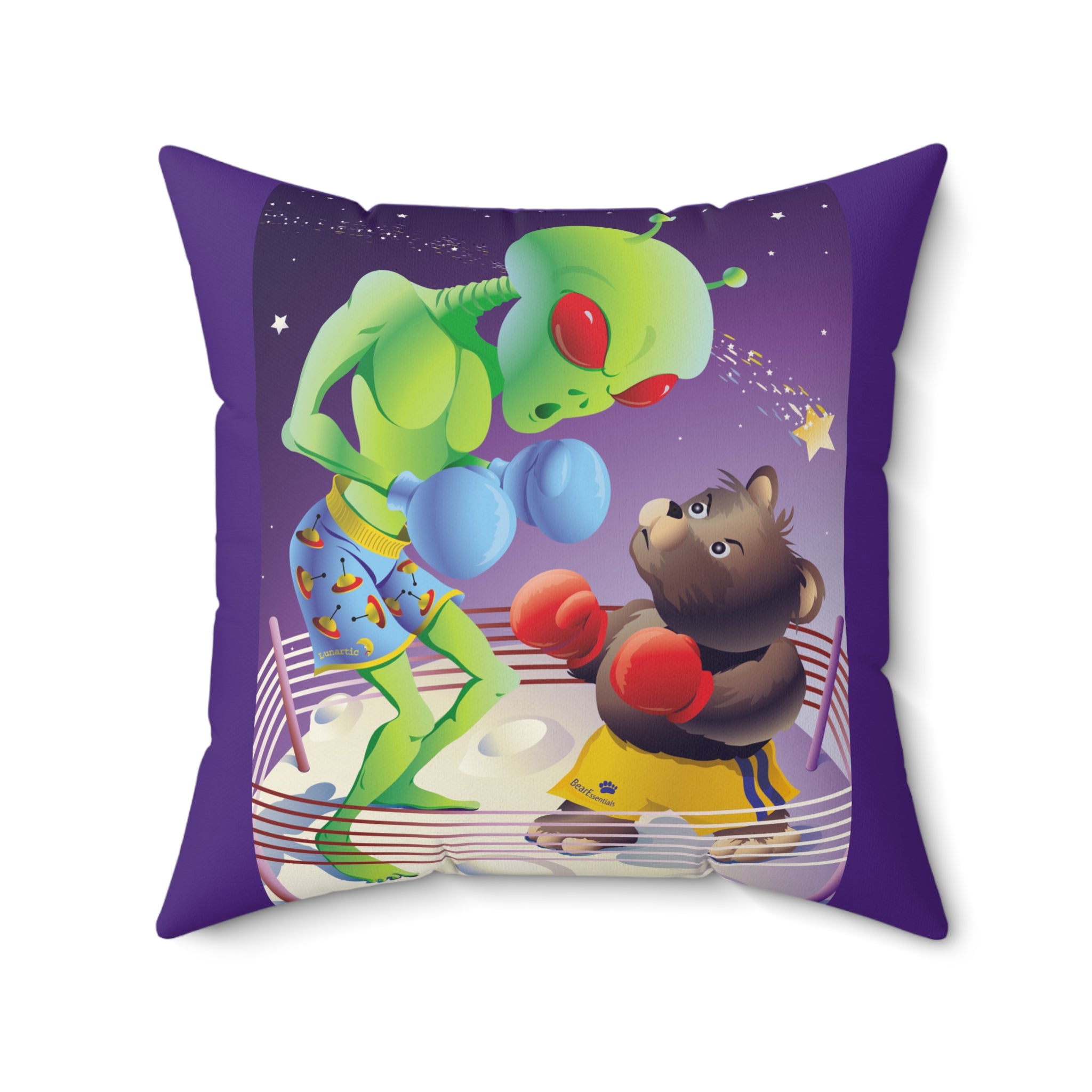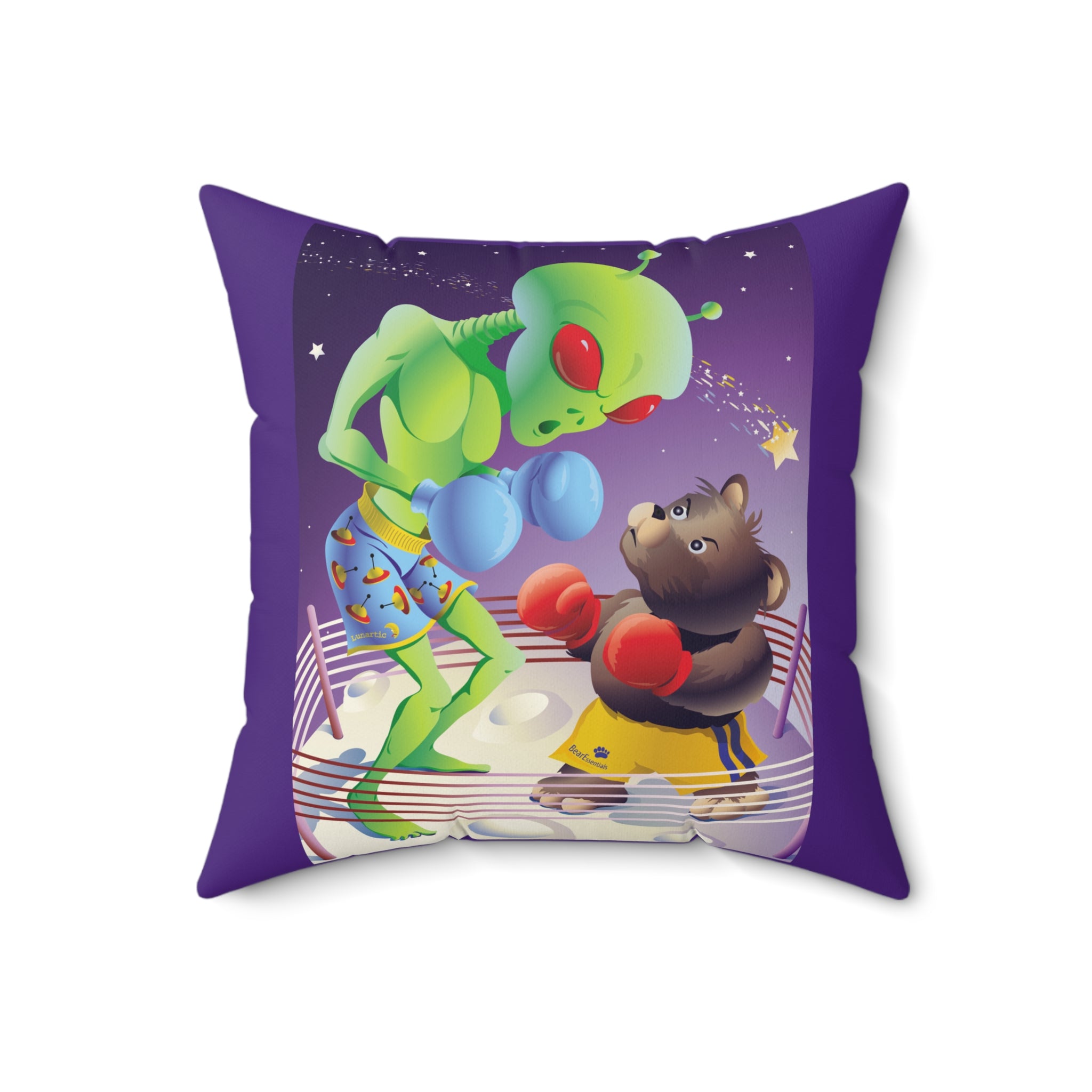Artwork created, designed and digitally remastered by Sarasvati Designs. This bold, modern, and vibrant artwork showcases a captivating scene set in outer space, featuring an alien and a bear boxing in a ring.