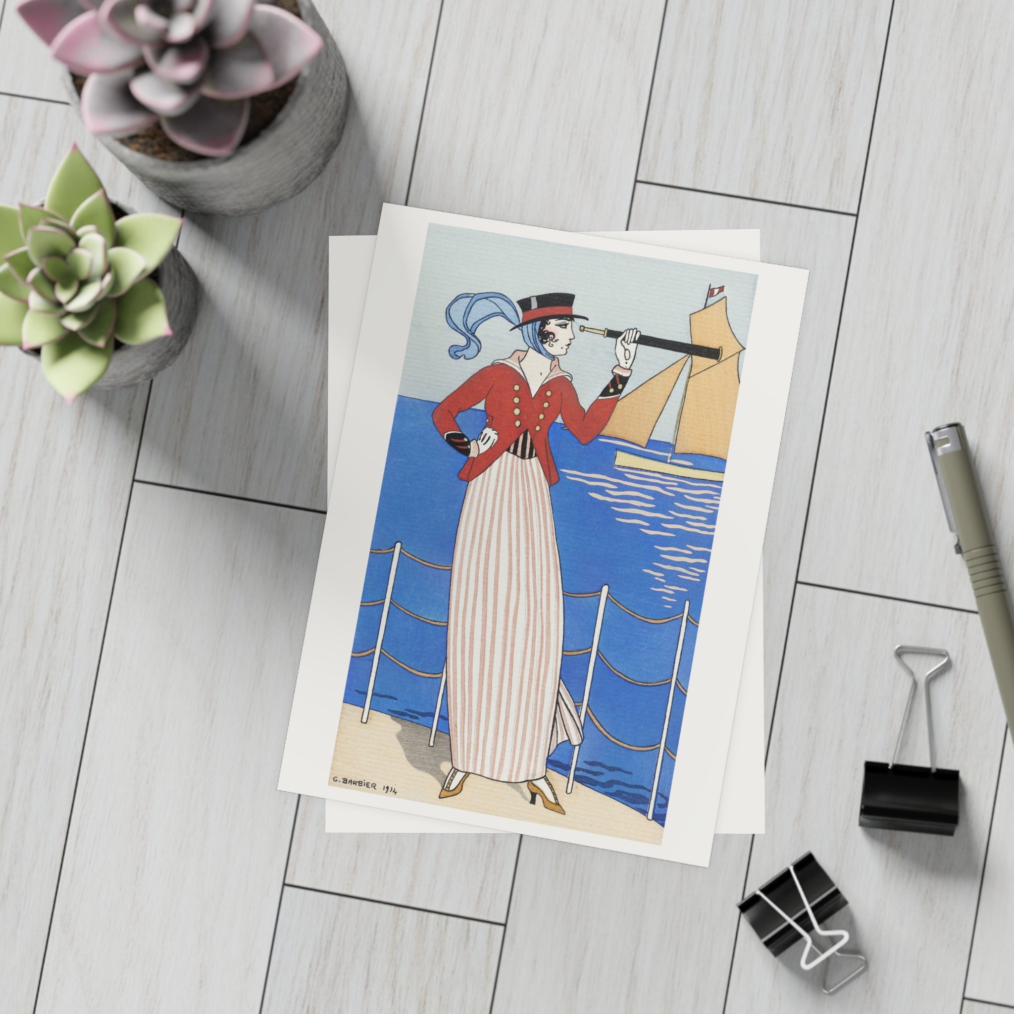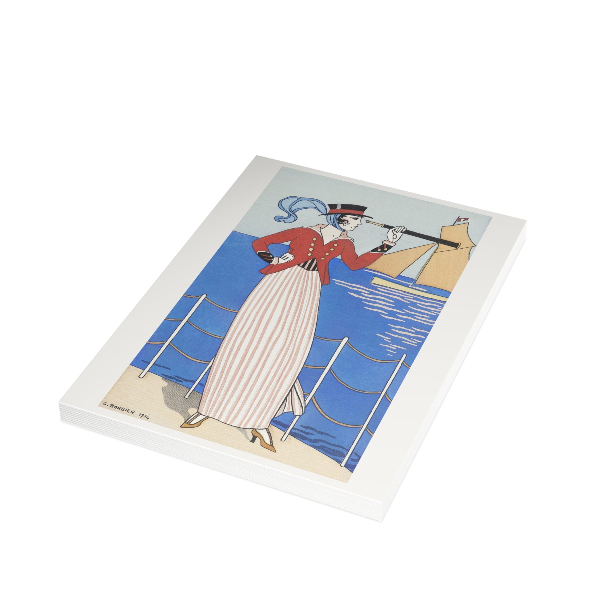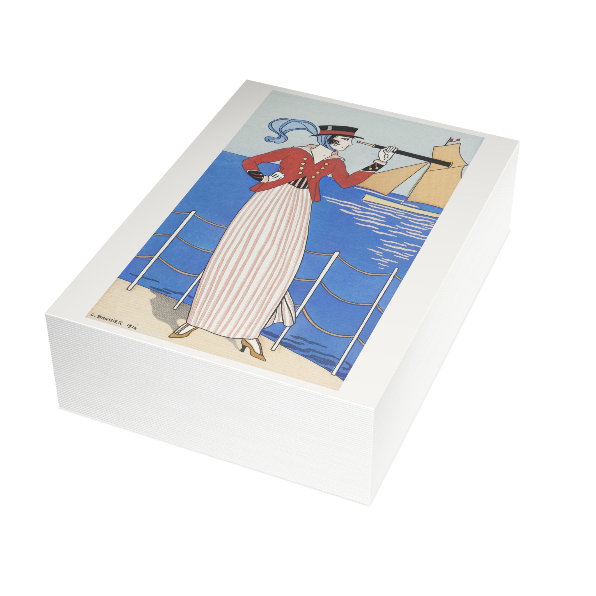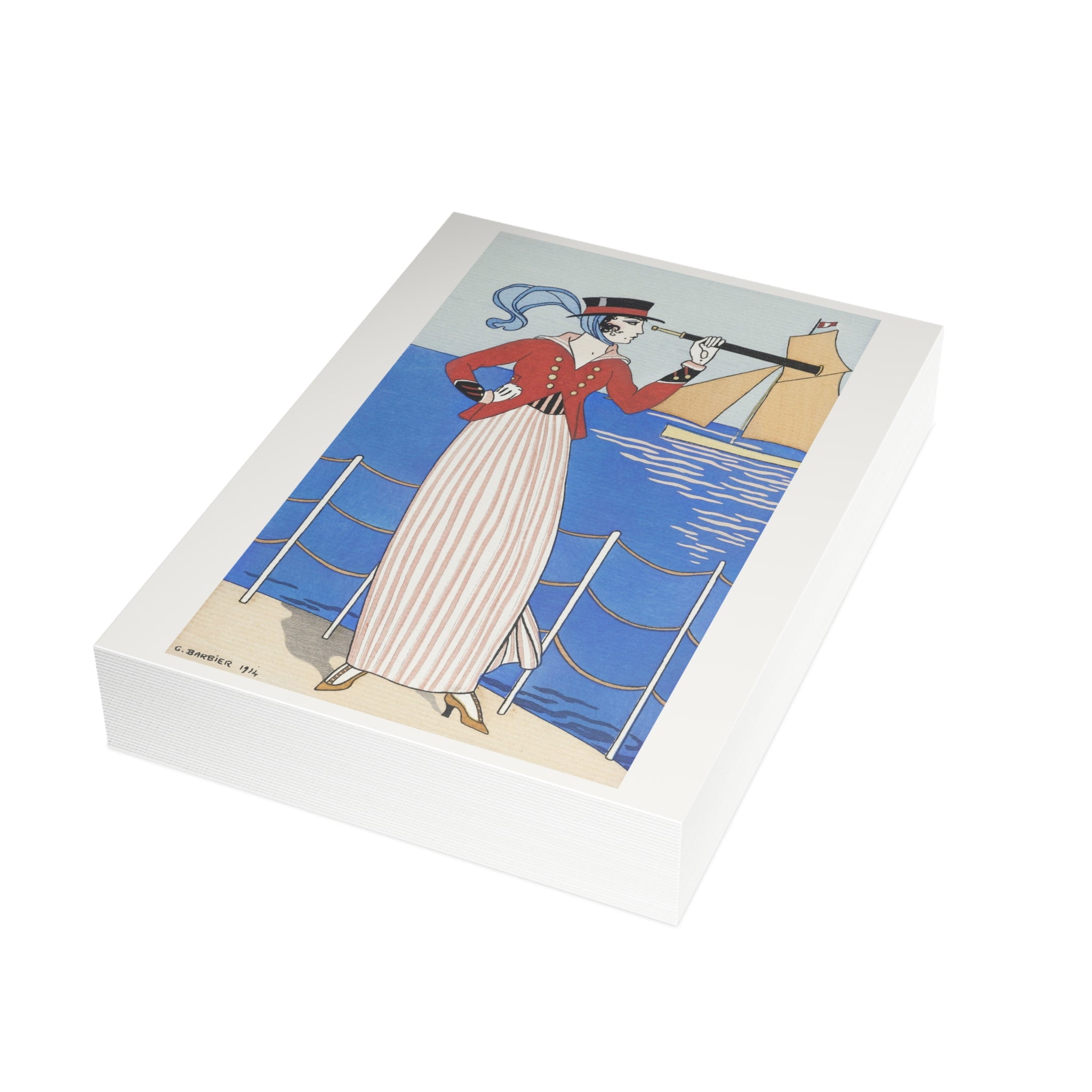 Elegant and timeless, these postcards feature "Costume de Yacht," a 1914 fashion illustration by French artist George Barbier. Originally published in Journal des Dames et des Modes, it depicts a poised woman in a striped yachting ensemble, standing on a pier and gazing toward the water—a graceful reflection of early 20th-century leisure and style.