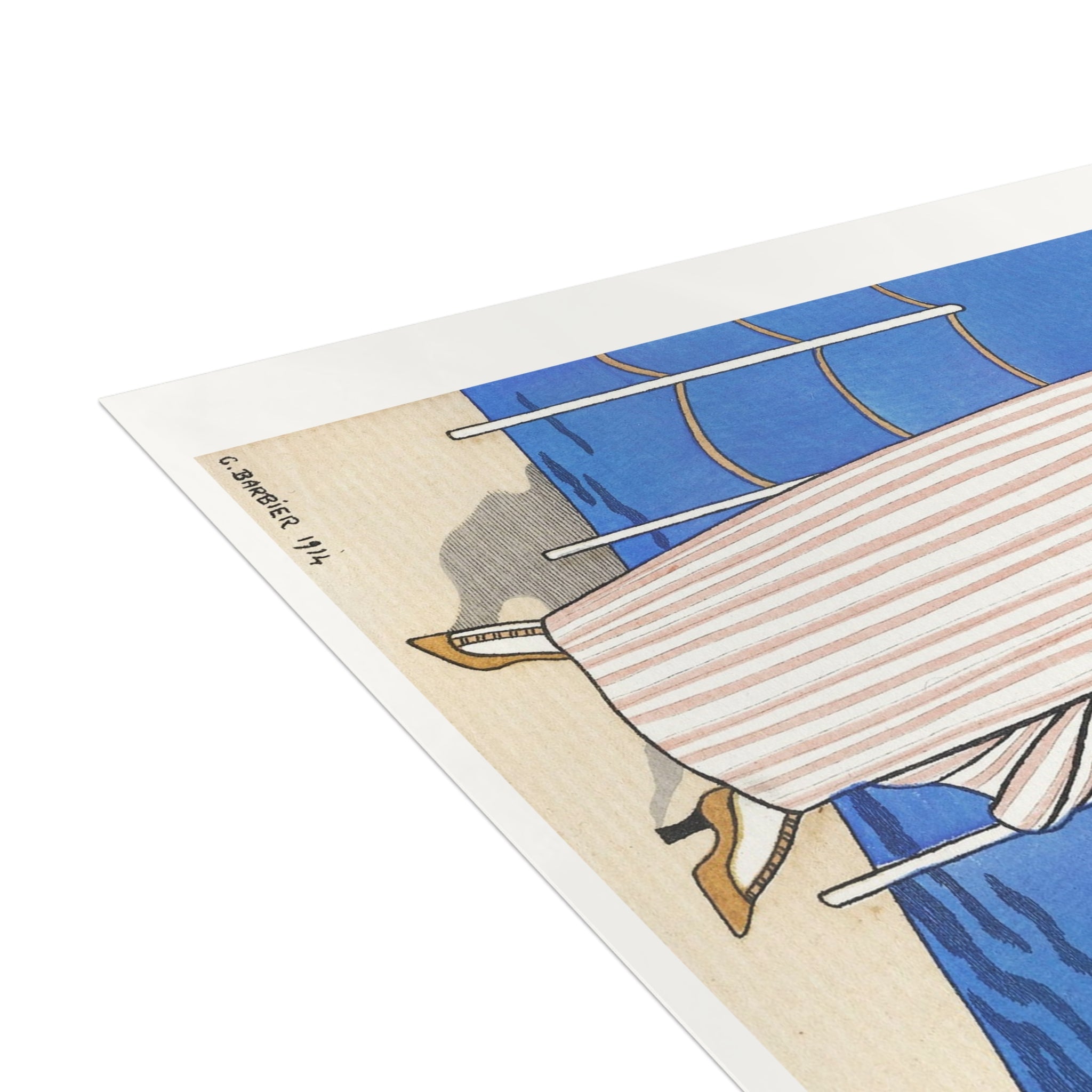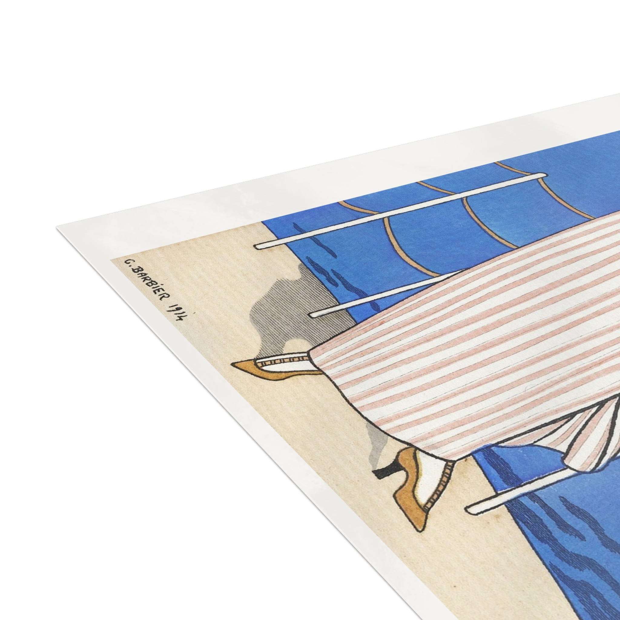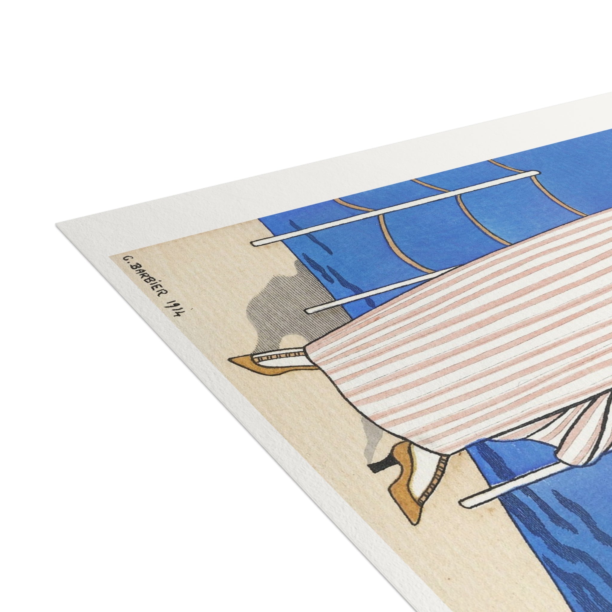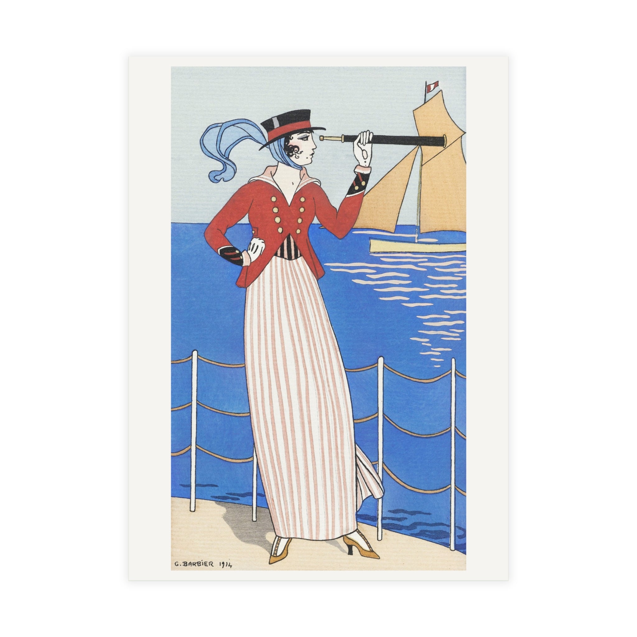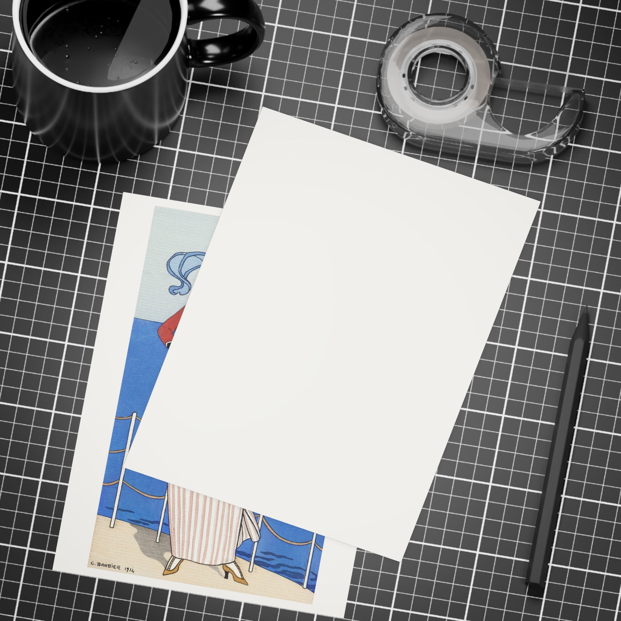 Elegant and timeless, these postcards feature "Costume de Yacht," a 1914 fashion illustration by French artist George Barbier. Originally published in Journal des Dames et des Modes, it depicts a poised woman in a striped yachting ensemble, standing on a pier and gazing toward the water—a graceful reflection of early 20th-century leisure and style.