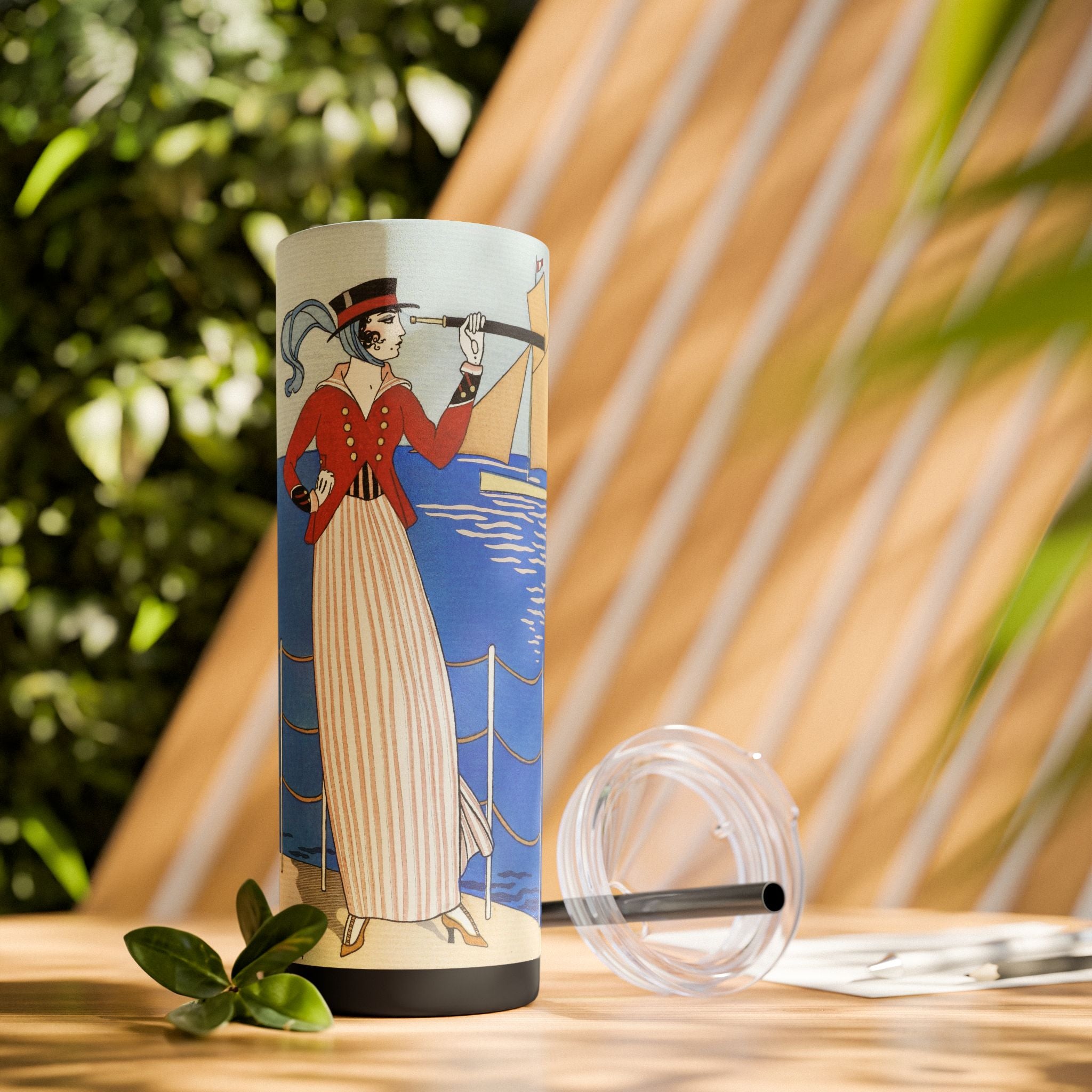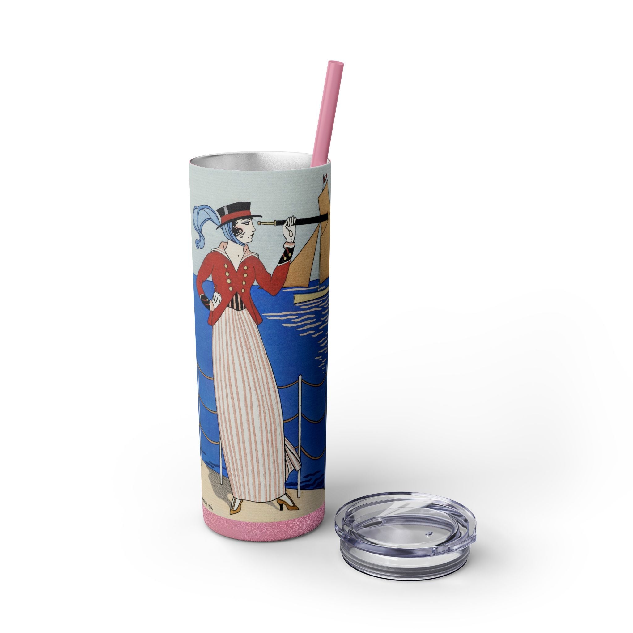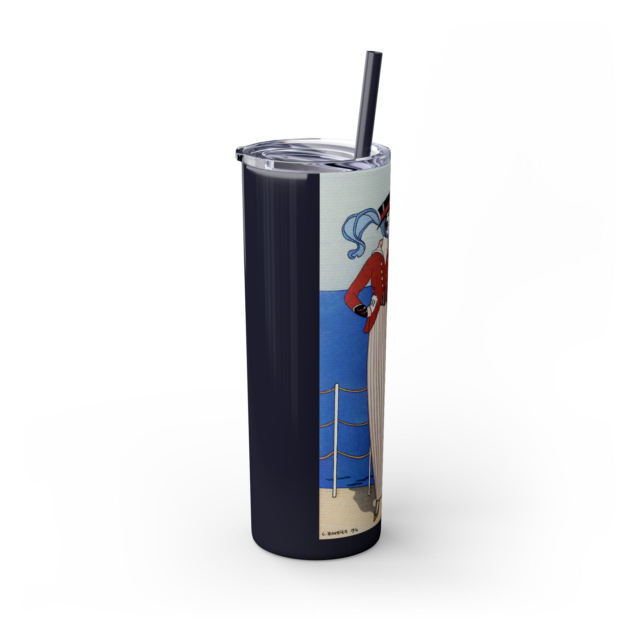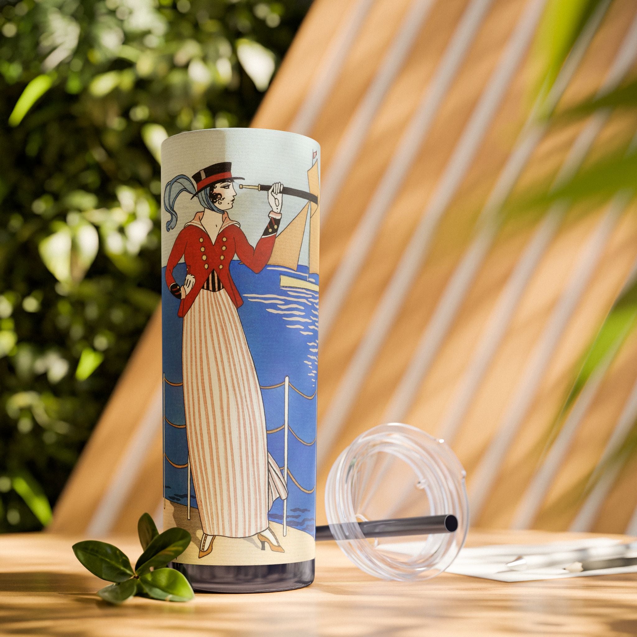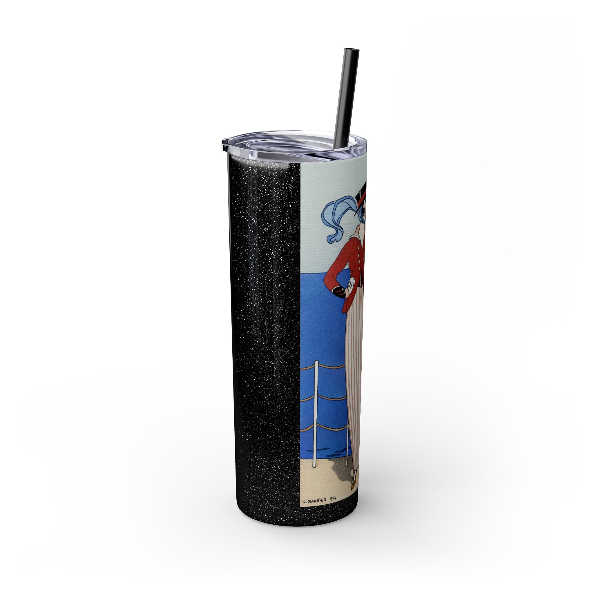 Featured on this tumbler is "Costume de Yacht," a 1914 fashion illustration by George Barbier. Originally published in Journal des Dames et des Modes, it depicts a woman in an elegant striped yachting outfit standing on a pier, gazing out at the water—a timeless image of sophistication and leisure.