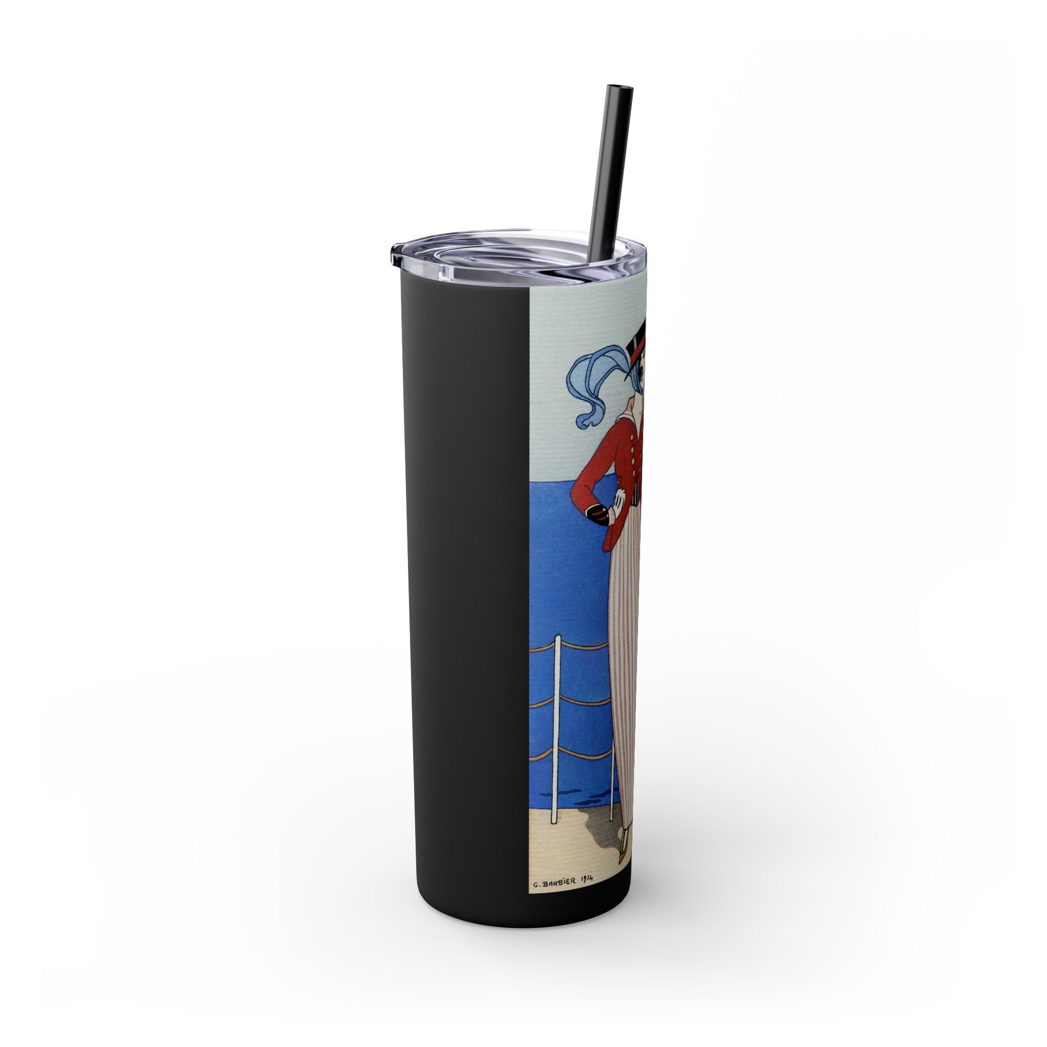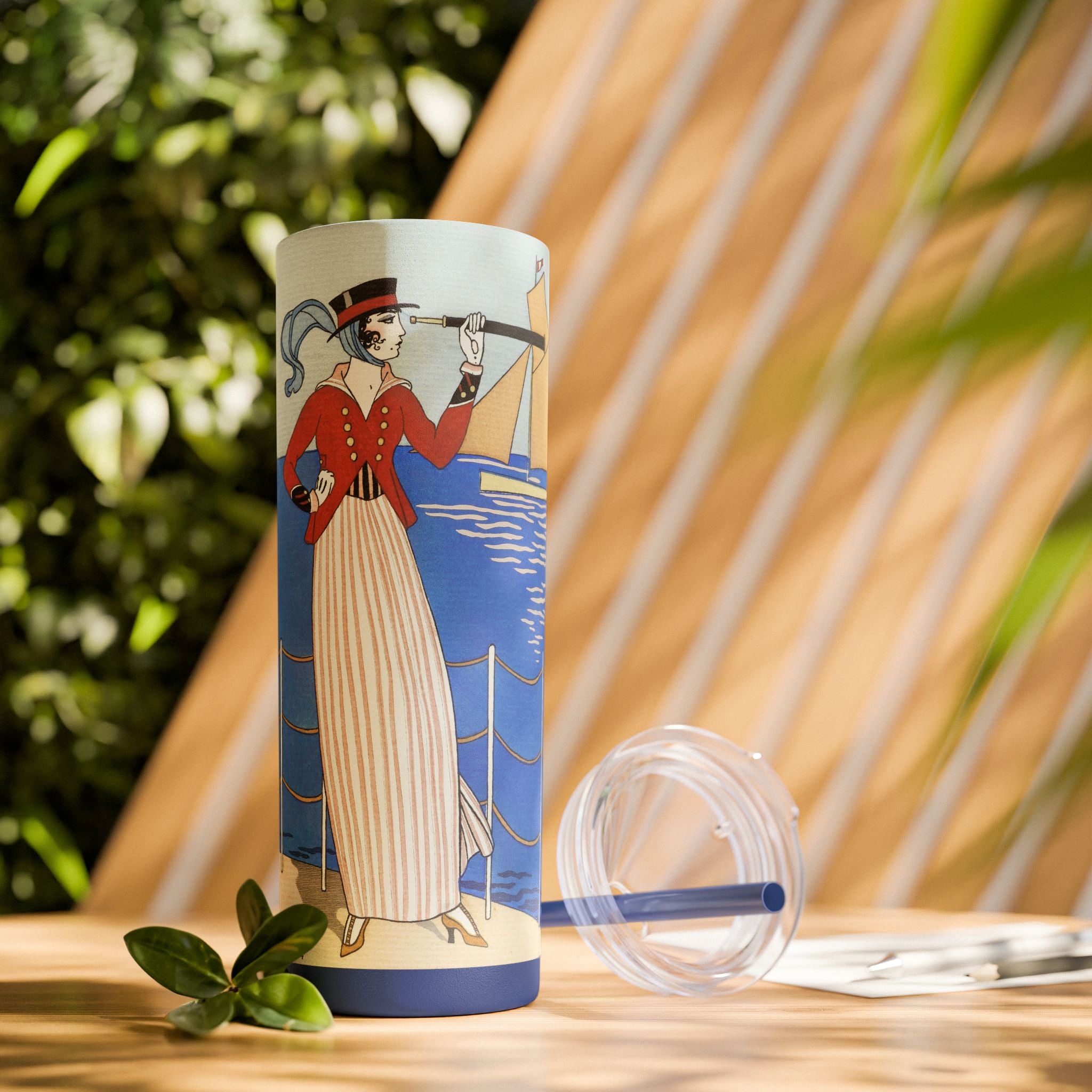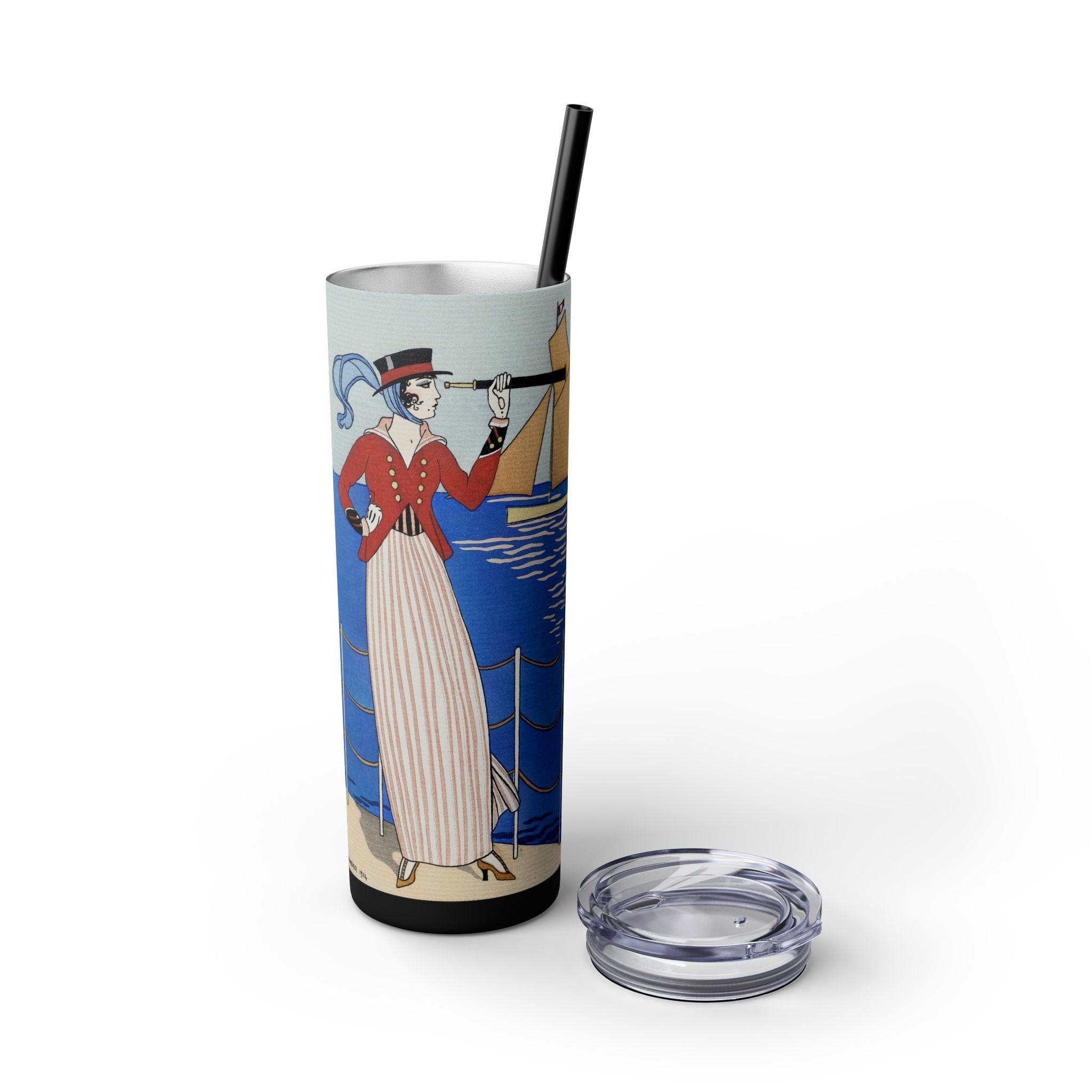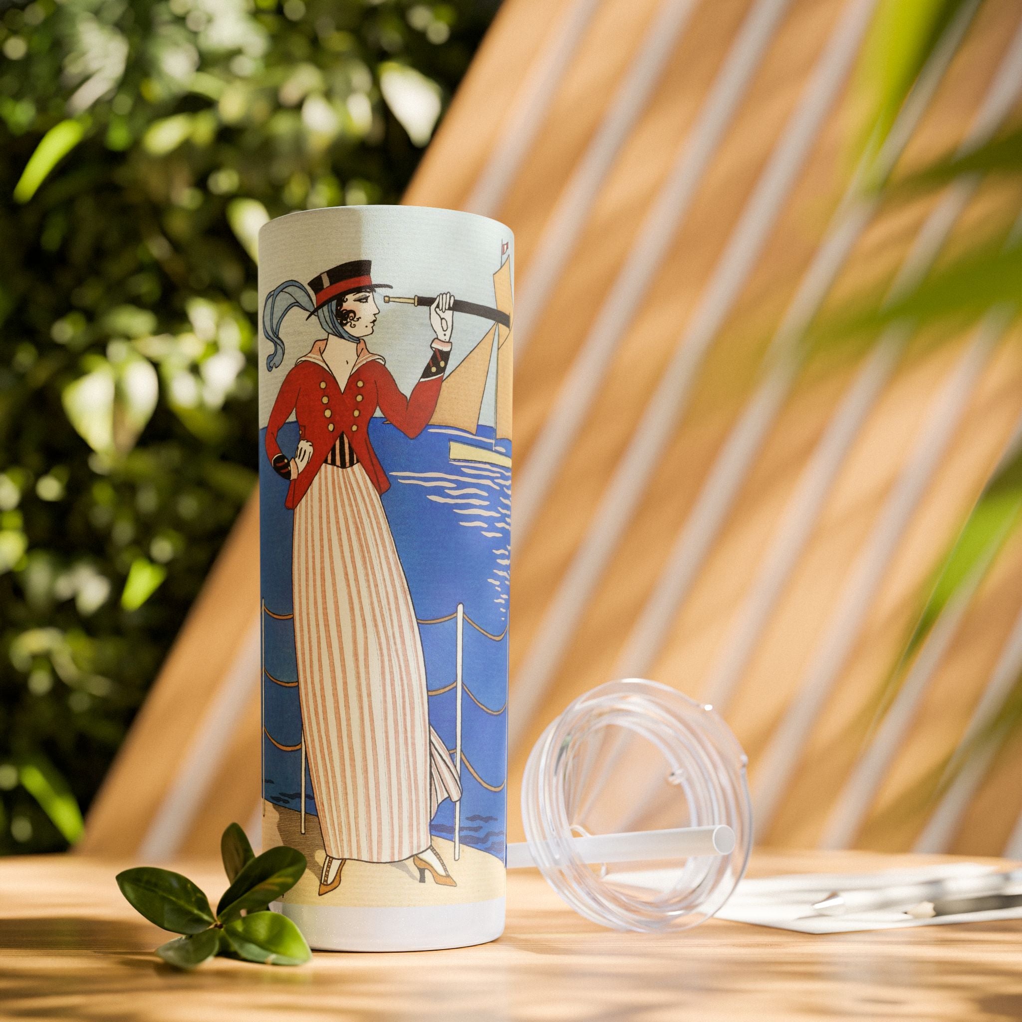 Featured on this tumbler is "Costume de Yacht," a 1914 fashion illustration by George Barbier. Originally published in Journal des Dames et des Modes, it depicts a woman in an elegant striped yachting outfit standing on a pier, gazing out at the water—a timeless image of sophistication and leisure.