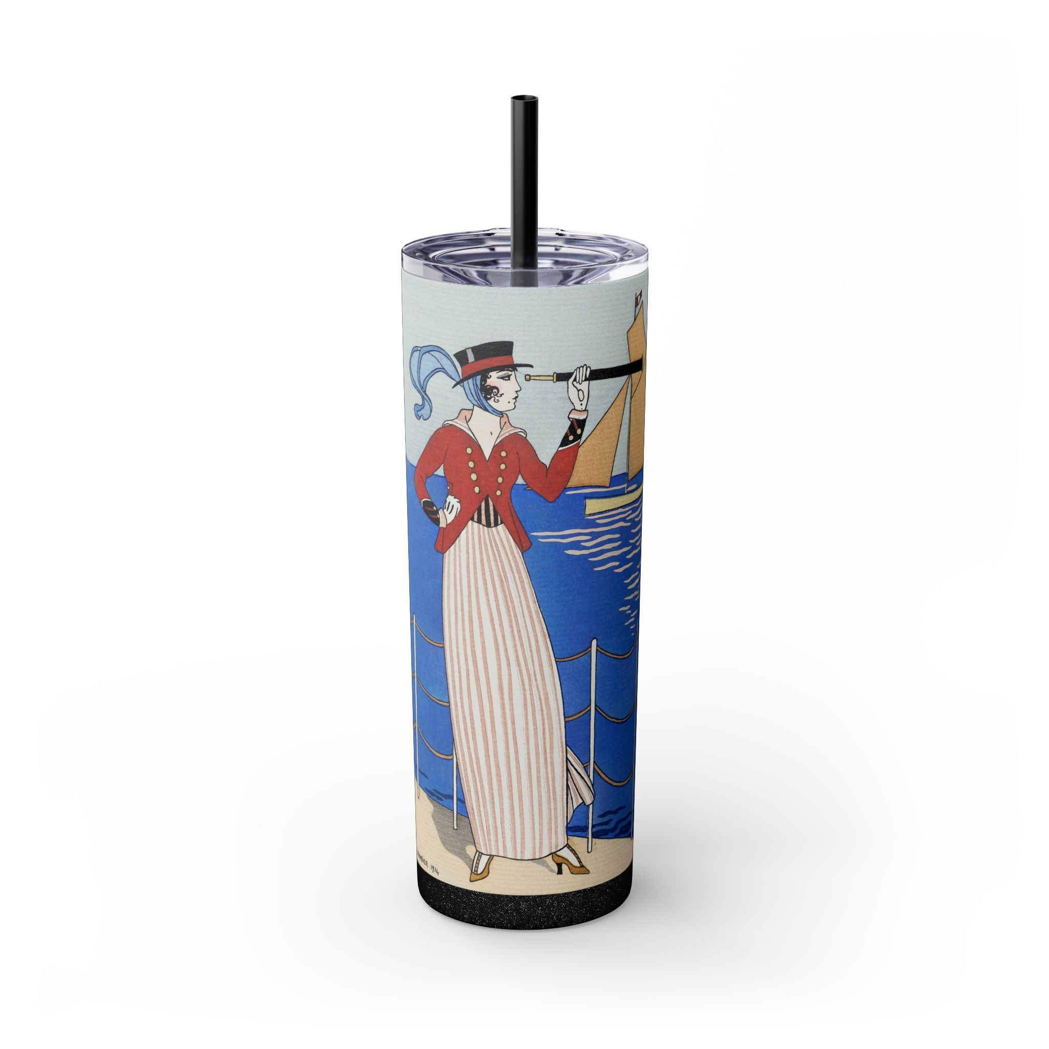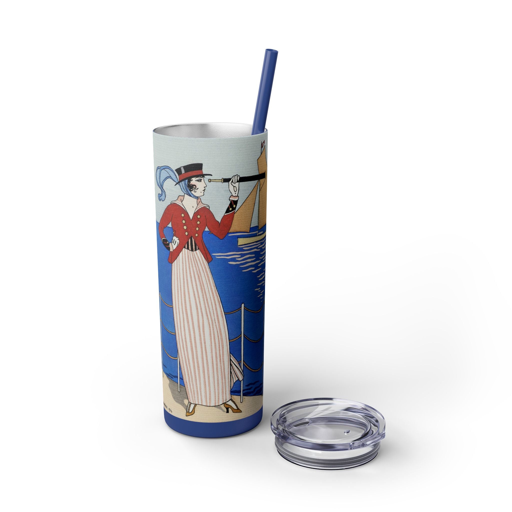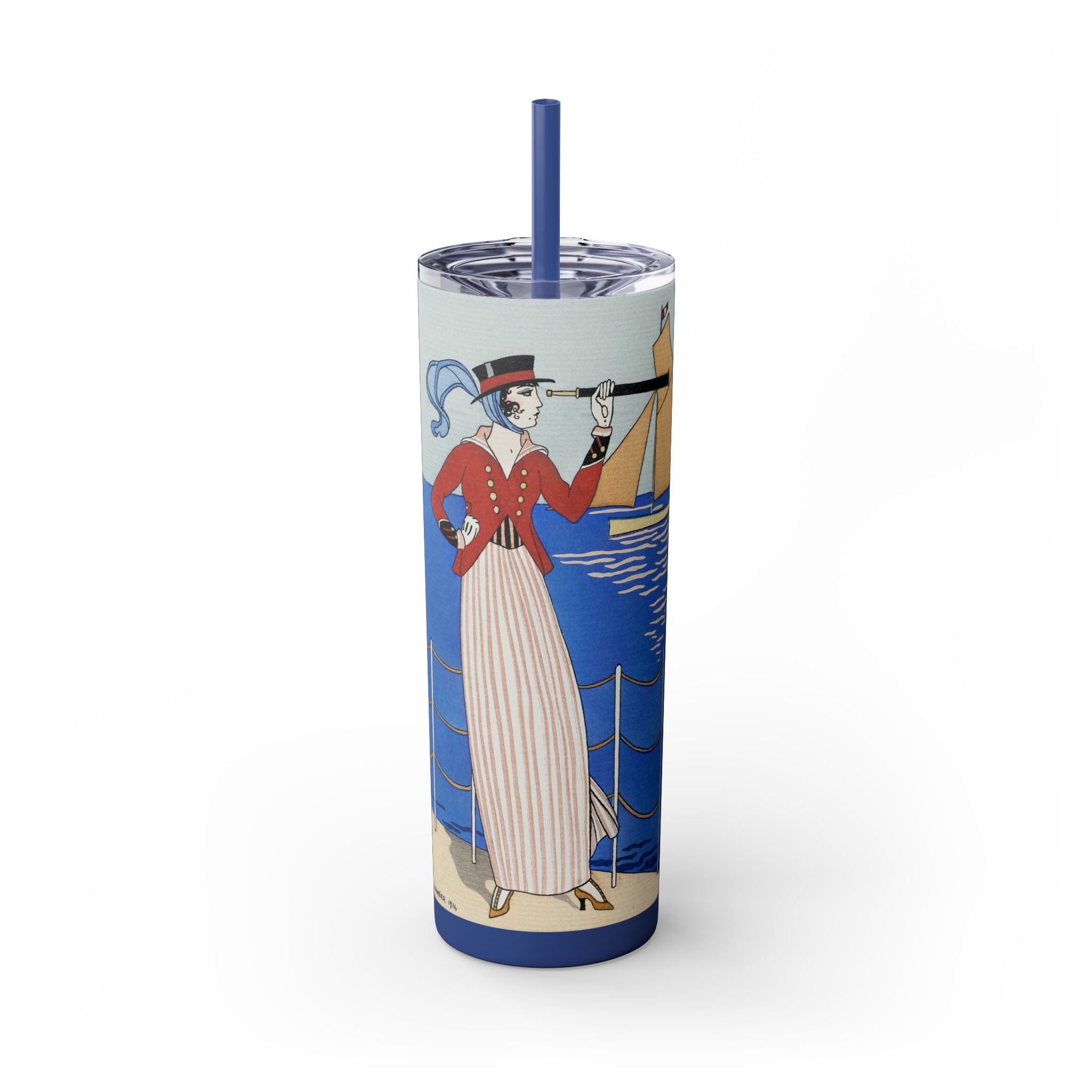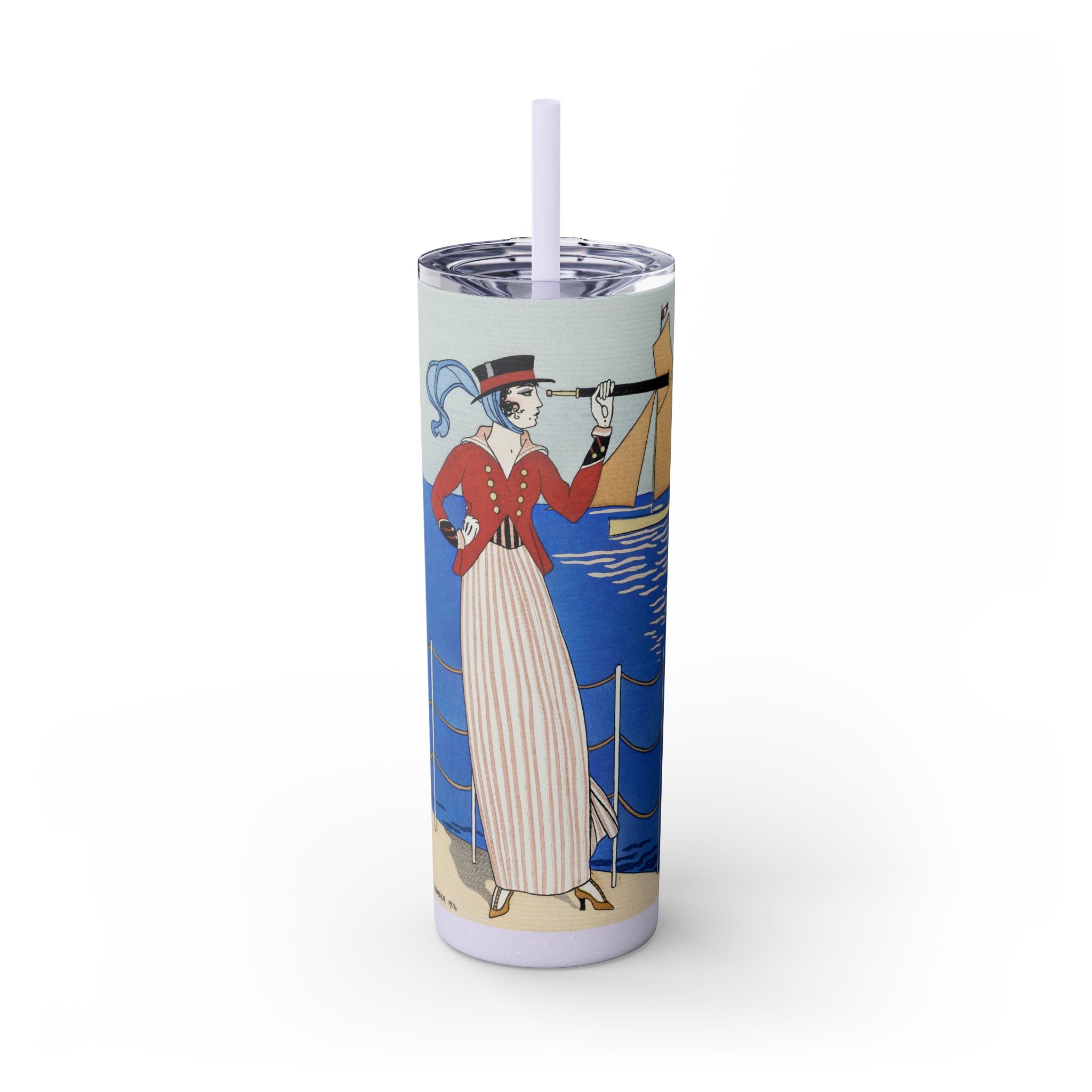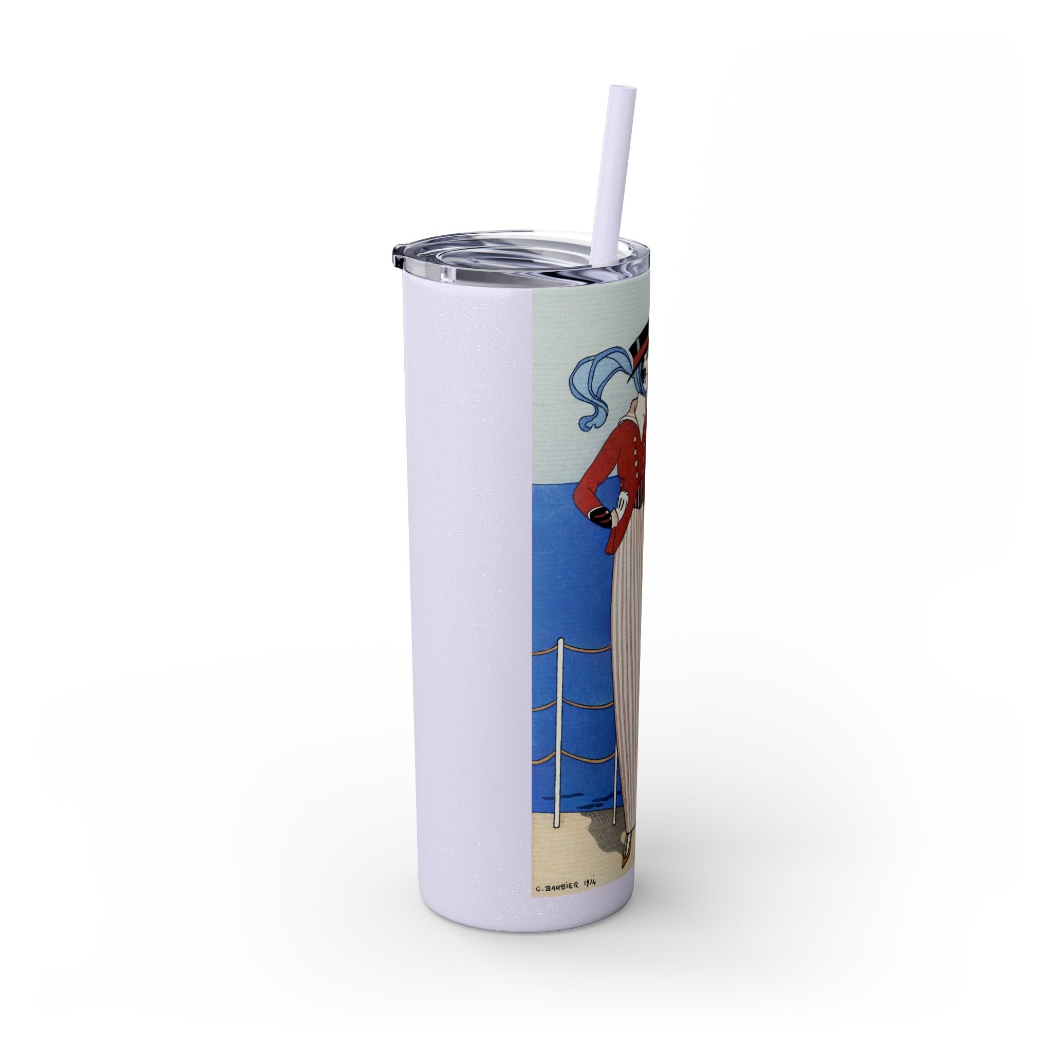 Featured on this tumbler is "Costume de Yacht," a 1914 fashion illustration by George Barbier. Originally published in Journal des Dames et des Modes, it depicts a woman in an elegant striped yachting outfit standing on a pier, gazing out at the water—a timeless image of sophistication and leisure.