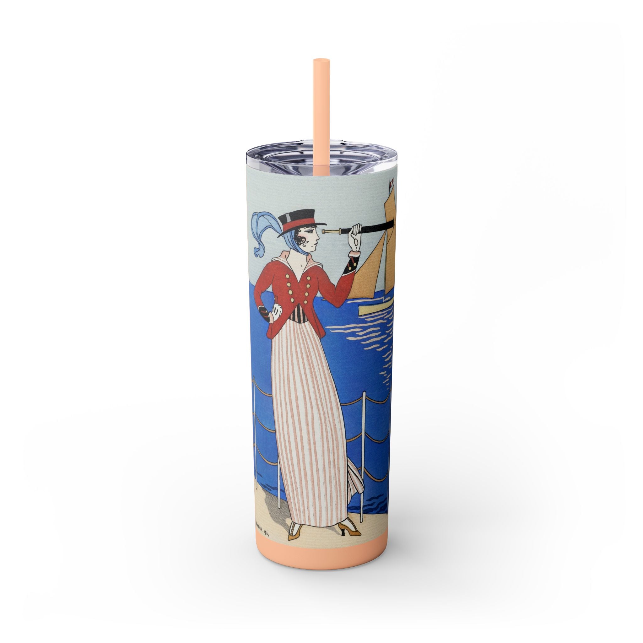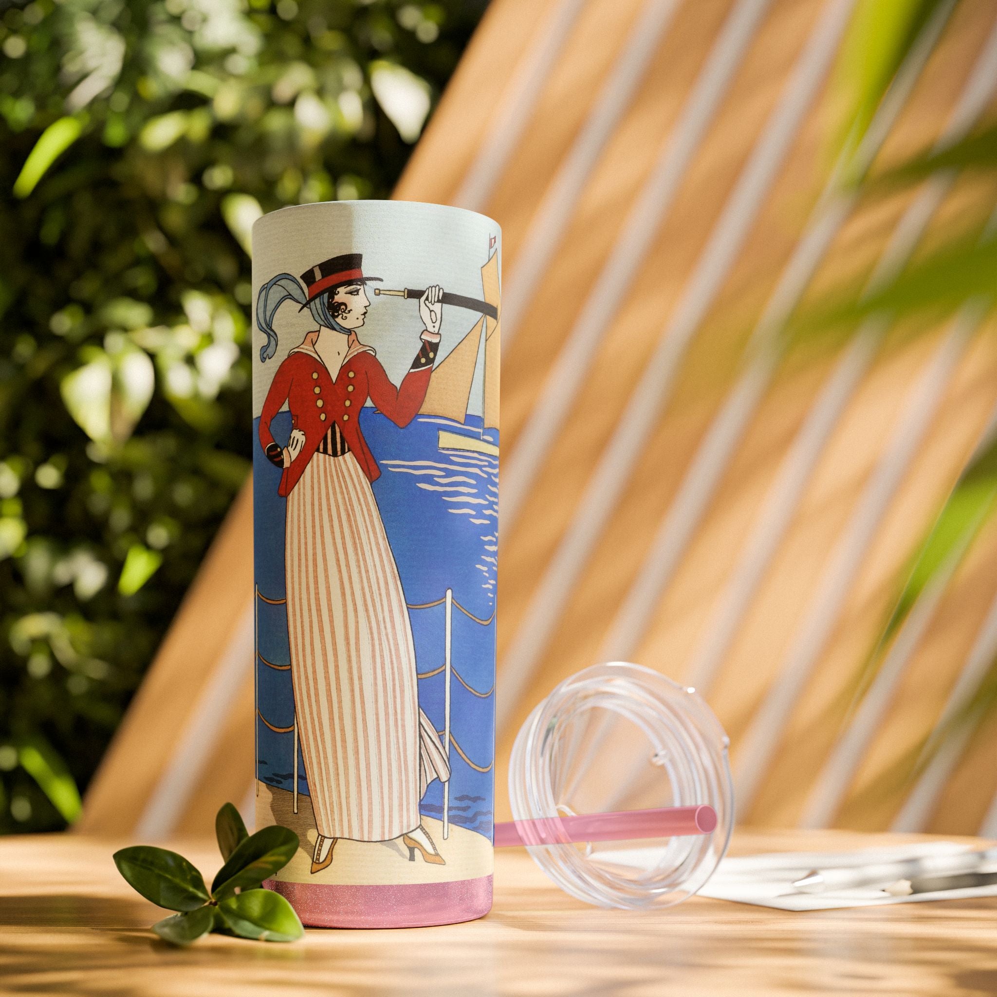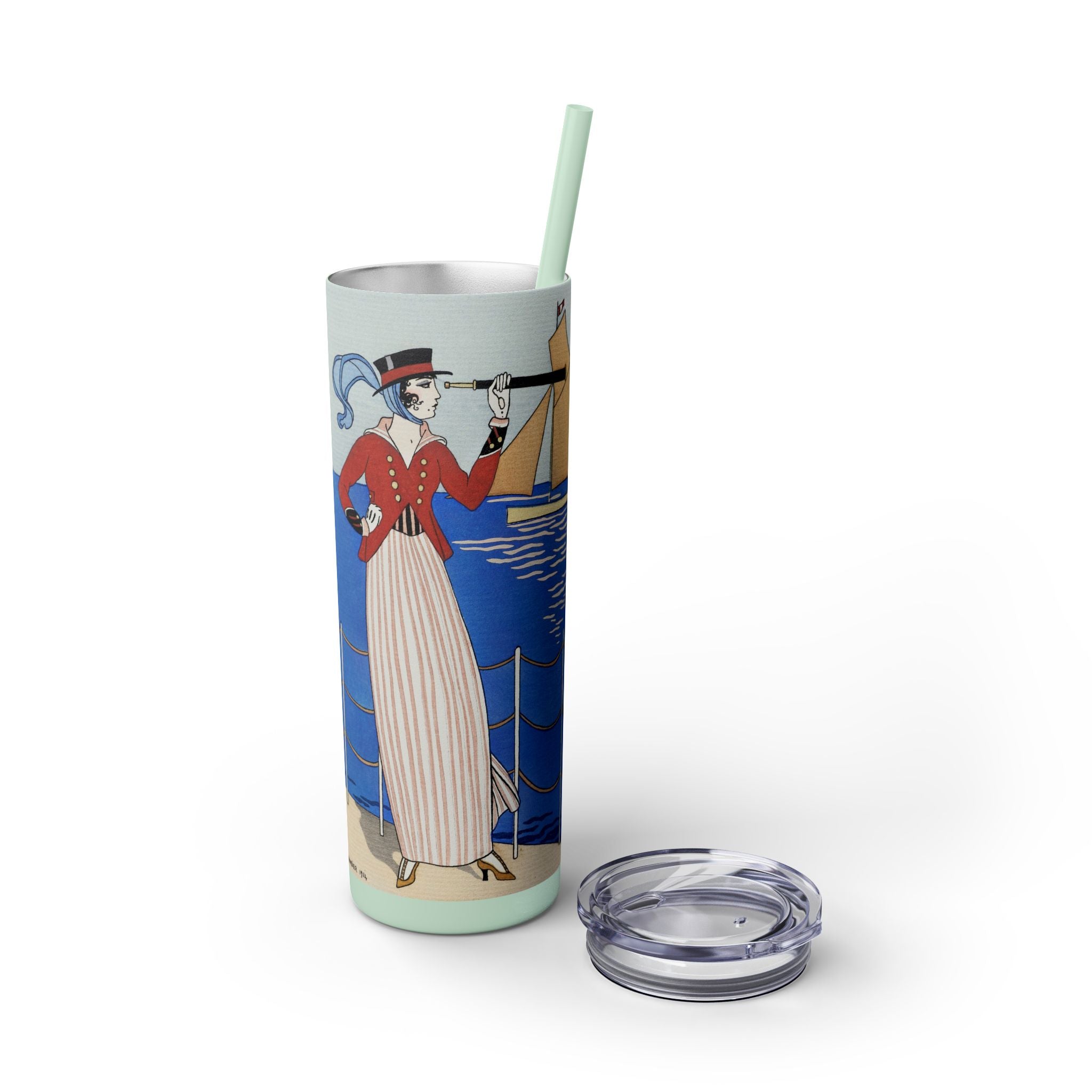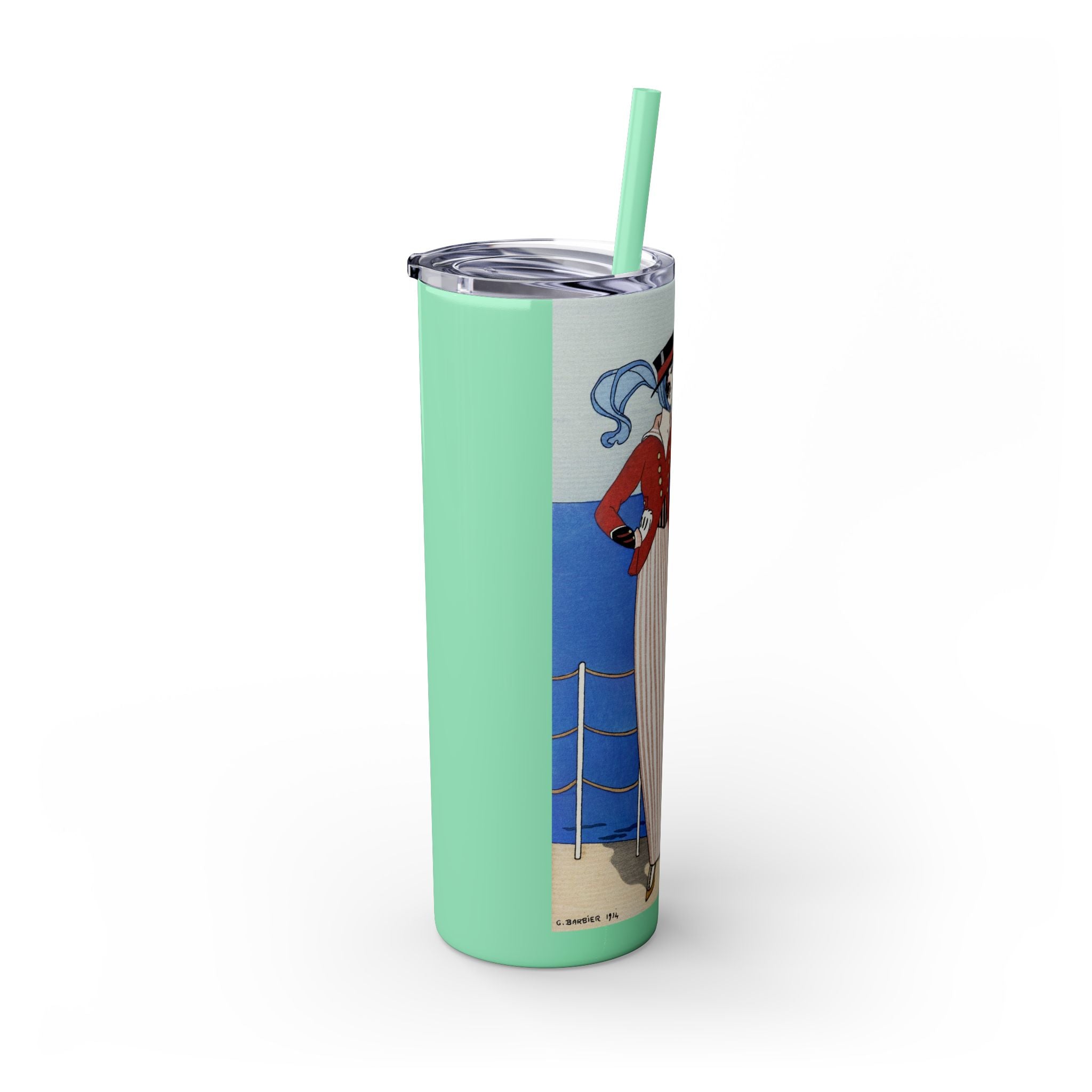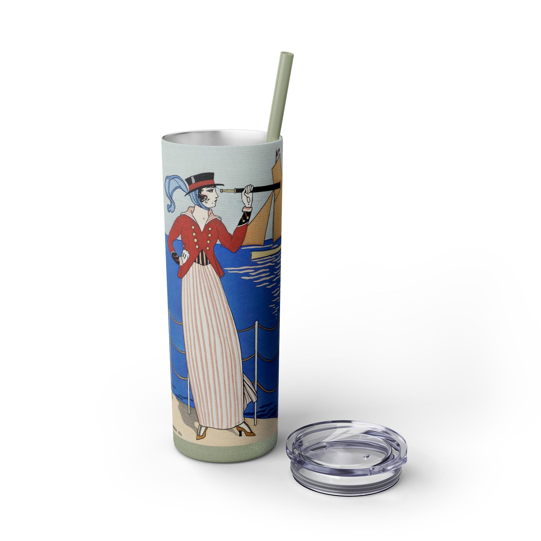Featured on this tumbler is "Costume de Yacht," a 1914 fashion illustration by George Barbier. Originally published in Journal des Dames et des Modes, it depicts a woman in an elegant striped yachting outfit standing on a pier, gazing out at the water—a timeless image of sophistication and leisure.