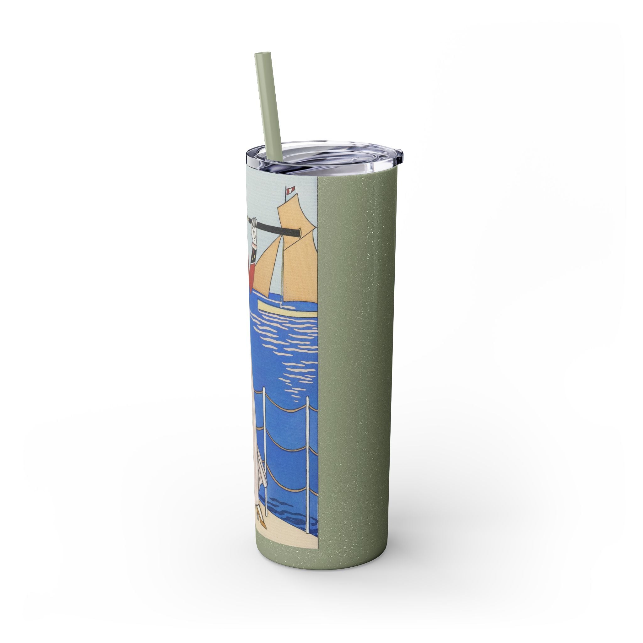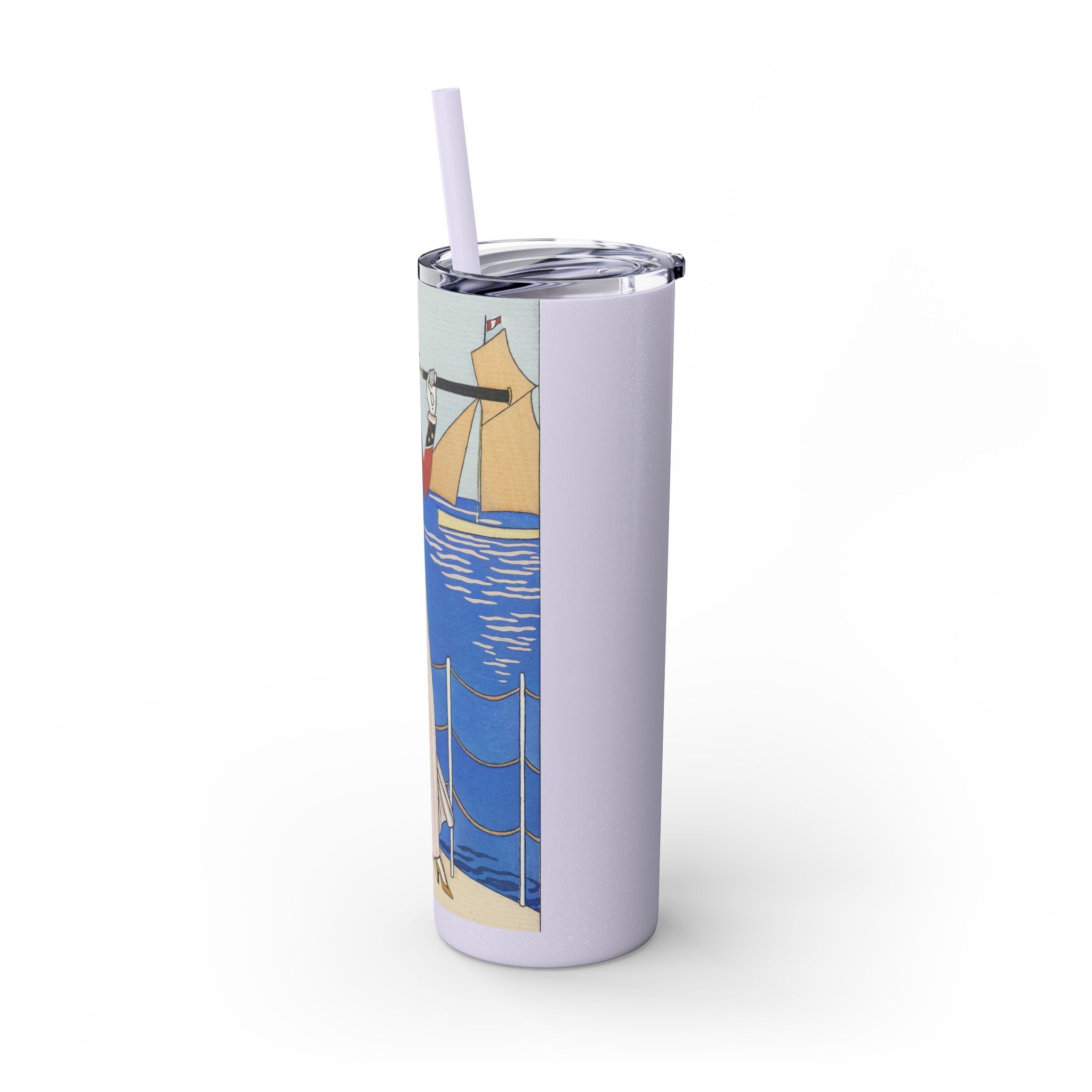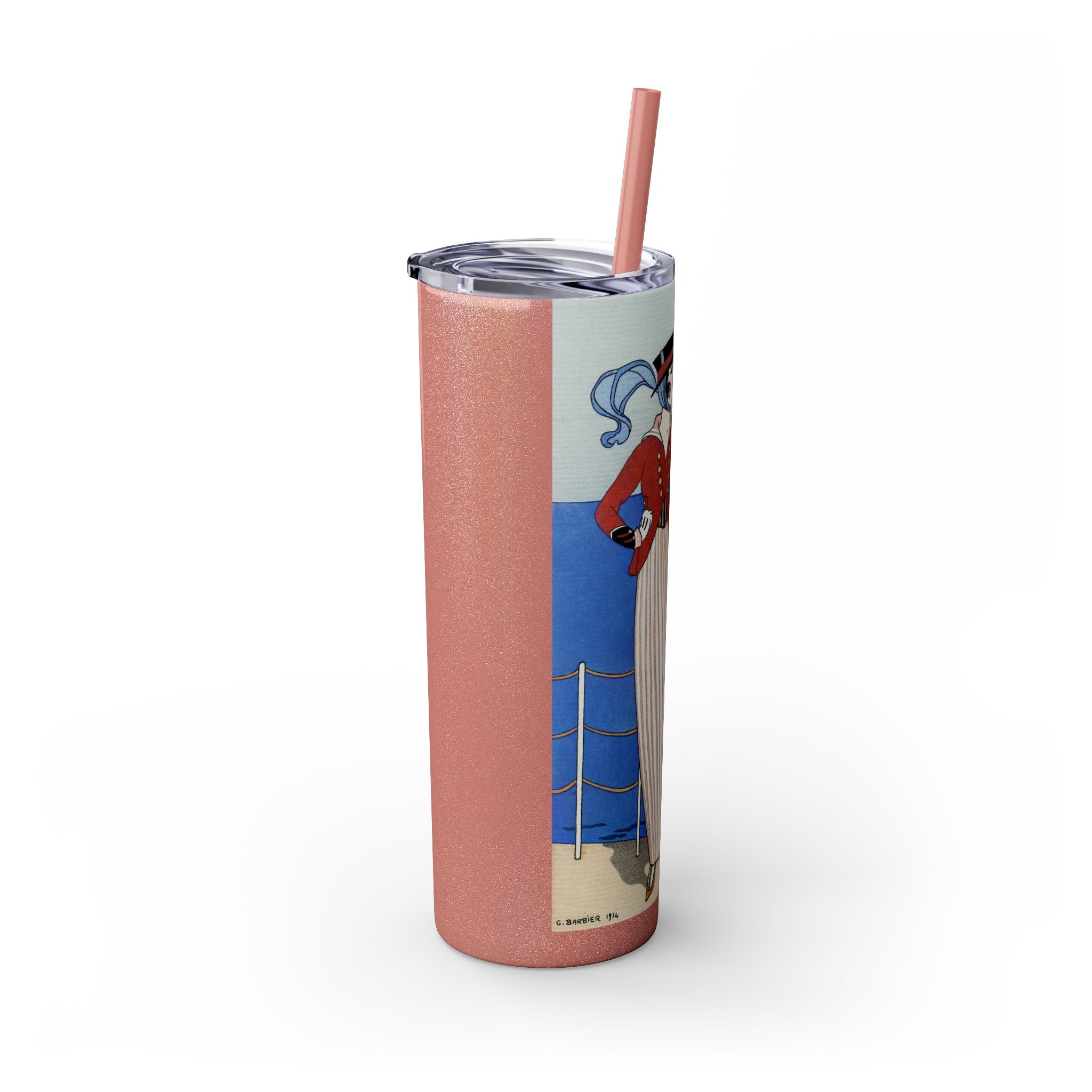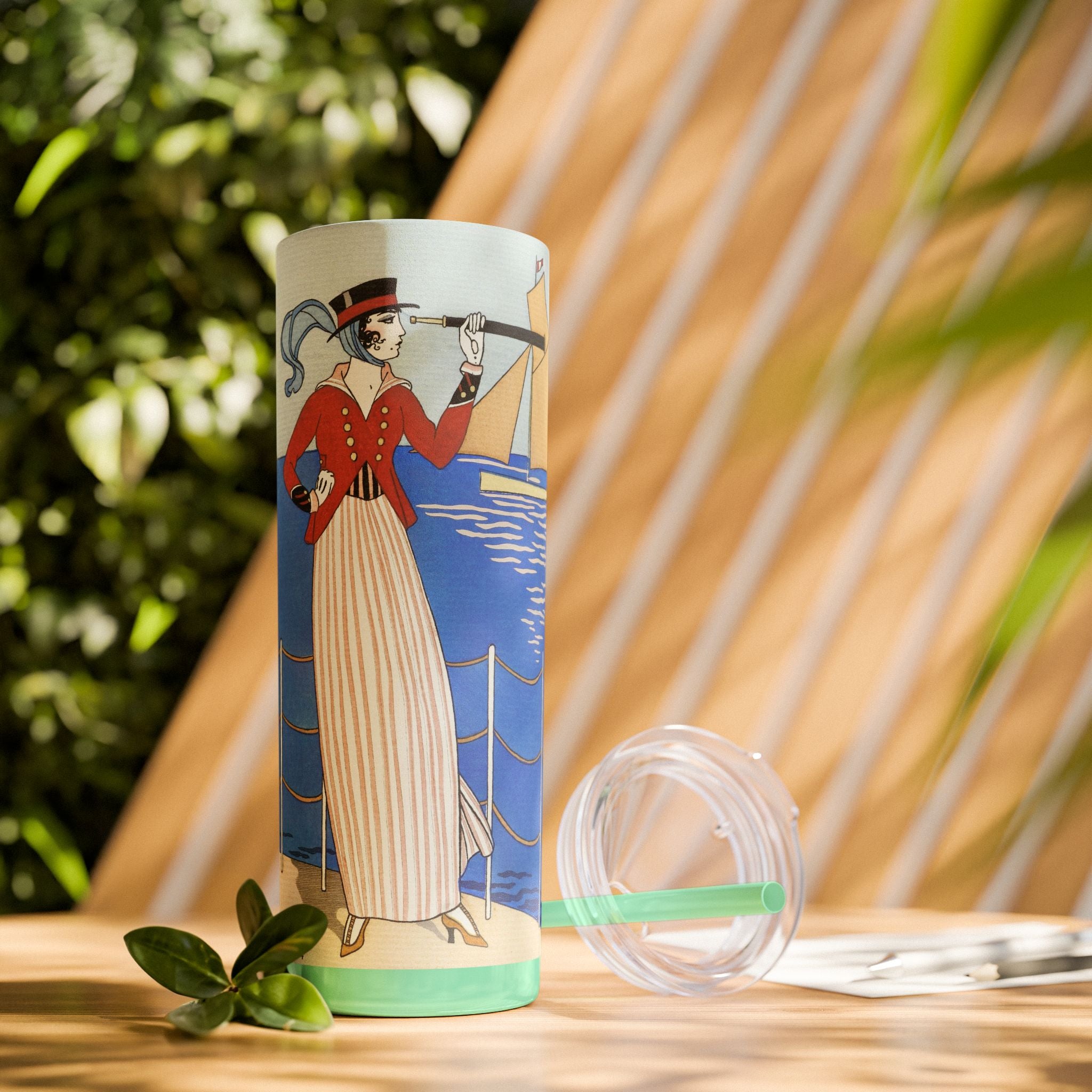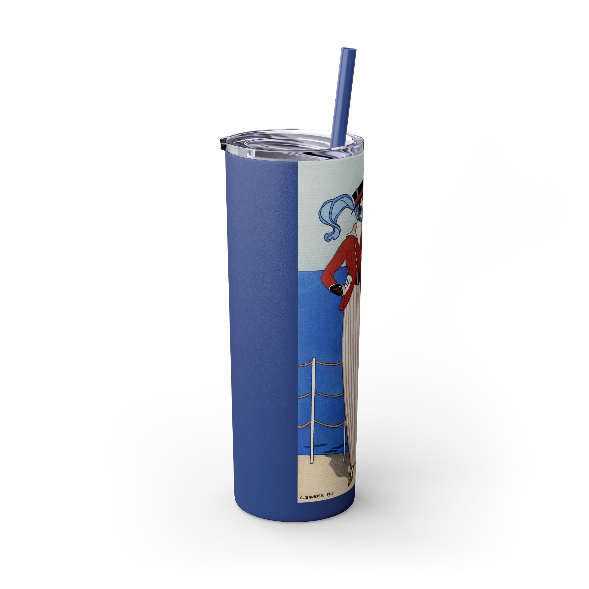 Featured on this tumbler is "Costume de Yacht," a 1914 fashion illustration by George Barbier. Originally published in Journal des Dames et des Modes, it depicts a woman in an elegant striped yachting outfit standing on a pier, gazing out at the water—a timeless image of sophistication and leisure.