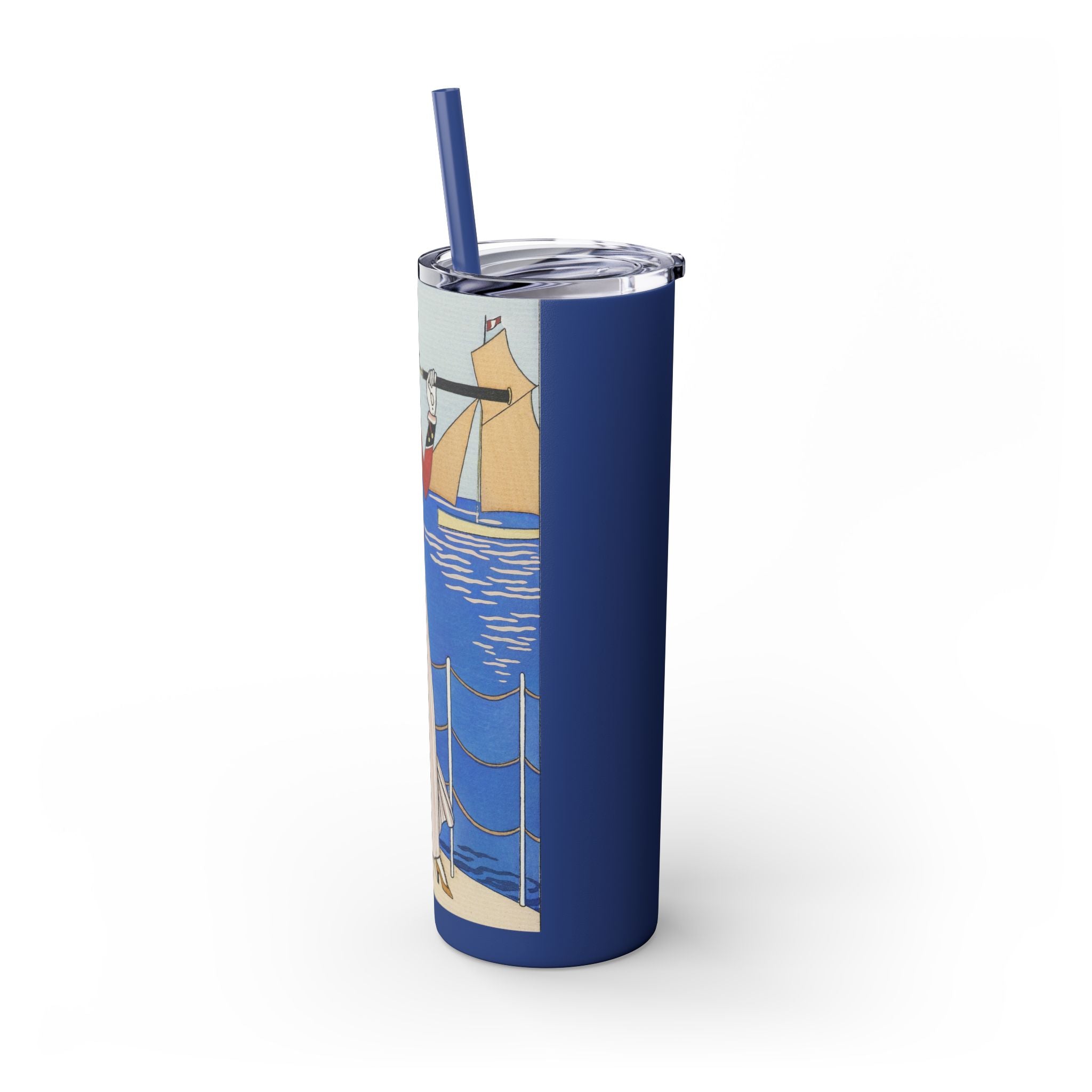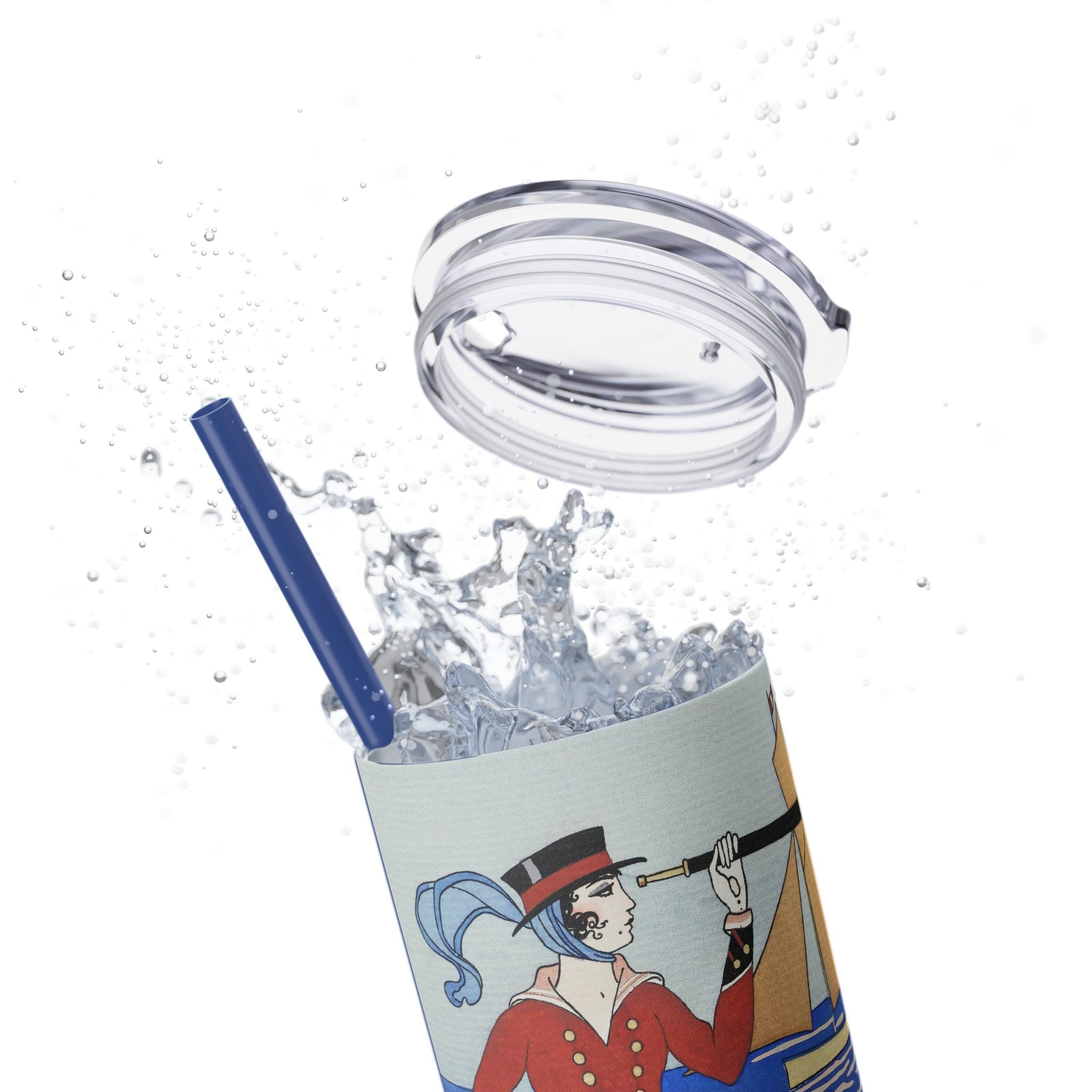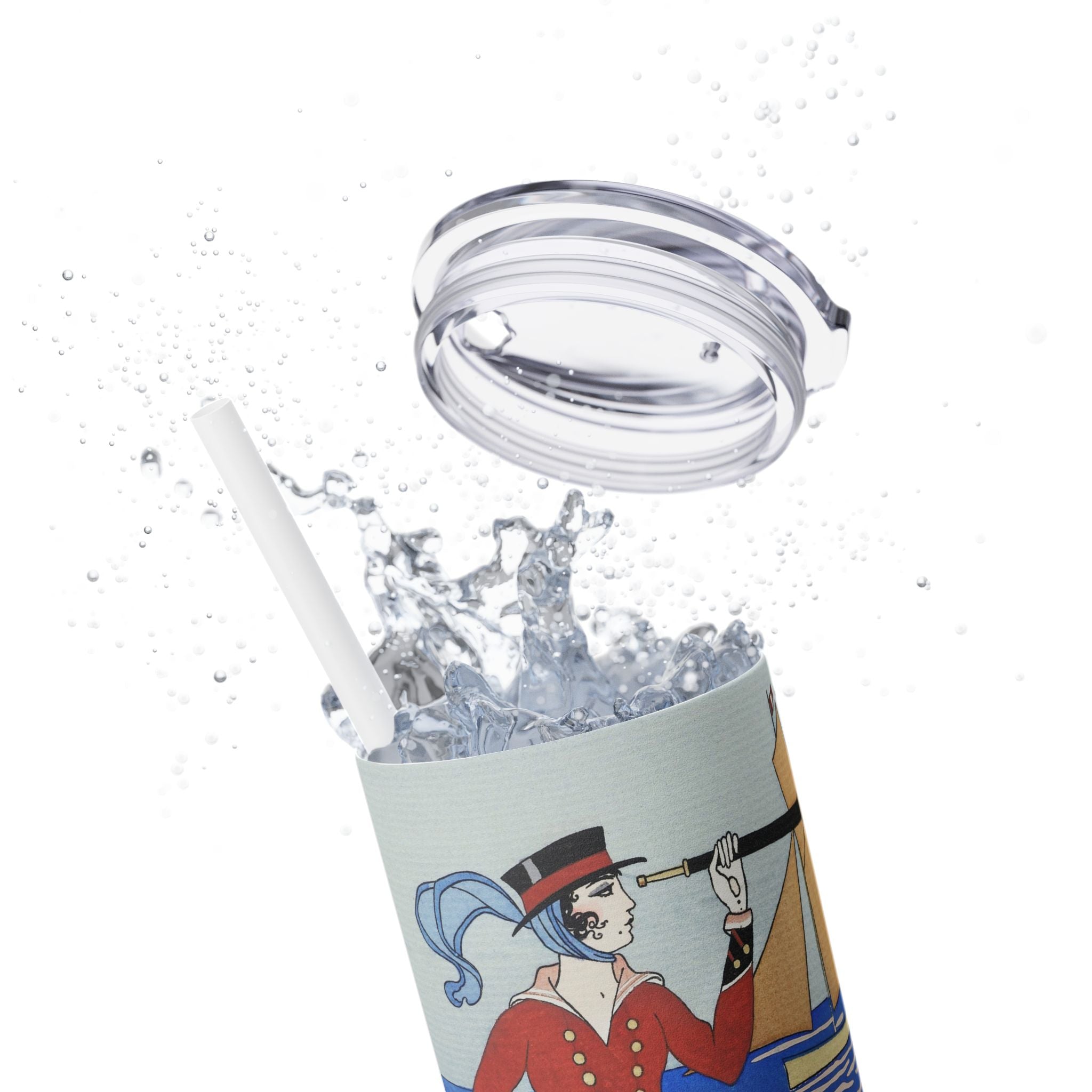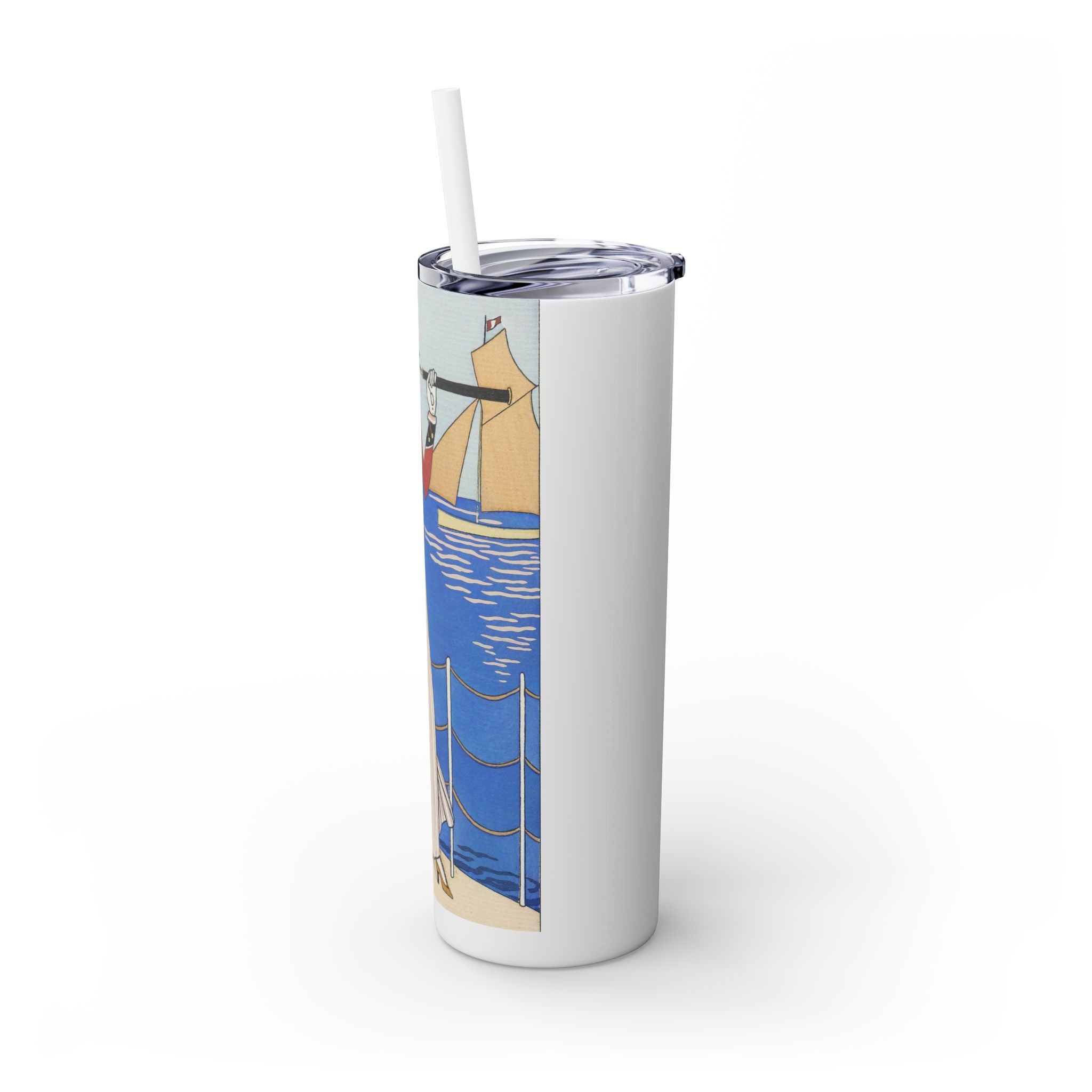 Featured on this tumbler is "Costume de Yacht," a 1914 fashion illustration by George Barbier. Originally published in Journal des Dames et des Modes, it depicts a woman in an elegant striped yachting outfit standing on a pier, gazing out at the water—a timeless image of sophistication and leisure.