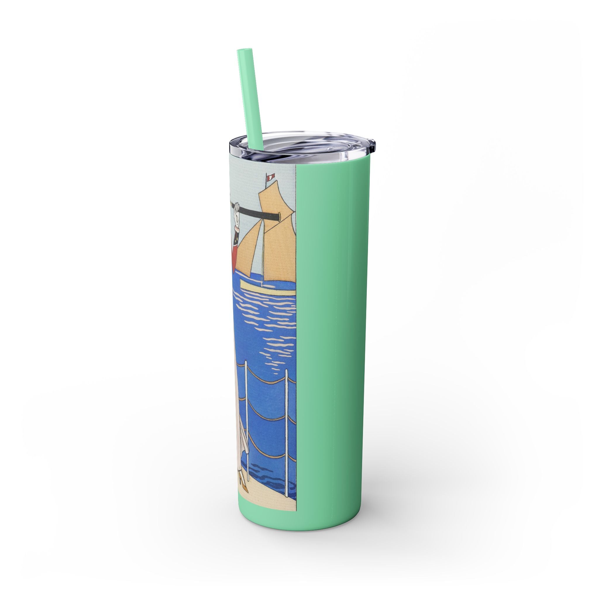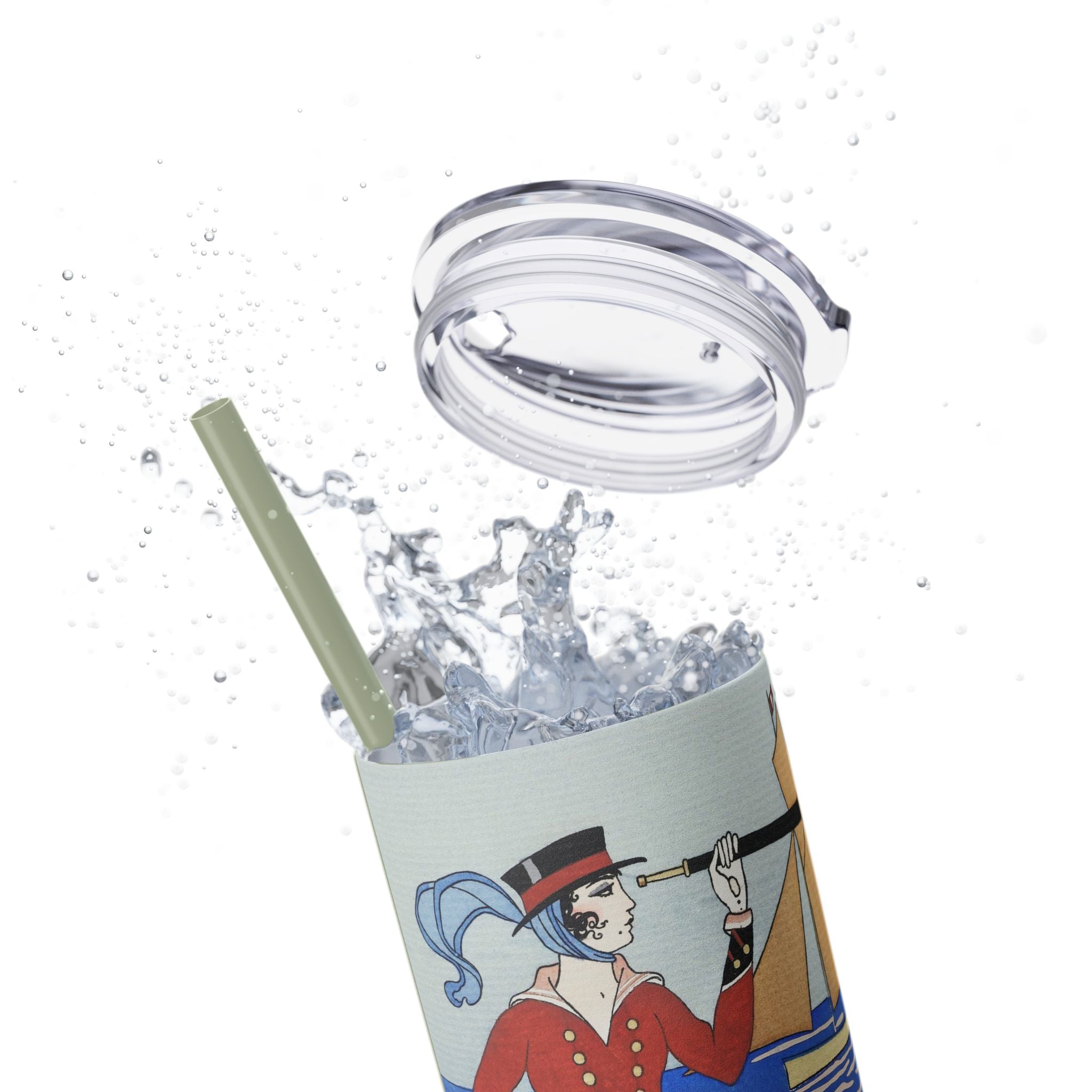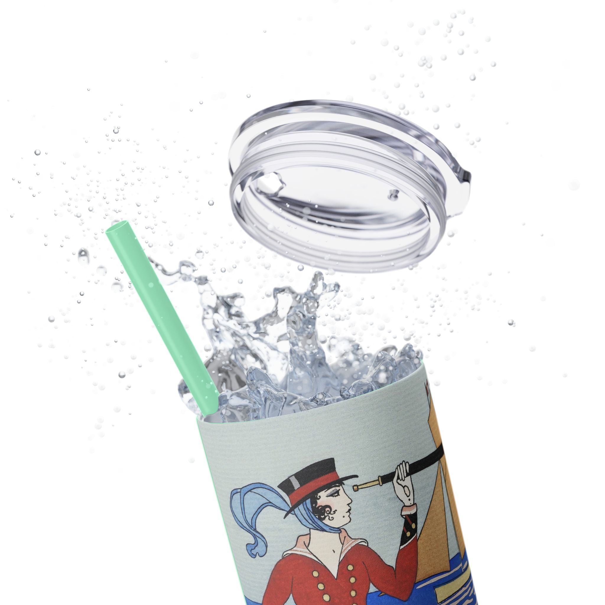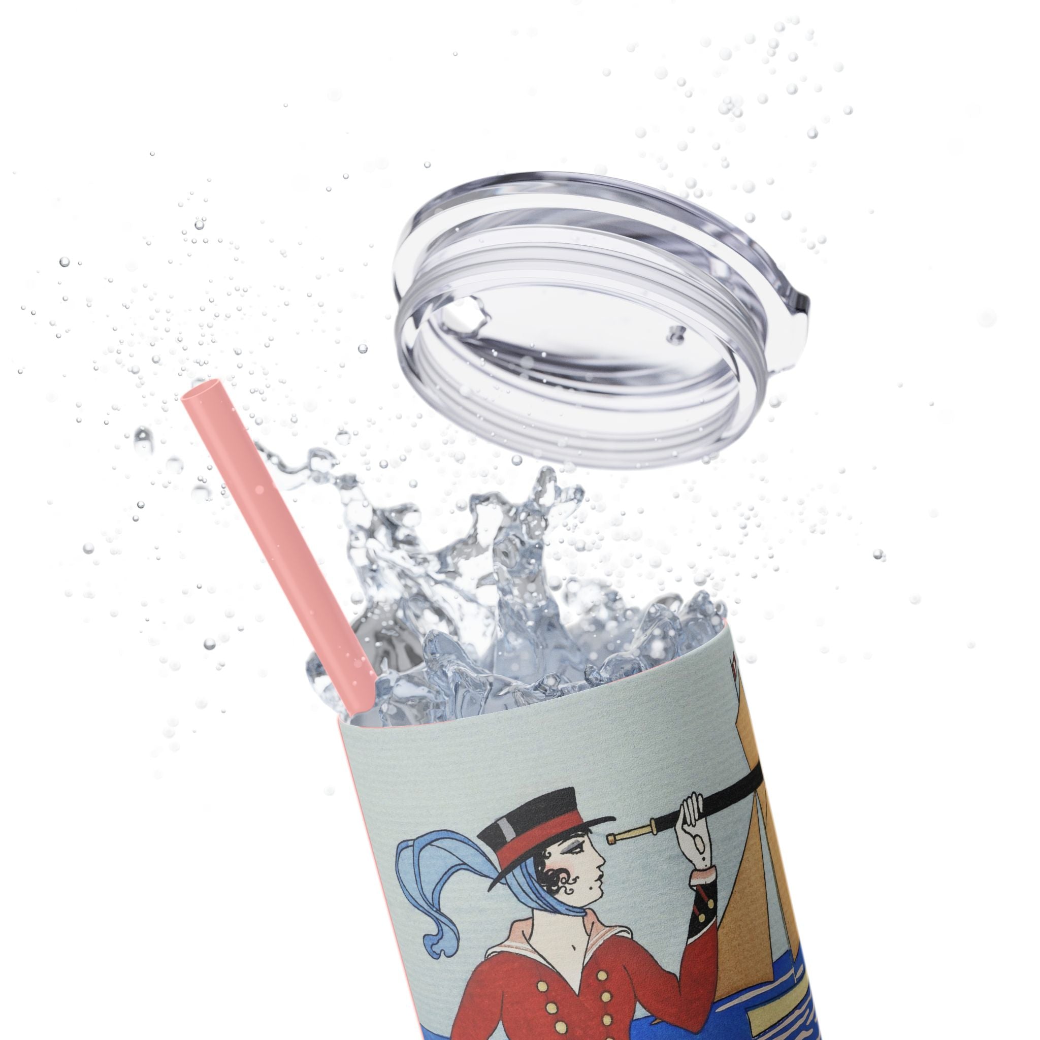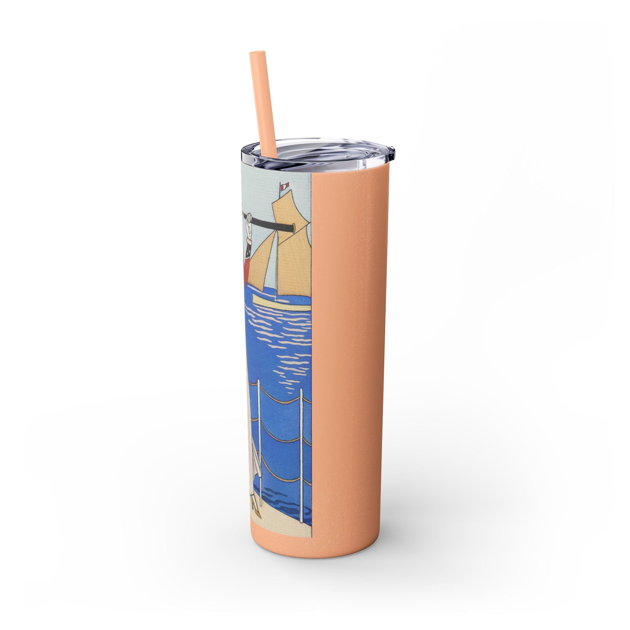 Featured on this tumbler is "Costume de Yacht," a 1914 fashion illustration by George Barbier. Originally published in Journal des Dames et des Modes, it depicts a woman in an elegant striped yachting outfit standing on a pier, gazing out at the water—a timeless image of sophistication and leisure.