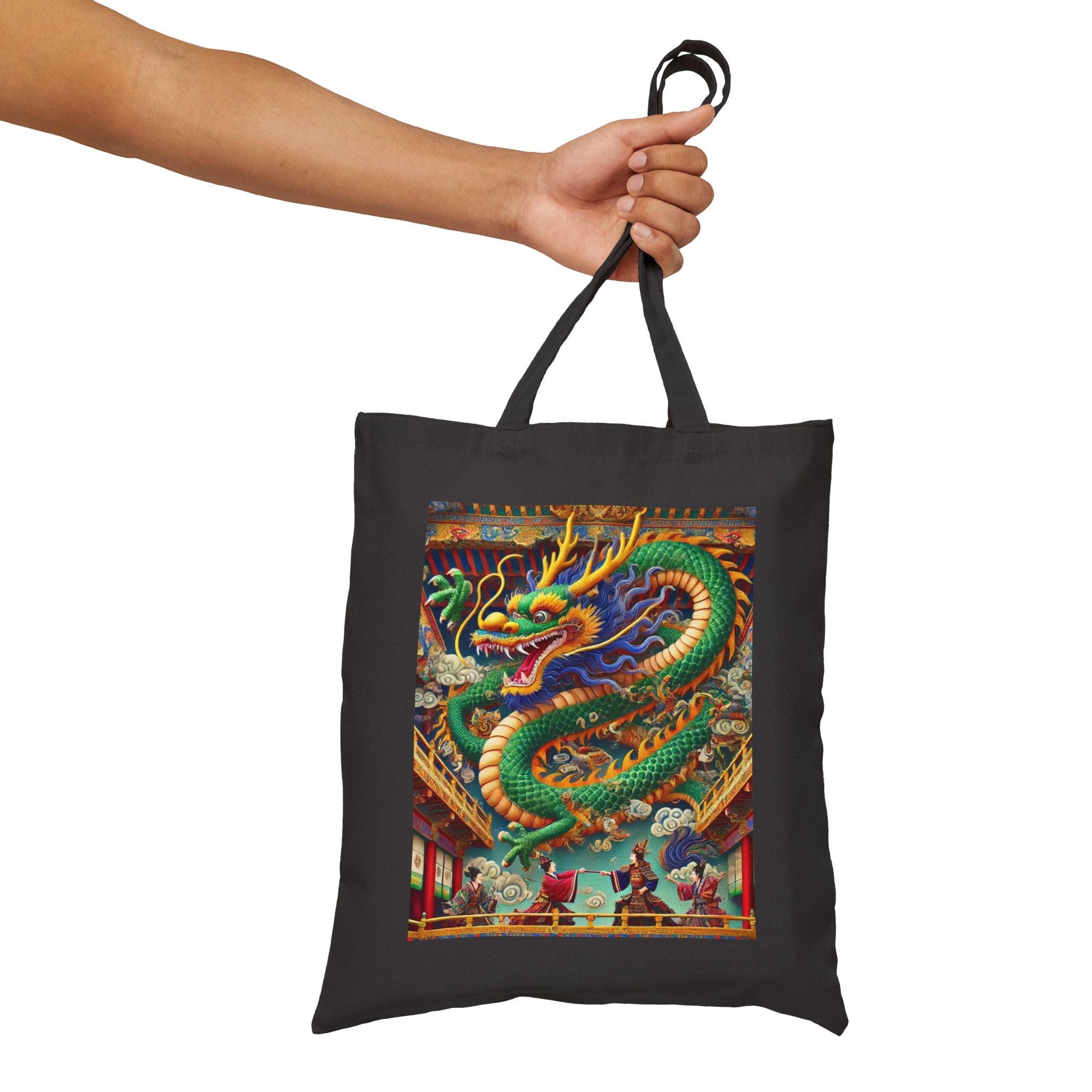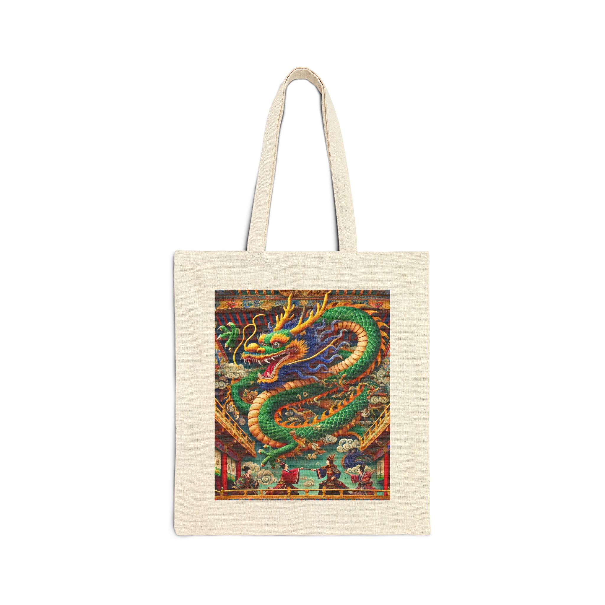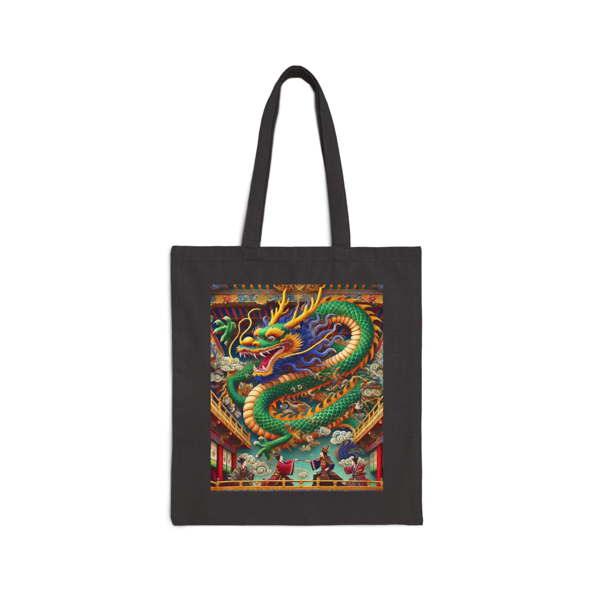 Carry everyday essentials with a tote that blends durability with dramatic artistry. Made from 100% cotton canvas and sized at 15" × 16", this bag is built to last through years of use, whether for daily errands or a week’s worth of shopping. The 20" handles provide comfort and ease, while the natural or black color options pair effortlessly with any style. Showcased on the canvas is a striking design: a majestic Tibetan dragon with shimmering blue, green, and gold scales, poised above a theater balcony. Beneath its commanding form, two Kabuki performers in ornate costumes duel on a richly detailed stage. Bold colors, layered depth, and theatrical flair transform this tote into more than just a bag—it’s a wearable work of art.