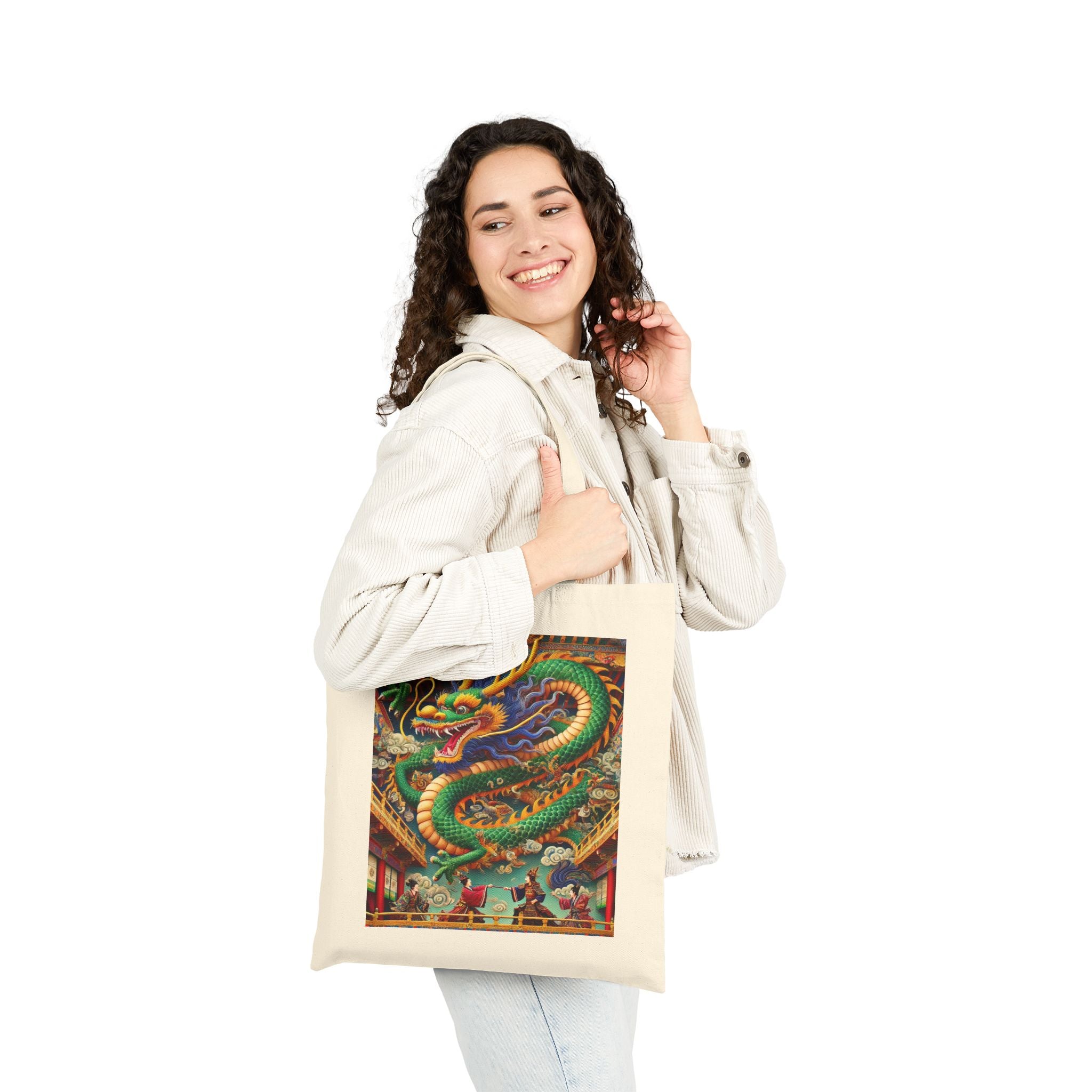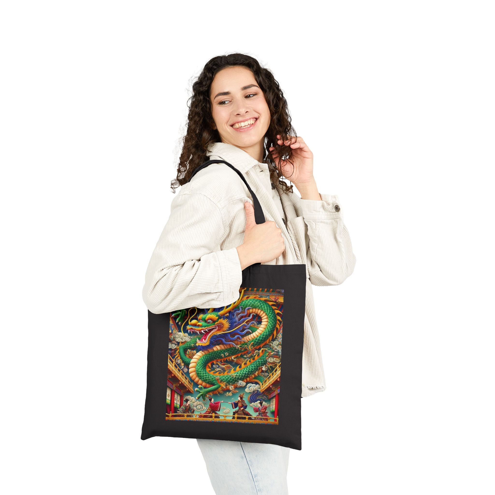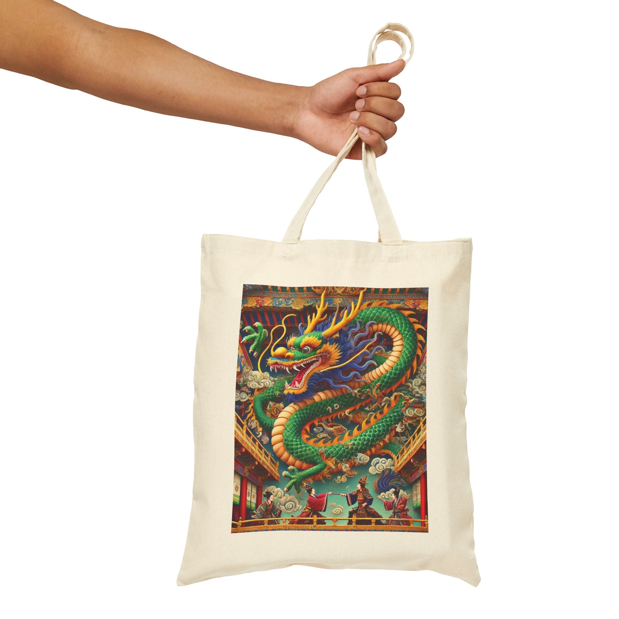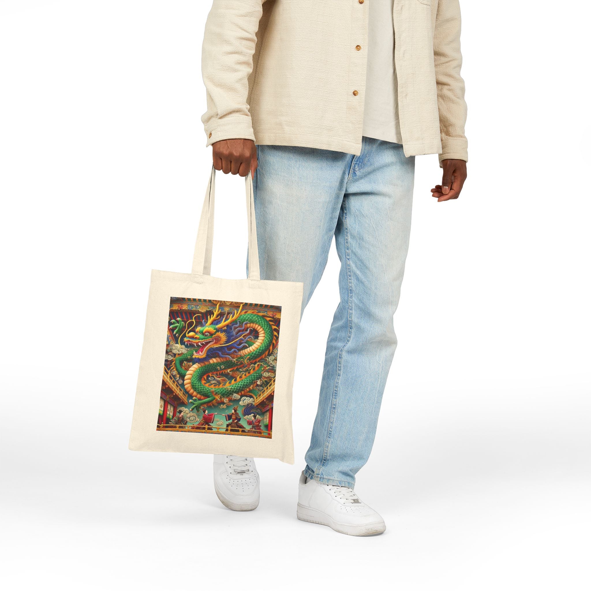 Carry everyday essentials with a tote that blends durability with dramatic artistry. Made from 100% cotton canvas and sized at 15" × 16", this bag is built to last through years of use, whether for daily errands or a week’s worth of shopping. The 20" handles provide comfort and ease, while the natural or black color options pair effortlessly with any style. Showcased on the canvas is a striking design: a majestic Tibetan dragon with shimmering blue, green, and gold scales, poised above a theater balcony. Beneath its commanding form, two Kabuki performers in ornate costumes duel on a richly detailed stage. Bold colors, layered depth, and theatrical flair transform this tote into more than just a bag—it’s a wearable work of art.