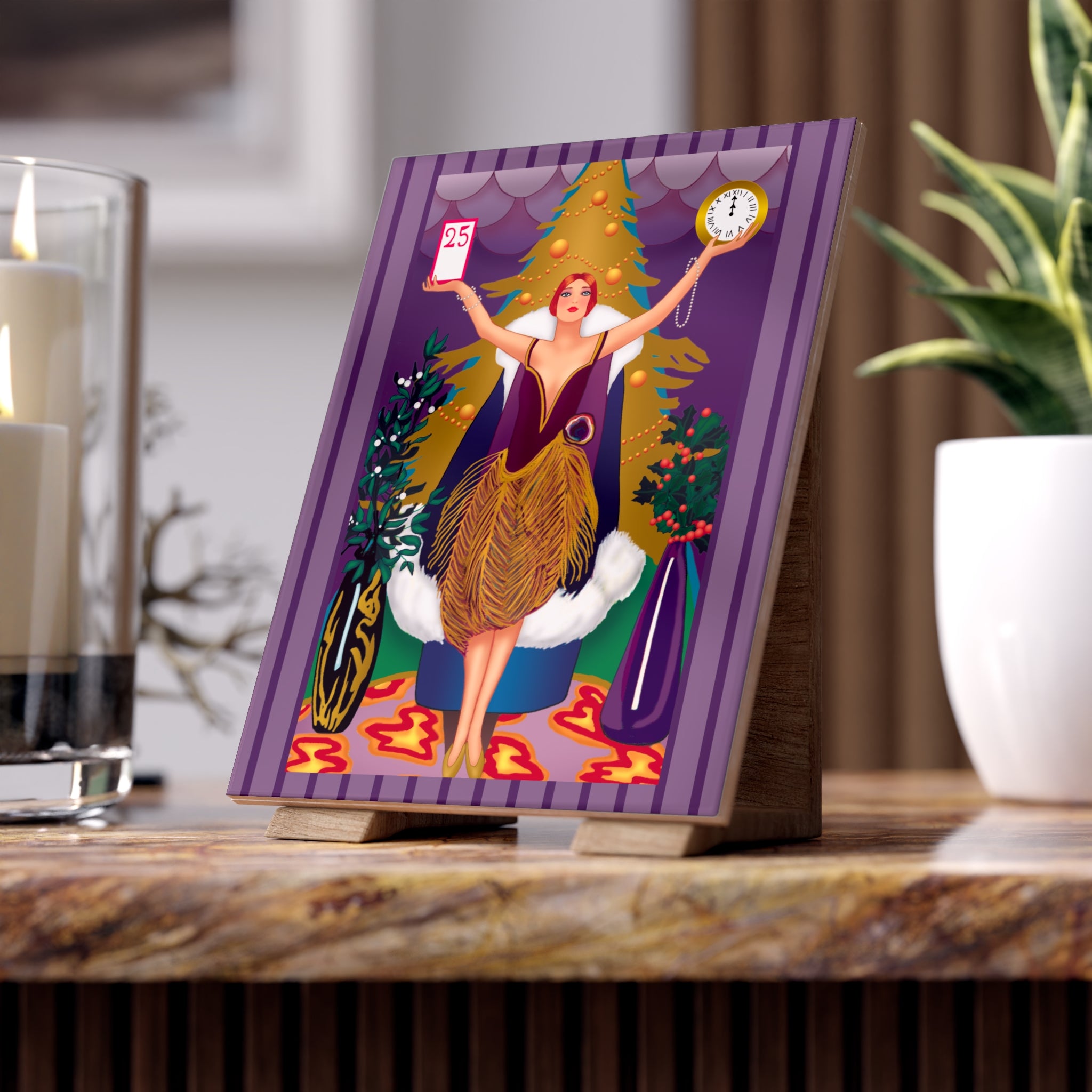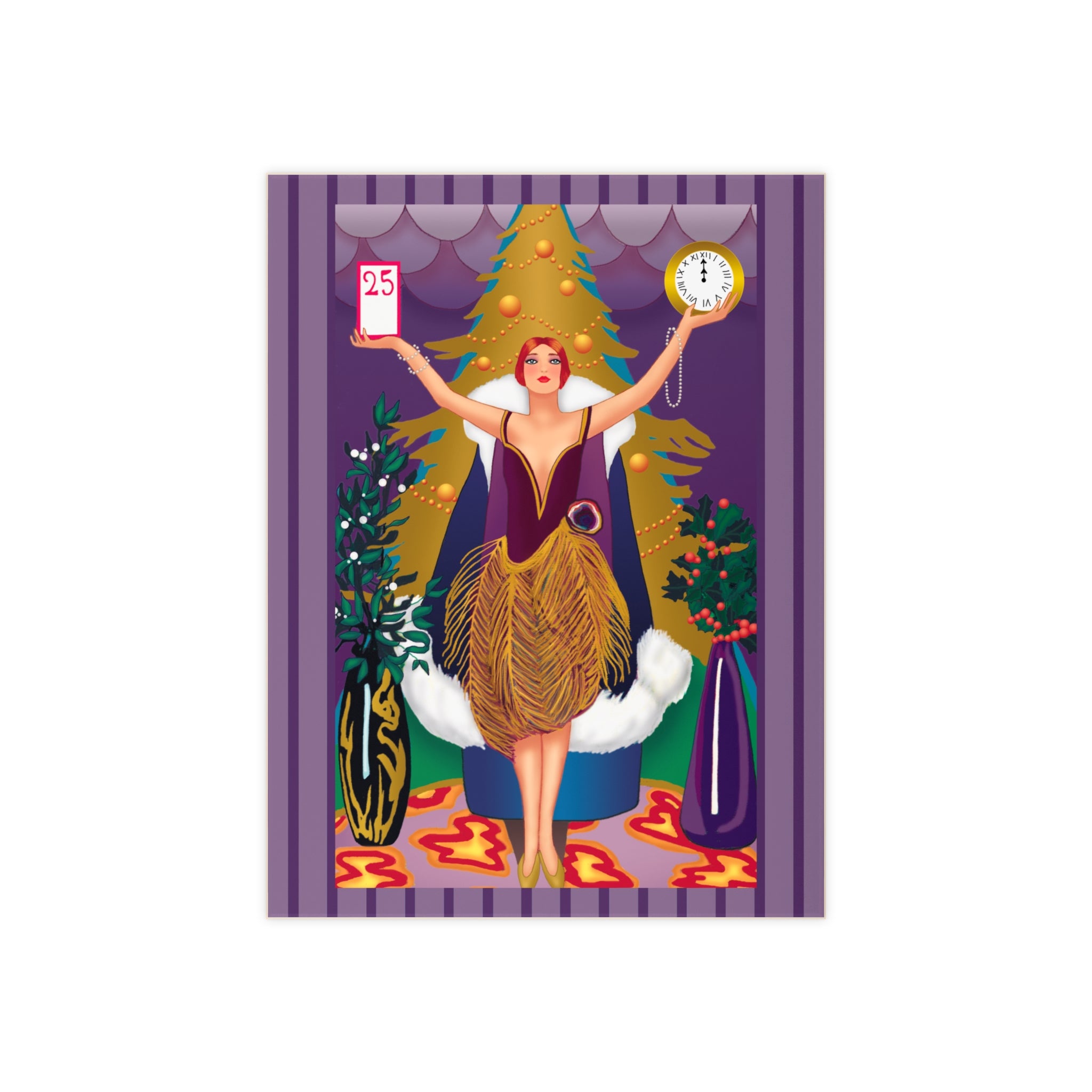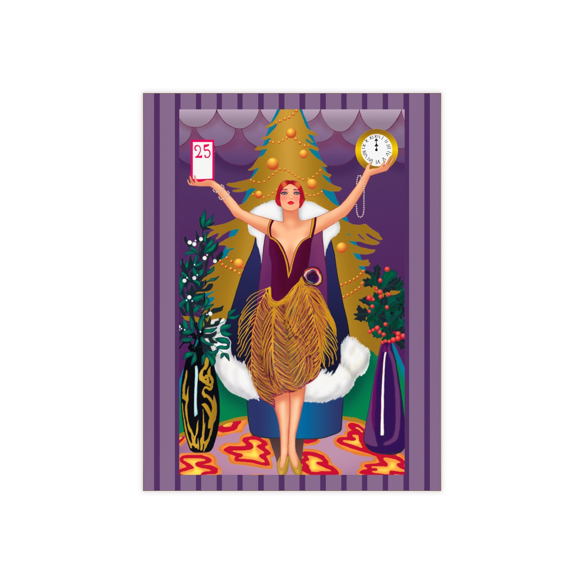 The artwork shows a graceful woman in a golden feathered skirt and deep plum bodice standing before a radiant Christmas tree. In her hands she holds a calendar marked “25” and a clock striking midnight—symbols of the countdown to Christmas Day. Rich jewel tones, shimmering patterns, and festive greenery surround her, blending Art Deco elegance with the magic of the season. This piece adds timeless charm and beauty to any holiday décor.