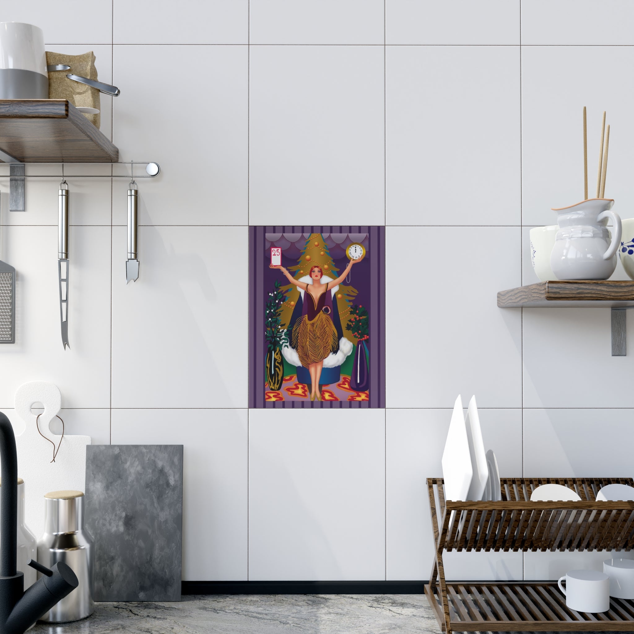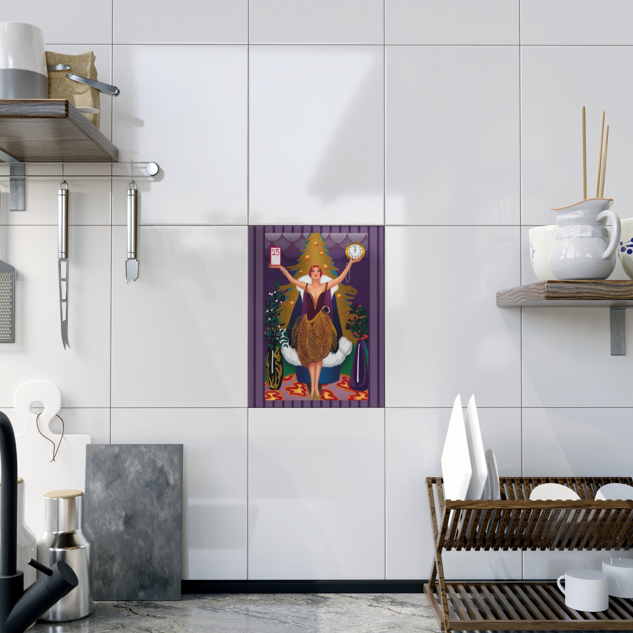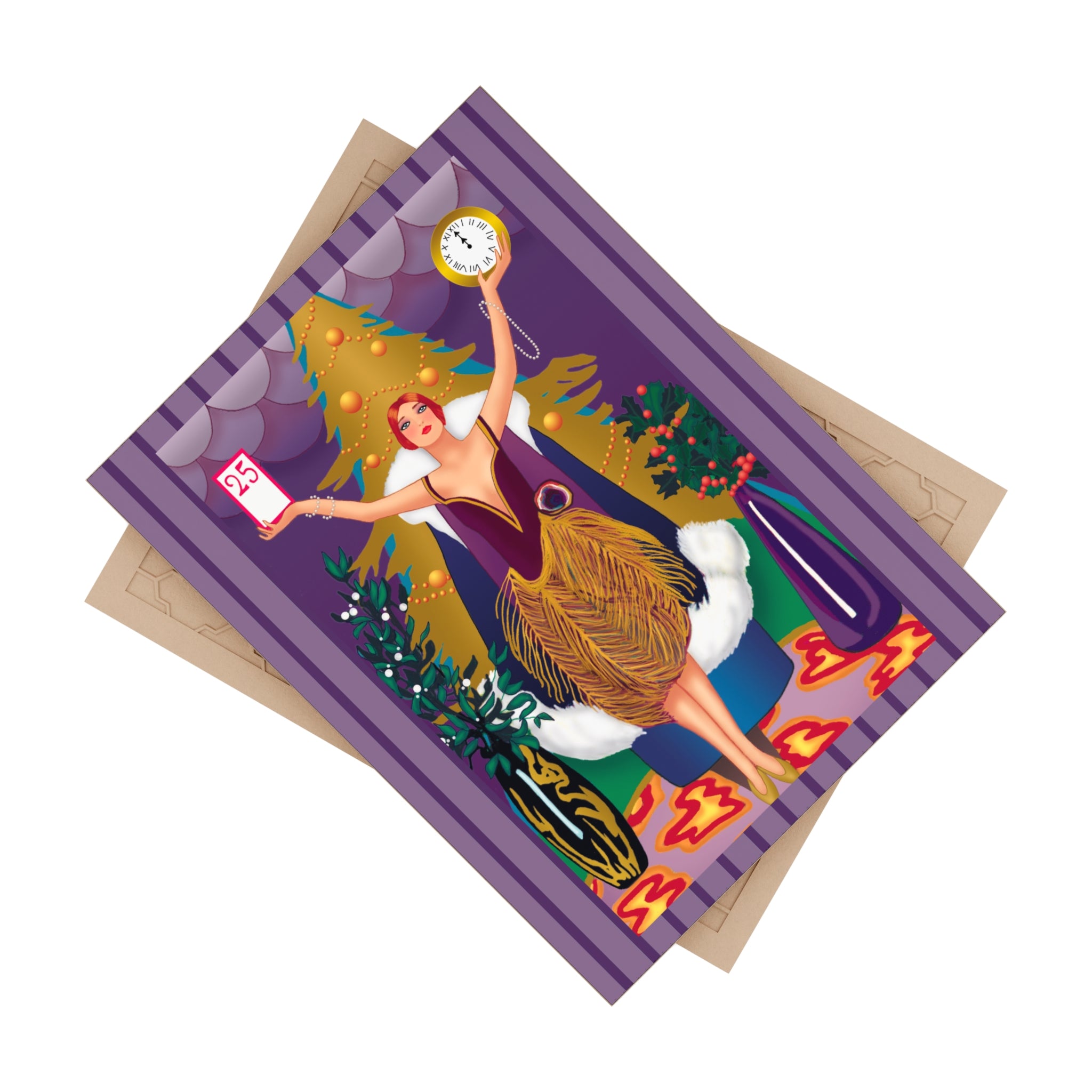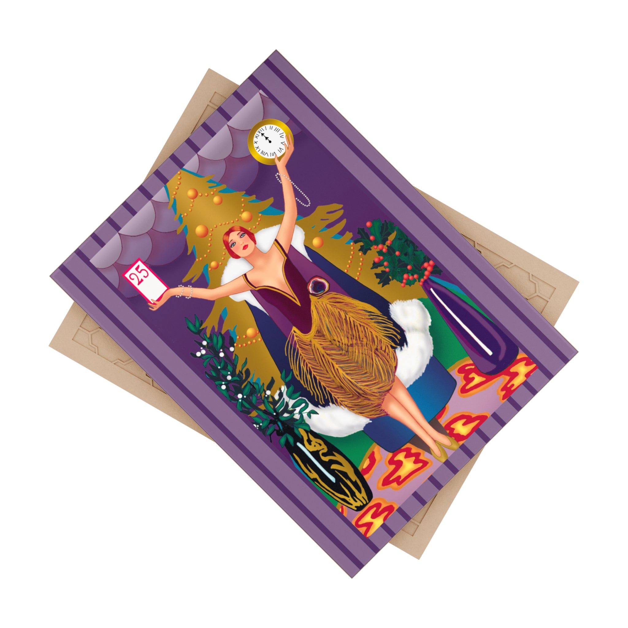 The artwork shows a graceful woman in a golden feathered skirt and deep plum bodice standing before a radiant Christmas tree. In her hands she holds a calendar marked “25” and a clock striking midnight—symbols of the countdown to Christmas Day. Rich jewel tones, shimmering patterns, and festive greenery surround her, blending Art Deco elegance with the magic of the season. This piece adds timeless charm and beauty to any holiday décor.