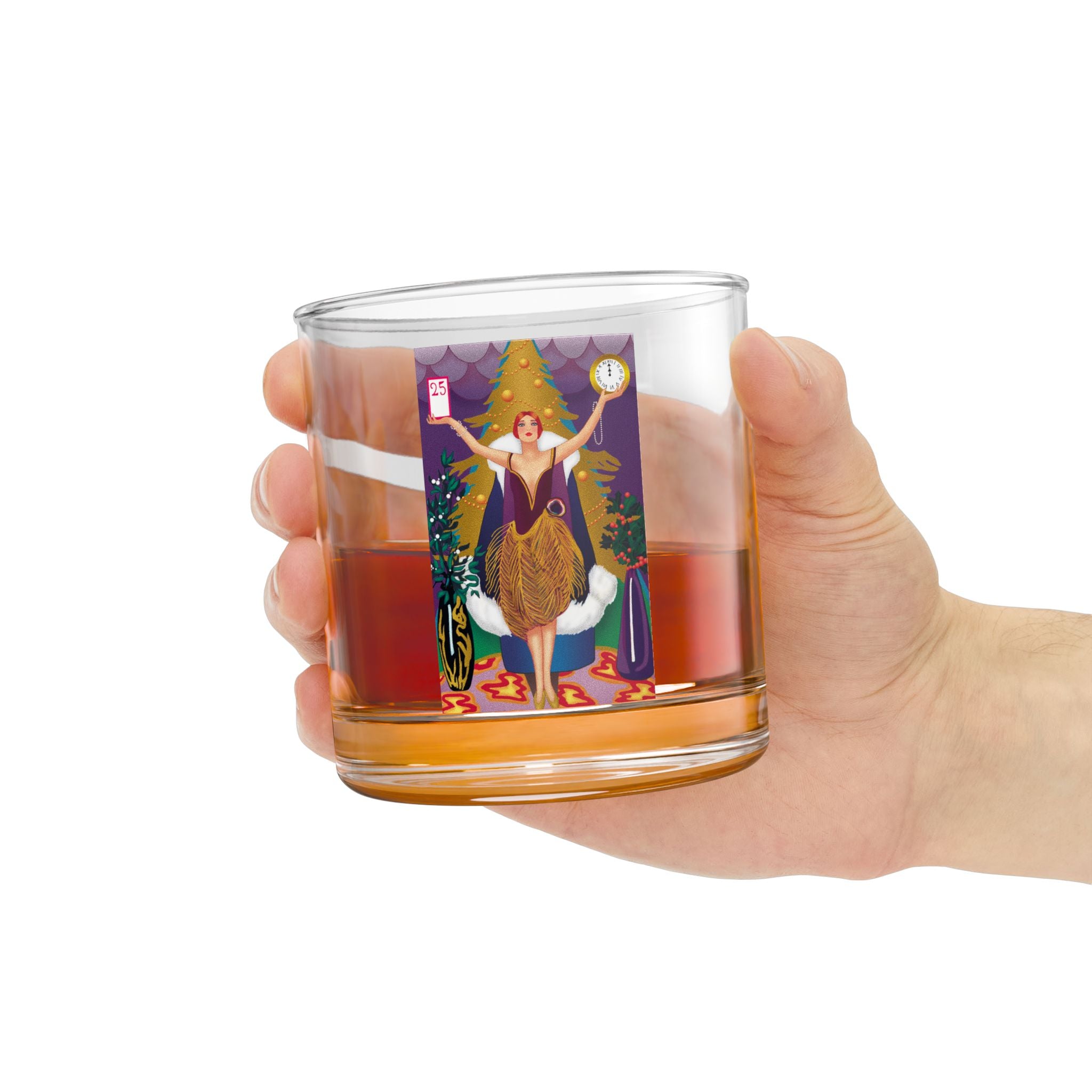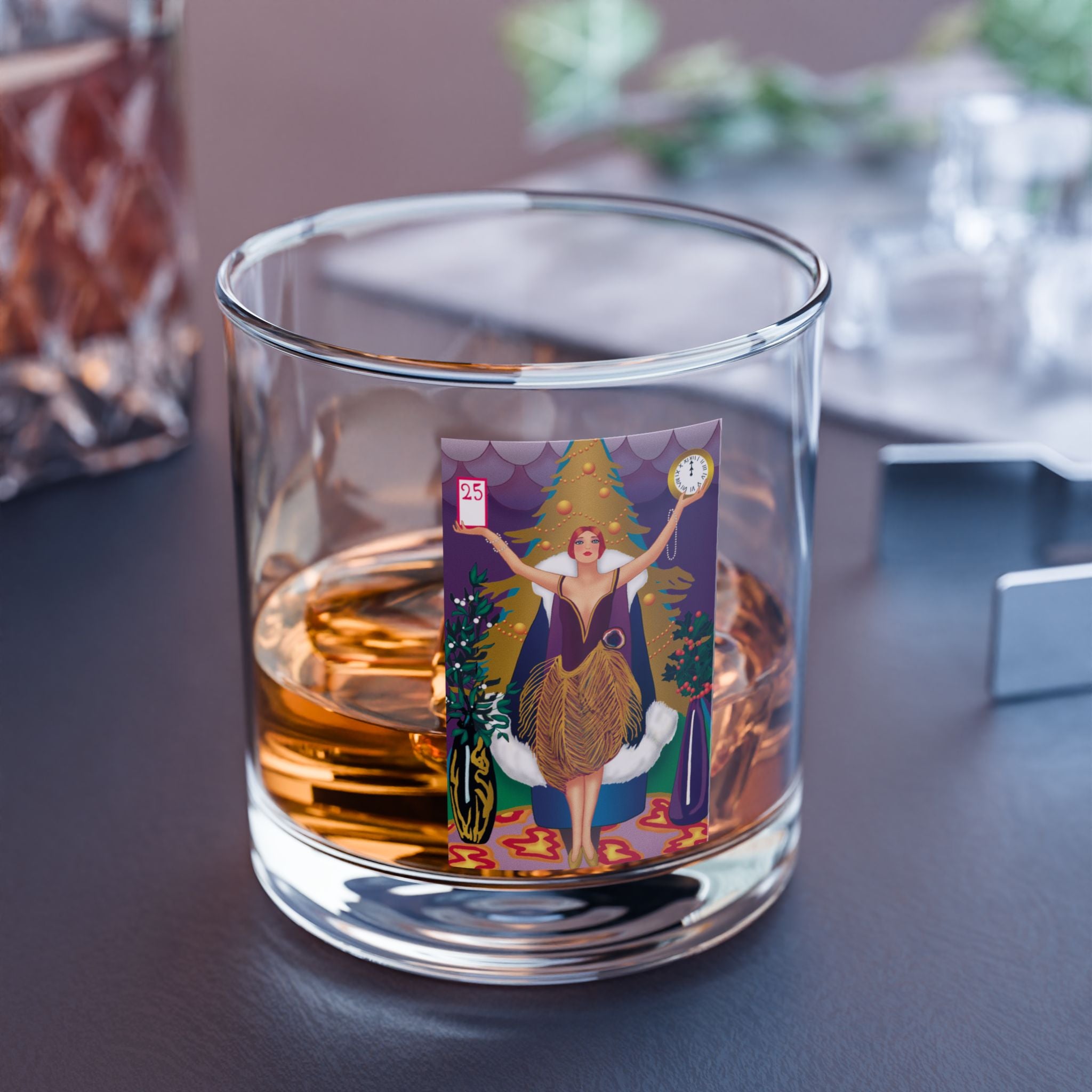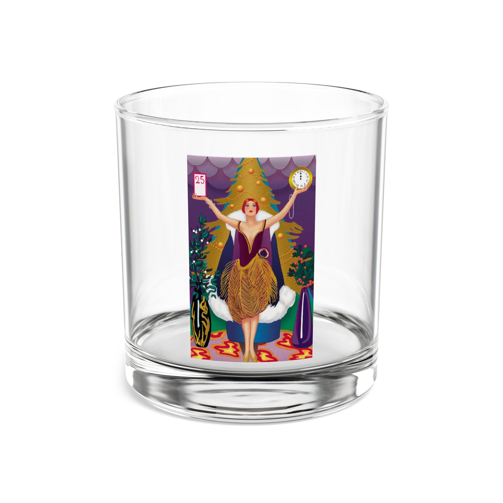 The artwork captures the glamour and anticipation of the holiday season. A poised woman in a golden feathered skirt and deep plum bodice stands before a glowing Christmas tree, arms raised gracefully. In one hand, she holds a calendar marked “25,” and in the other, a clock striking midnight—symbols of celebration and timeless festivity. Surrounded by jewel tones, winter greenery, and bold Art Deco patterns, the design transforms this rocks glass into a story of elegance, tradition, and holiday magic.
