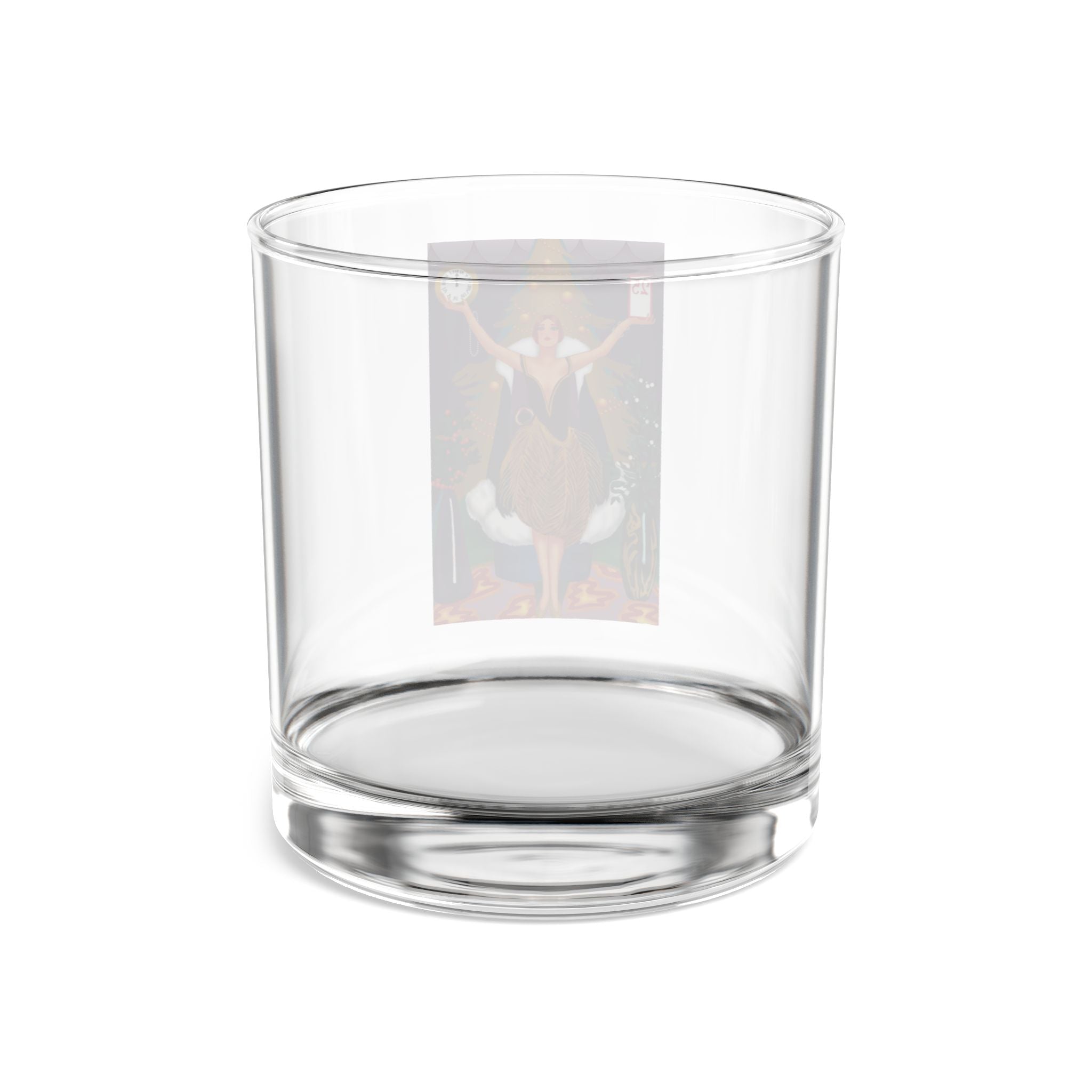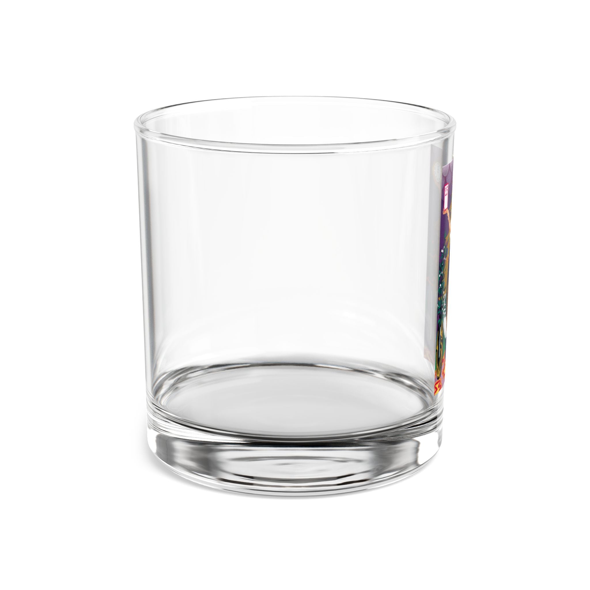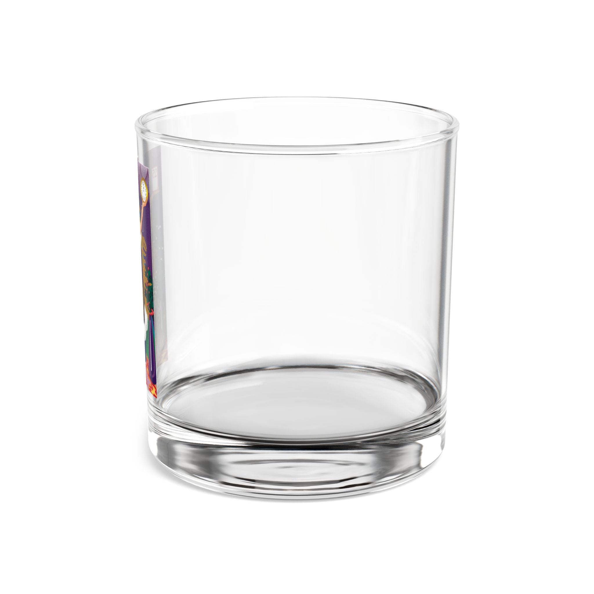The artwork captures the glamour and anticipation of the holiday season. A poised woman in a golden feathered skirt and deep plum bodice stands before a glowing Christmas tree, arms raised gracefully. In one hand, she holds a calendar marked “25,” and in the other, a clock striking midnight—symbols of celebration and timeless festivity. Surrounded by jewel tones, winter greenery, and bold Art Deco patterns, the design transforms this rocks glass into a story of elegance, tradition, and holiday magic.