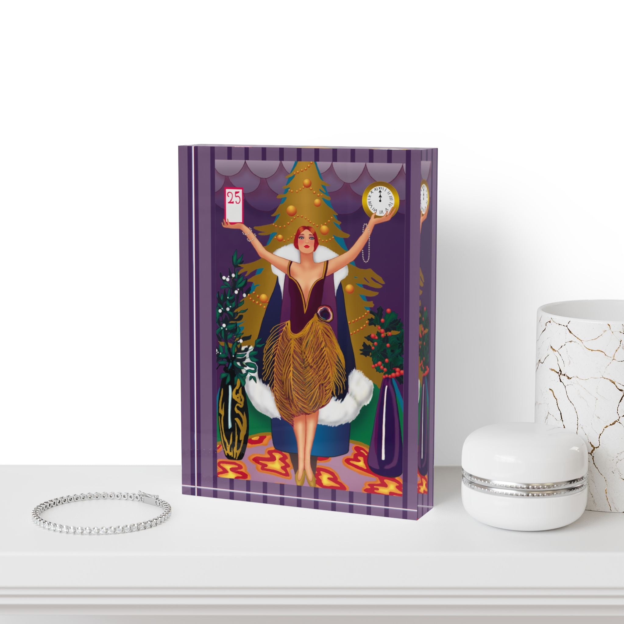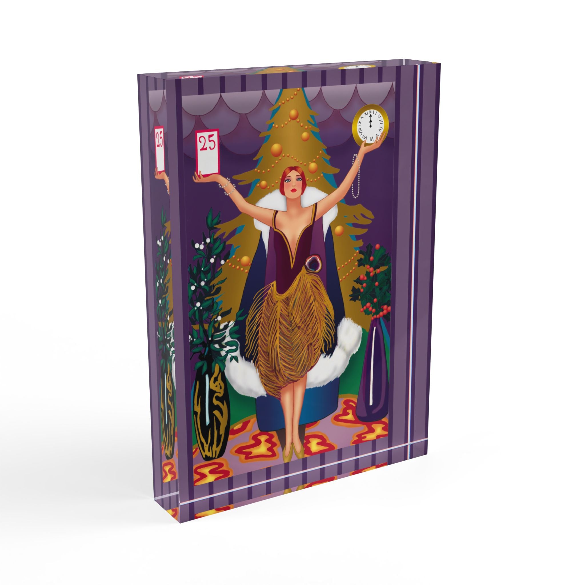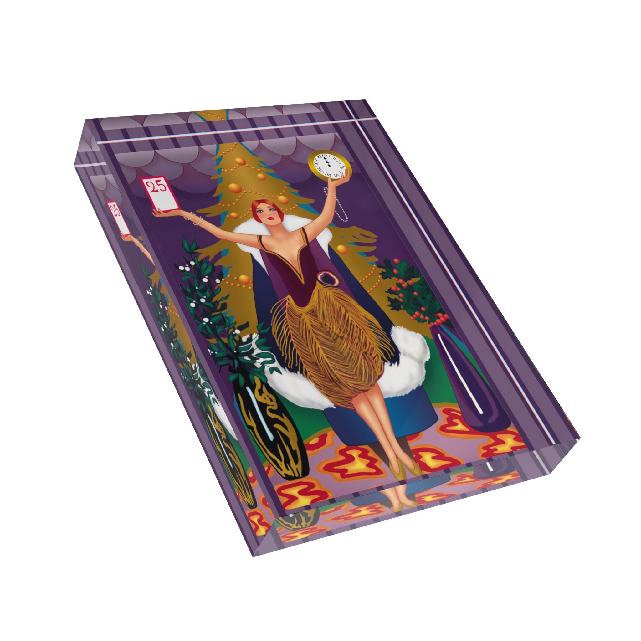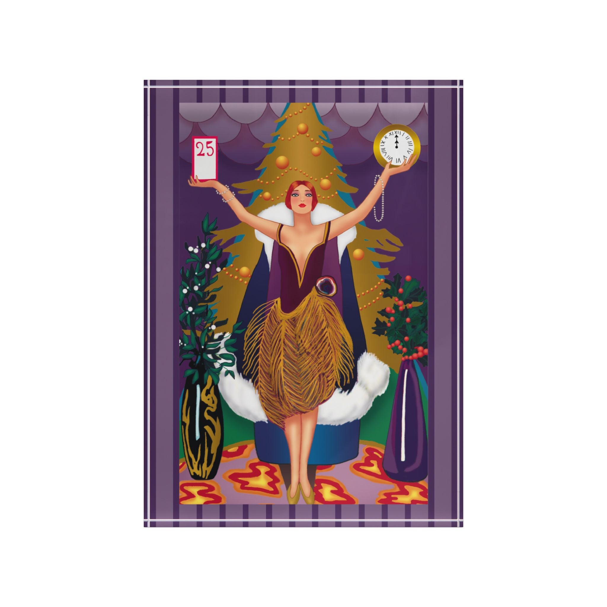 The artwork shows a poised woman in a golden feathered skirt and deep plum bodice standing before a glowing Christmas tree. She holds a calendar marked “25” and a clock striking midnight, symbols of festivity and the holiday countdown. Surrounded by jewel tones, ornaments, and winter greenery, the scene blends Art Deco glamour with seasonal magic—capturing the joy and anticipation of Christmas Day.