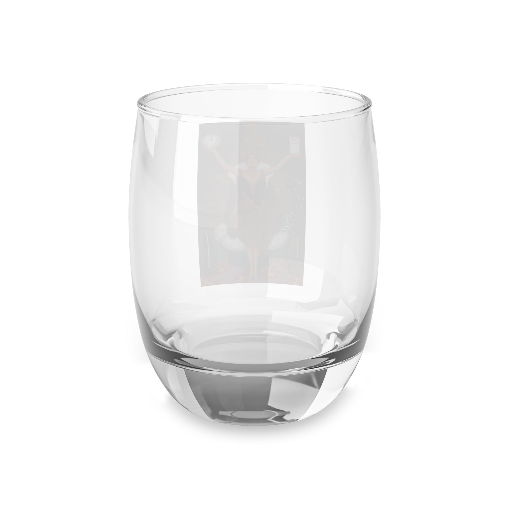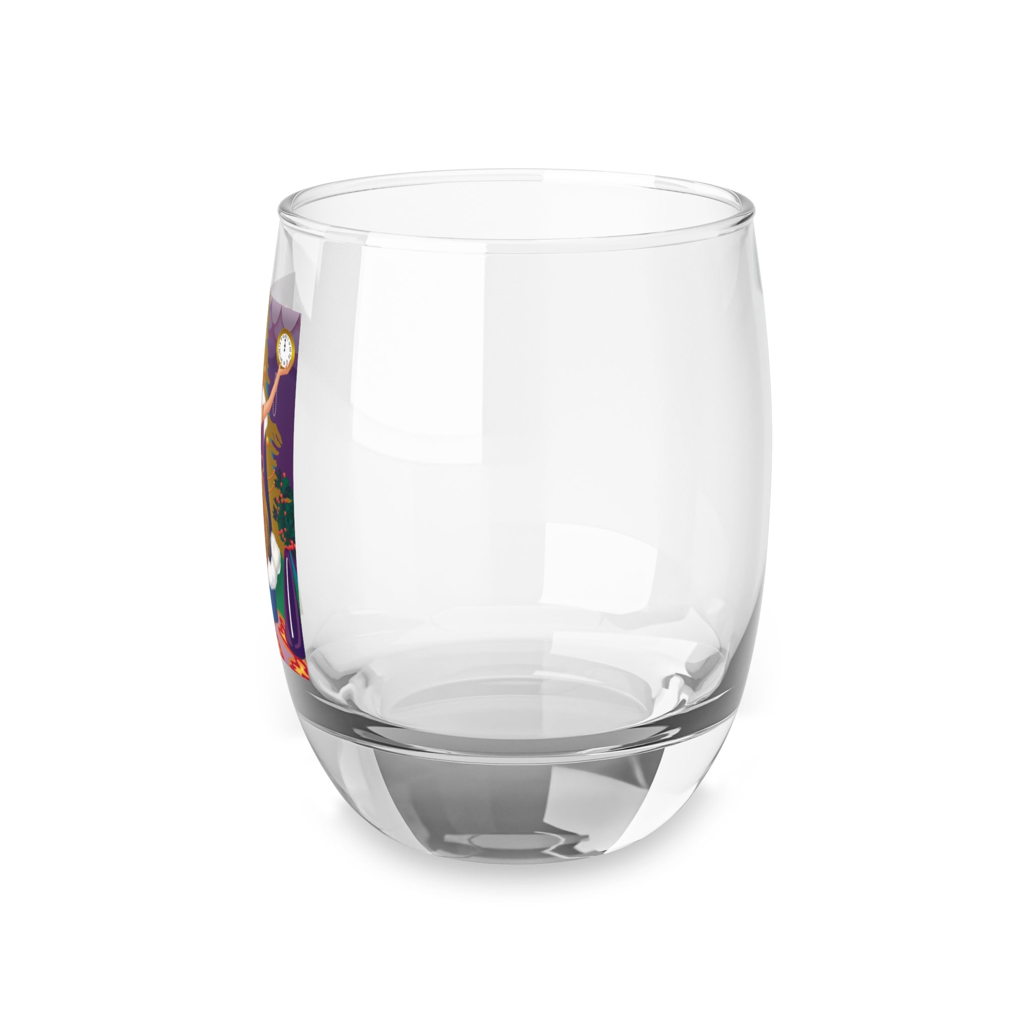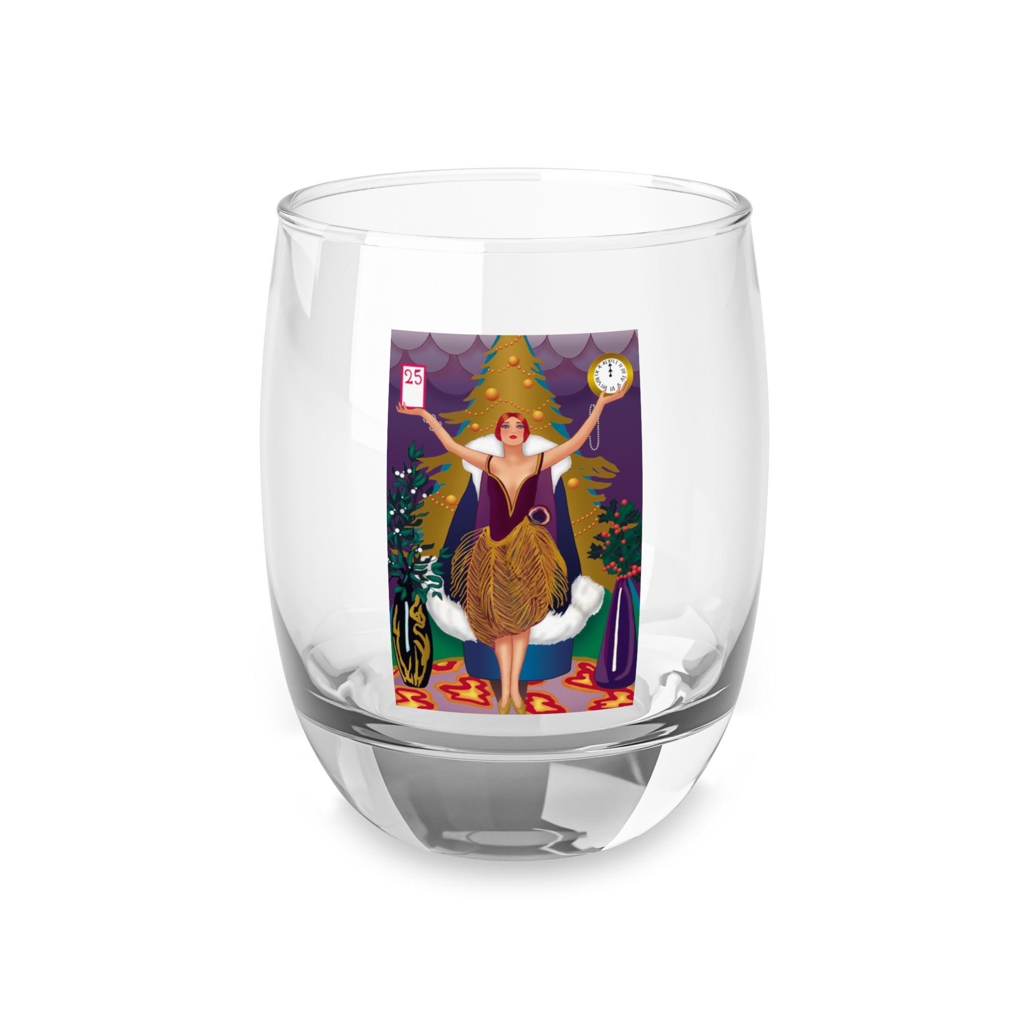 The artwork transforms this glass into a celebration of holiday glamour. A poised woman in a golden feathered skirt and deep plum bodice stands before a glowing Christmas tree, arms lifted in grace. In one hand, she holds a calendar marked “25,” and in the other, a clock striking midnight—symbols of festivity and anticipation. Surrounded by jewel tones, greenery, and bold Art Deco patterns, the design blends elegance with seasonal magic, turning every sip into a timeless holiday moment.