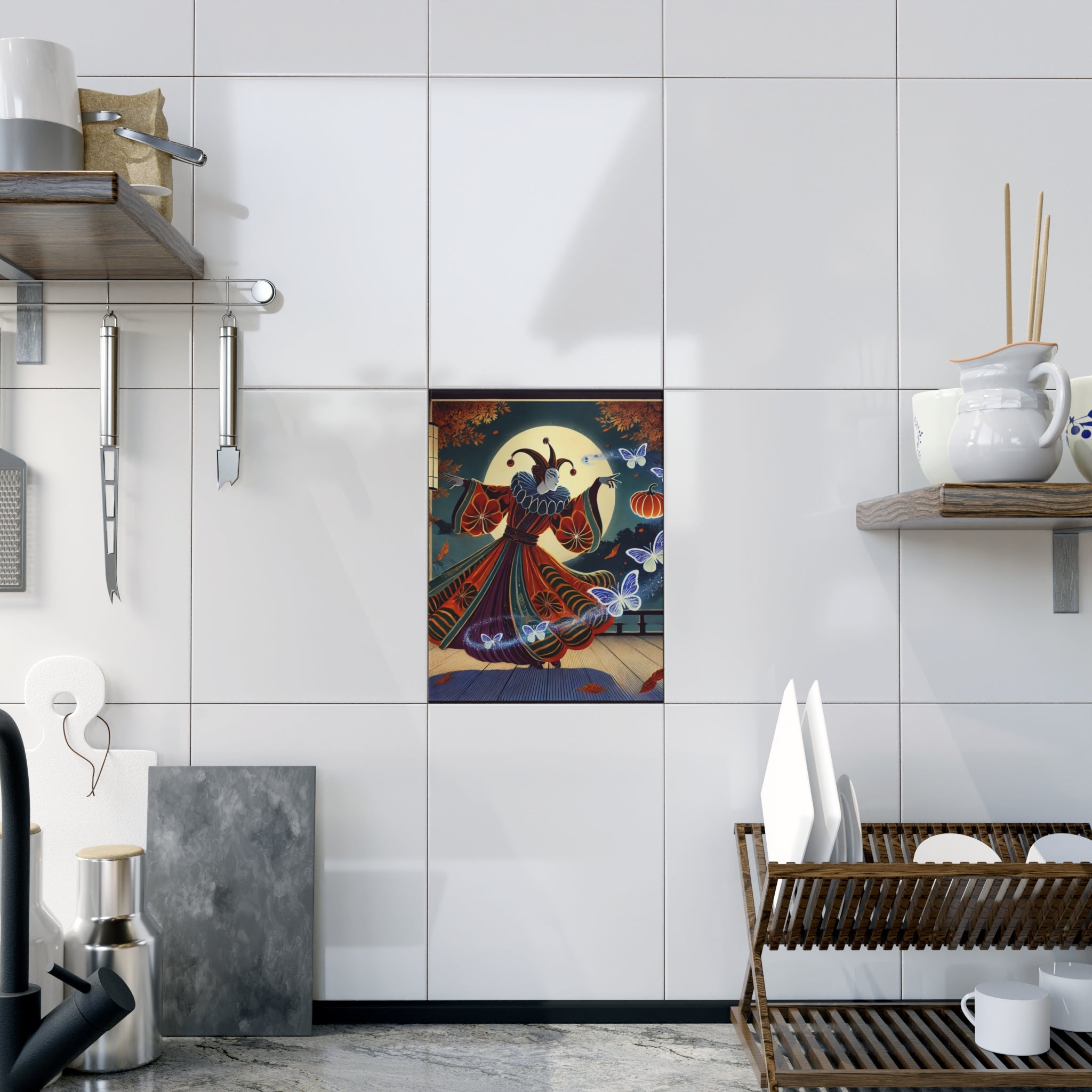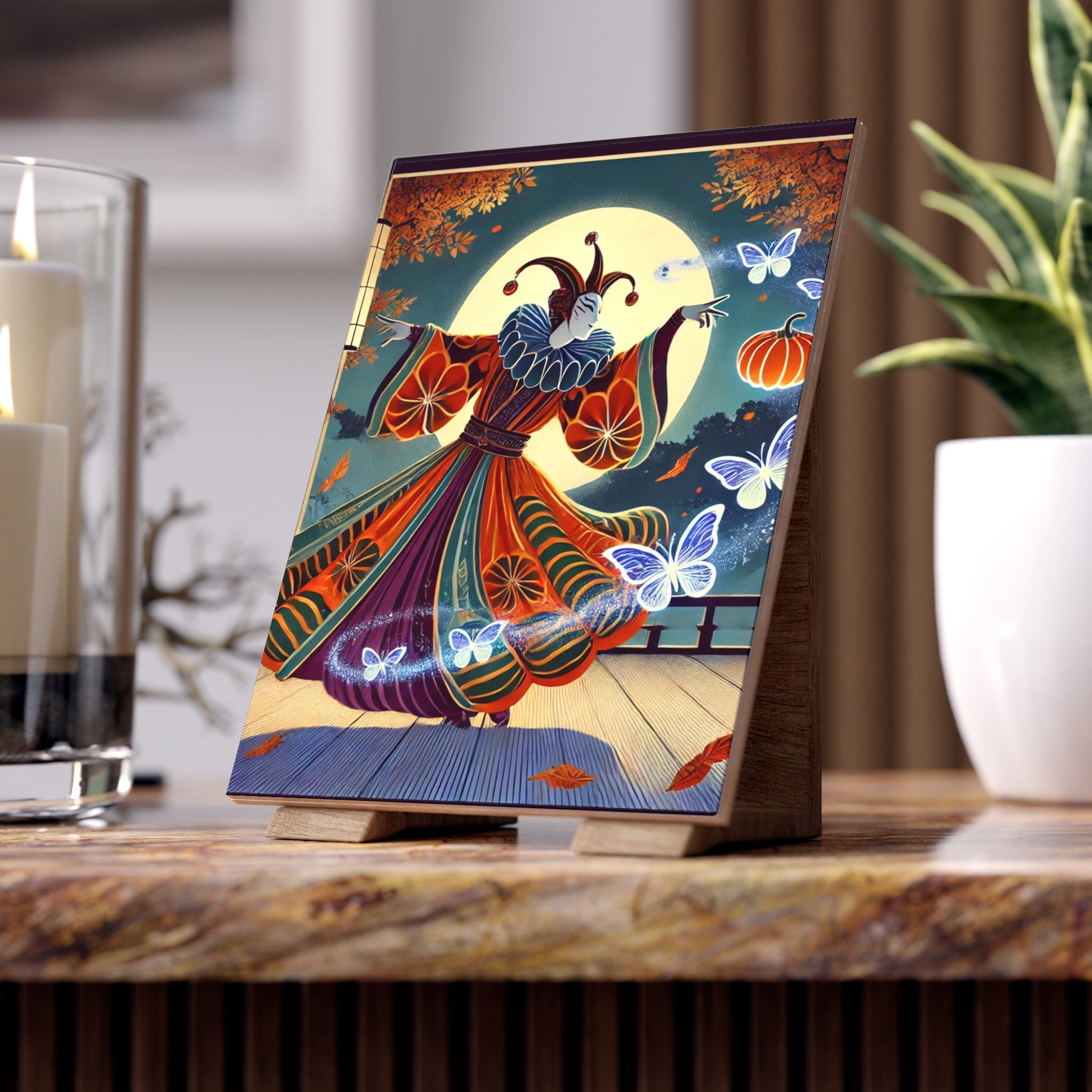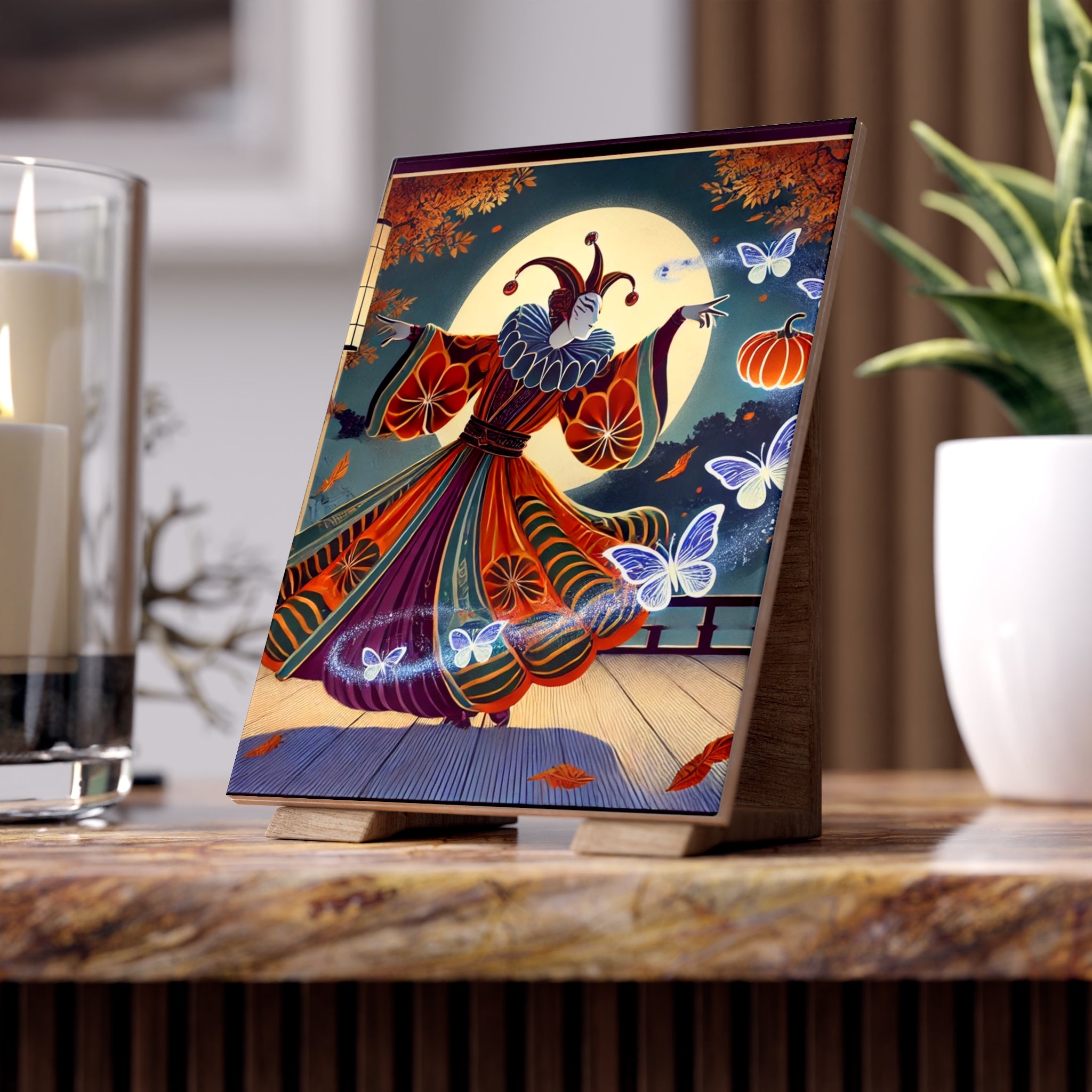 Across its surface, a kabuki-inspired court magician moves with graceful elegance, dressed in a vibrant gourd-patterned doublet. With a flourish of his hands, ghostly butterflies drift into the air, swirling in luminous colors against a rich, dynamic backdrop. The bold flat-style design captures both the mischievous charm of a jester and the mystical allure of kabuki theater. Whether displayed as wall art, incorporated into décor, or collected as a unique keepsake, this tile merges performance, fantasy, and cultural artistry into one captivating piece.