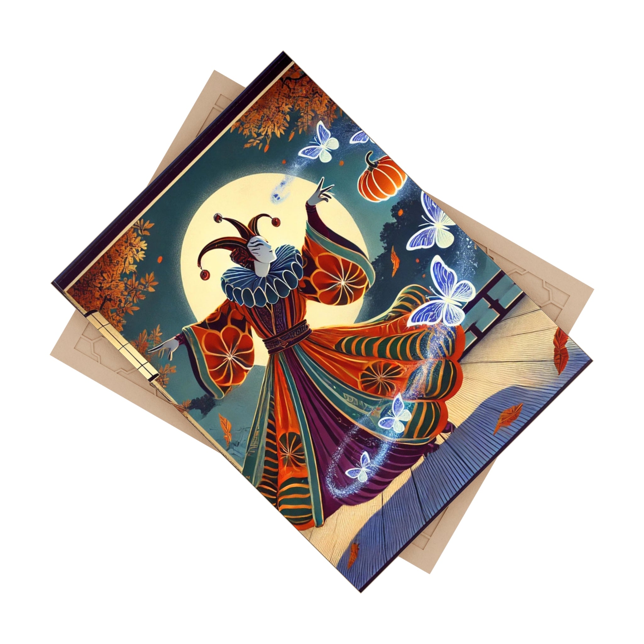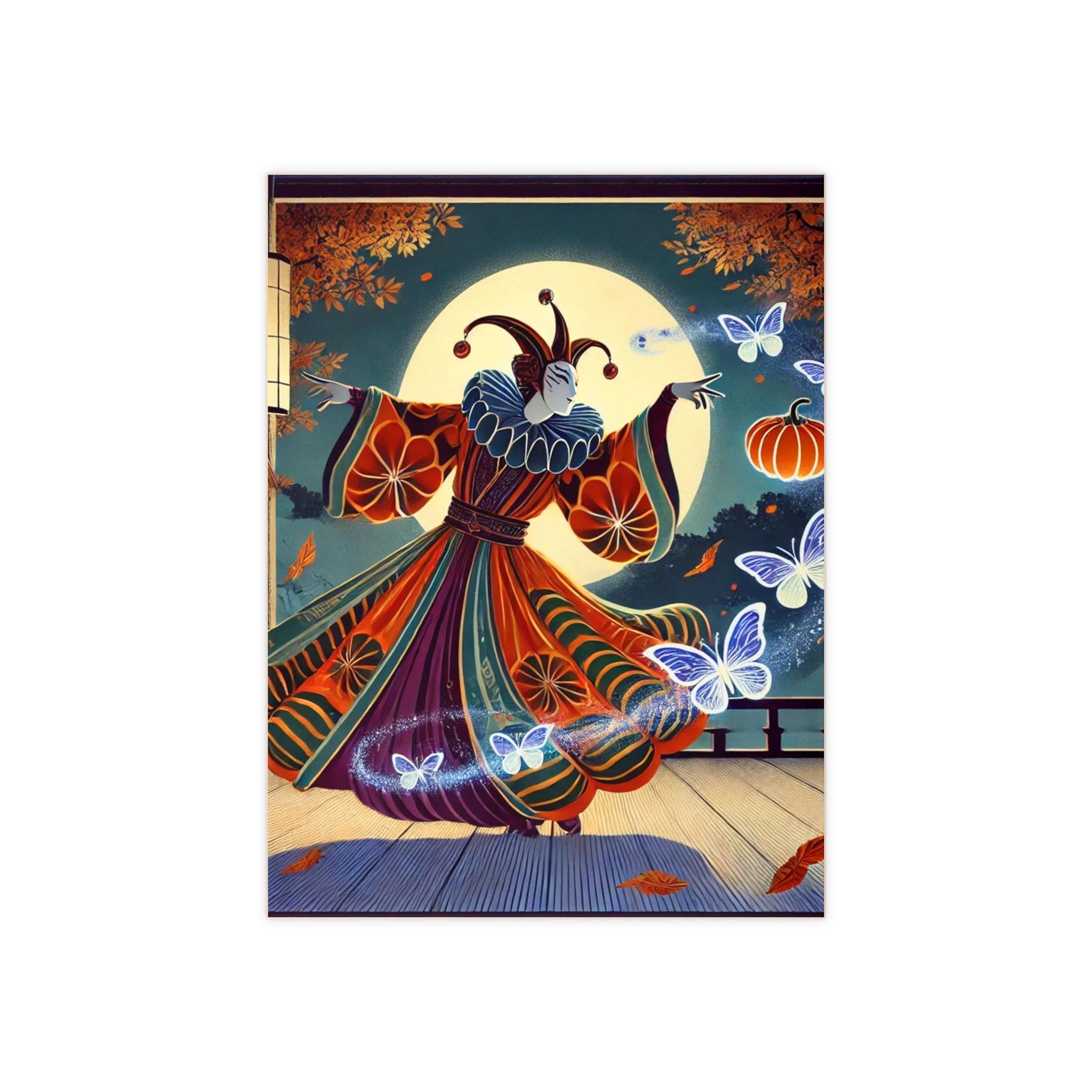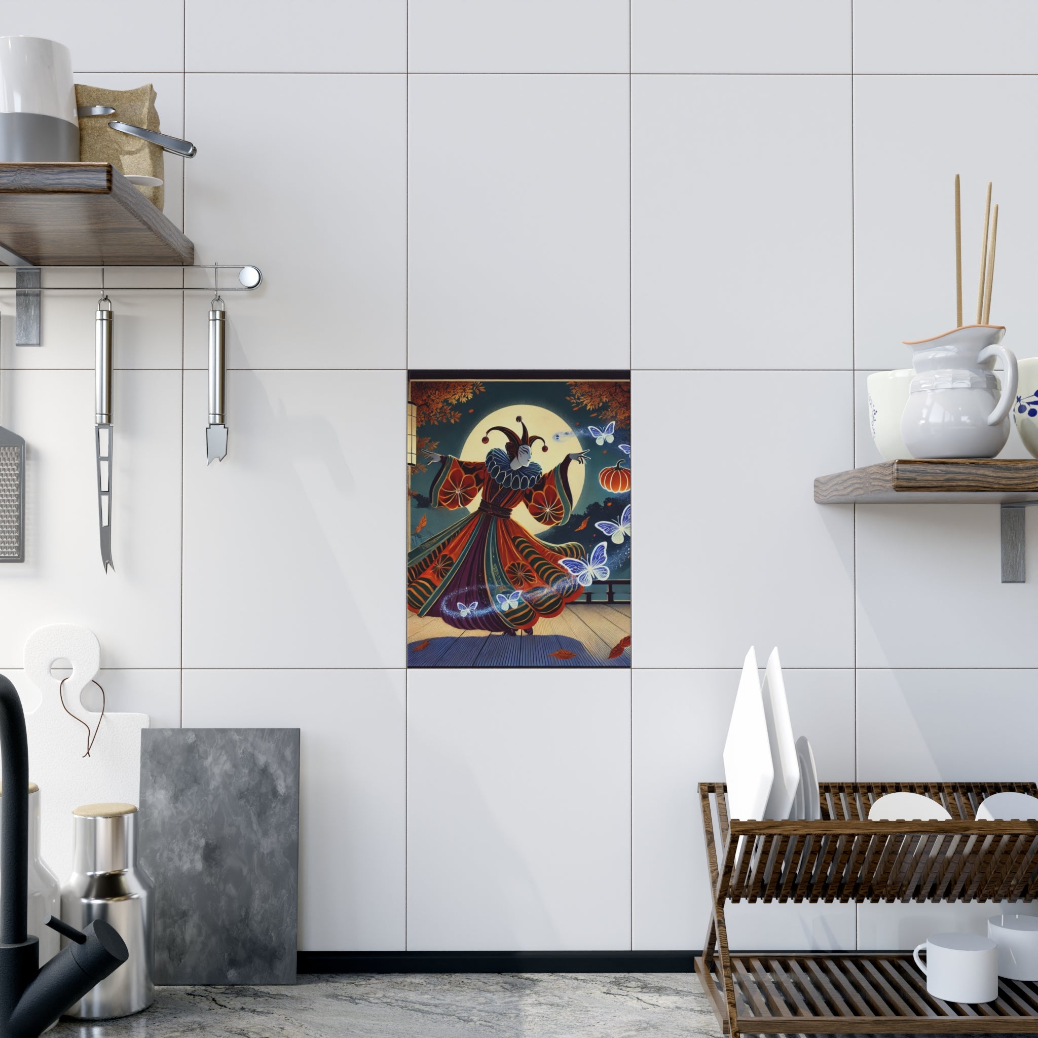 Across its surface, a kabuki-inspired court magician moves with graceful elegance, dressed in a vibrant gourd-patterned doublet. With a flourish of his hands, ghostly butterflies drift into the air, swirling in luminous colors against a rich, dynamic backdrop. The bold flat-style design captures both the mischievous charm of a jester and the mystical allure of kabuki theater. Whether displayed as wall art, incorporated into décor, or collected as a unique keepsake, this tile merges performance, fantasy, and cultural artistry into one captivating piece.