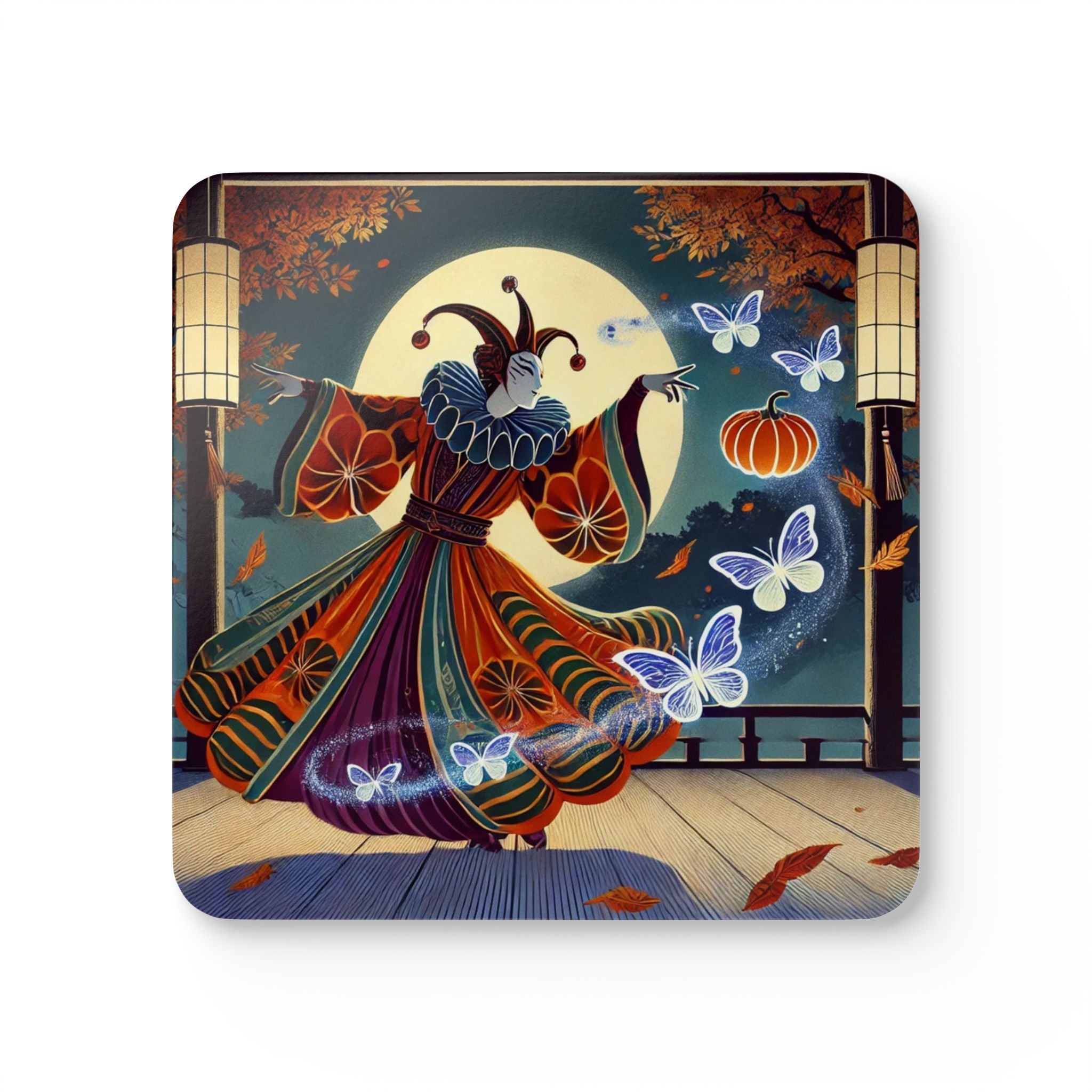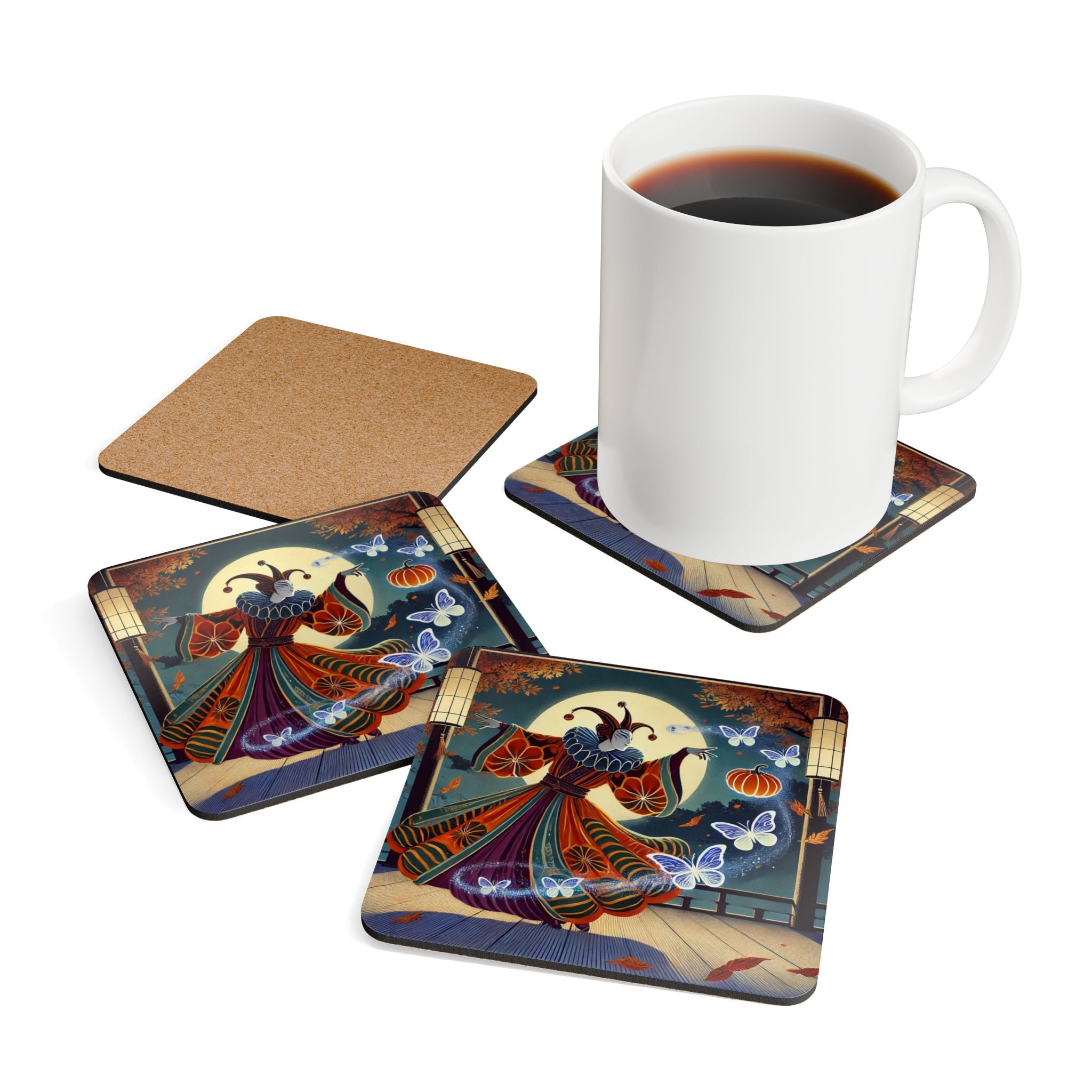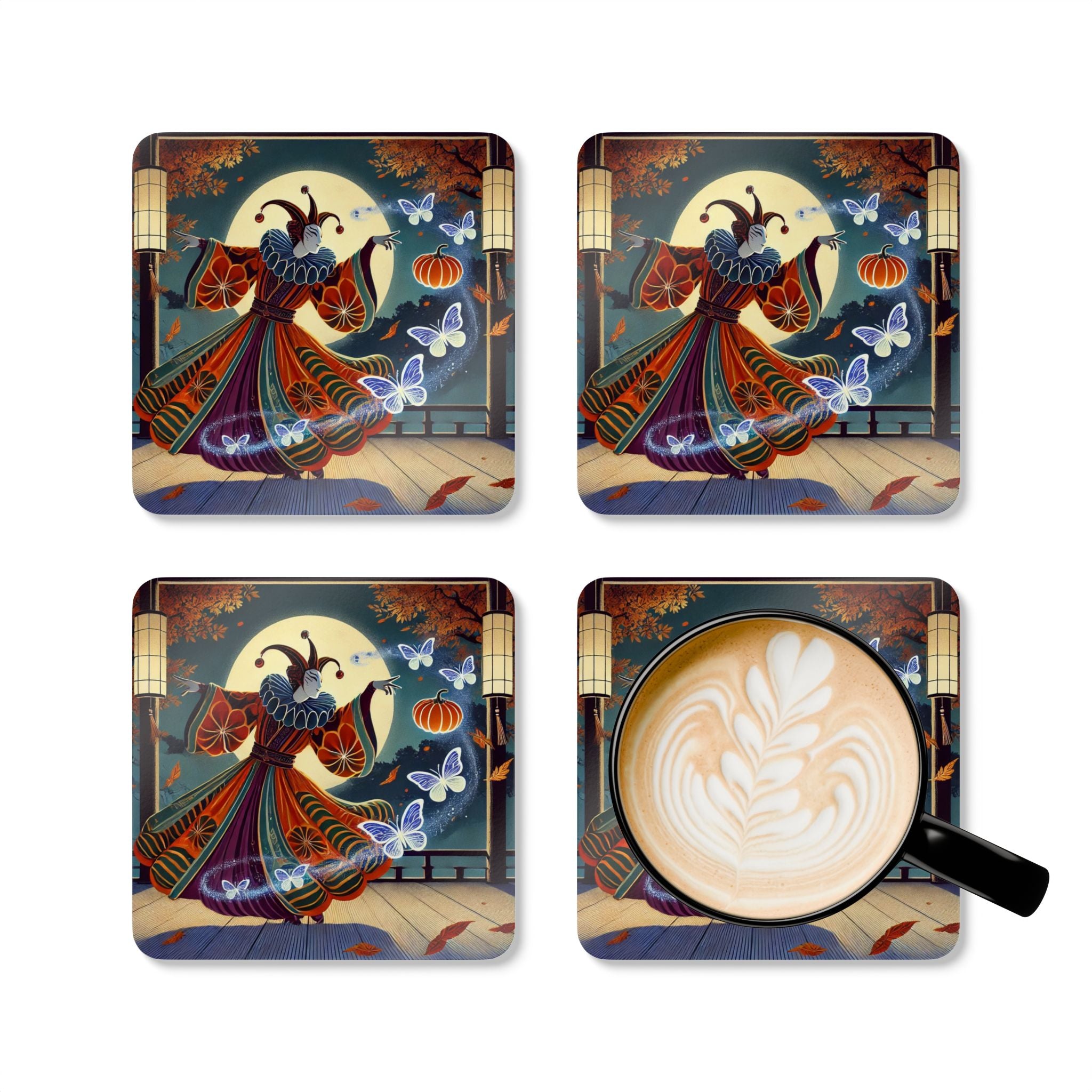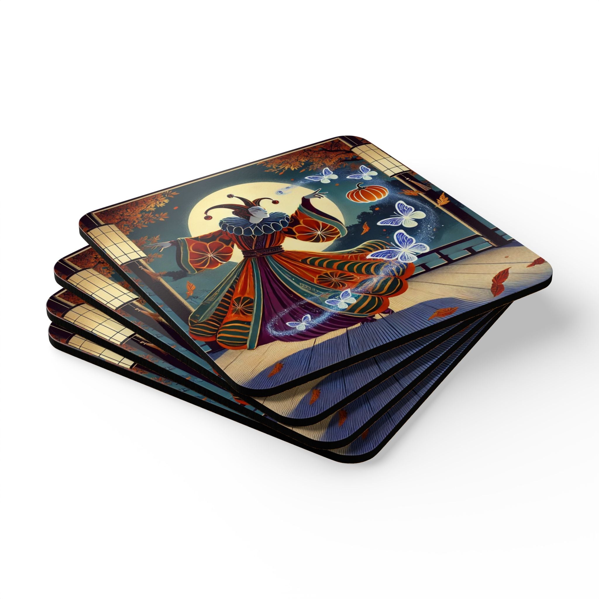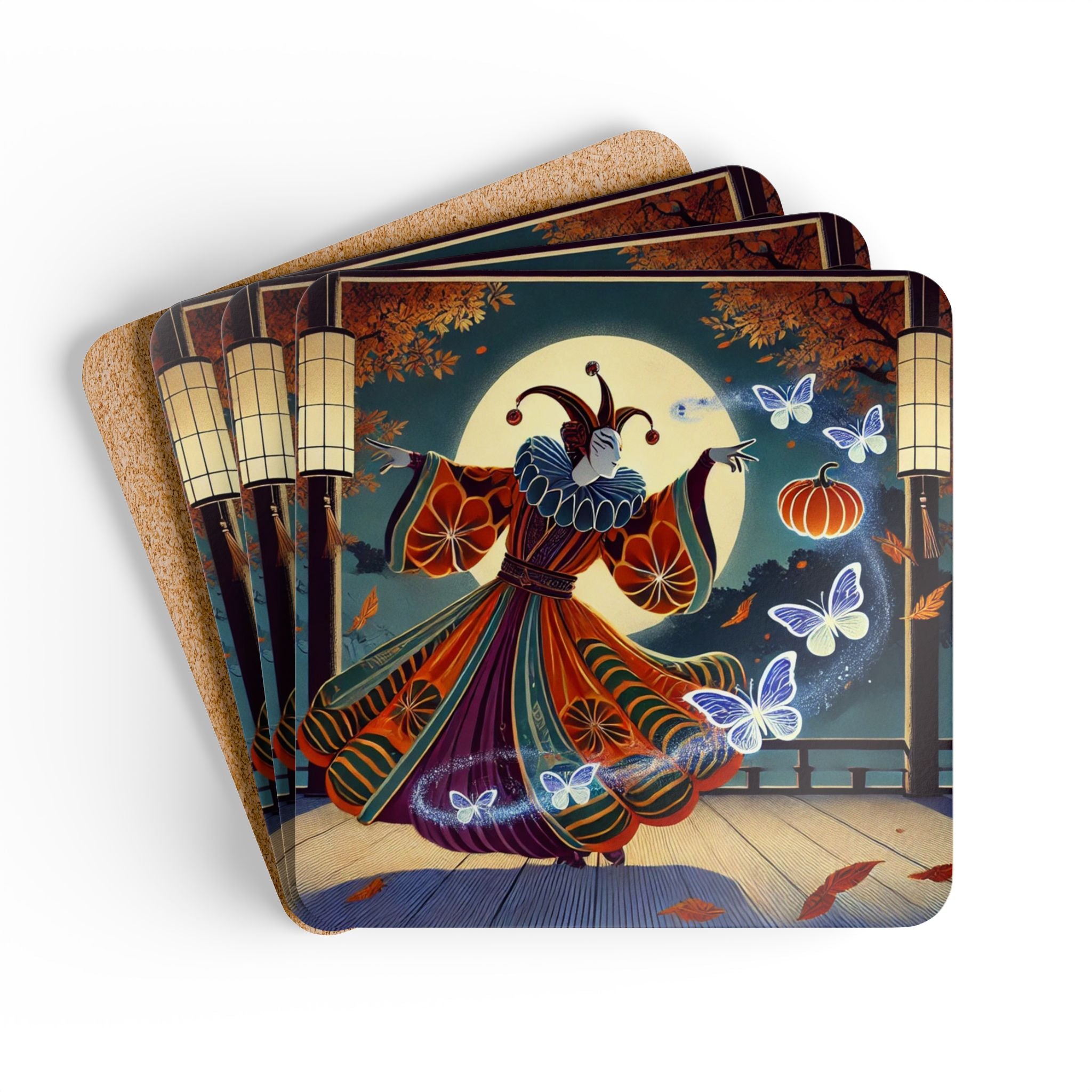 For dazzling everyday use, upgrading any home’s décor, or promoting a business, this coaster set makes a perfect choice. Each order includes four coasters in one size, crafted with a high-gloss top that beautifully showcases the artwork and a cork back that prevents sliding while protecting surfaces. The featured artwork, Court Magician with Ghost Butterflies, is a lyrical and dramatic kabuki-inspired composition in bold flat style. A court jester magician, dressed in a vibrant gourd-patterned doublet, moves with elegant theatrical grace as ethereal ghost butterflies take flight from his hands, swirling in luminous colors against a rich and dynamic backdrop. The design blends fantasy, performance, and magic, capturing the mischievous charm of a jester alongside the mystical allure of kabuki theater.