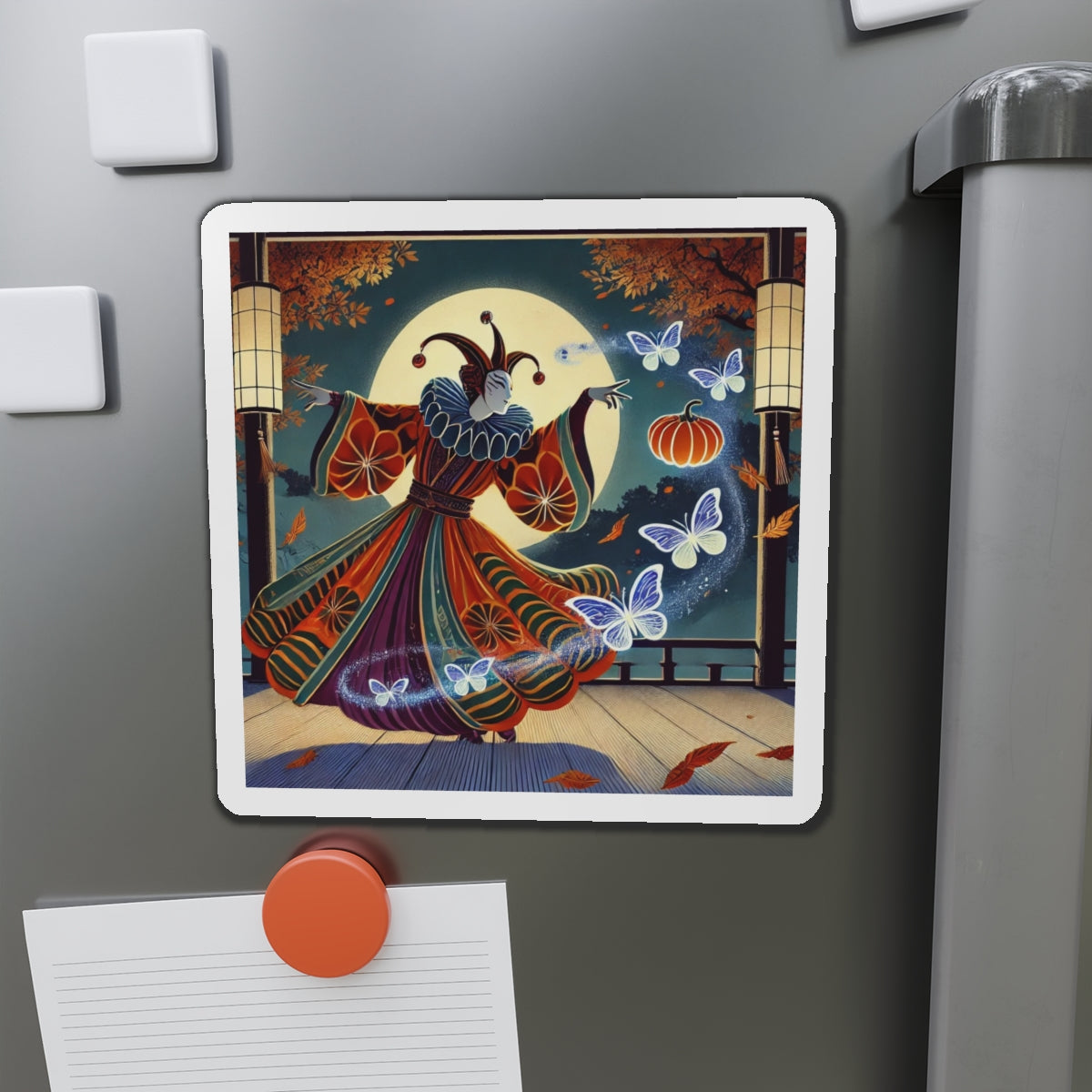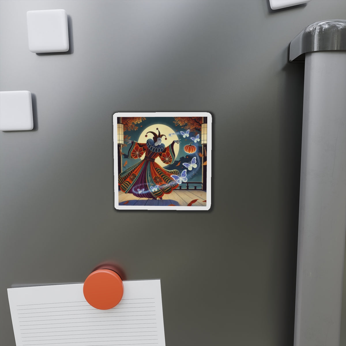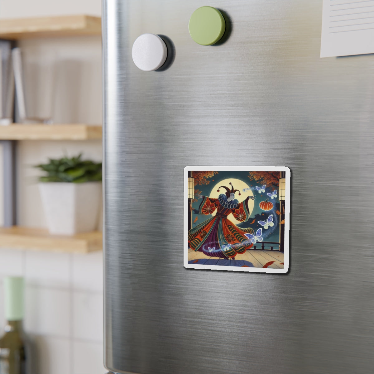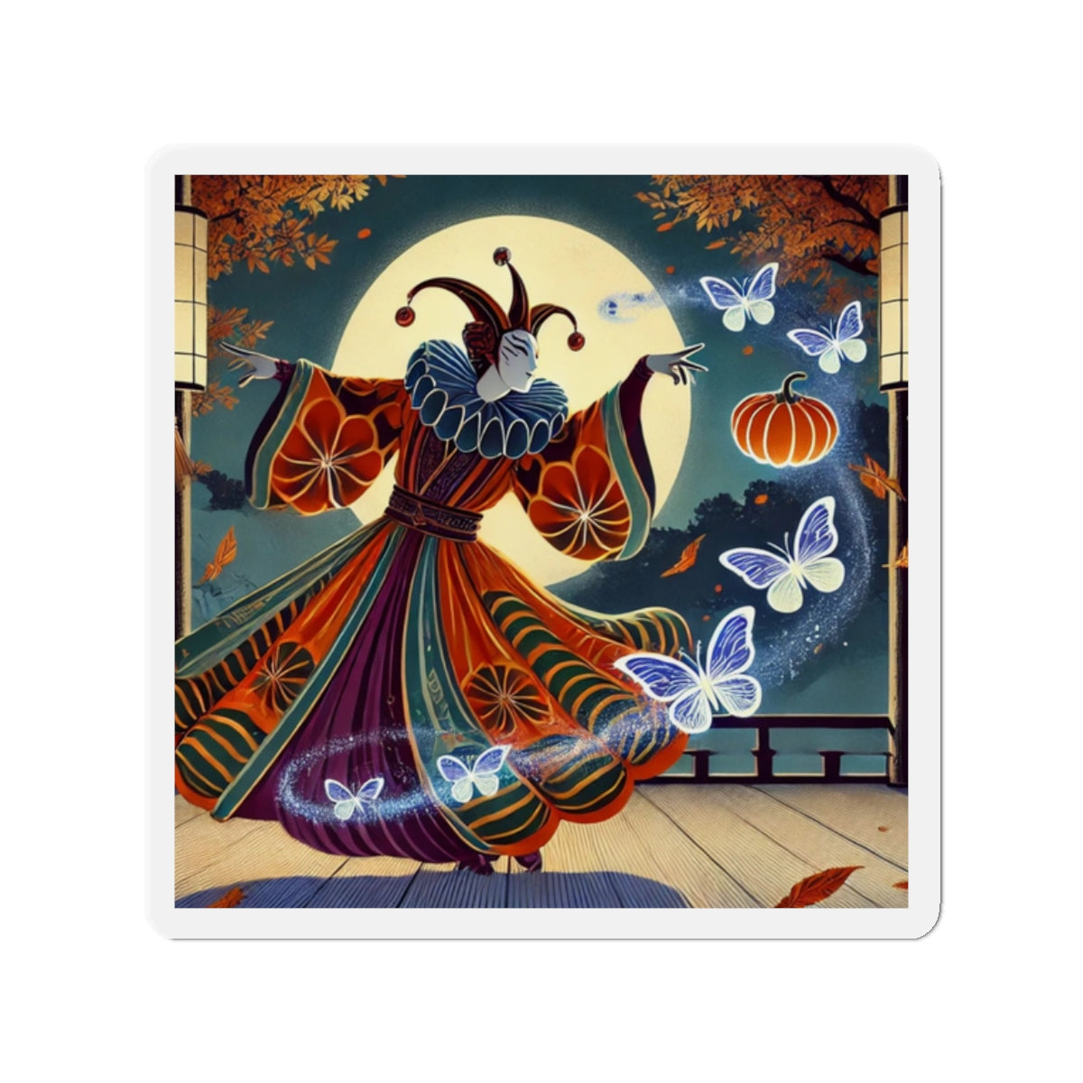 Add a touch of magic and artistry to any surface with these die-cut magnets featuring Court Magician with Ghost Butterflies. Made with the die-cut technique, these magnets are flexible, highly durable, and available in five different sizes so you can choose the perfect fit for your decorating needs. The bold flat-style artwork depicts a kabuki-inspired court jester magician dressed in a vibrant gourd-patterned doublet. Moving with theatrical elegance, he conjures ghostly butterflies that swirl in luminous colors against a dynamic backdrop. Blending fantasy, performance, and magic, this design transforms an everyday magnet into a miniature canvas of cultural storytelling and enchanting visual drama.