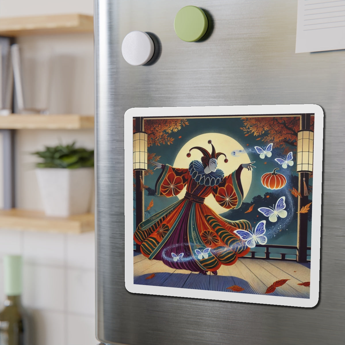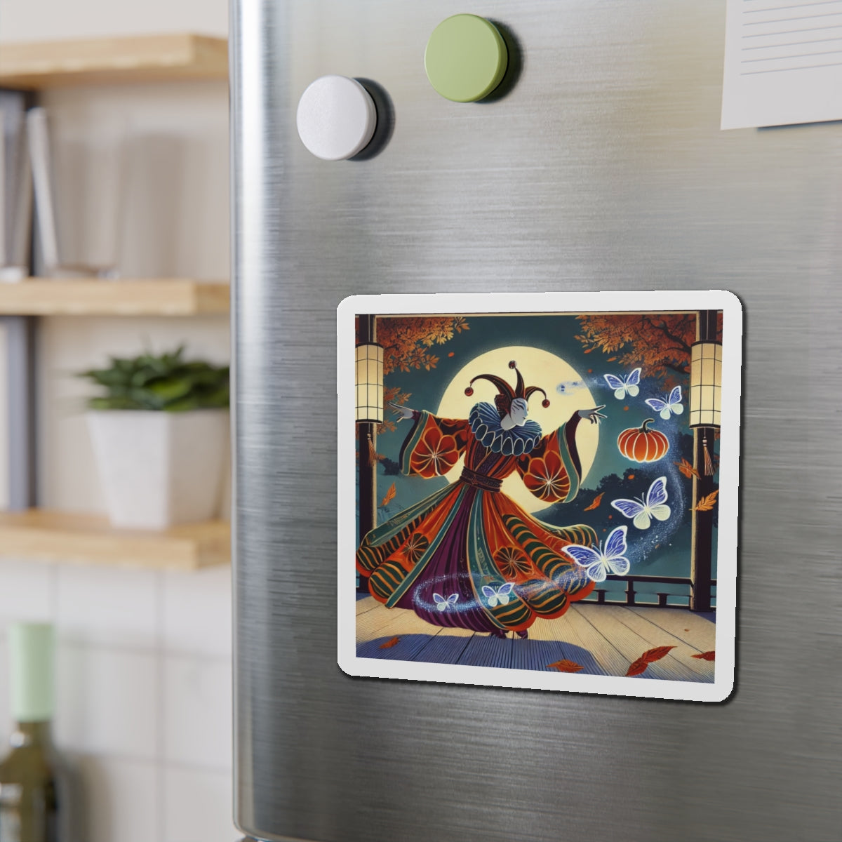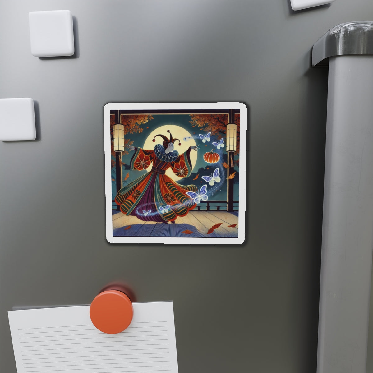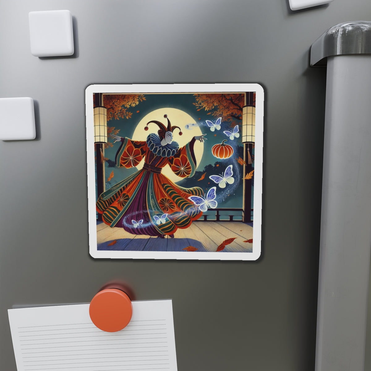 Add a touch of magic and artistry to any surface with these die-cut magnets featuring Court Magician with Ghost Butterflies. Made with the die-cut technique, these magnets are flexible, highly durable, and available in five different sizes so you can choose the perfect fit for your decorating needs. The bold flat-style artwork depicts a kabuki-inspired court jester magician dressed in a vibrant gourd-patterned doublet. Moving with theatrical elegance, he conjures ghostly butterflies that swirl in luminous colors against a dynamic backdrop. Blending fantasy, performance, and magic, this design transforms an everyday magnet into a miniature canvas of cultural storytelling and enchanting visual drama.