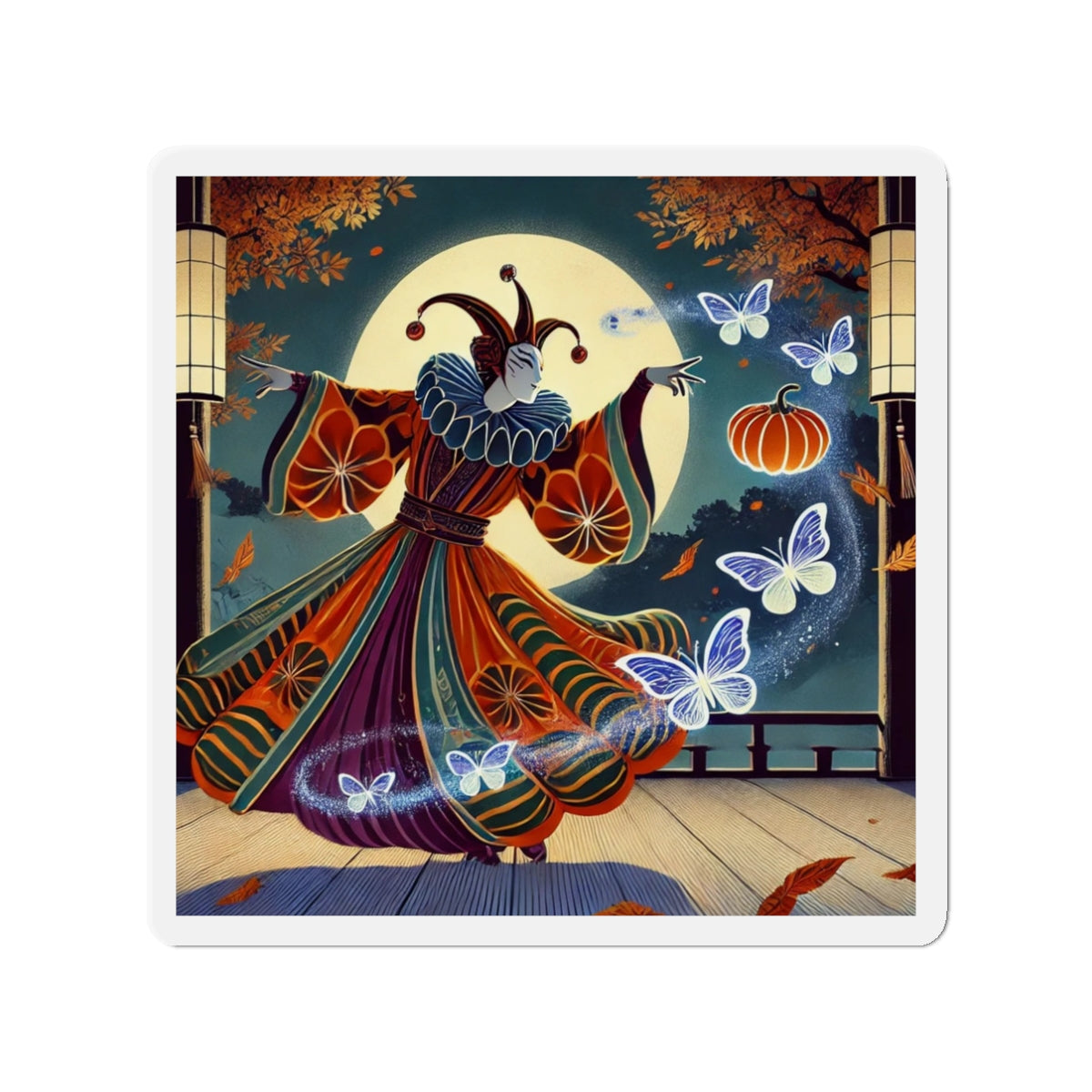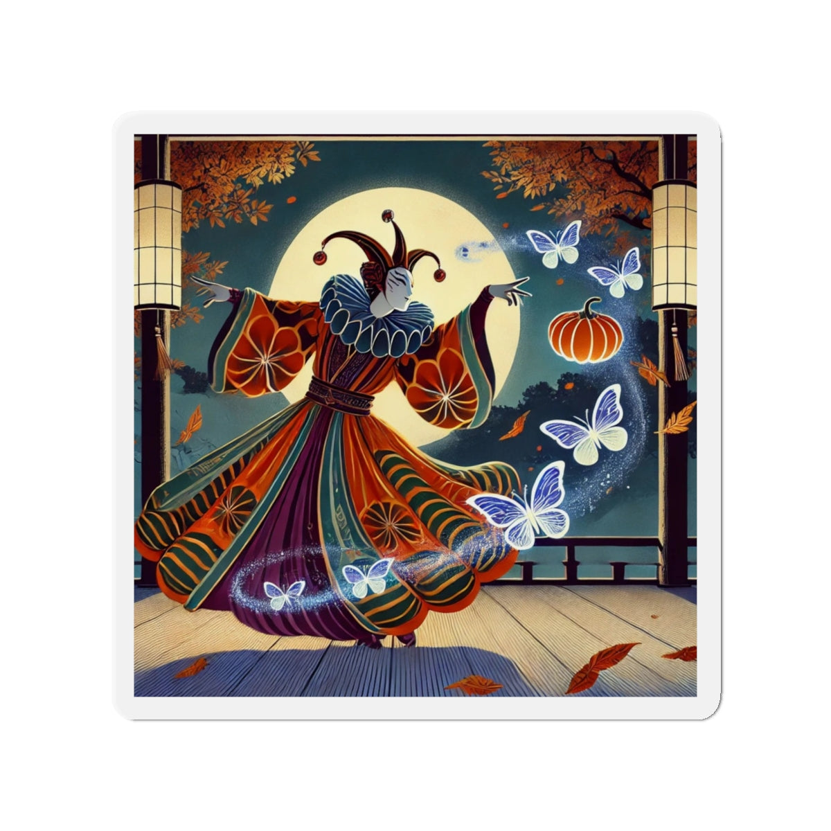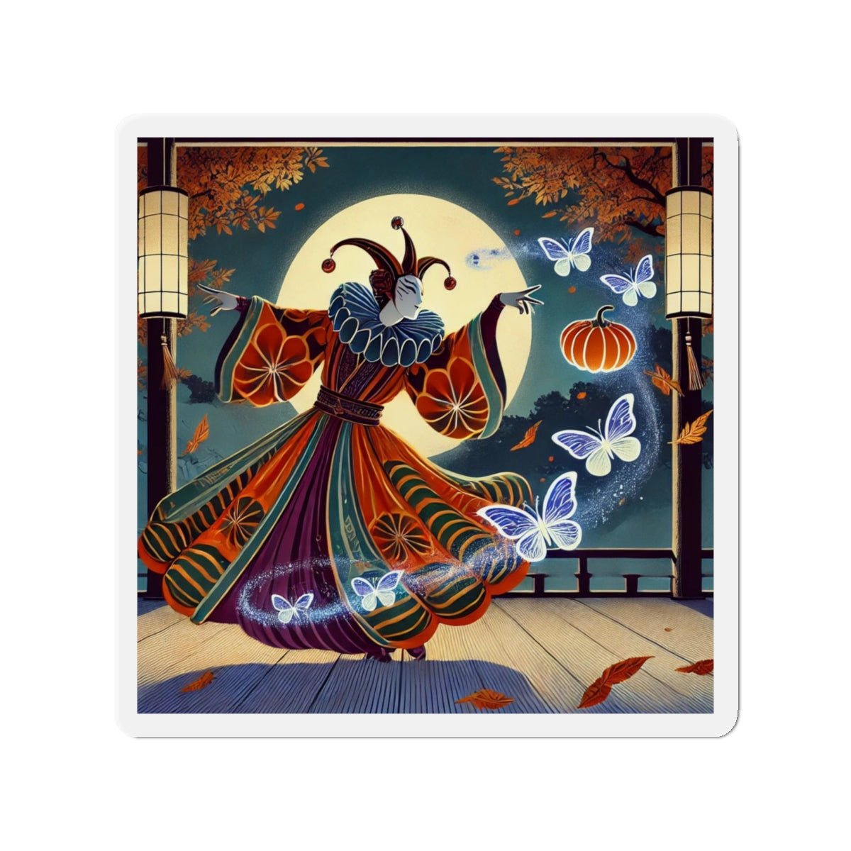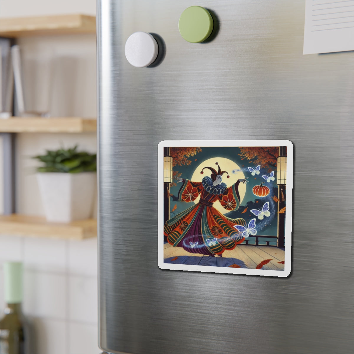 Add a touch of magic and artistry to any surface with these die-cut magnets featuring Court Magician with Ghost Butterflies. Made with the die-cut technique, these magnets are flexible, highly durable, and available in five different sizes so you can choose the perfect fit for your decorating needs. The bold flat-style artwork depicts a kabuki-inspired court jester magician dressed in a vibrant gourd-patterned doublet. Moving with theatrical elegance, he conjures ghostly butterflies that swirl in luminous colors against a dynamic backdrop. Blending fantasy, performance, and magic, this design transforms an everyday magnet into a miniature canvas of cultural storytelling and enchanting visual drama.
