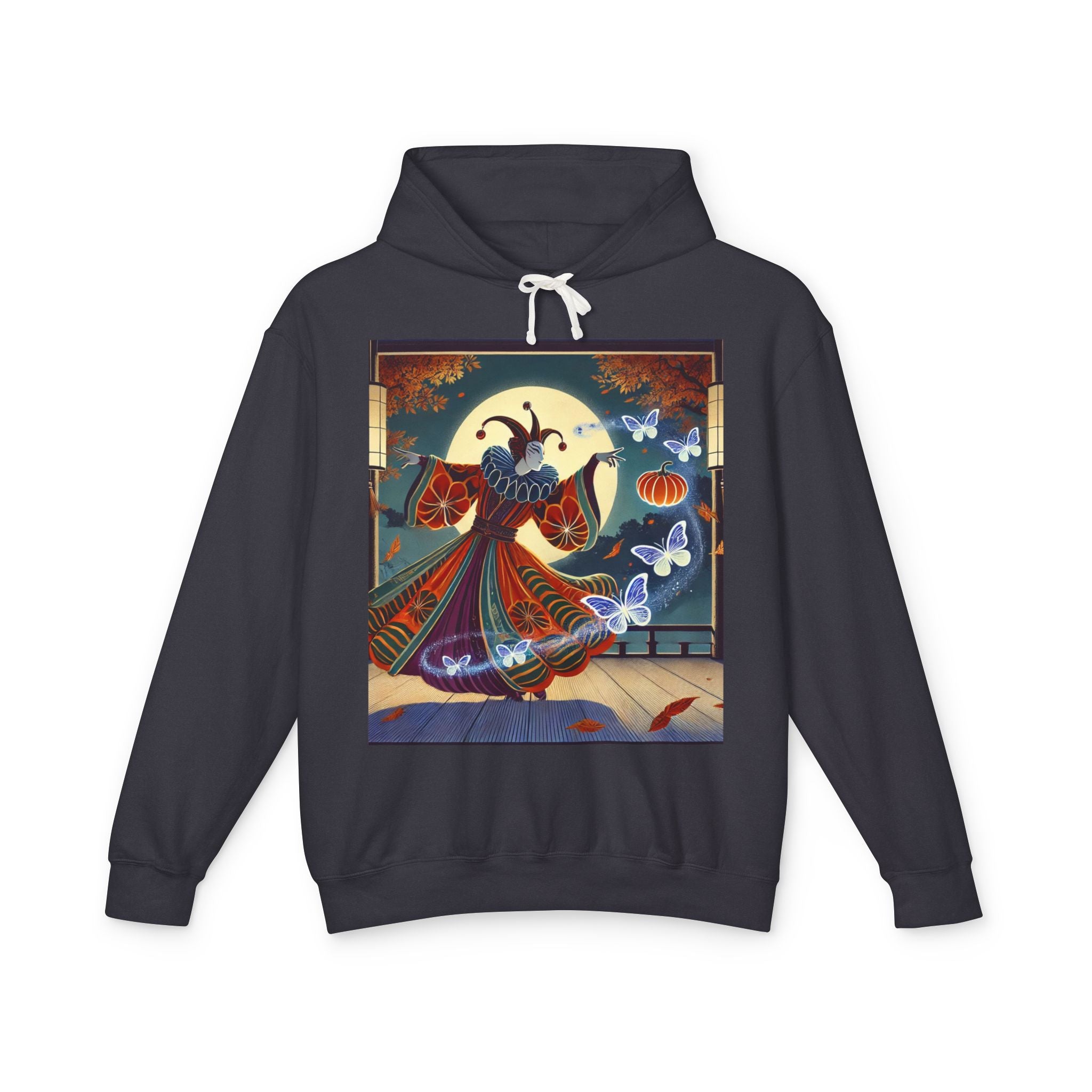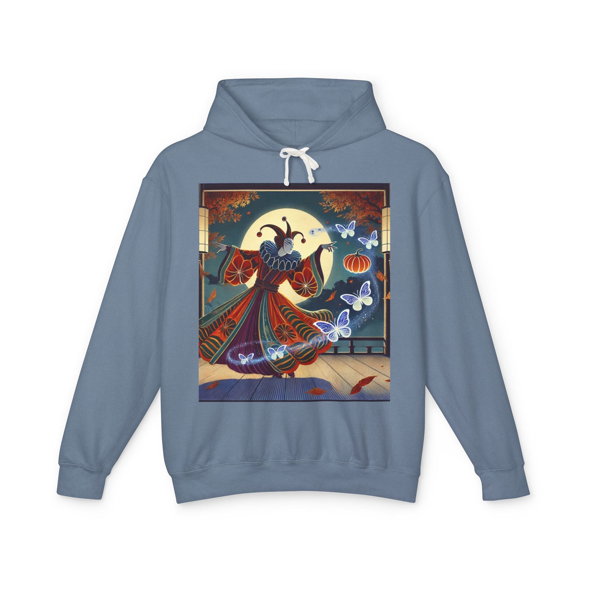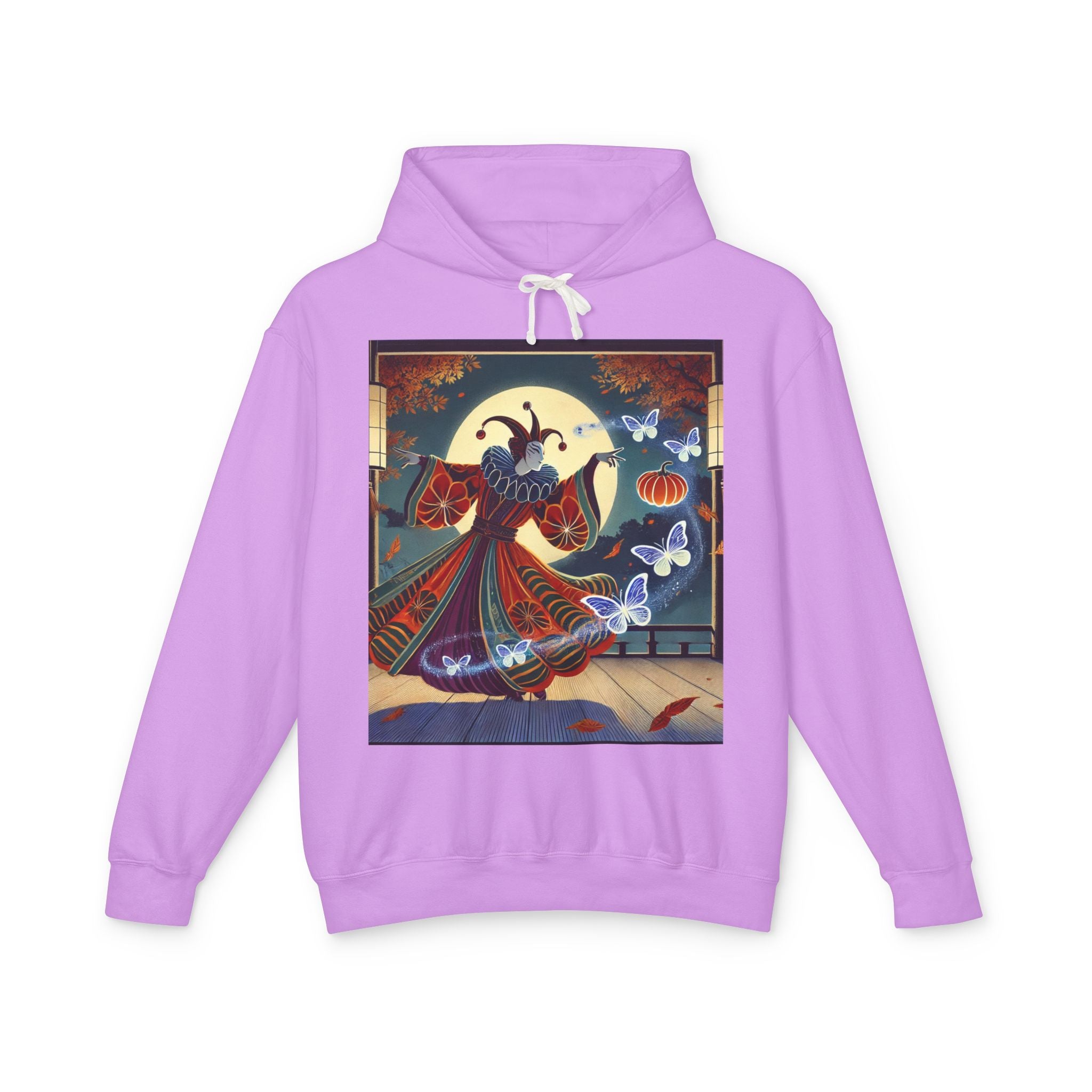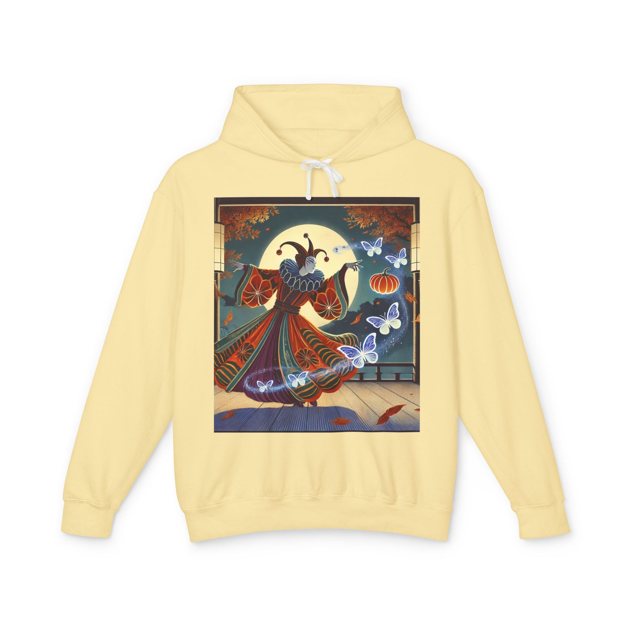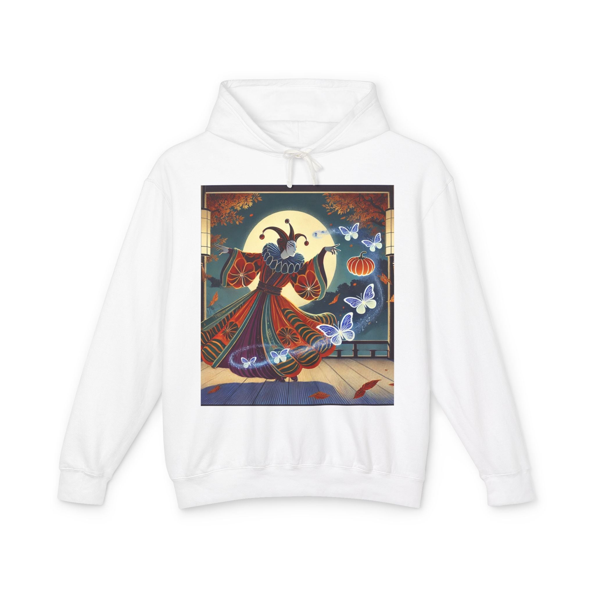 In this Kabuki-inspired scene, a court jester magician dressed in a vibrant gourd-patterned doublet moves with elegant, theatrical precision as ethereal ghost butterflies spiral from his hands. Rendered in bold flat style, the artwork glows with luminous color and meticulous detail, capturing both the mischievous charm of a jester and the mystical allure of Japanese theater. Blending performance, fantasy, and magic, it creates a captivating visual moment that transforms this hoodie into wearable storytelling.