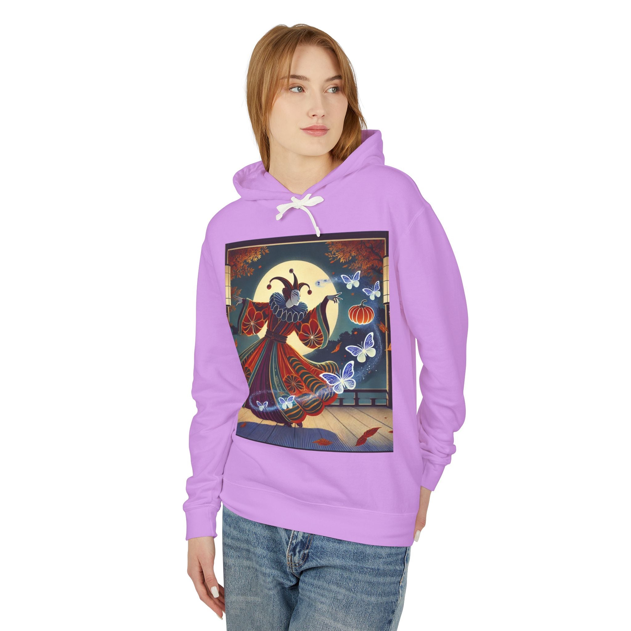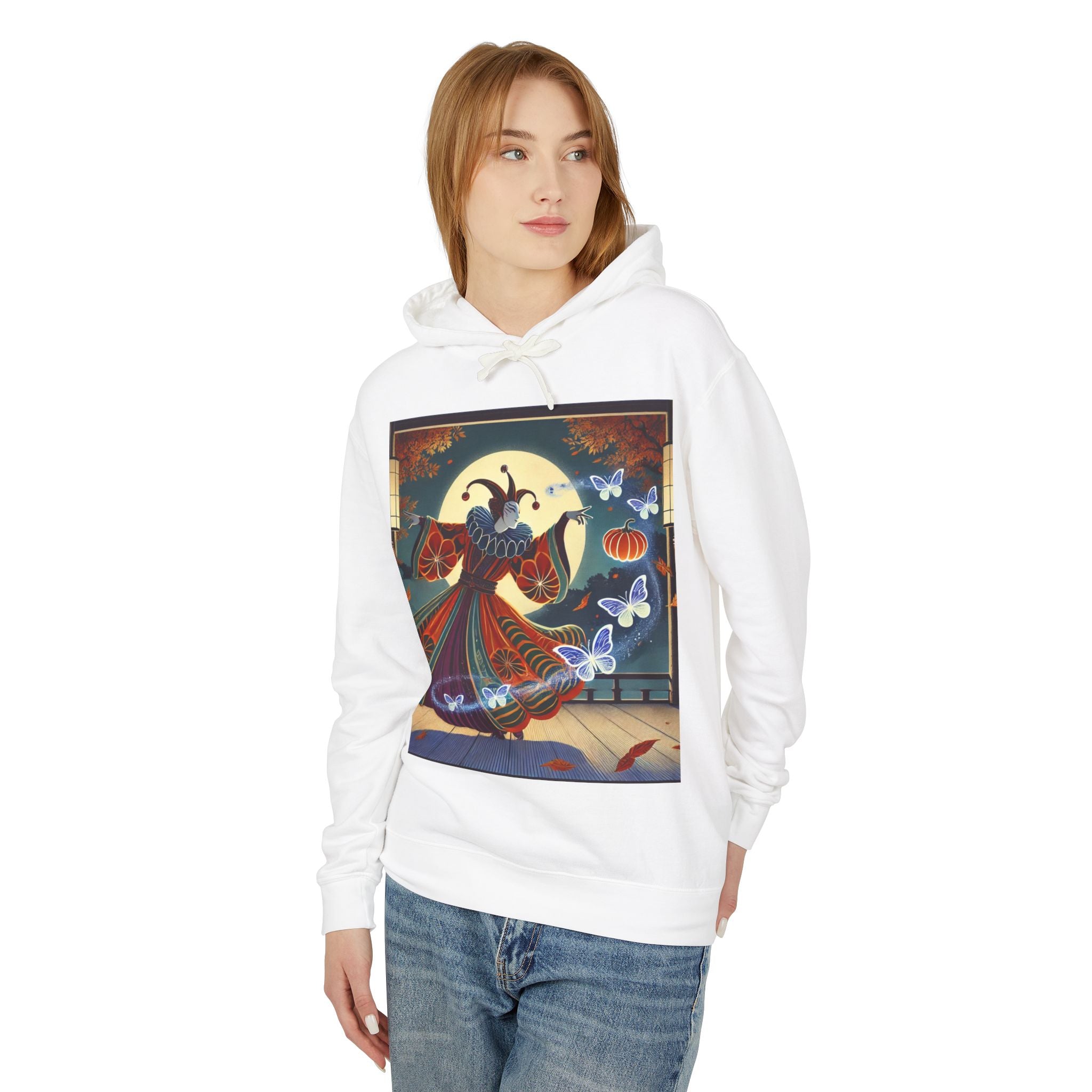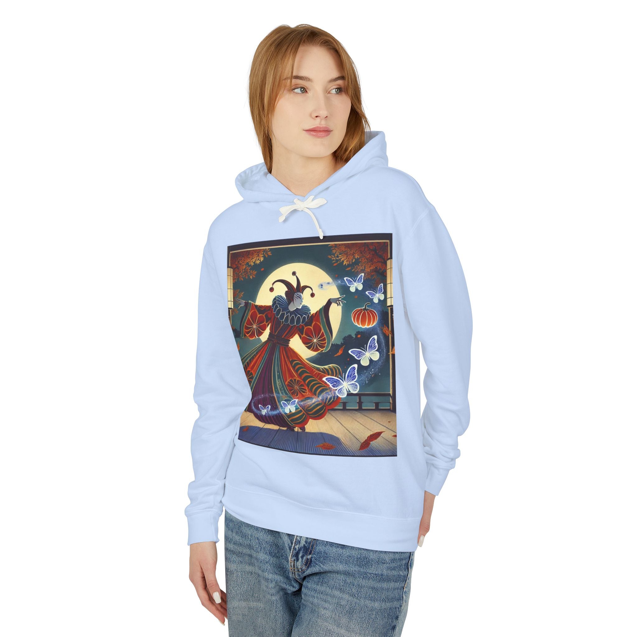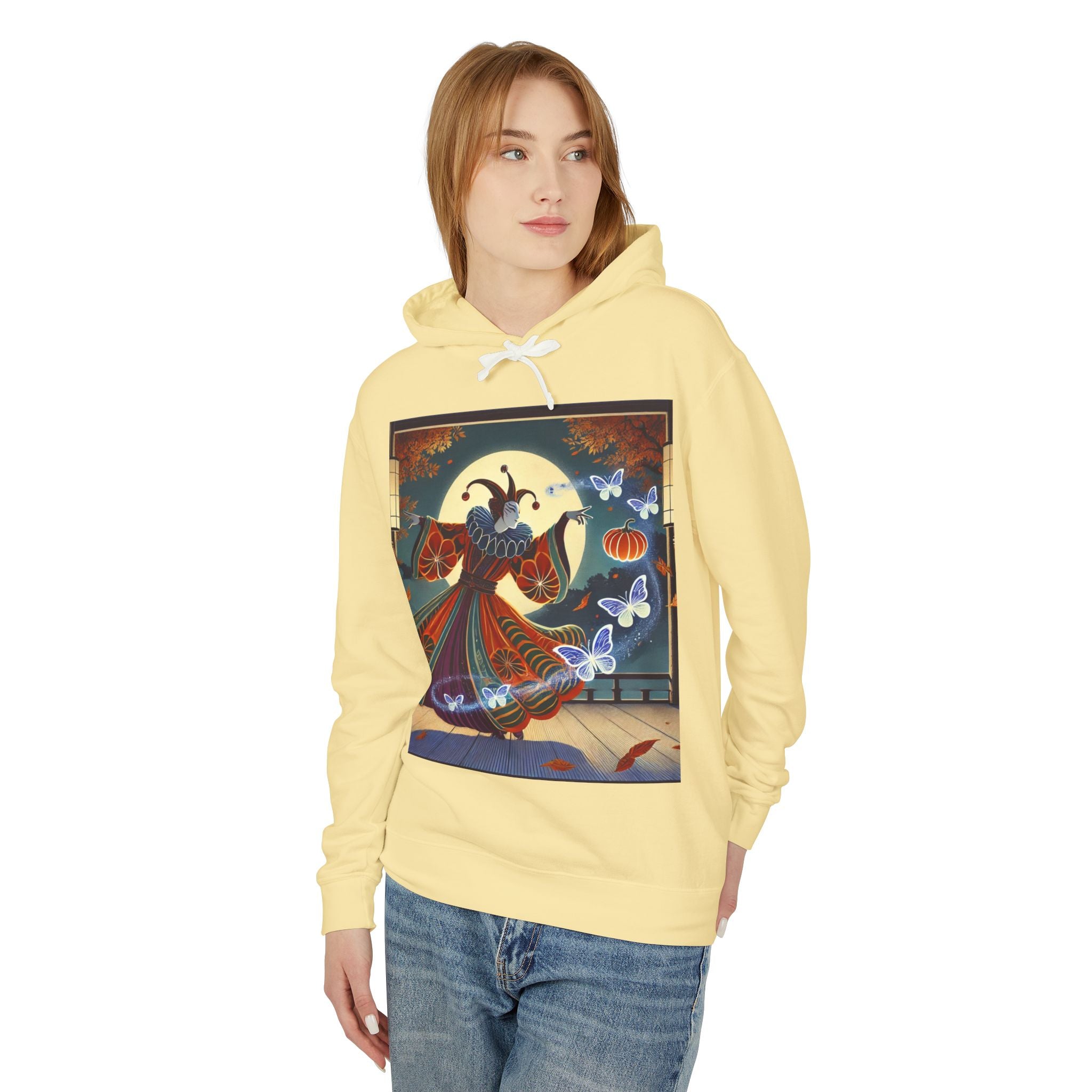 In this Kabuki-inspired scene, a court jester magician dressed in a vibrant gourd-patterned doublet moves with elegant, theatrical precision as ethereal ghost butterflies spiral from his hands. Rendered in bold flat style, the artwork glows with luminous color and meticulous detail, capturing both the mischievous charm of a jester and the mystical allure of Japanese theater. Blending performance, fantasy, and magic, it creates a captivating visual moment that transforms this hoodie into wearable storytelling.