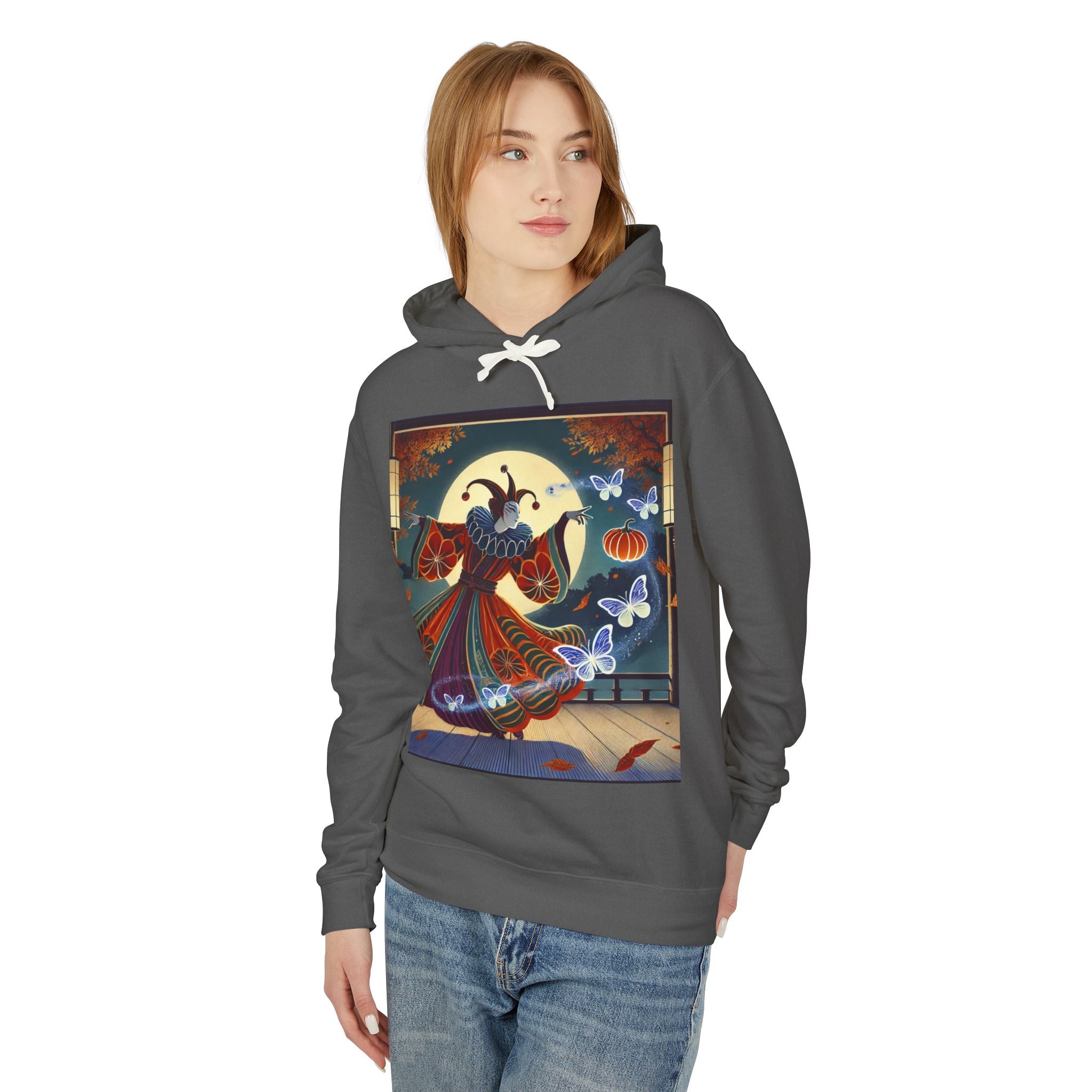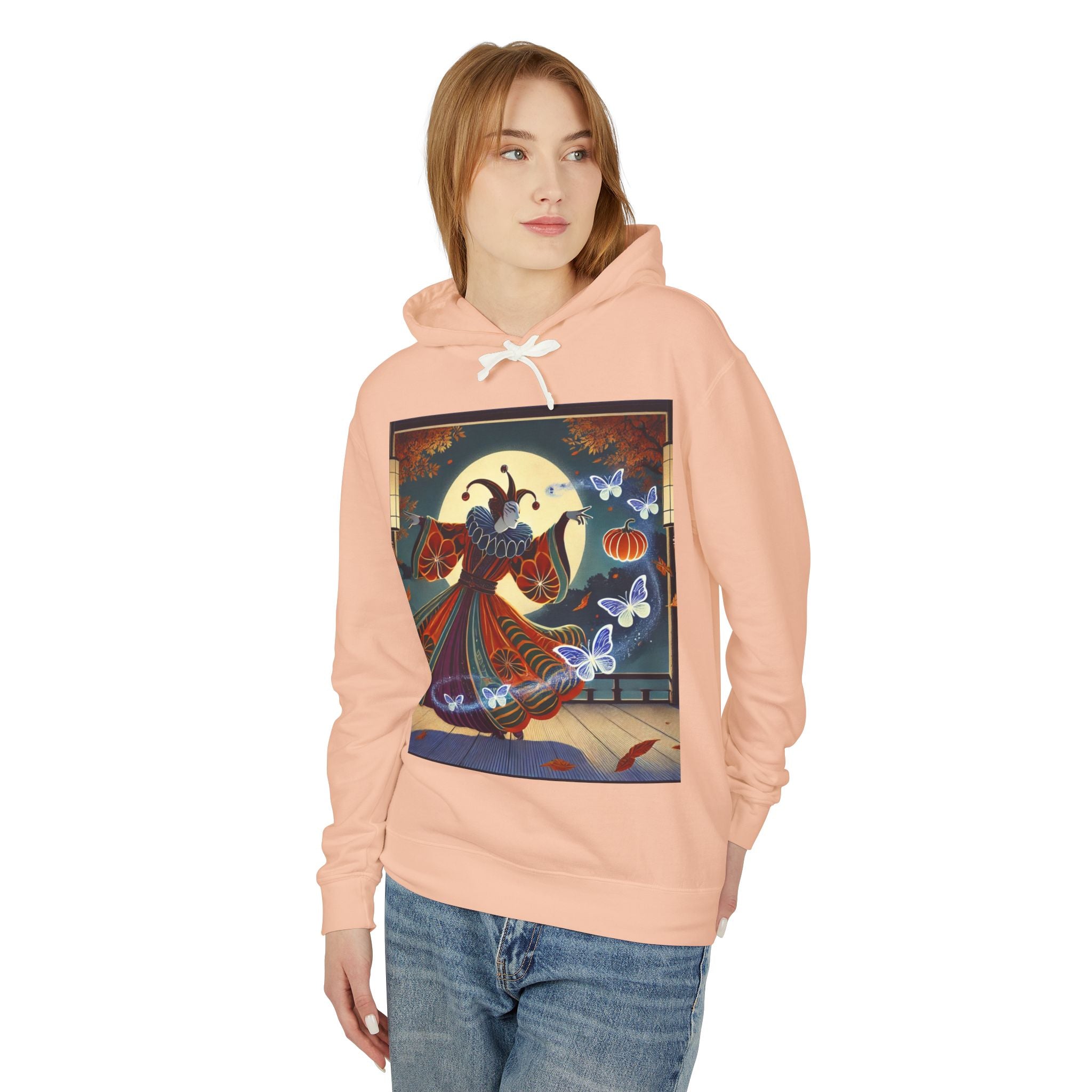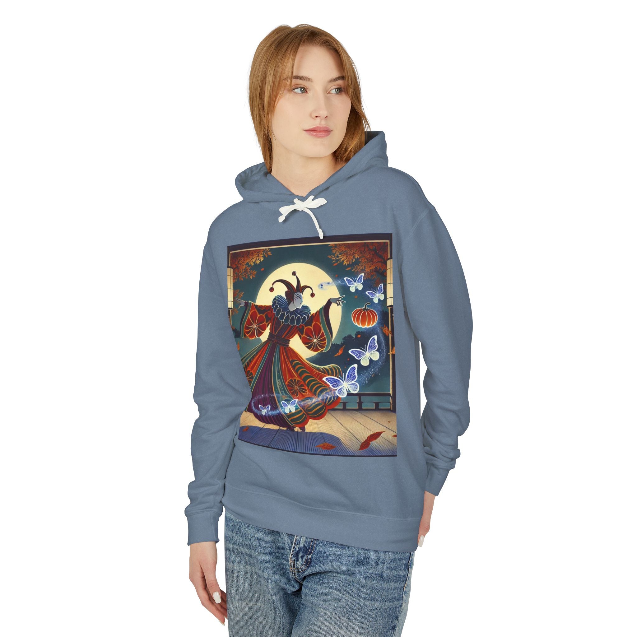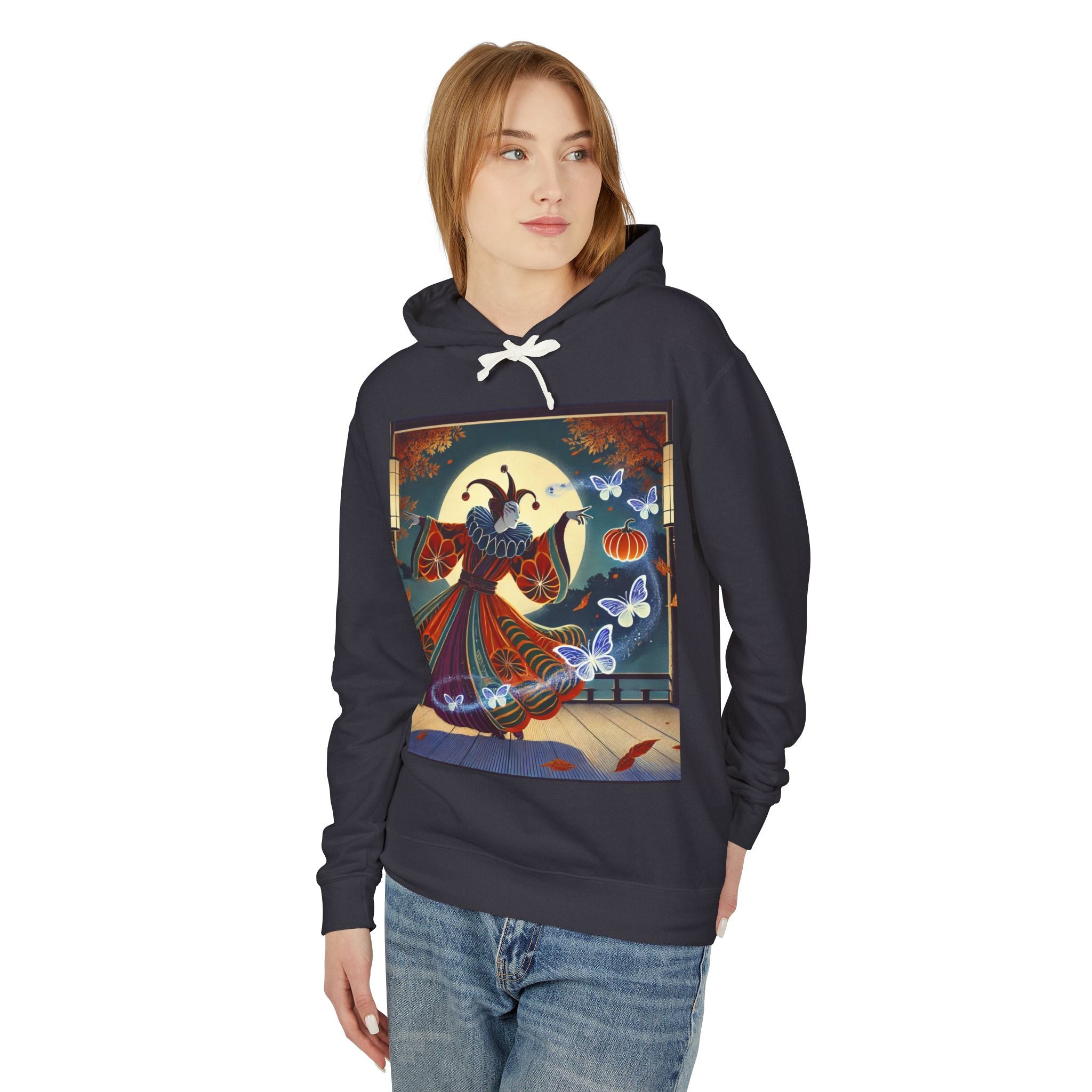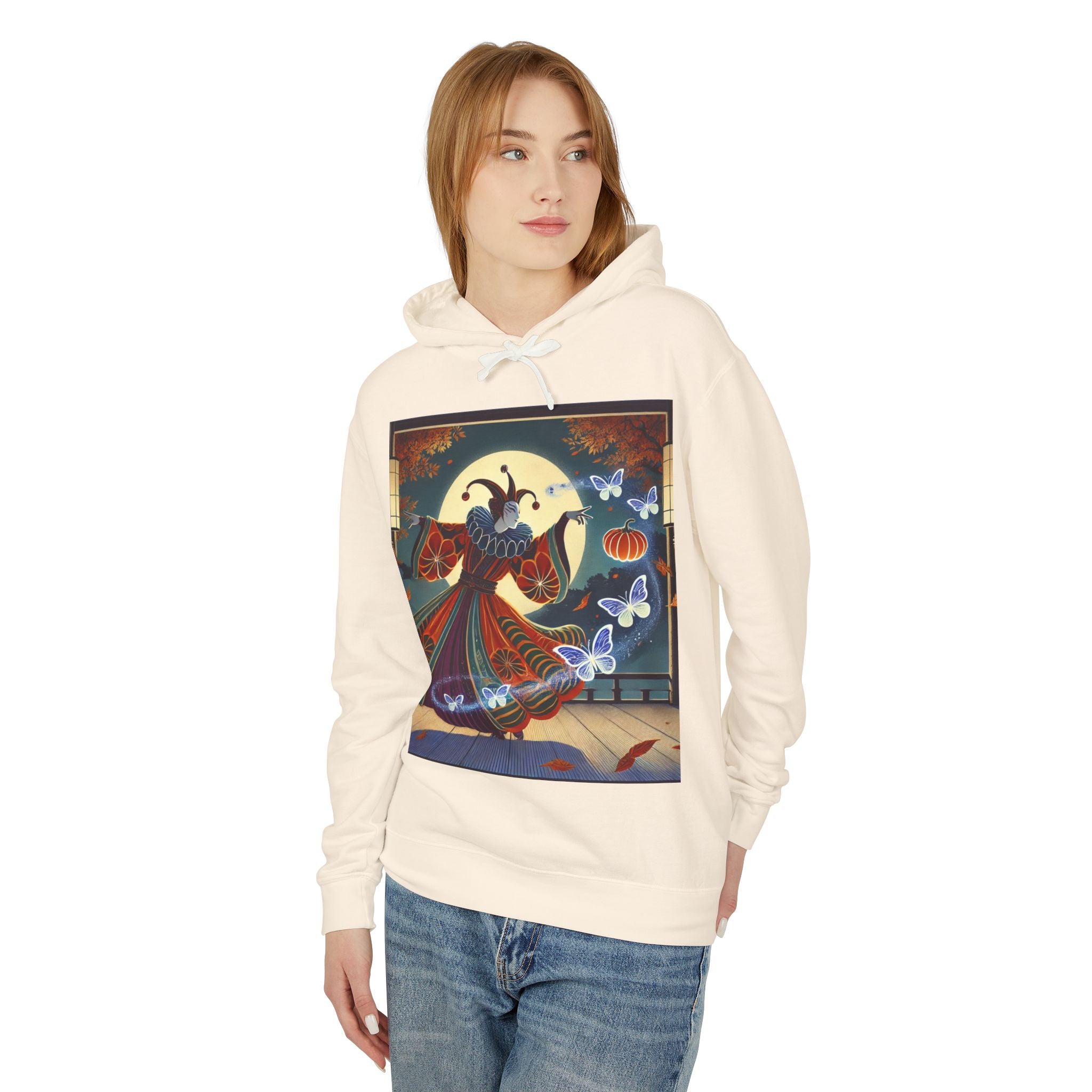 In this Kabuki-inspired scene, a court jester magician dressed in a vibrant gourd-patterned doublet moves with elegant, theatrical precision as ethereal ghost butterflies spiral from his hands. Rendered in bold flat style, the artwork glows with luminous color and meticulous detail, capturing both the mischievous charm of a jester and the mystical allure of Japanese theater. Blending performance, fantasy, and magic, it creates a captivating visual moment that transforms this hoodie into wearable storytelling.