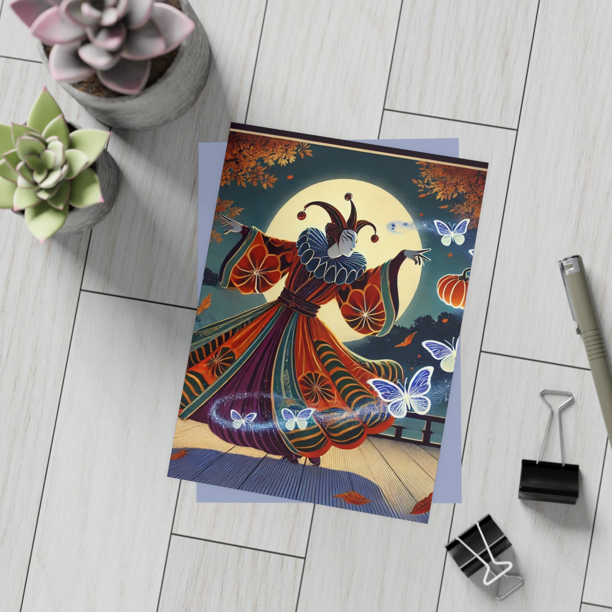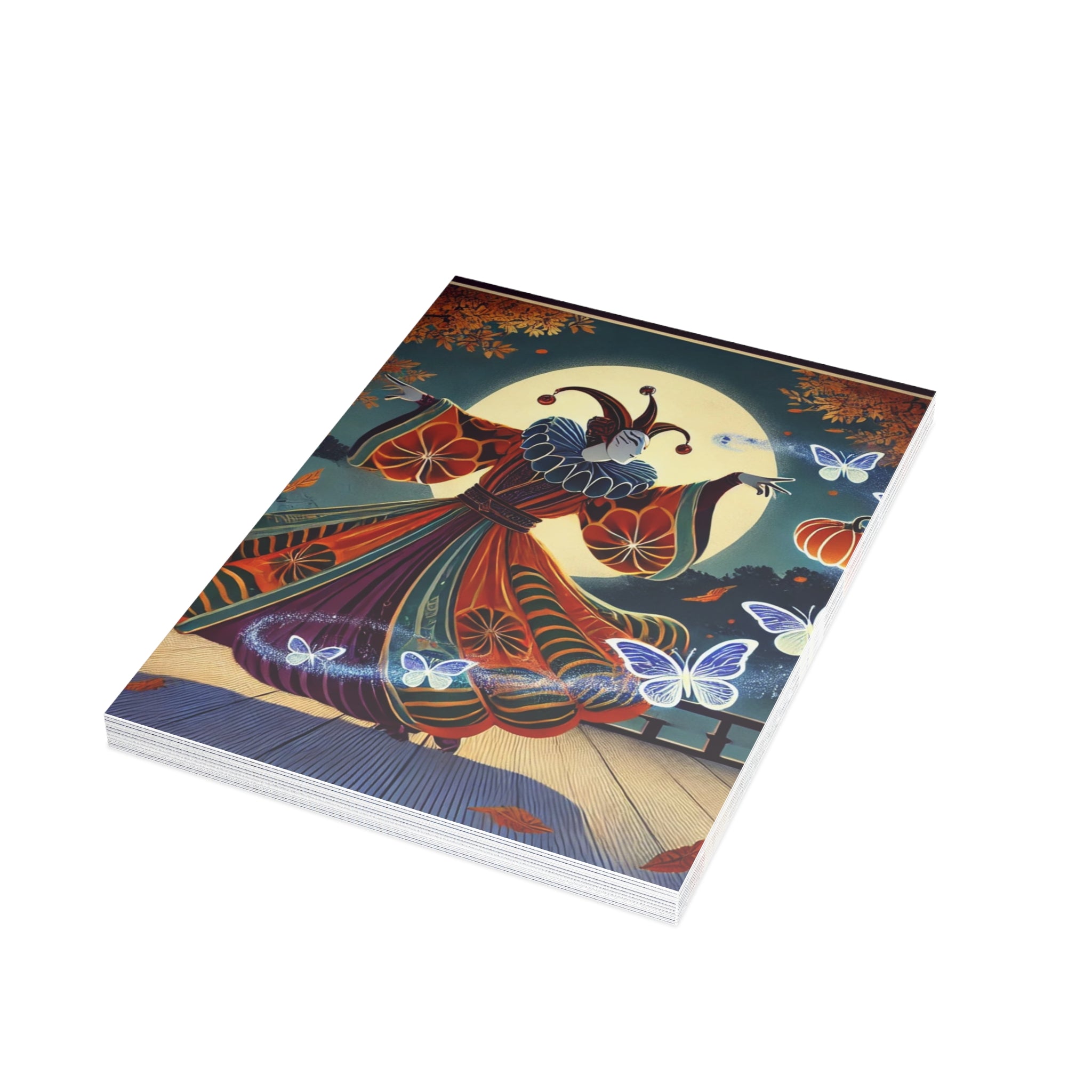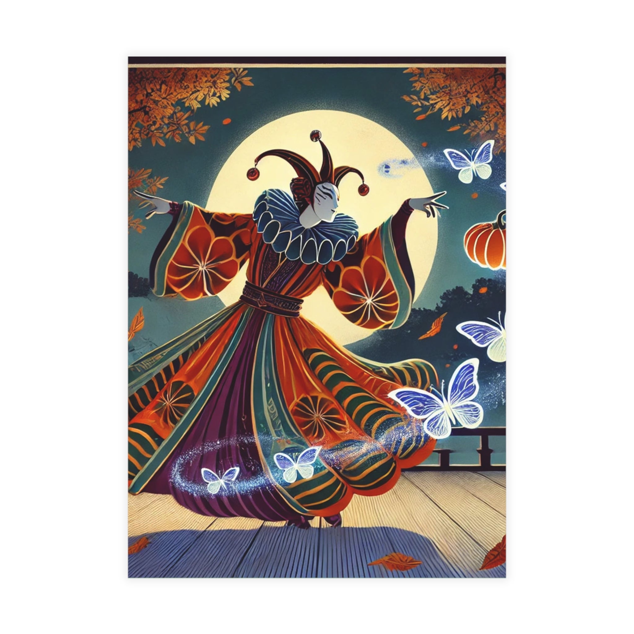 Each postcard features a kabuki-inspired court magician dressed in a vivid gourd-patterned doublet, his graceful movements brought to life as luminous ghost butterflies swirl from his hands against a rich backdrop. The bold flat-style artwork merges fantasy and performance, turning a simple postcard into an enchanting piece of cultural artistry that blends Japanese theater with imaginative design.