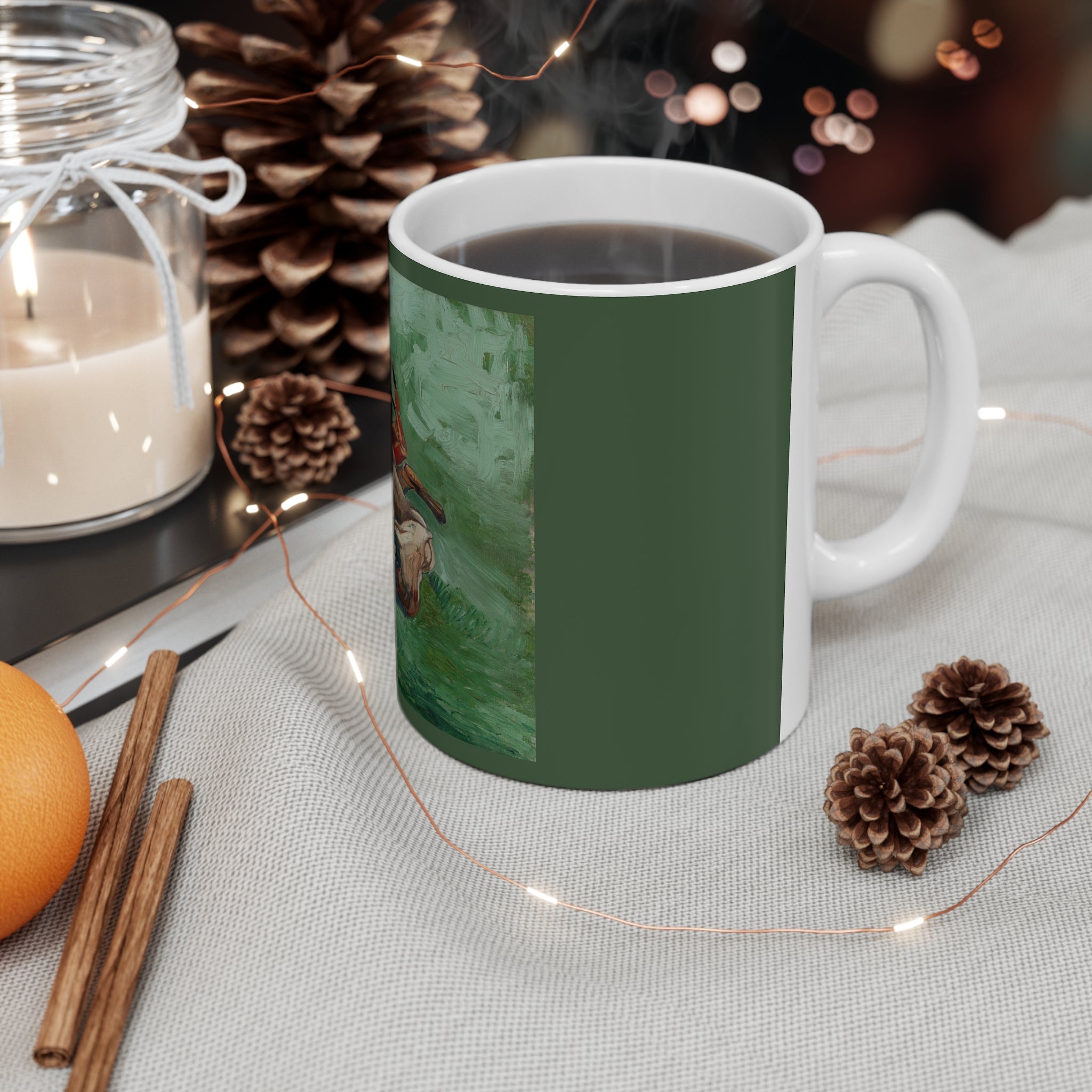 This 11 oz ceramic mug is the perfect gift for coffee, tea, and chocolate lovers. It's made of high-quality white ceramic that is lead and BPA-free, and it's microwave and dishwasher safe for easy cleanup. The mug has rounded corners and a comfortable C-handle for a secure grip.
