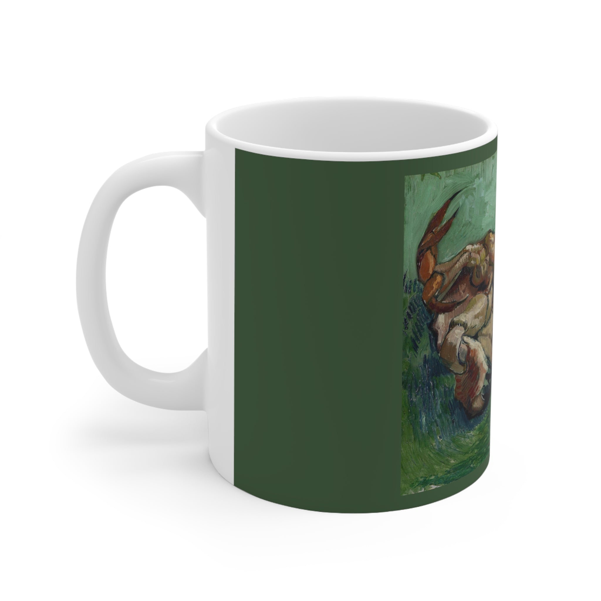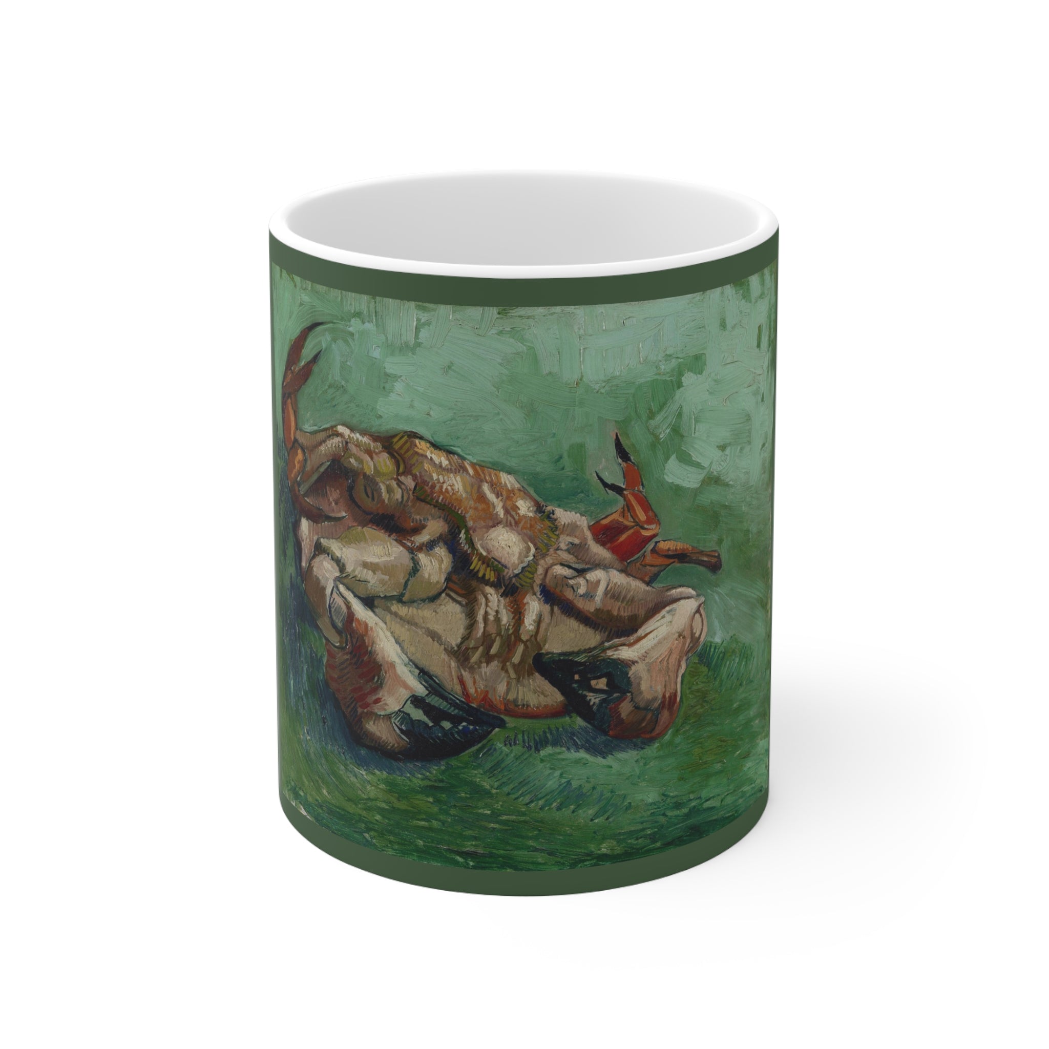 A Crab on its Back by Vincent Van Gogh depicts a bright red crab flipped on its shell, set against a vibrant green background. Van Gogh painted the crab in bright shades of red against a green background. He was experimenting with what he called “the laws of colour” described by the French painter Eugène Delacroix.