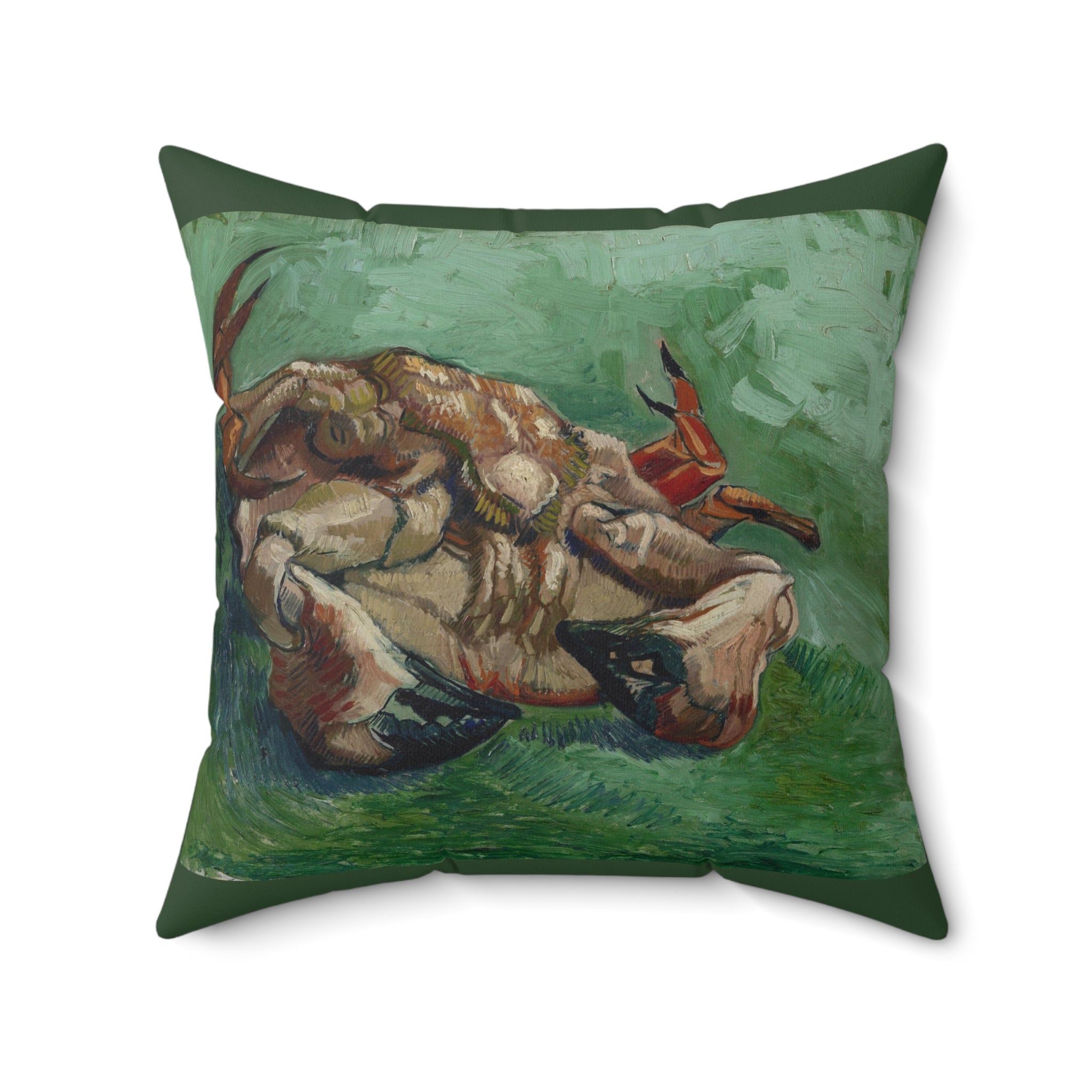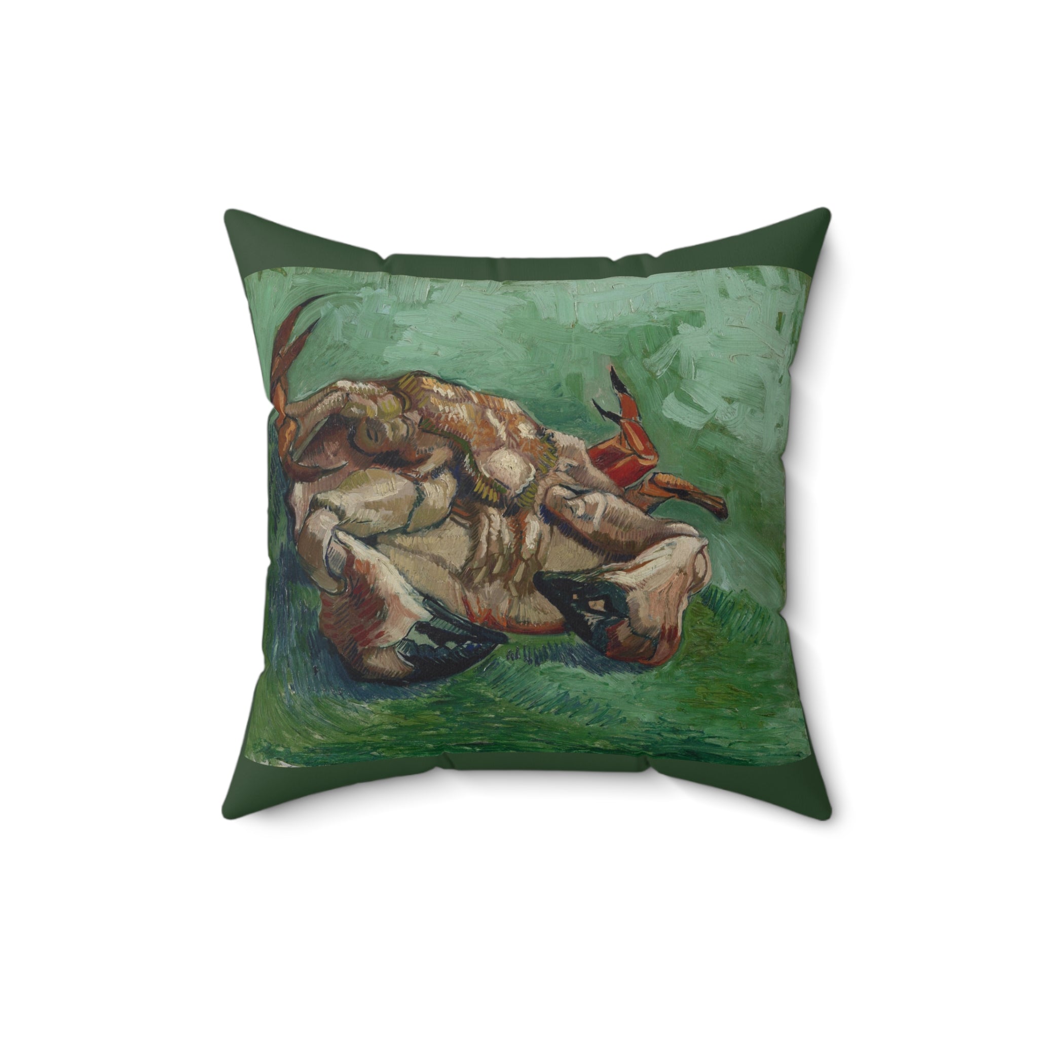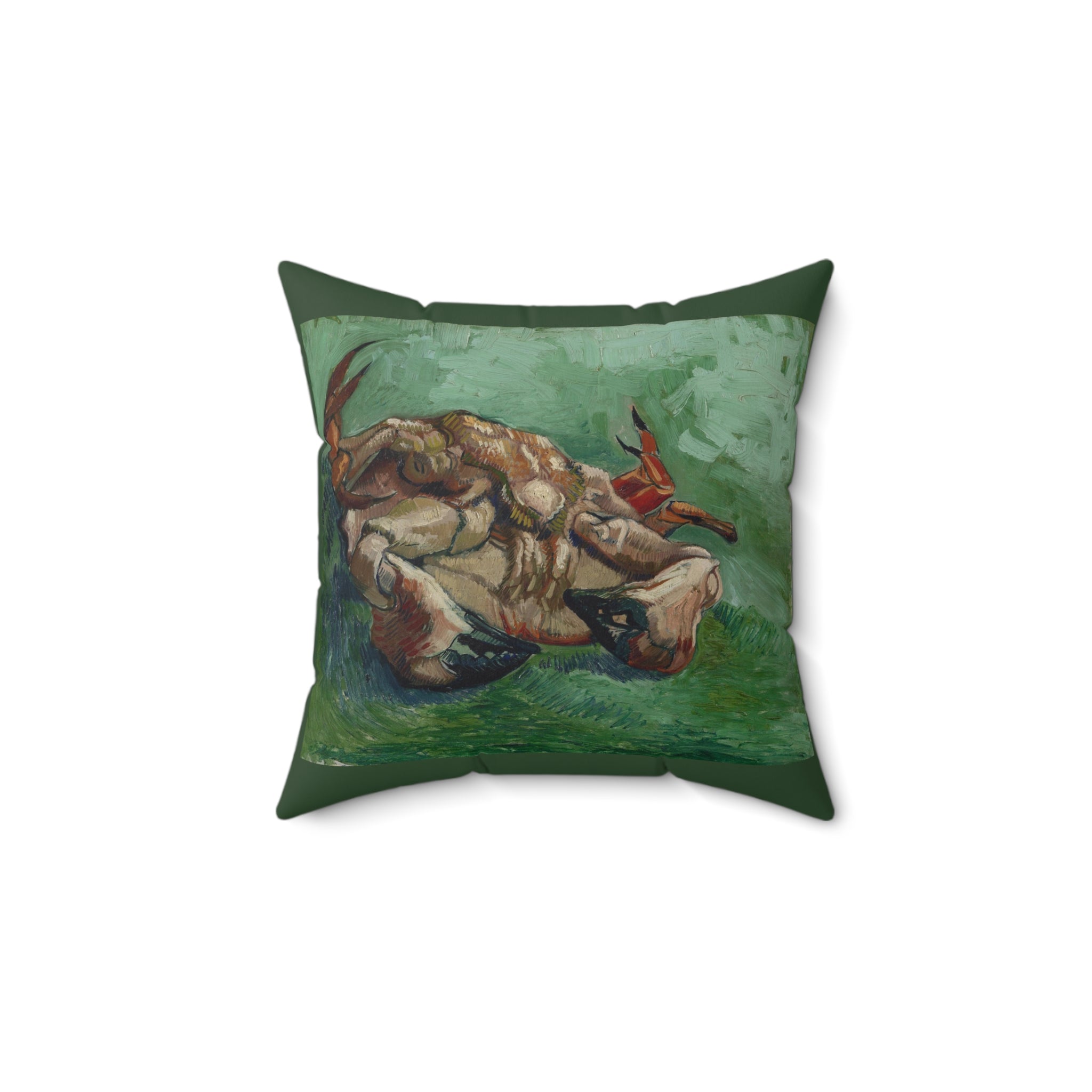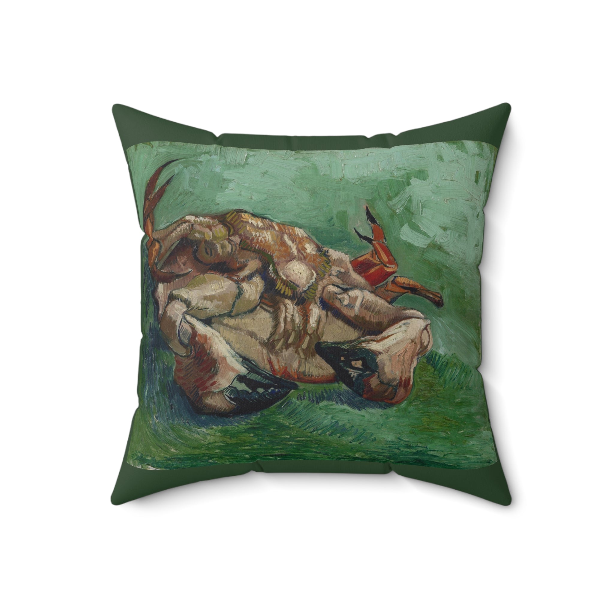 A Crab on its Back by Vincent Van Gogh depicts a bright red crab flipped on its shell, set against a vibrant green background. Van Gogh painted the crab in bright shades of red against a green background. He was experimenting with what he called “the laws of colour” described by the French painter Eugène Delacroix.