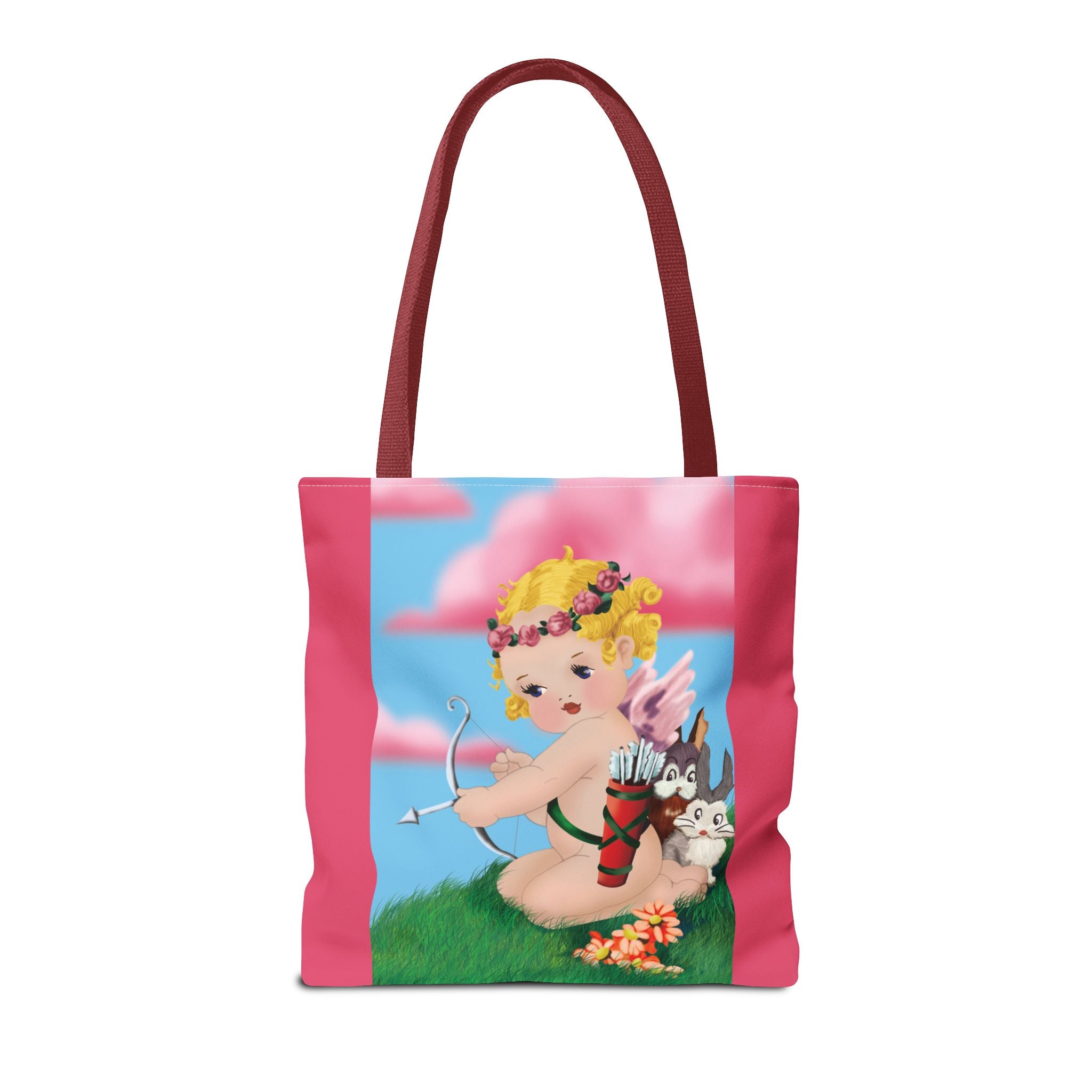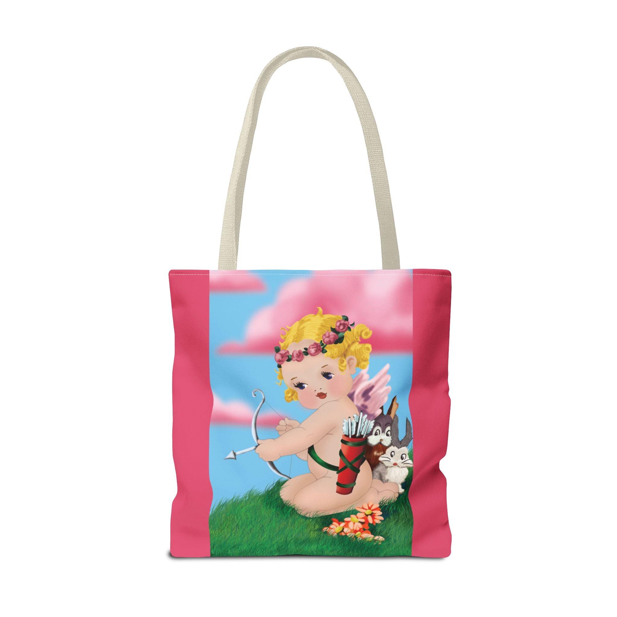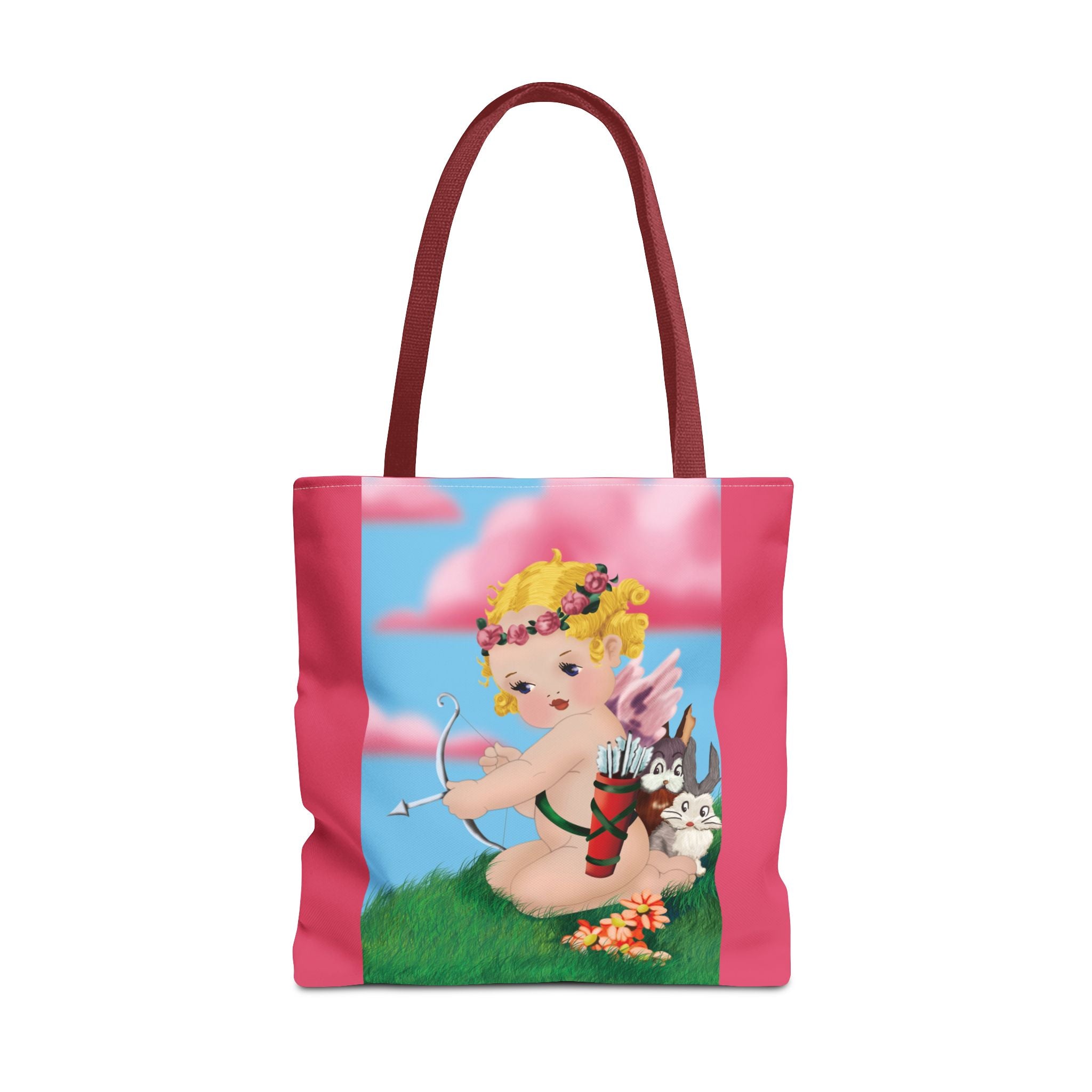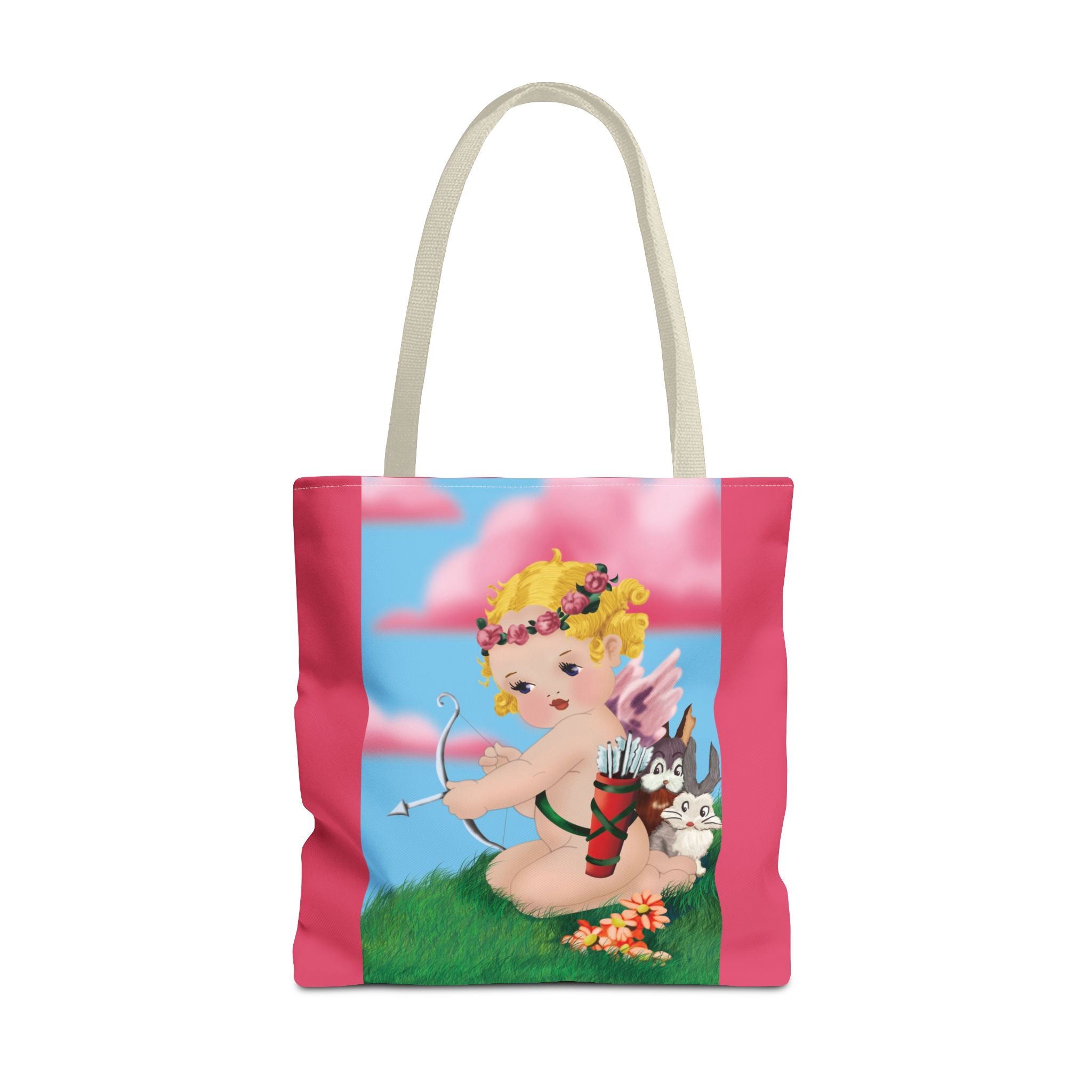 The enchanting design showcases a playful baby Cupid with golden hair and a delicate flower crown, aiming his bow amidst a whimsical scene of vibrant green grass, colorful flowers, and a dreamy sky of soft blue and pink clouds. Beside Cupid, two curious rabbits add a touch of innocence and wonder, making this bag not only functional but also a celebration of love and playful romance.