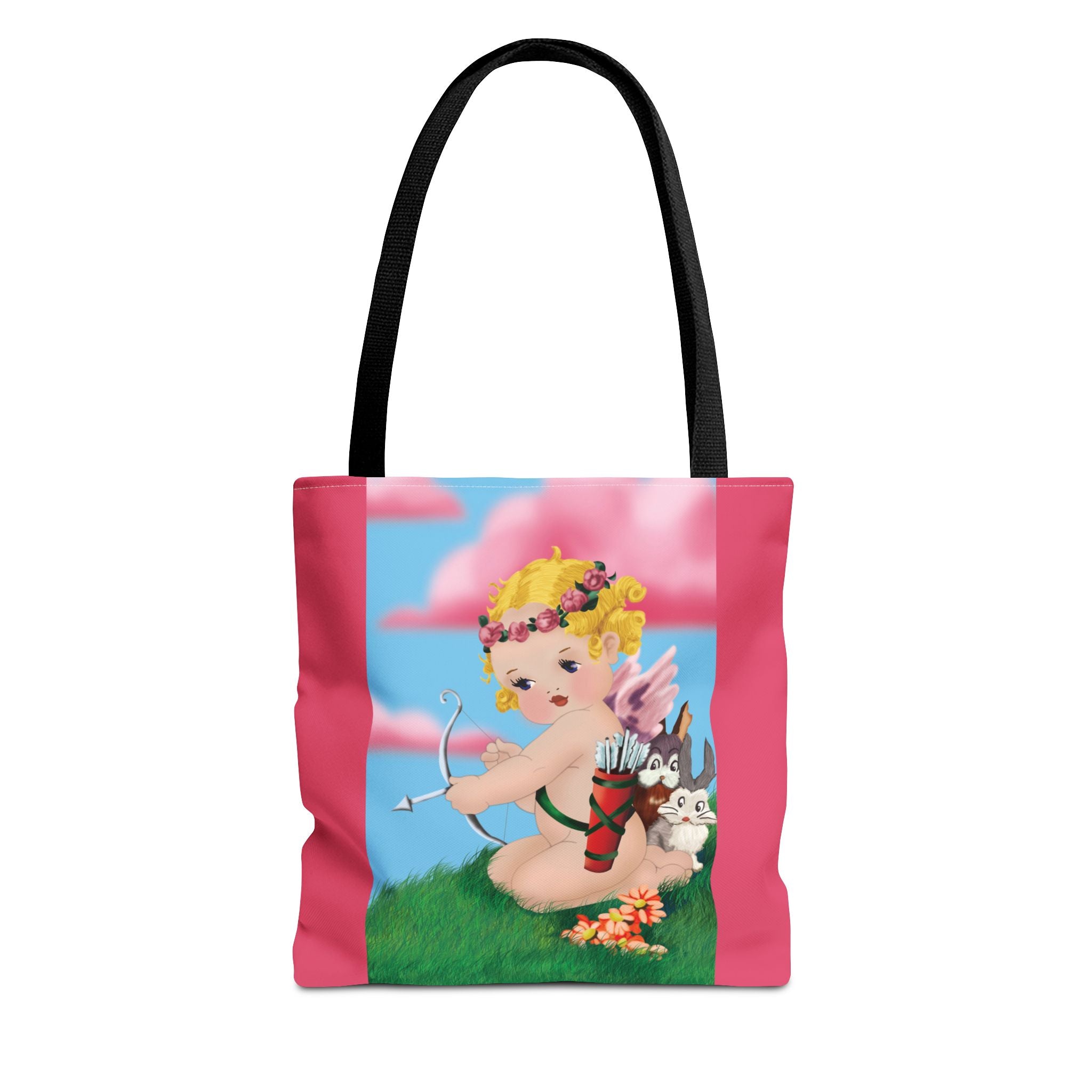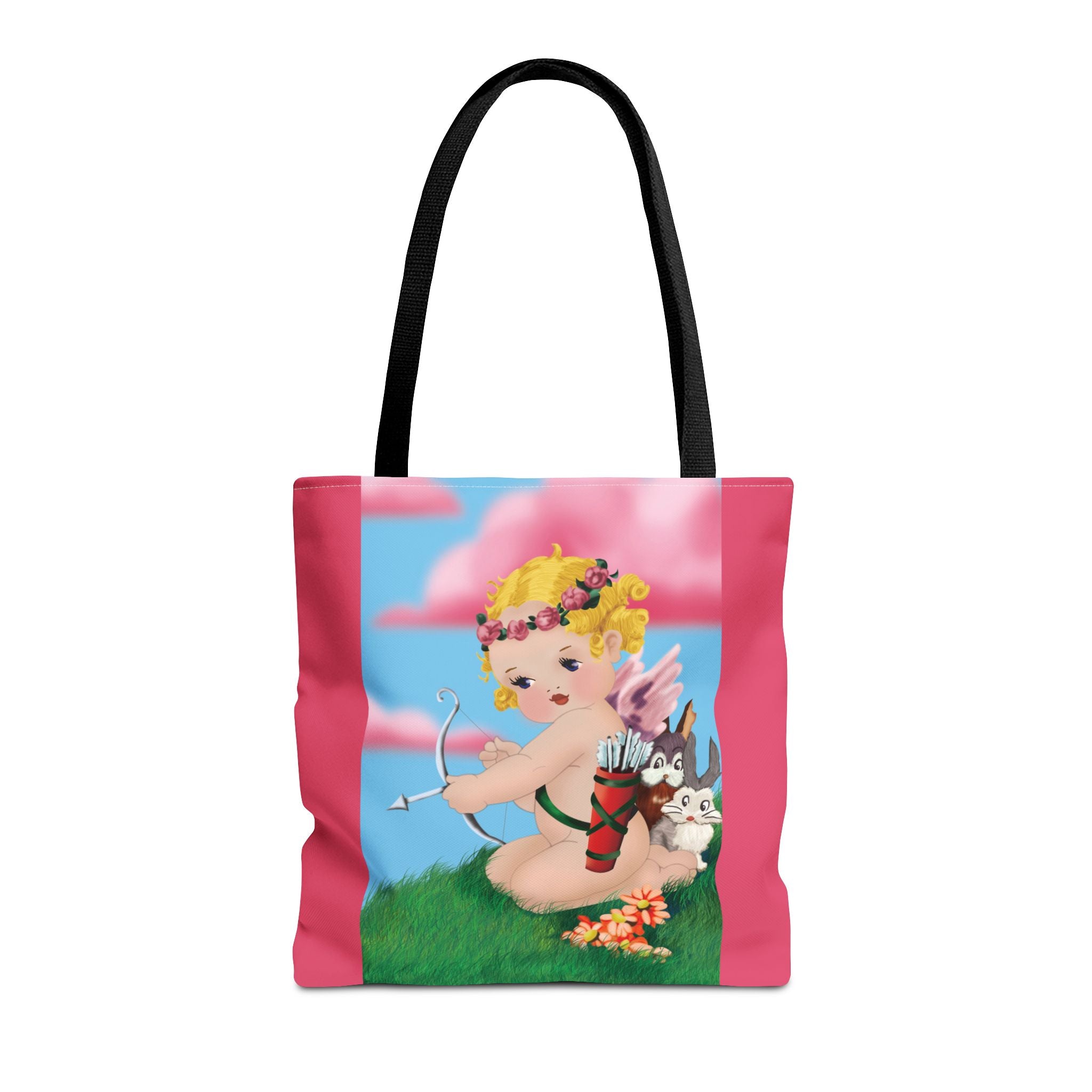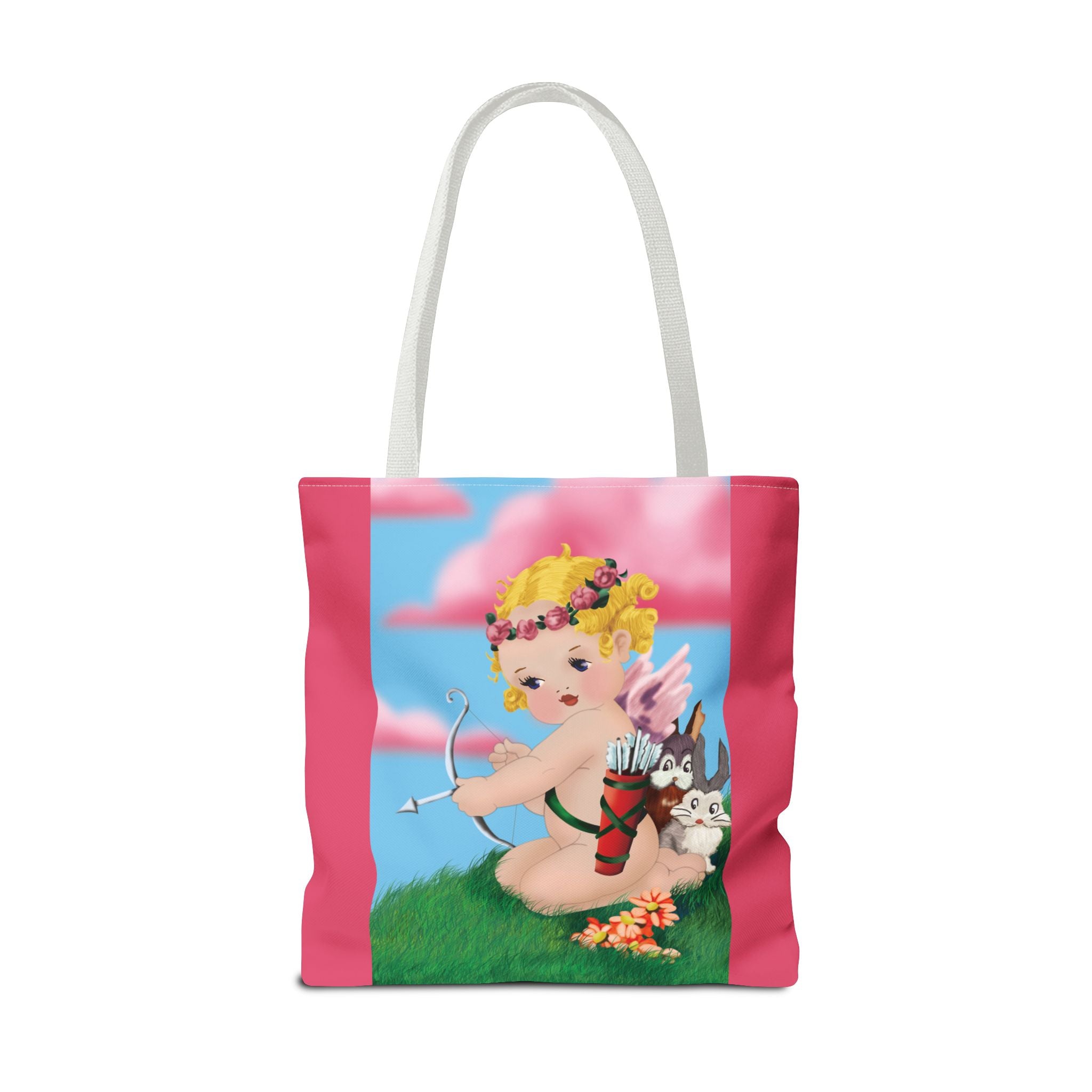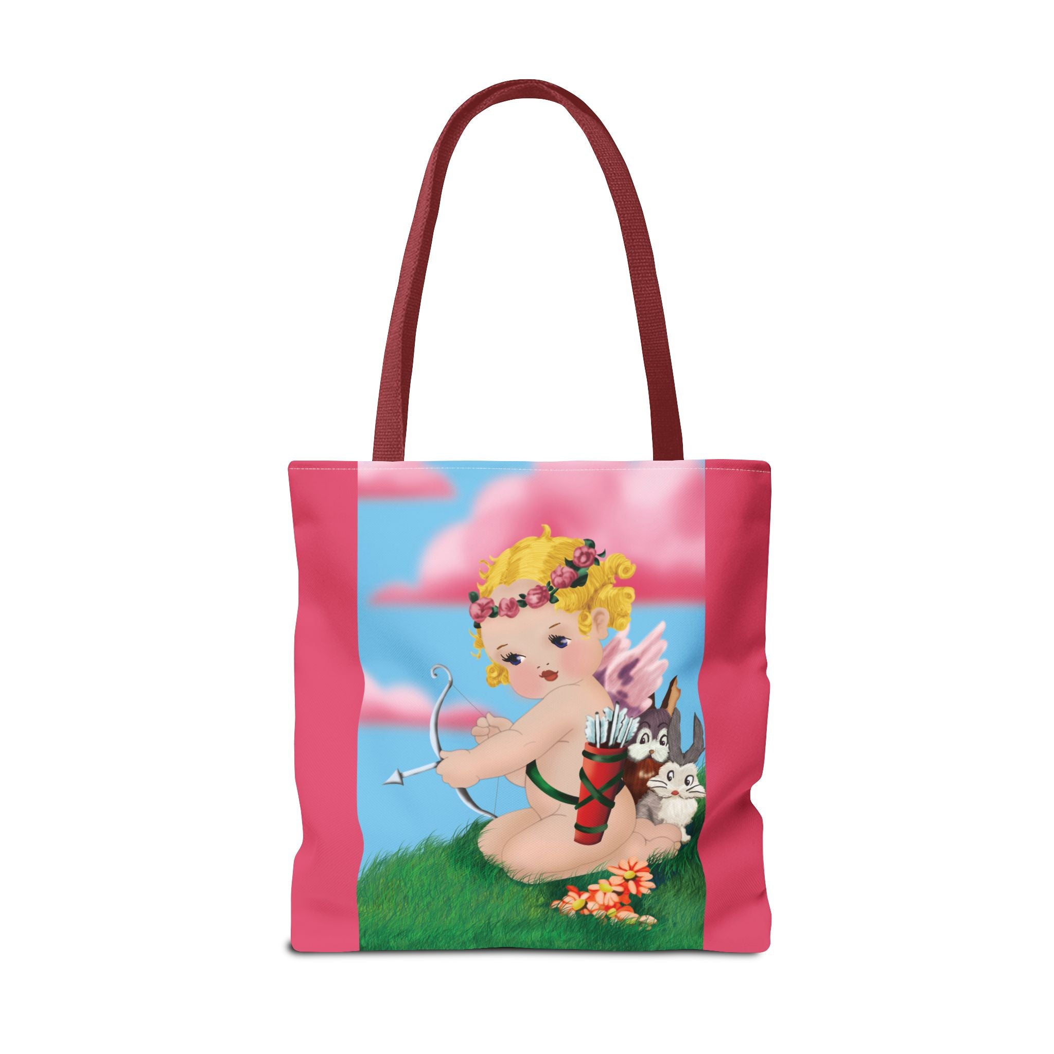 The enchanting design showcases a playful baby Cupid with golden hair and a delicate flower crown, aiming his bow amidst a whimsical scene of vibrant green grass, colorful flowers, and a dreamy sky of soft blue and pink clouds. Beside Cupid, two curious rabbits add a touch of innocence and wonder, making this bag not only functional but also a celebration of love and playful romance.