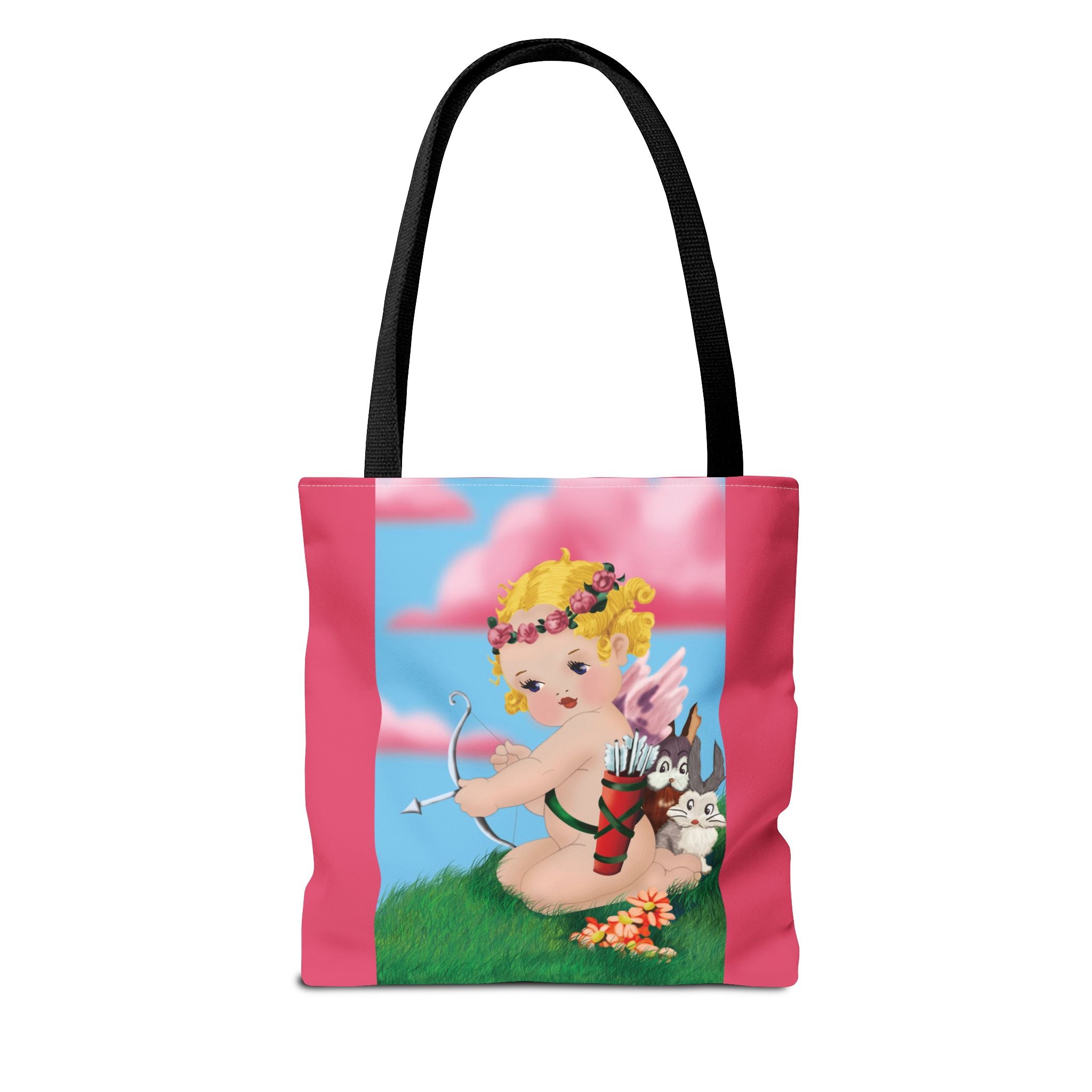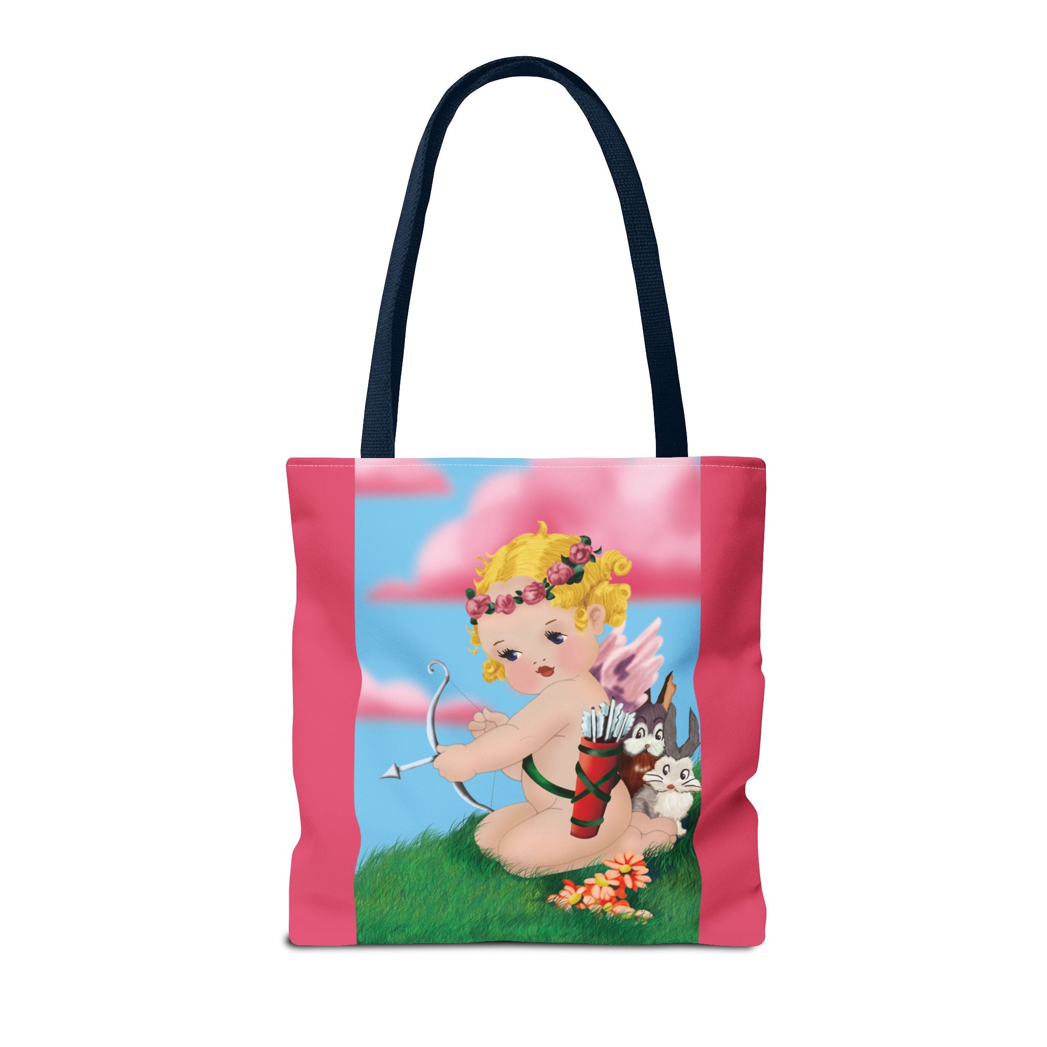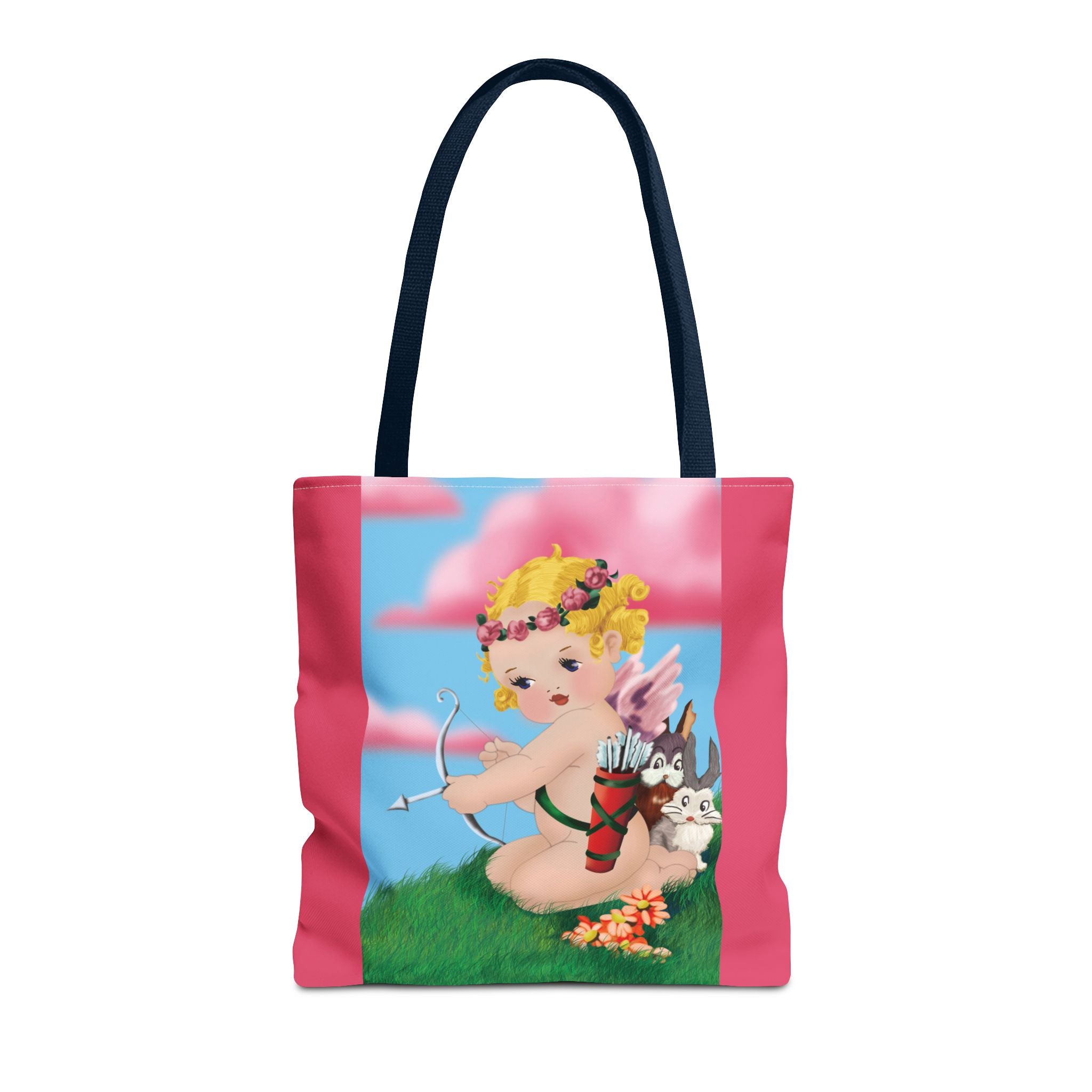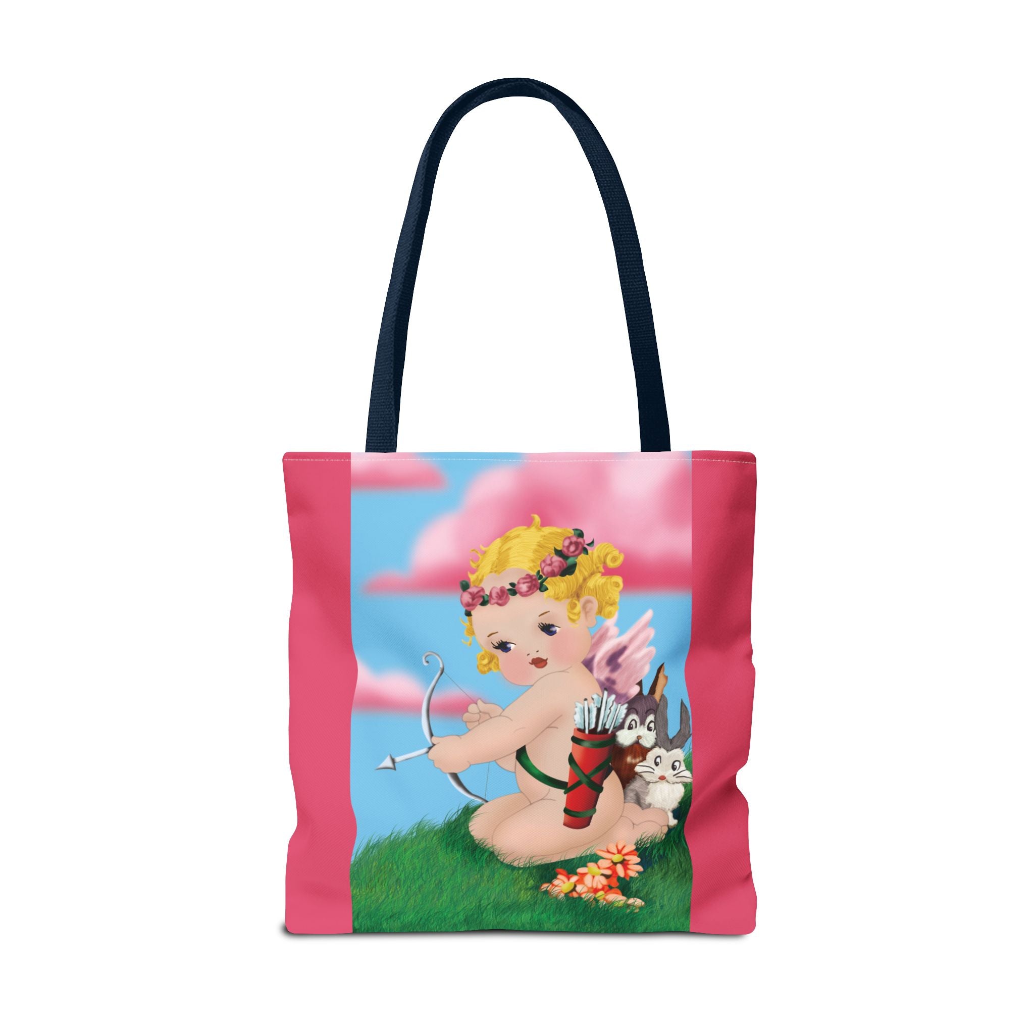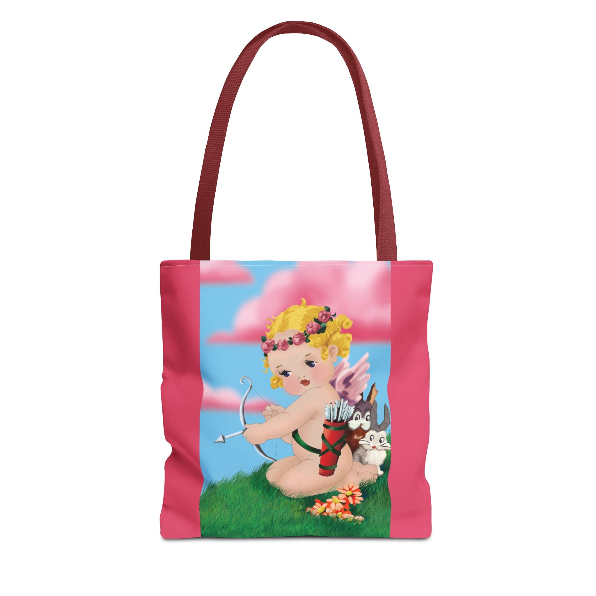 The enchanting design showcases a playful baby Cupid with golden hair and a delicate flower crown, aiming his bow amidst a whimsical scene of vibrant green grass, colorful flowers, and a dreamy sky of soft blue and pink clouds. Beside Cupid, two curious rabbits add a touch of innocence and wonder, making this bag not only functional but also a celebration of love and playful romance.