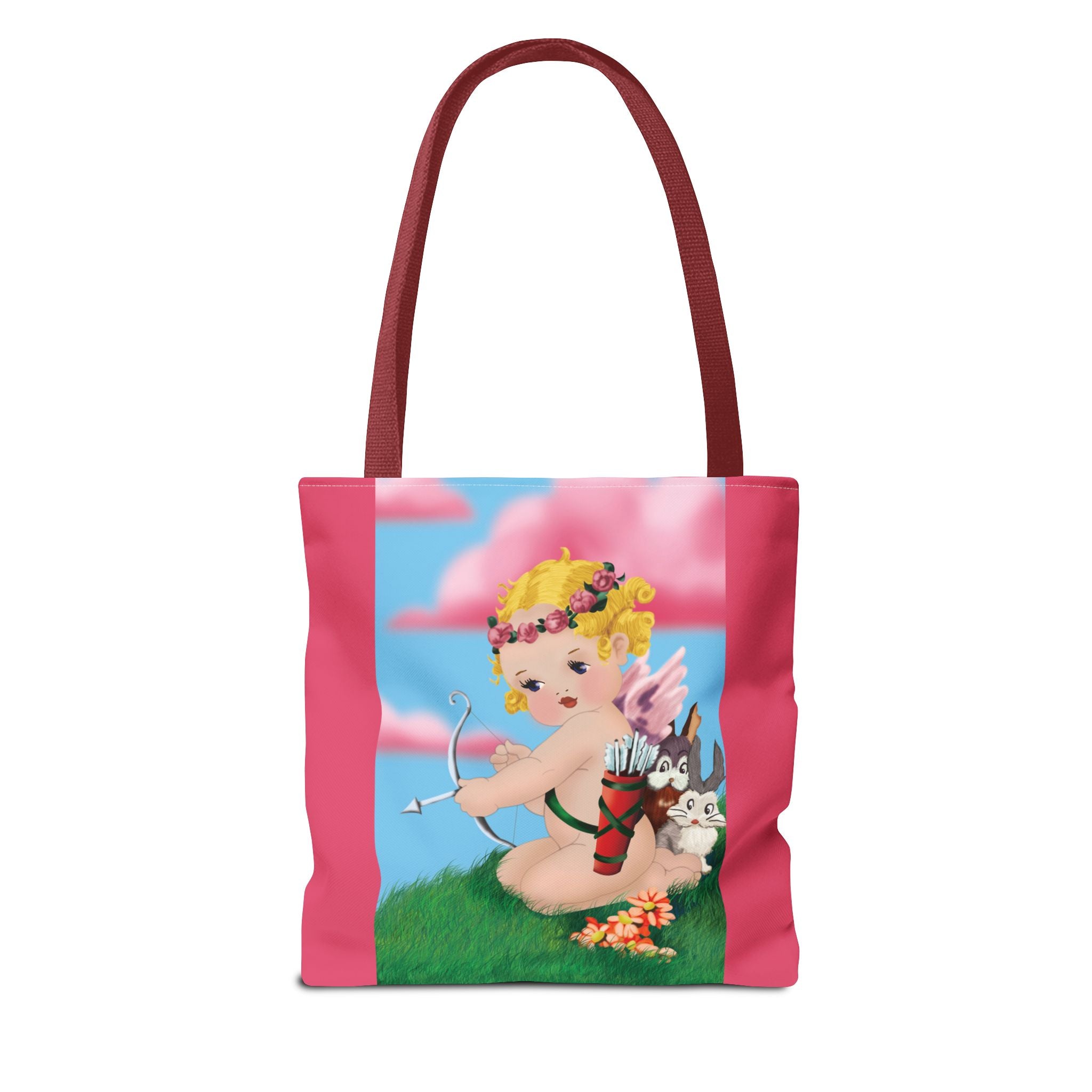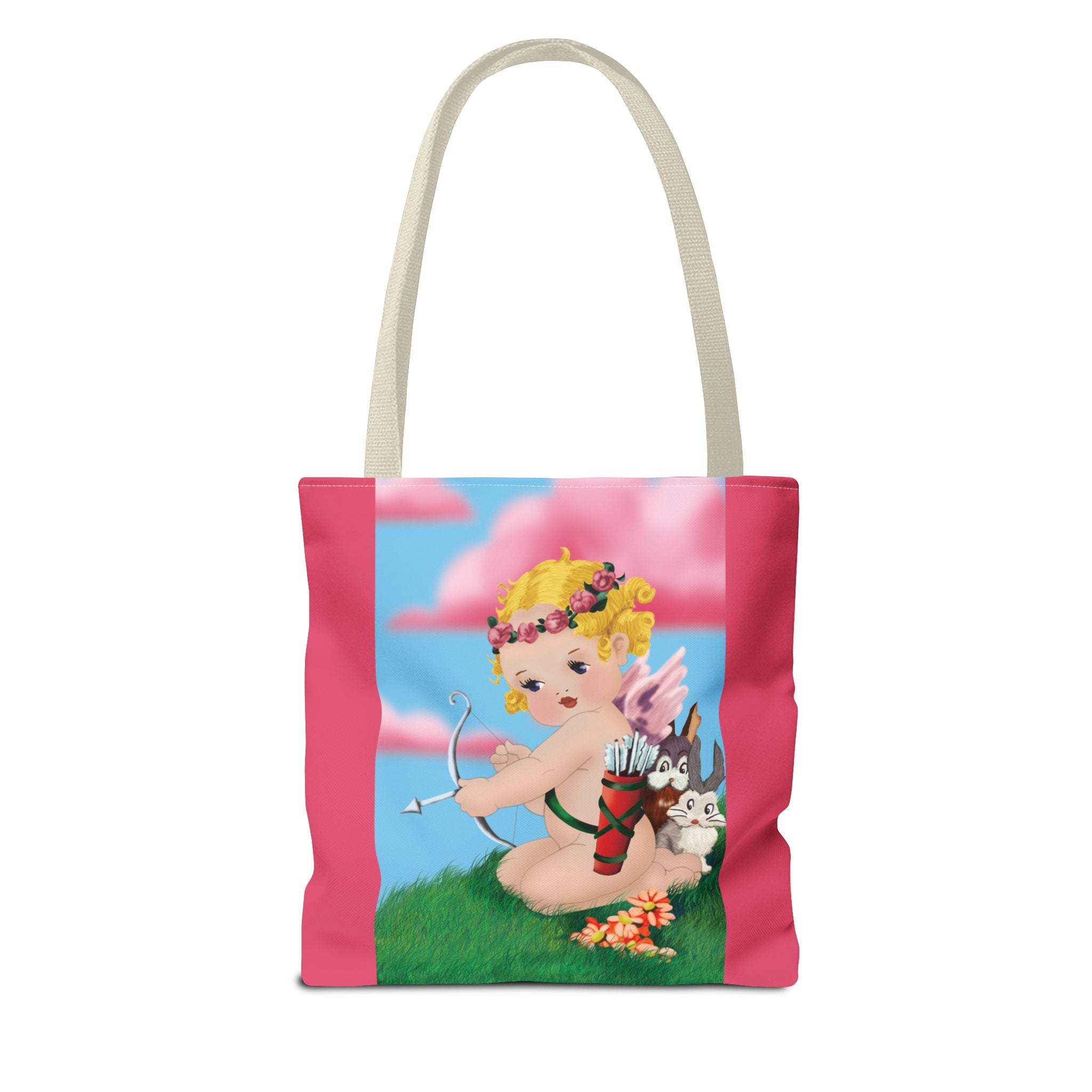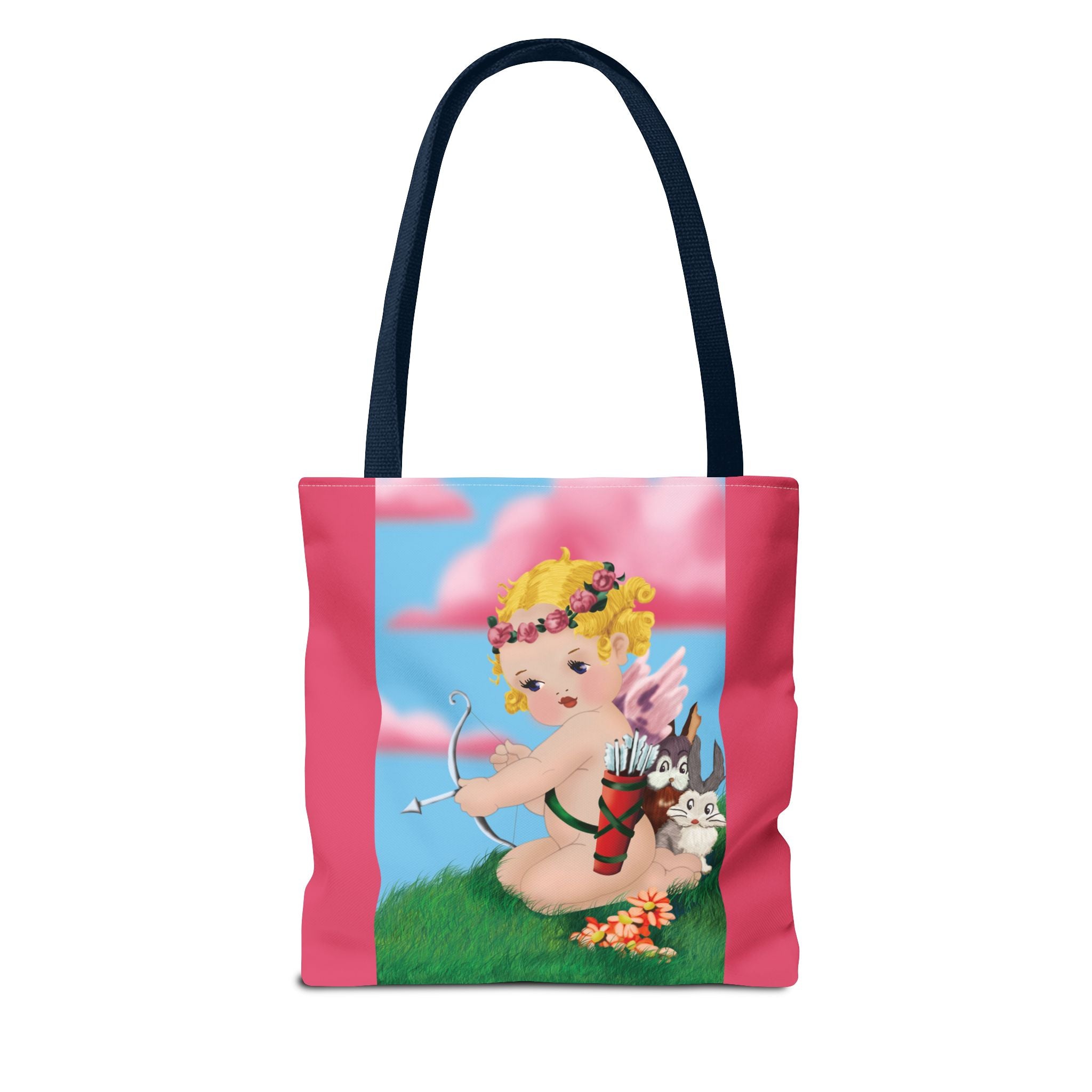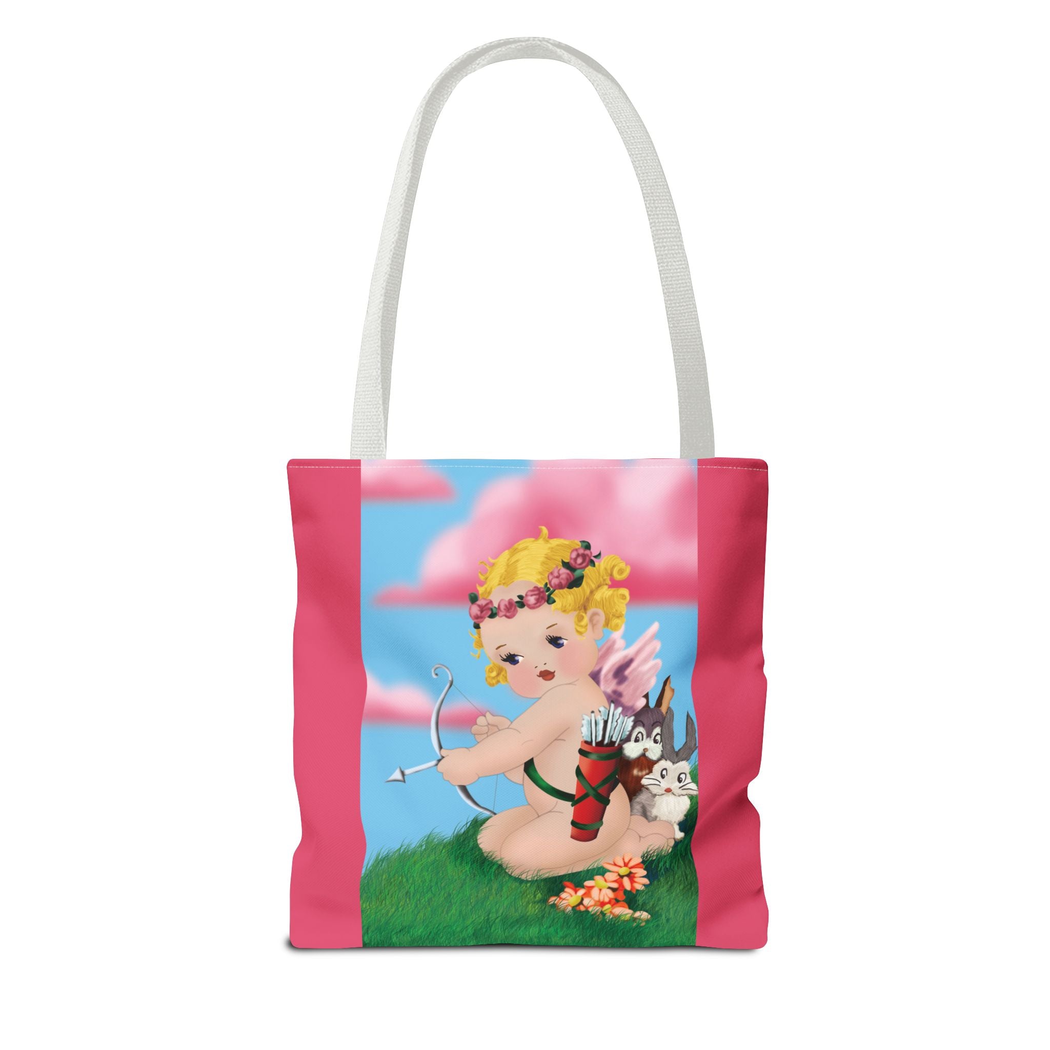The enchanting design showcases a playful baby Cupid with golden hair and a delicate flower crown, aiming his bow amidst a whimsical scene of vibrant green grass, colorful flowers, and a dreamy sky of soft blue and pink clouds. Beside Cupid, two curious rabbits add a touch of innocence and wonder, making this bag not only functional but also a celebration of love and playful romance.