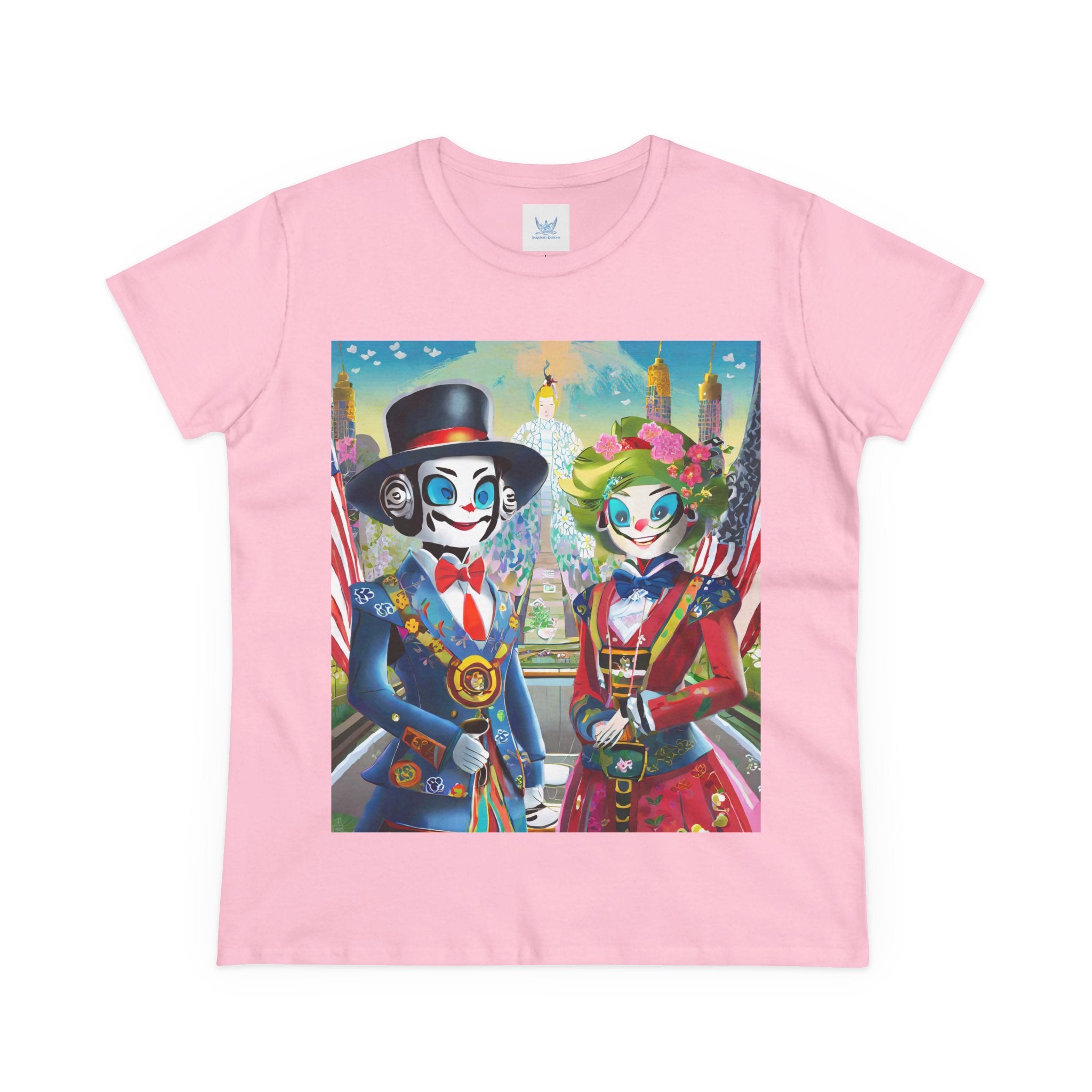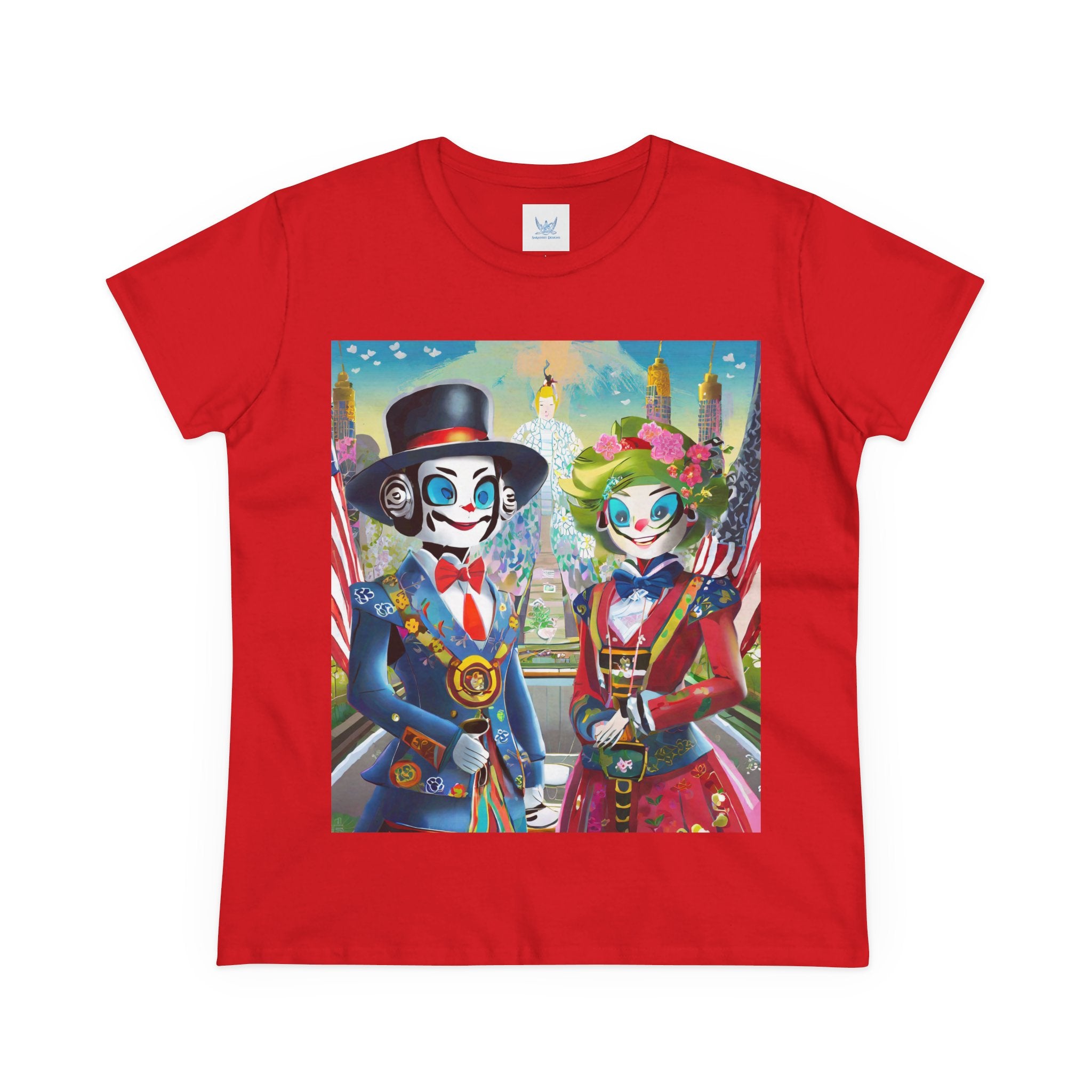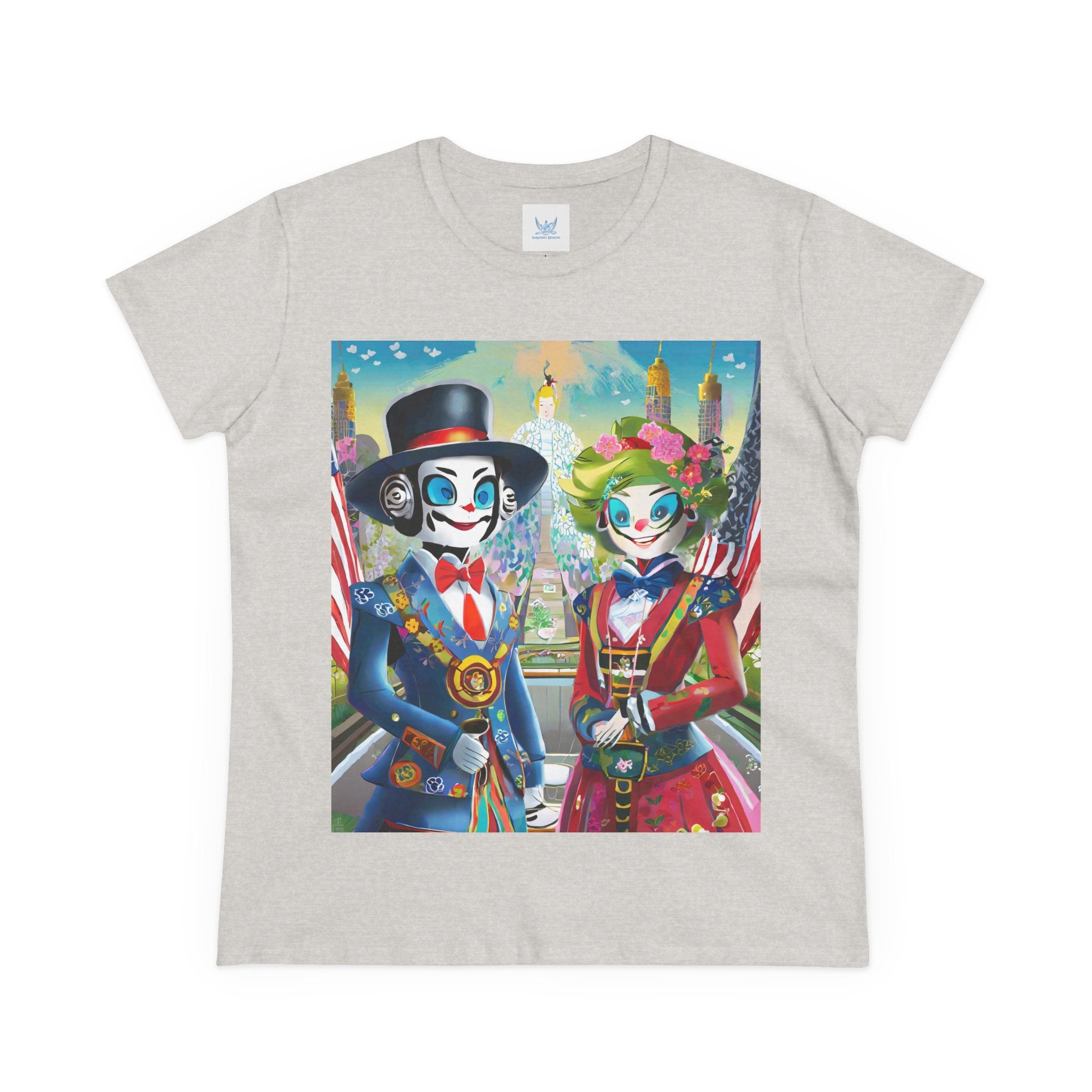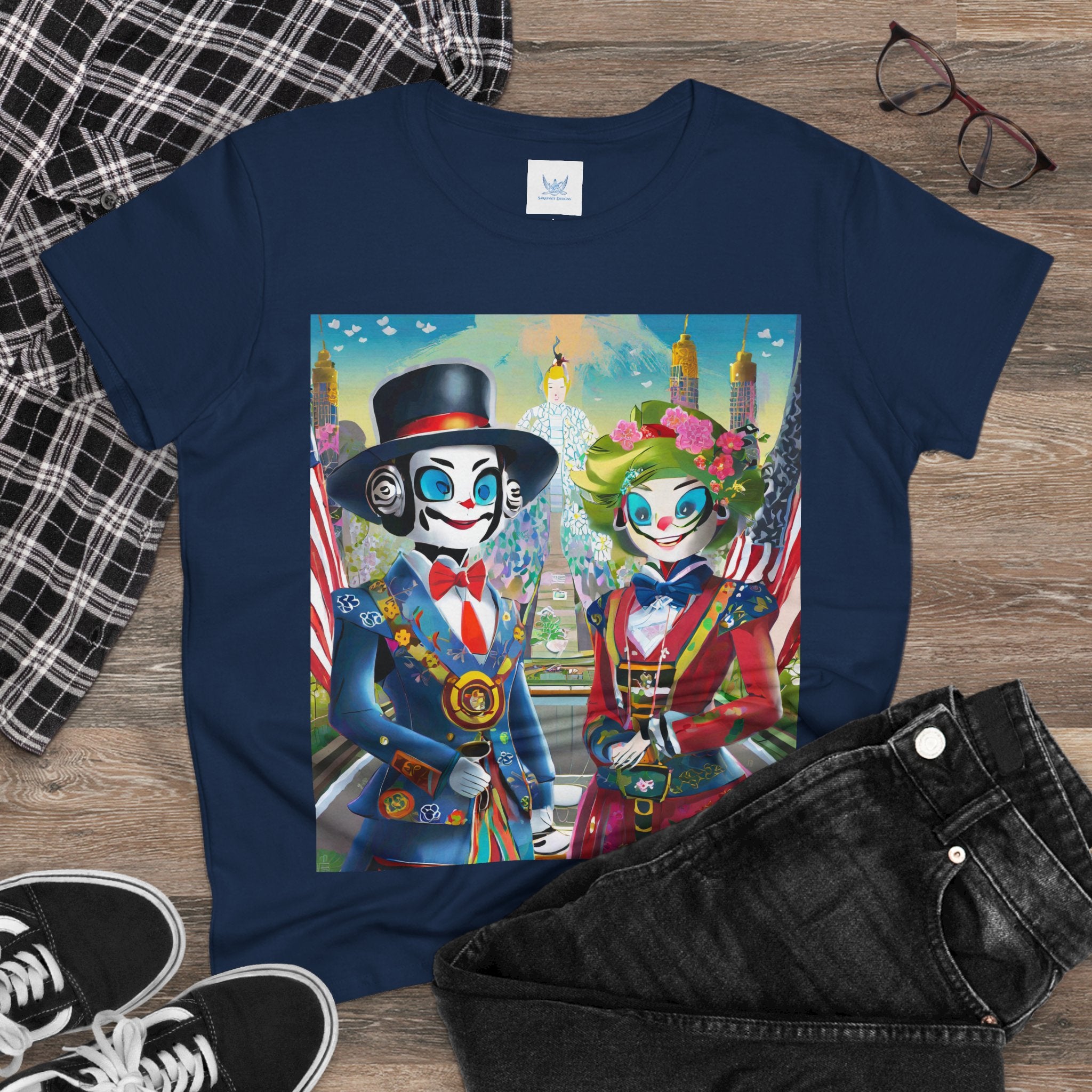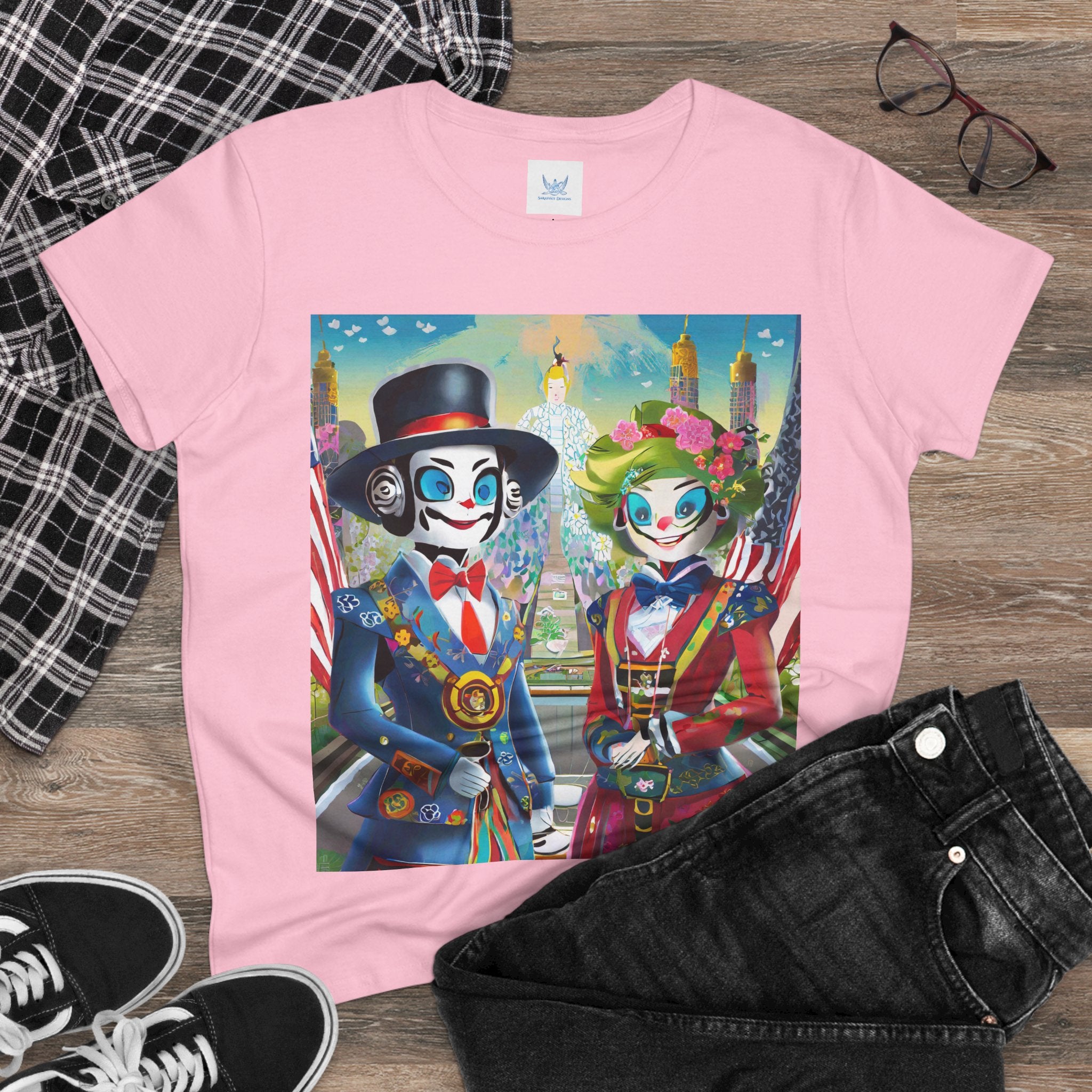 The featured artwork showcases high fashion cyber punk robot warriors protecting the United States, complete with vivid details, patriotic accents, and runway-ready flair. With sleek metallic forms, expressive faces, and a dramatic backdrop, the design blends fashion, sci-fi, and symbolism into a striking piece of wearable art.