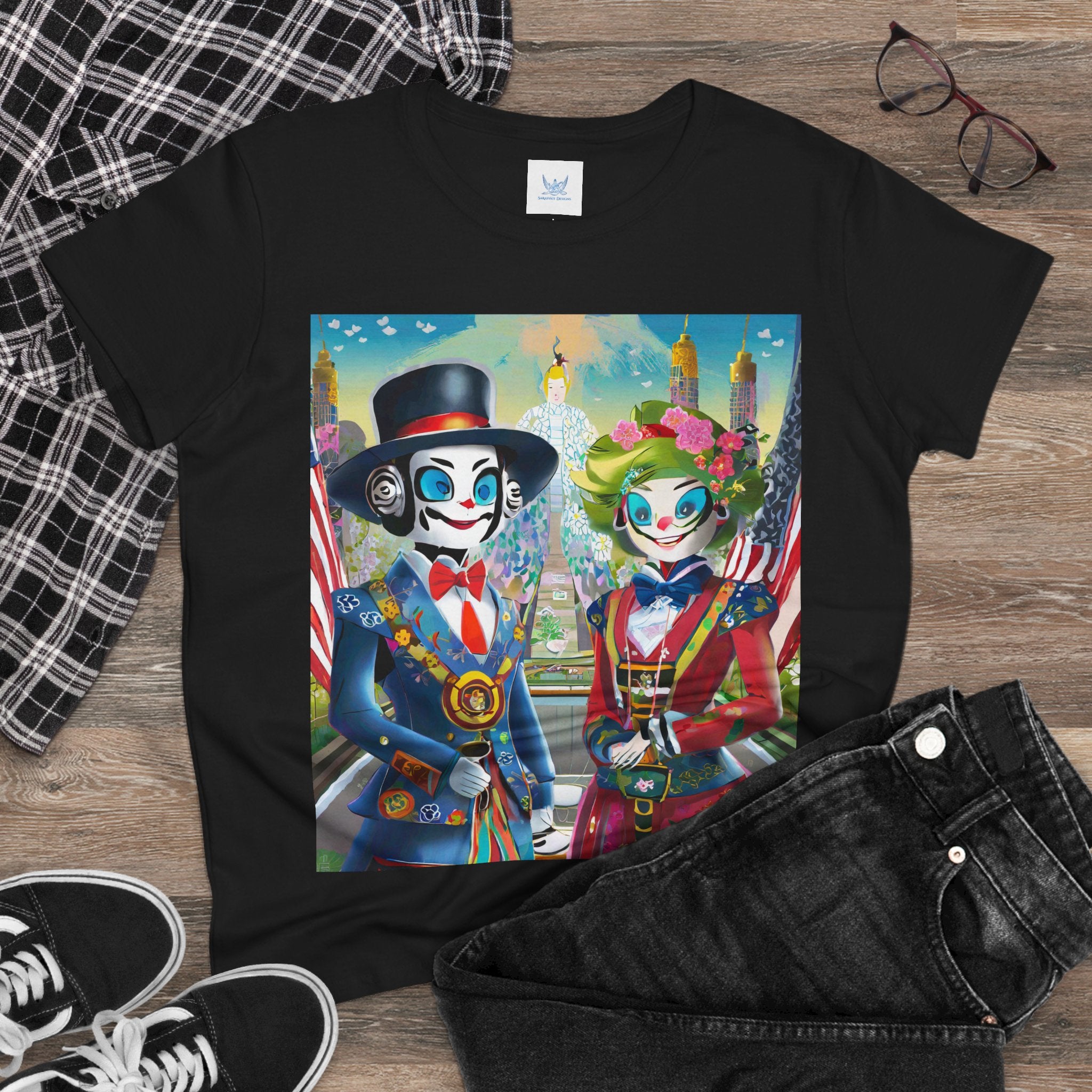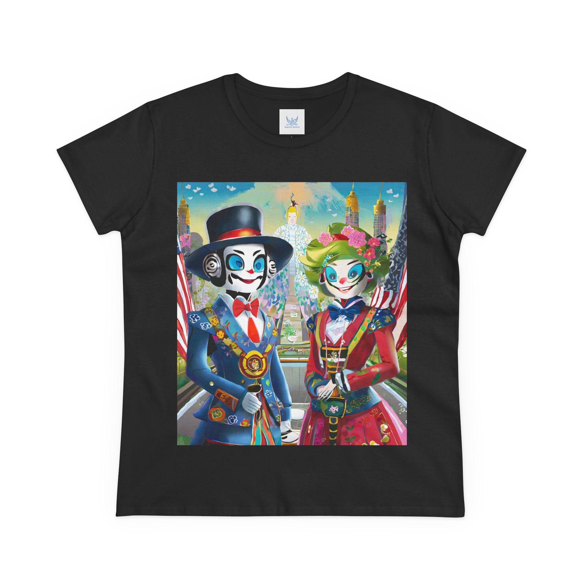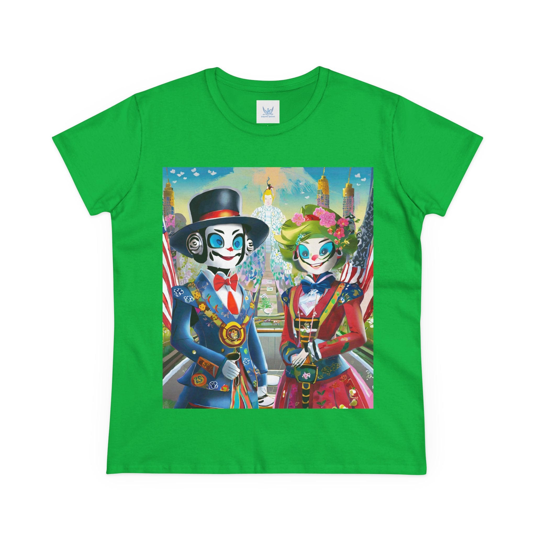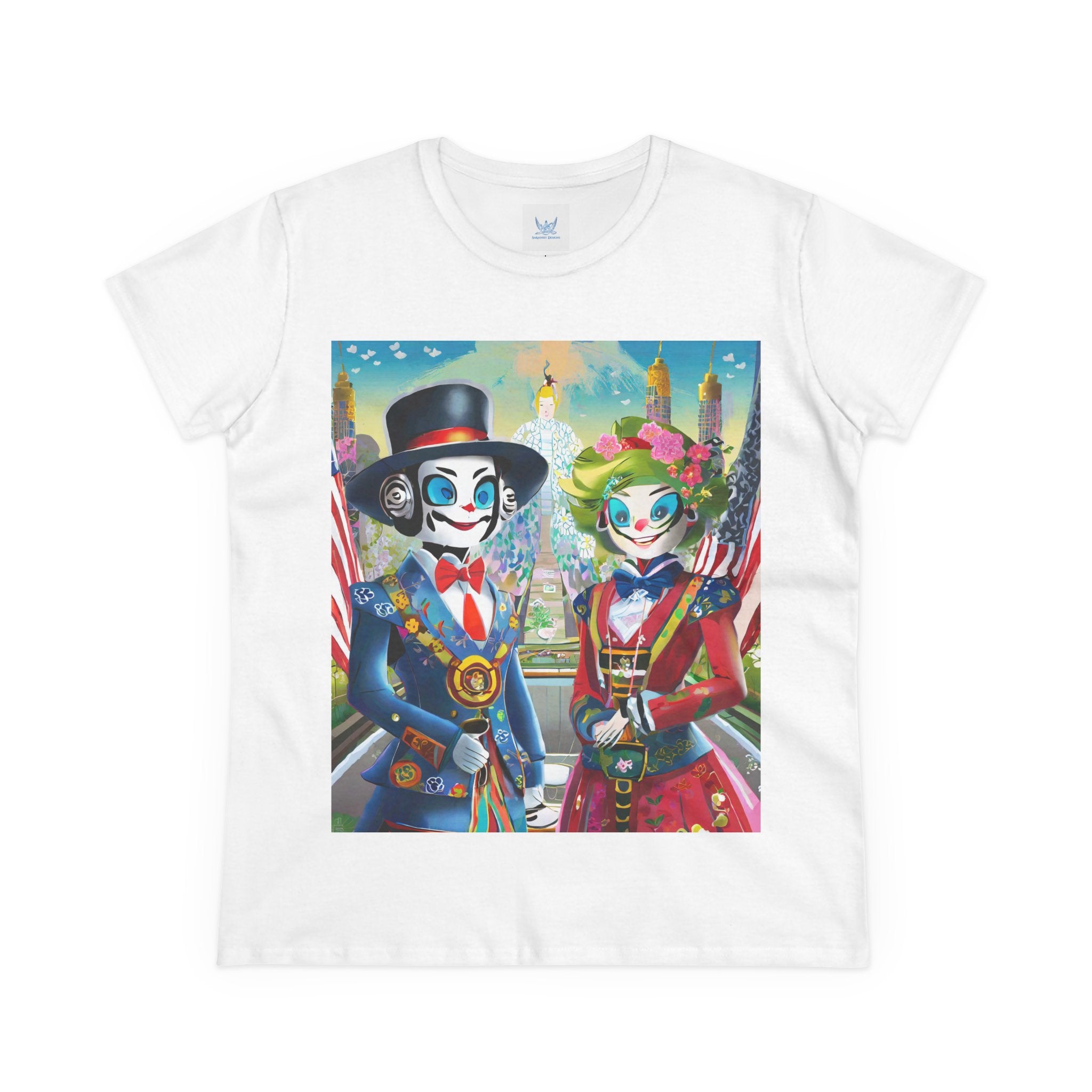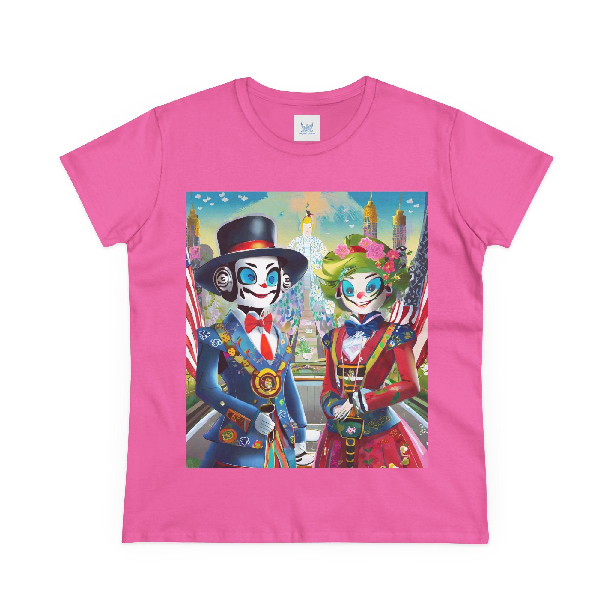 The featured artwork showcases high fashion cyber punk robot warriors protecting the United States, complete with vivid details, patriotic accents, and runway-ready flair. With sleek metallic forms, expressive faces, and a dramatic backdrop, the design blends fashion, sci-fi, and symbolism into a striking piece of wearable art.