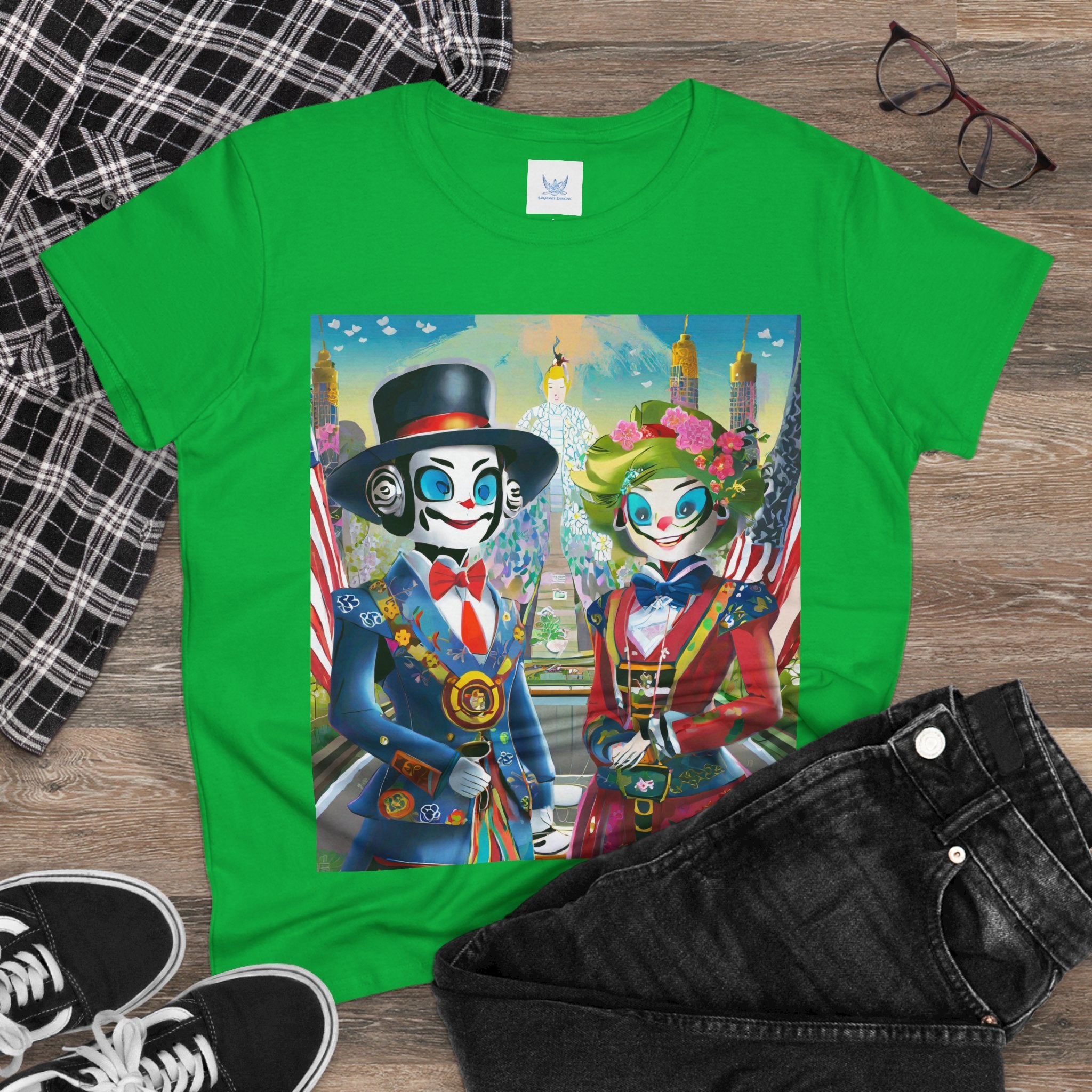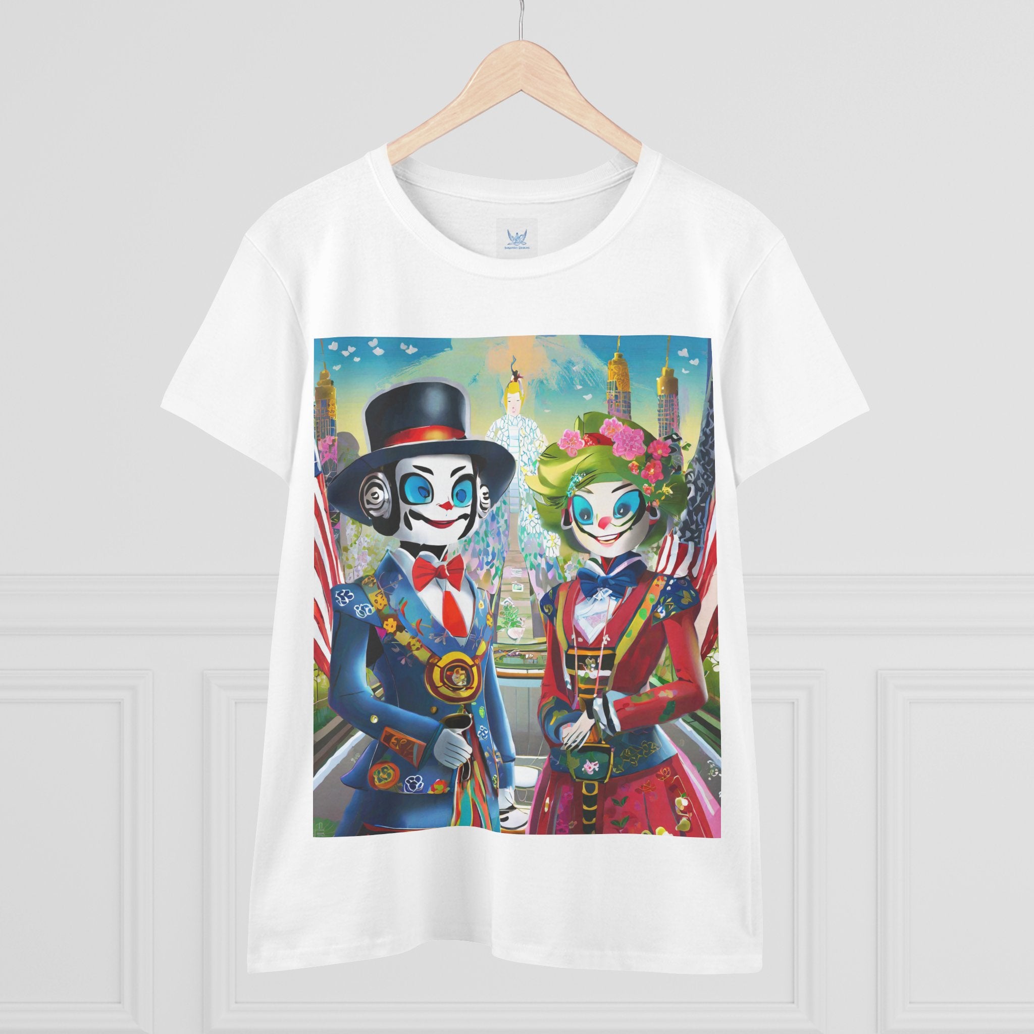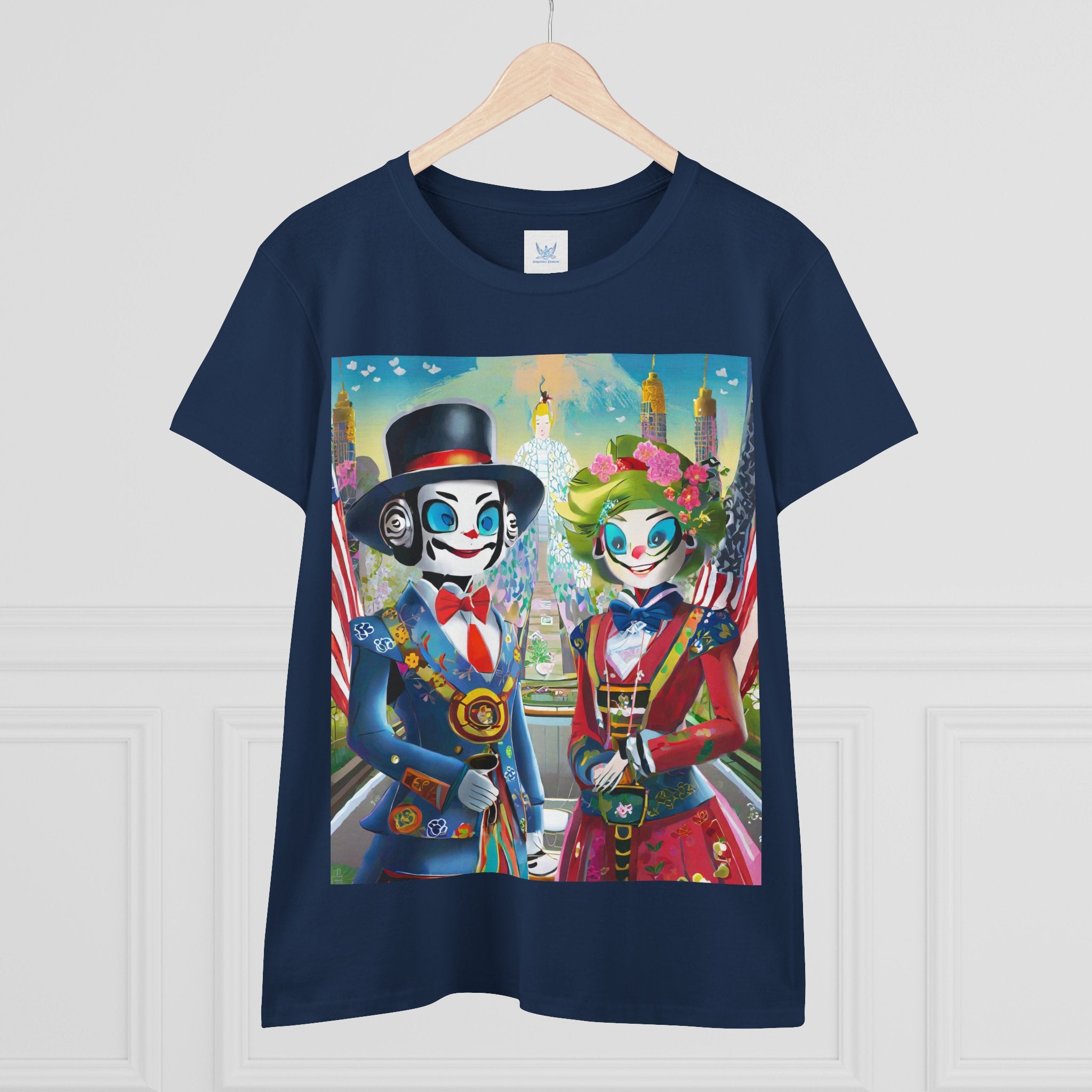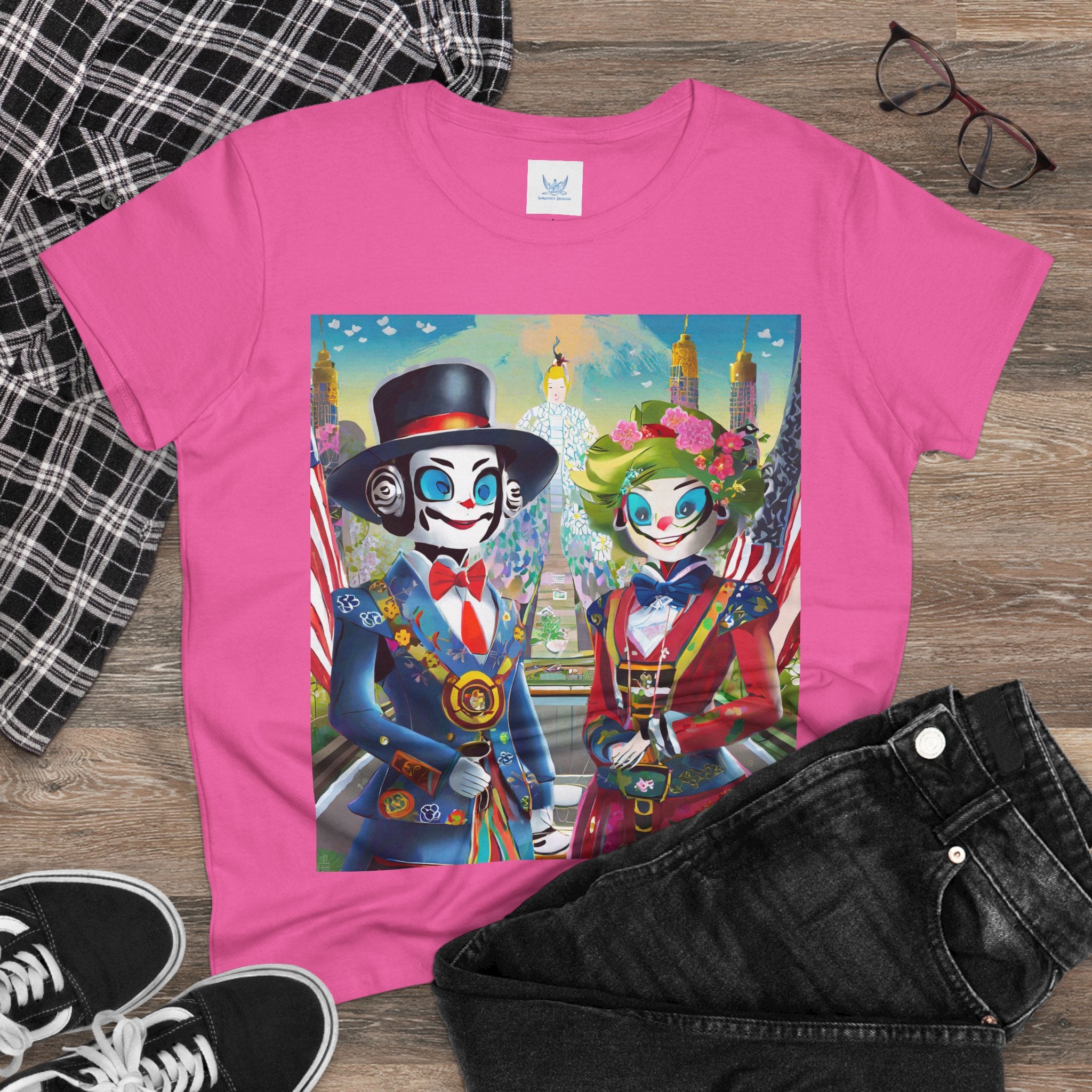 The featured artwork showcases high fashion cyber punk robot warriors protecting the United States, complete with vivid details, patriotic accents, and runway-ready flair. With sleek metallic forms, expressive faces, and a dramatic backdrop, the design blends fashion, sci-fi, and symbolism into a striking piece of wearable art.