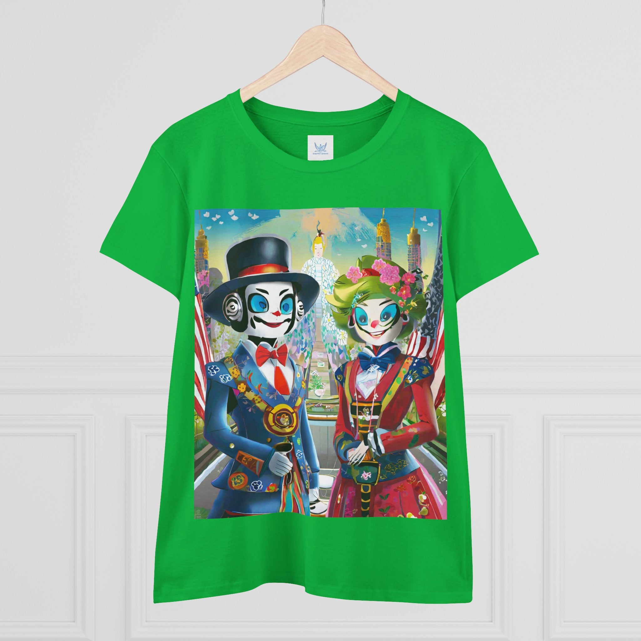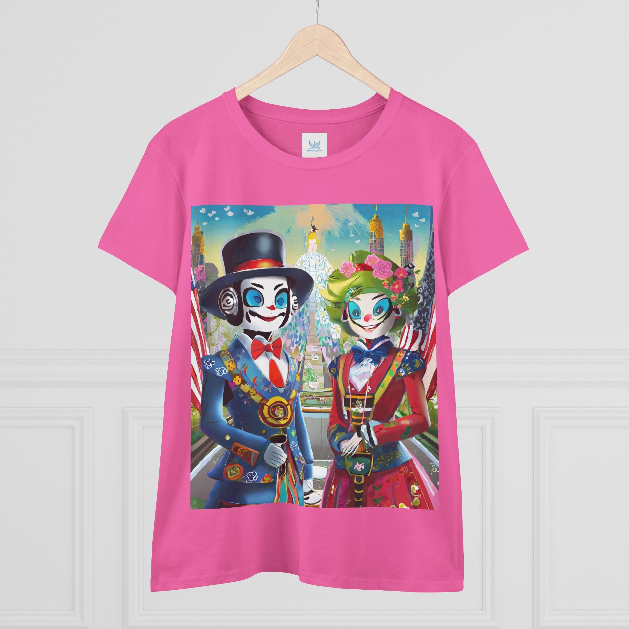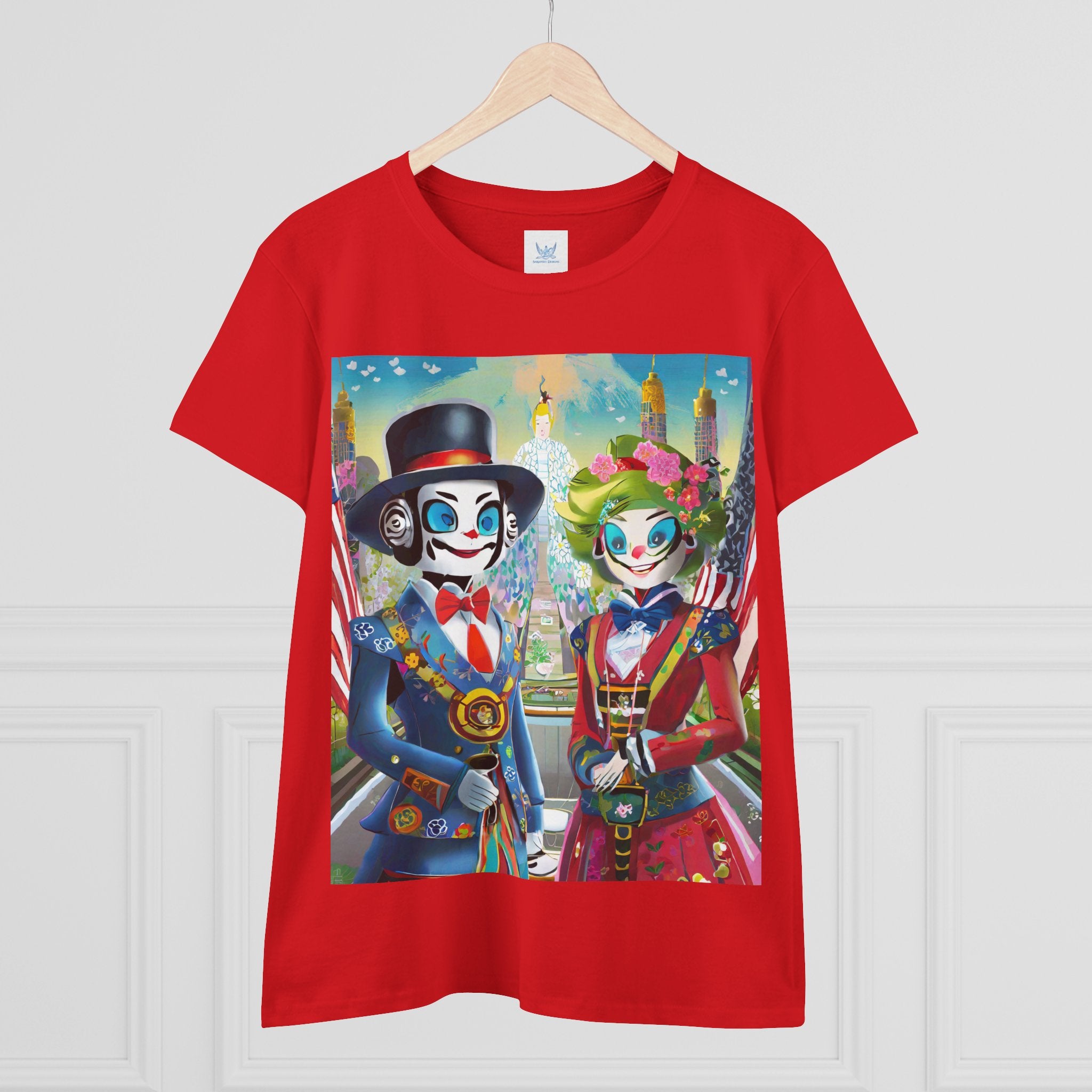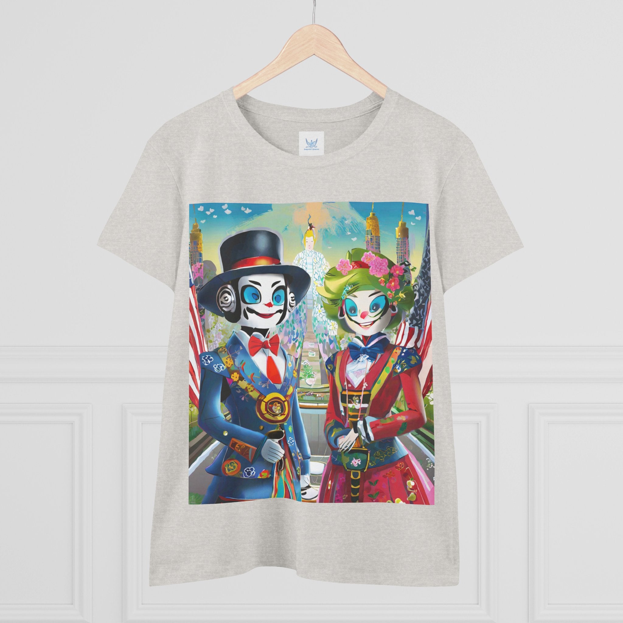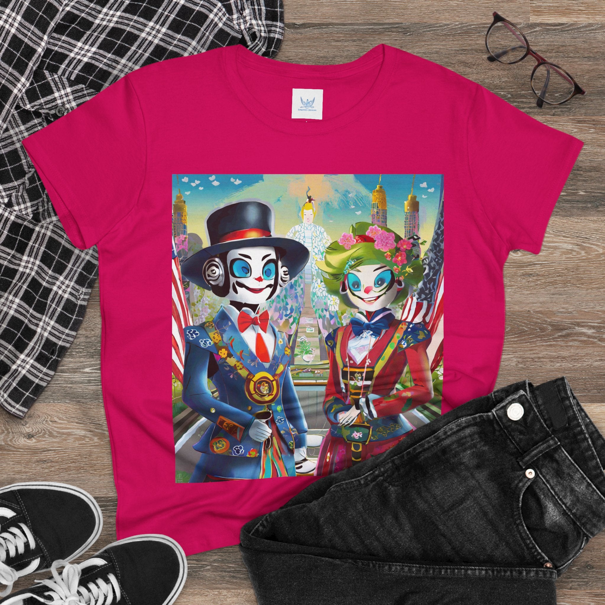 The featured artwork showcases high fashion cyber punk robot warriors protecting the United States, complete with vivid details, patriotic accents, and runway-ready flair. With sleek metallic forms, expressive faces, and a dramatic backdrop, the design blends fashion, sci-fi, and symbolism into a striking piece of wearable art.