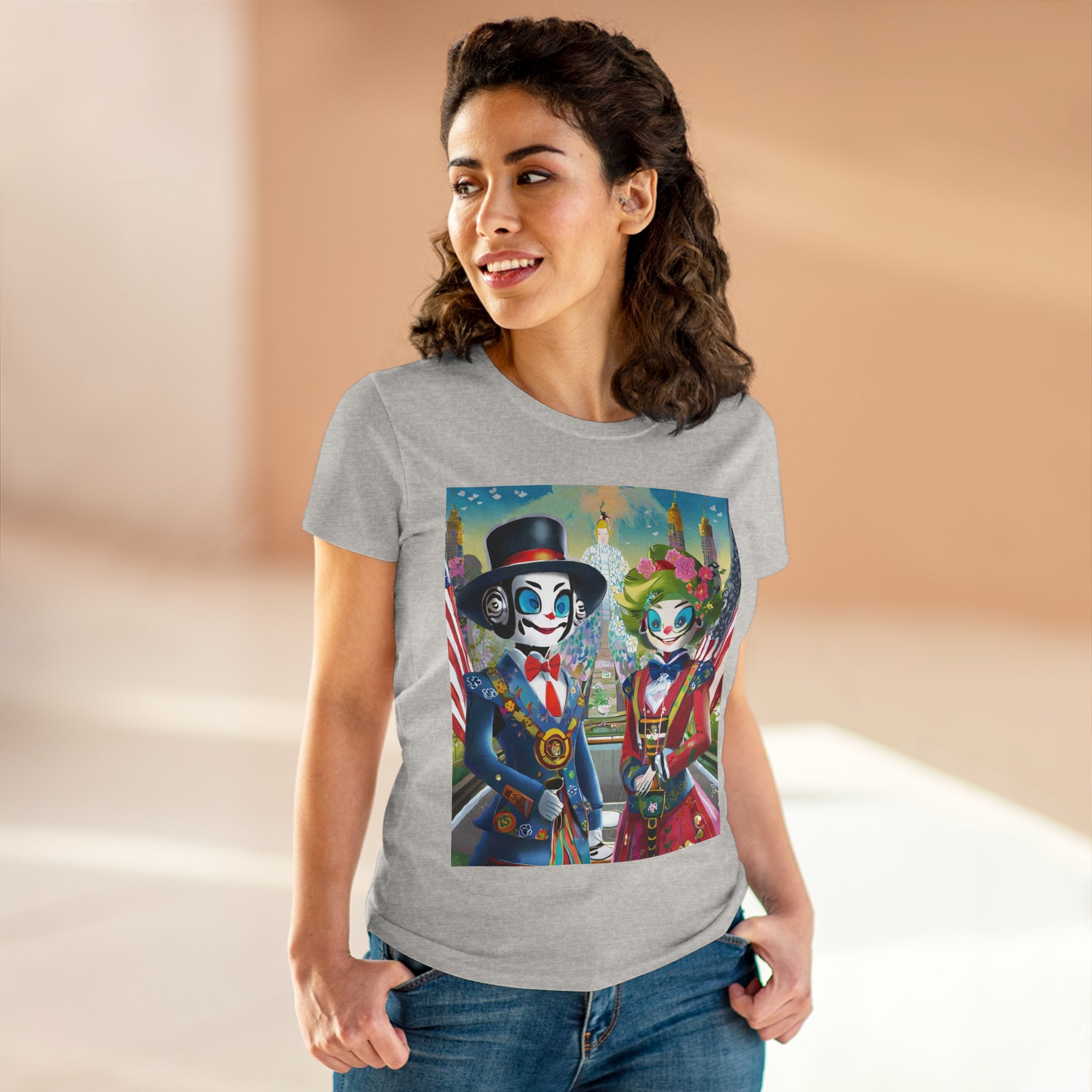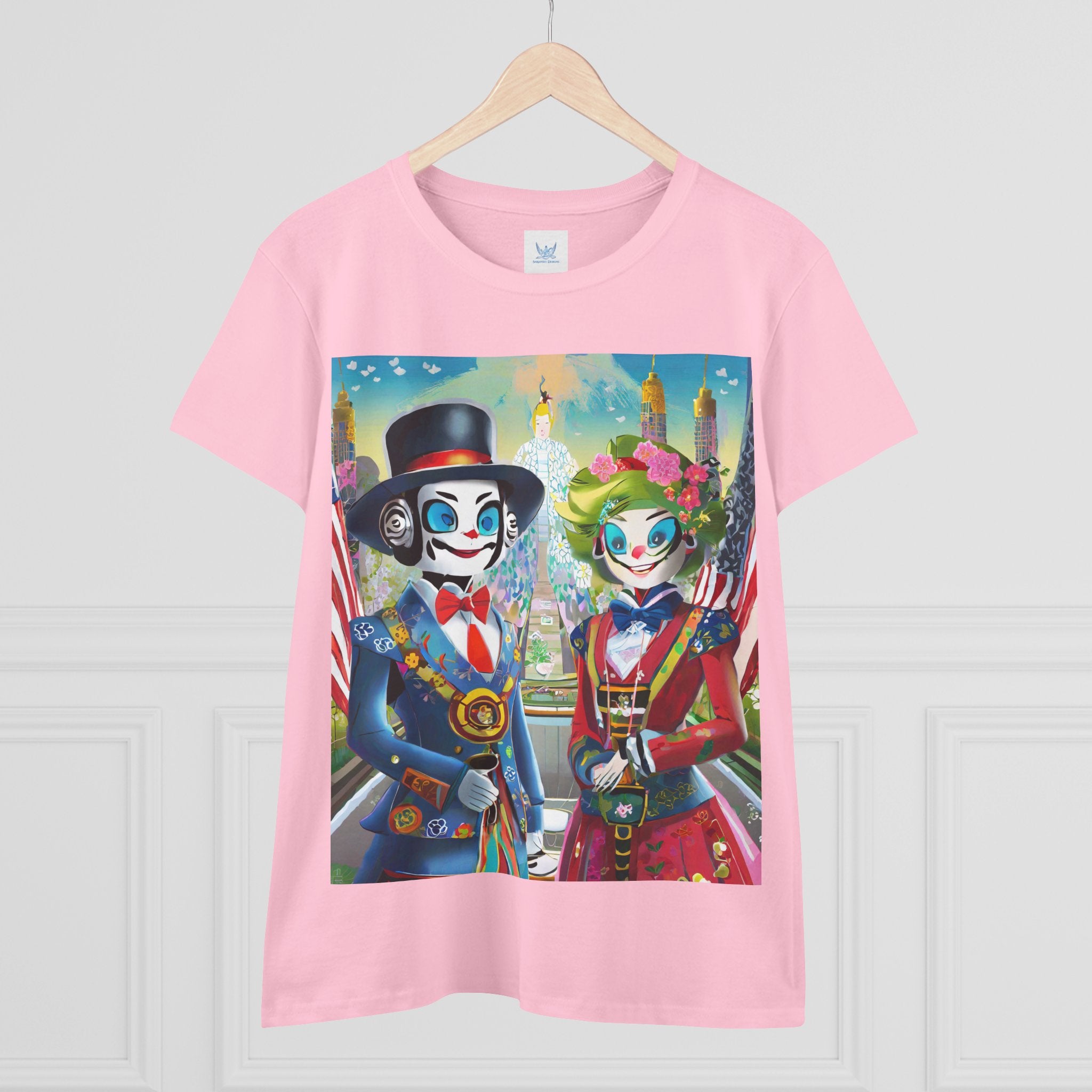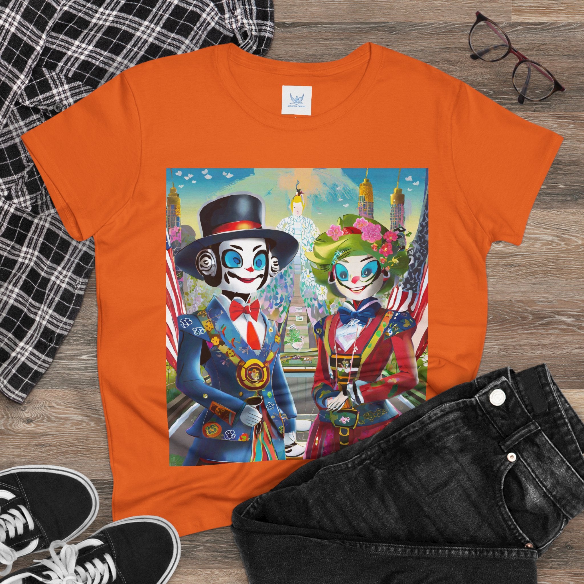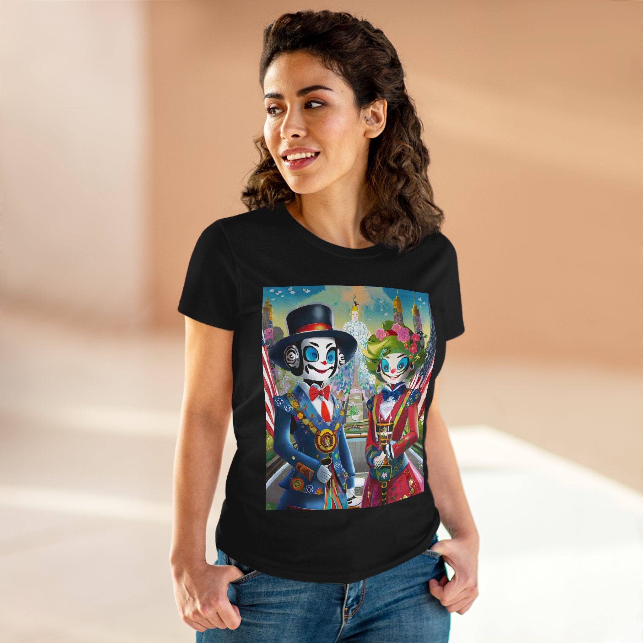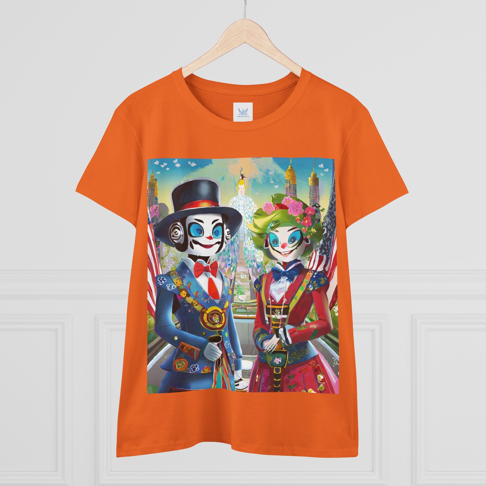 The featured artwork showcases high fashion cyber punk robot warriors protecting the United States, complete with vivid details, patriotic accents, and runway-ready flair. With sleek metallic forms, expressive faces, and a dramatic backdrop, the design blends fashion, sci-fi, and symbolism into a striking piece of wearable art.