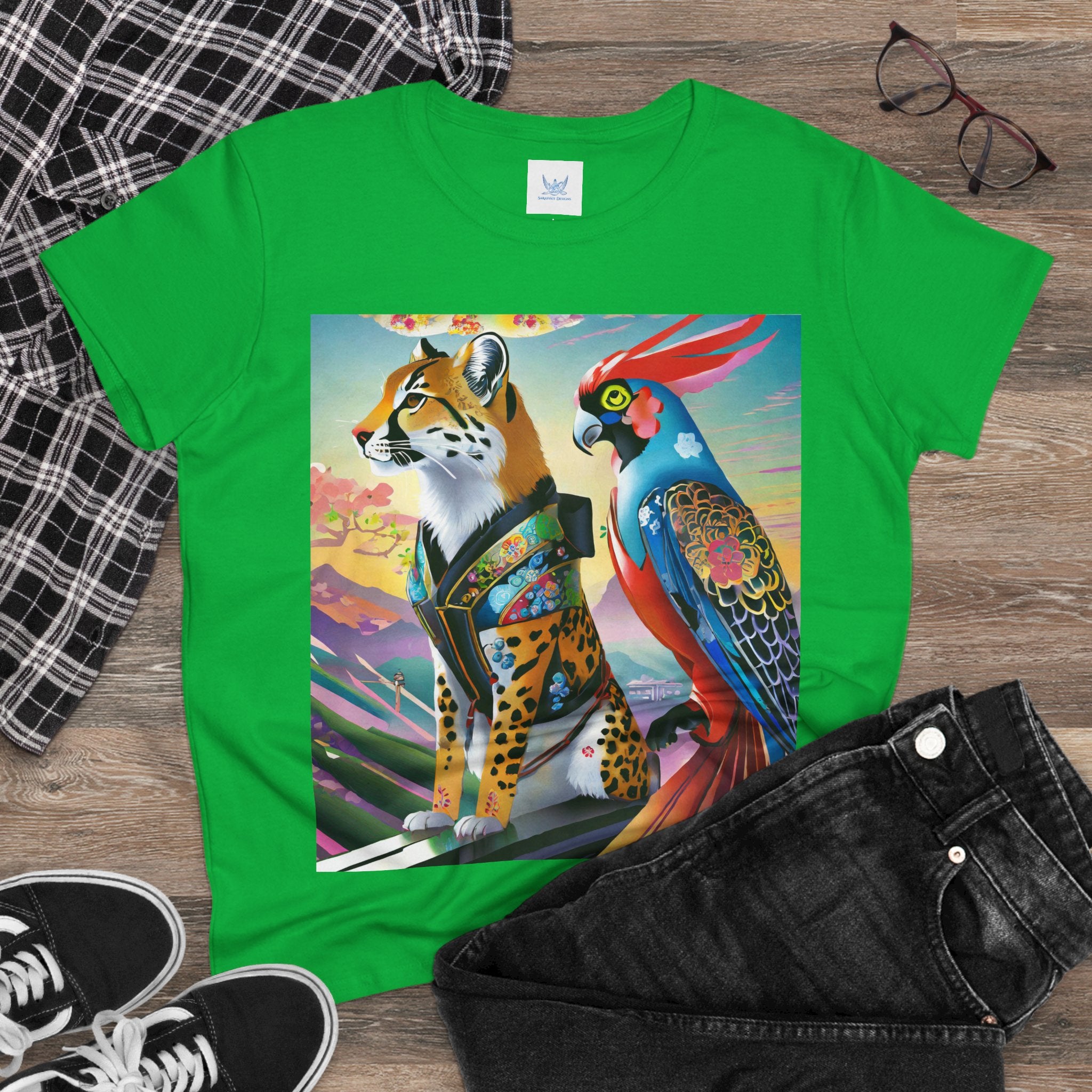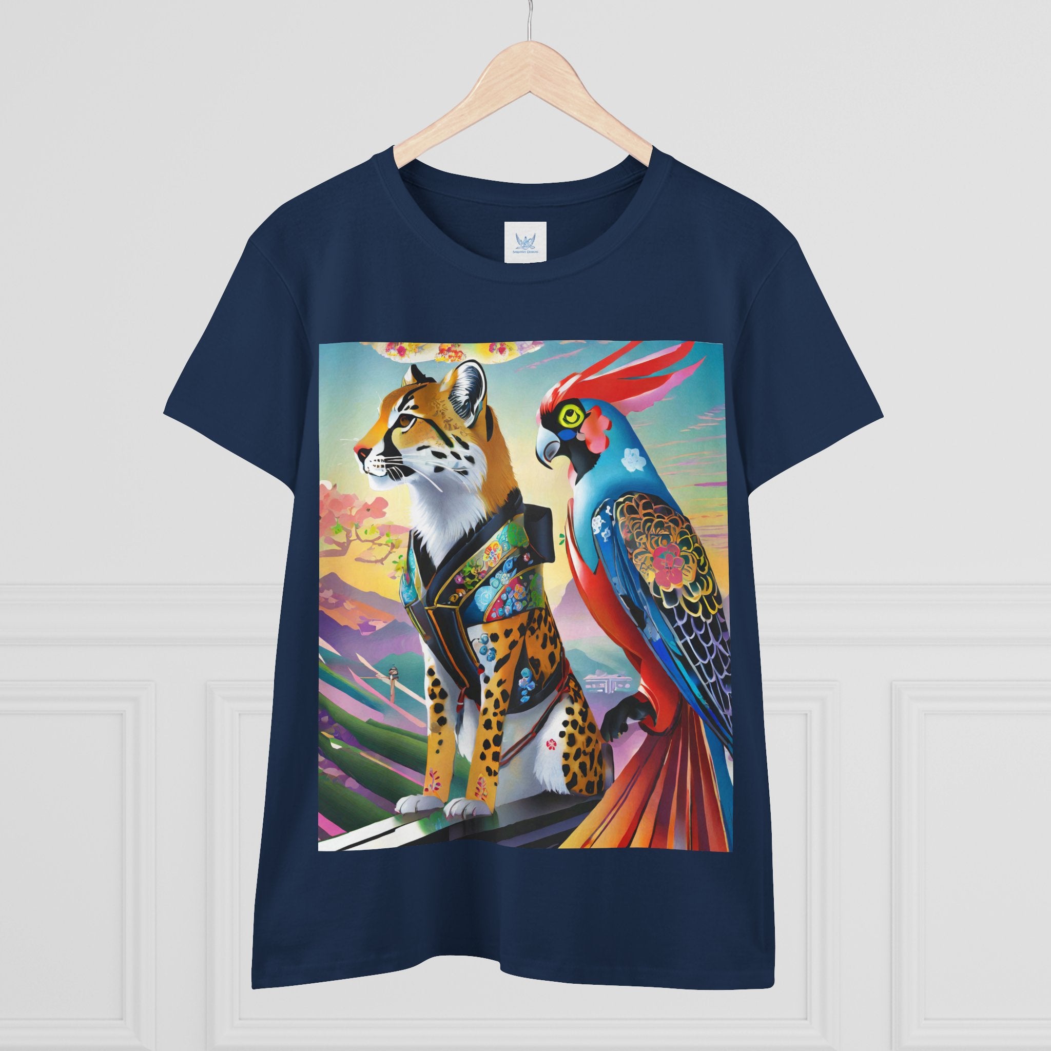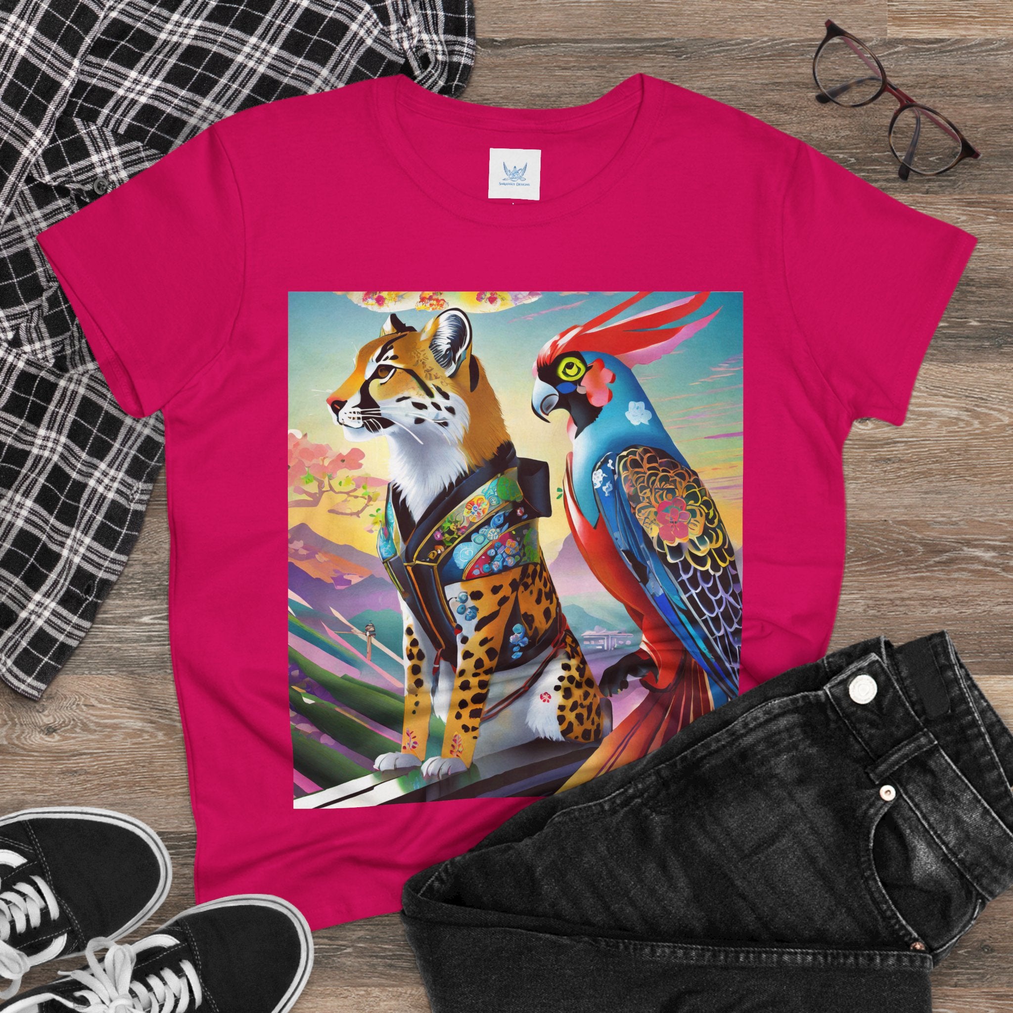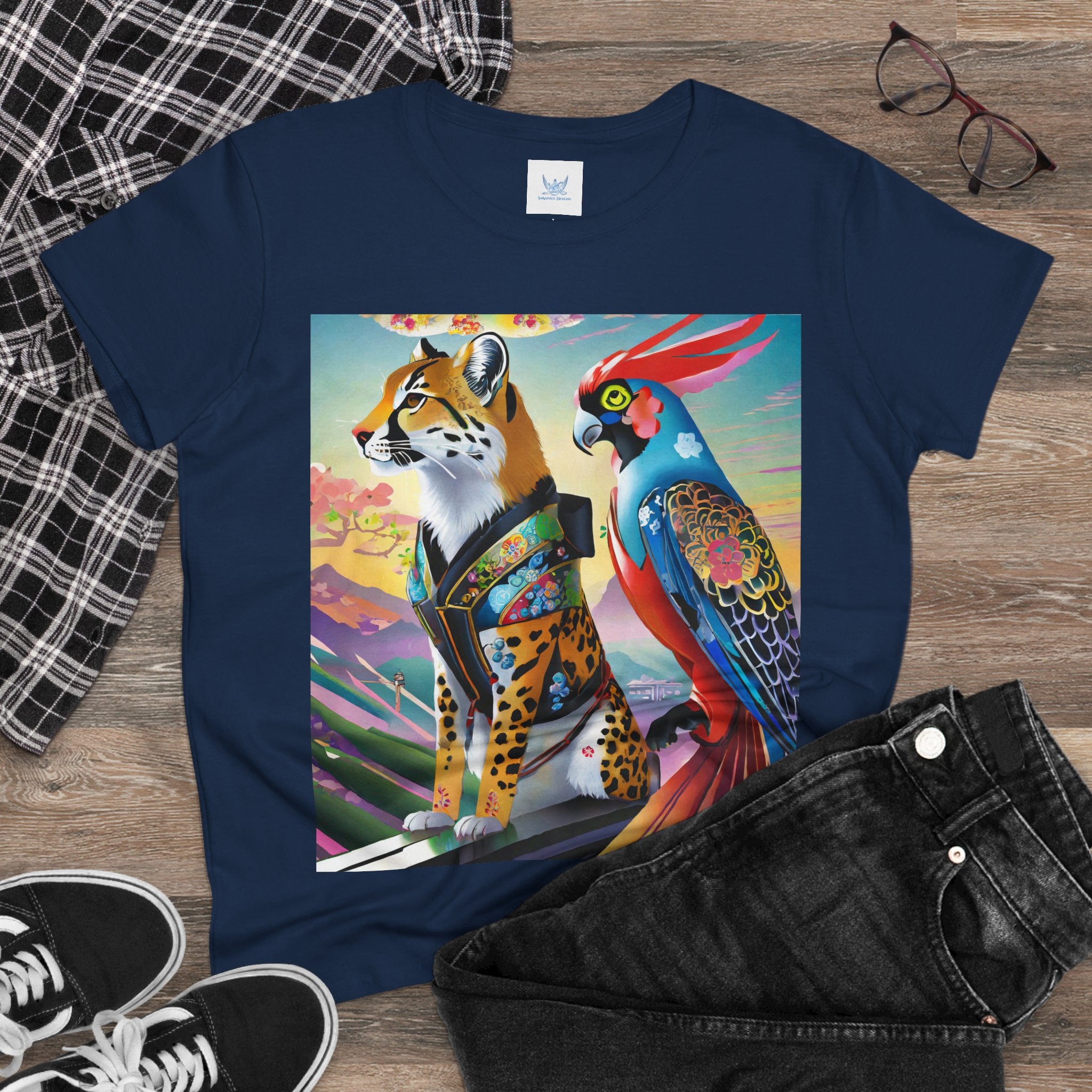 The featured artwork, Cybernetic Duets, showcases a cybernetic cheetah in a shimmering holographic dress and mysterious Kitsune mask striding with confident grace, while a cybernetic parrot beside it flaunts vibrant feathers enhanced with holographic displays and chrome wings. Together they create a mesmerizing fusion of natural elegance and technological prowess that defines cutting edge cyberpunk fashion.