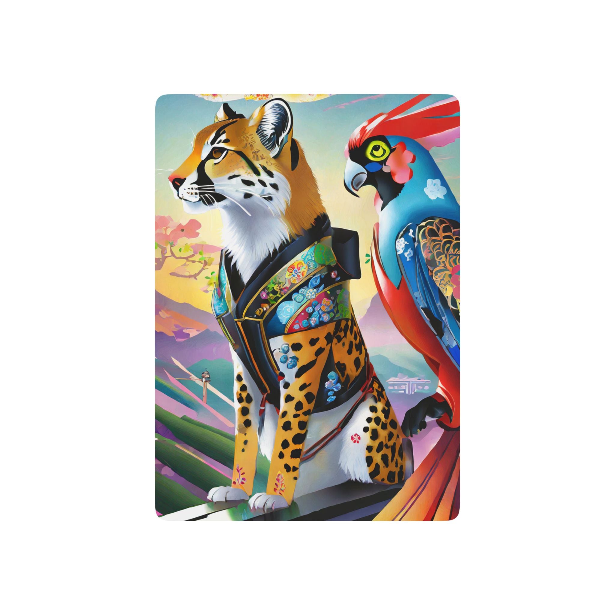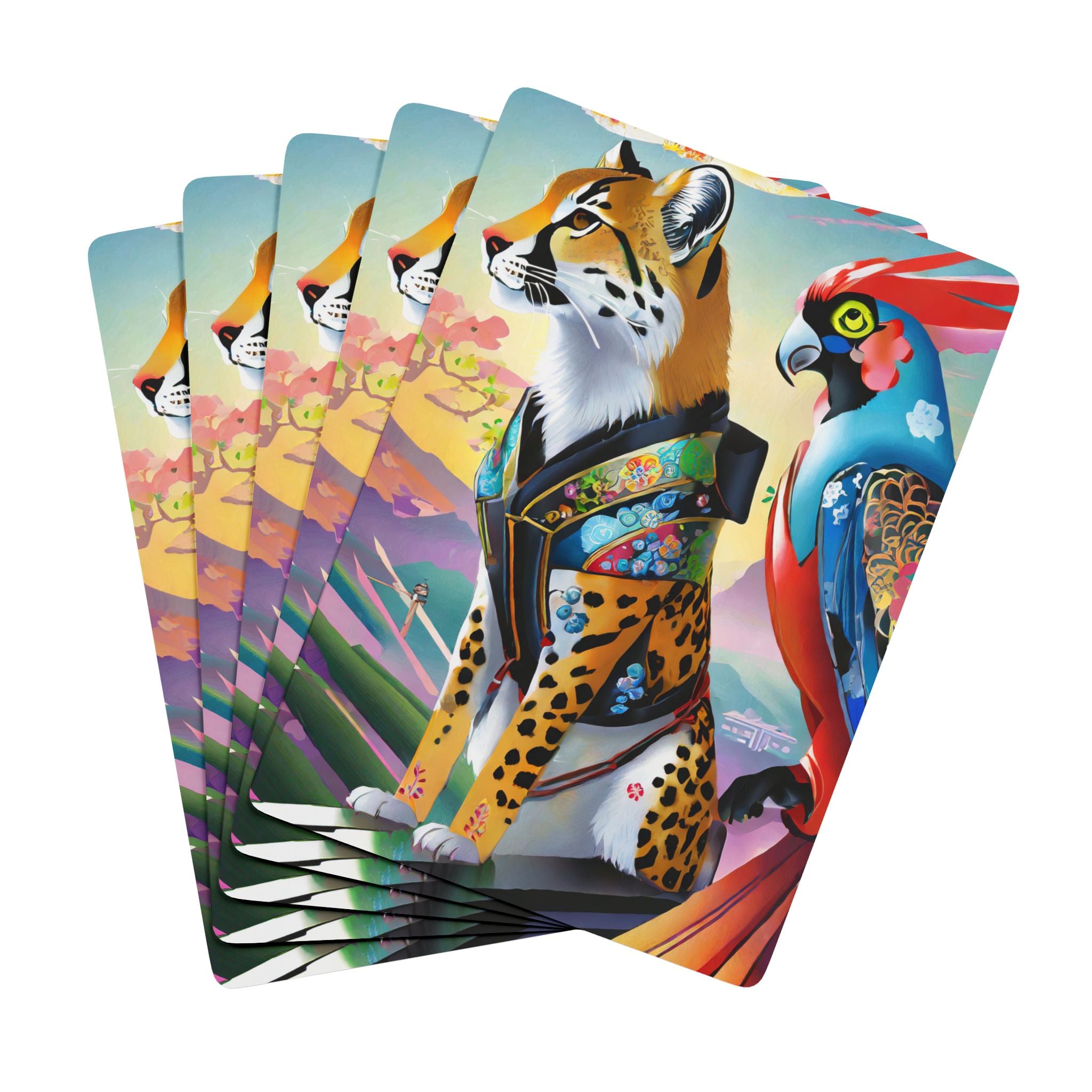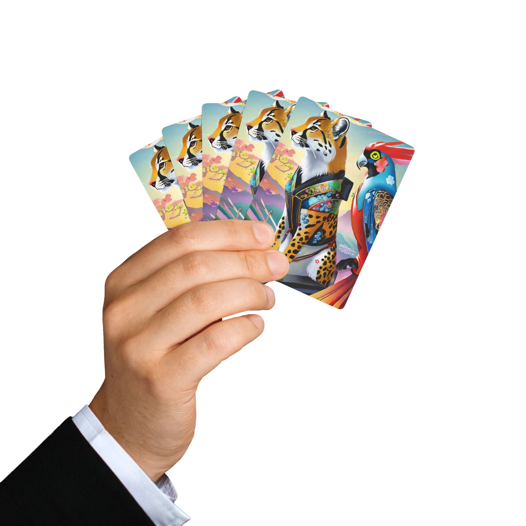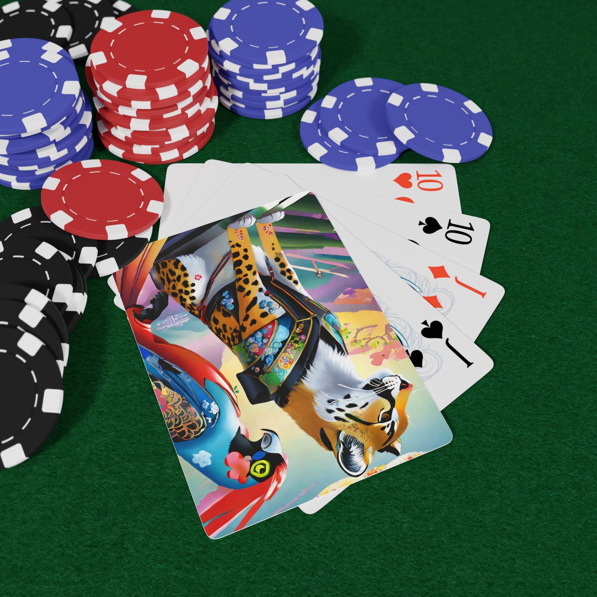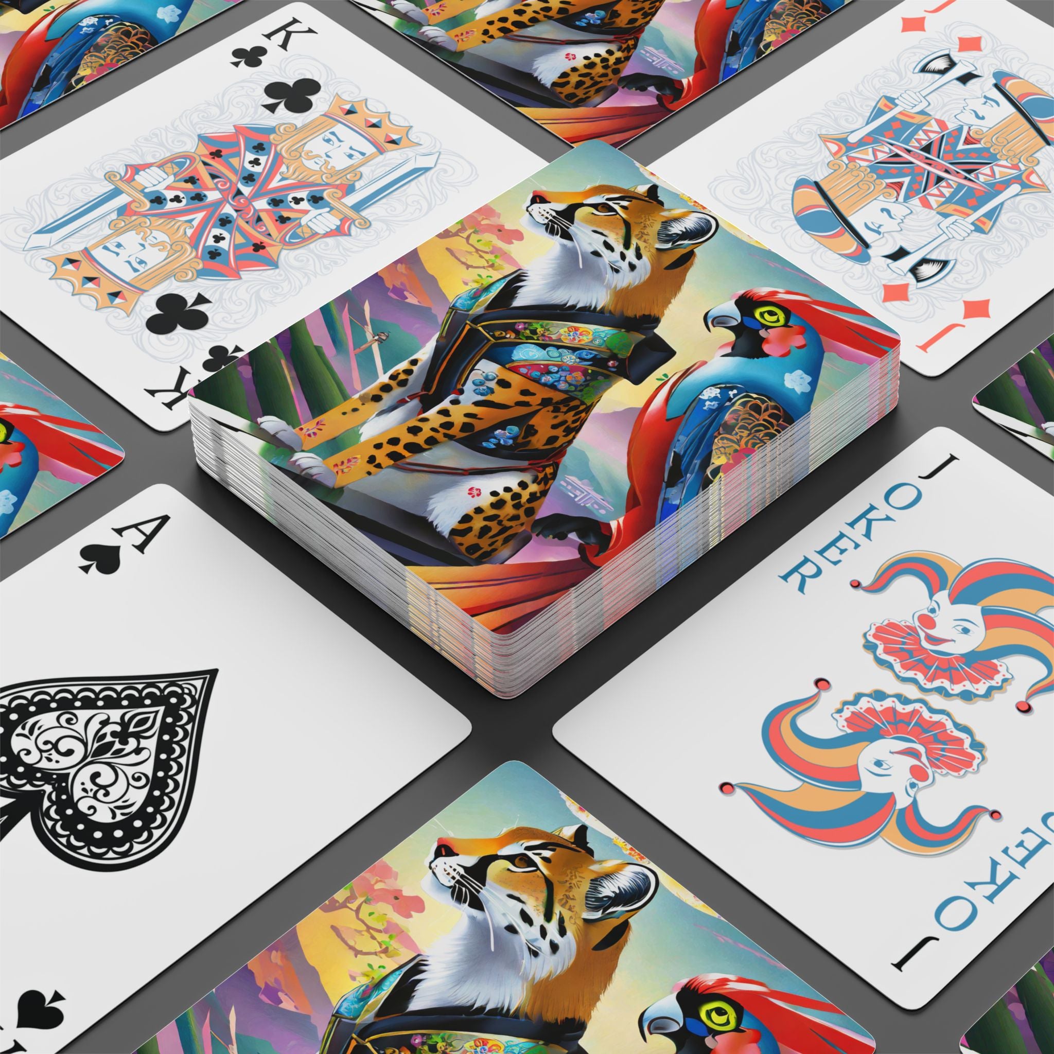 Poker and family game nights are a great deal of fun, but a deck of cards featuring “Cybernetic Duets” turns every hand into a performance of style and spectacle. This dazzling design showcases a cybernetic cheetah, draped in a shimmering holographic dress and donning a mysterious Kitsune mask, striding with confidence. Alongside, a vibrant cybernetic parrot flashes holographic feathers and chrome wings—together, they create a mesmerizing fusion of natural grace and high-tech flair that defines the cutting edge of fashion in the cyberpunk world.