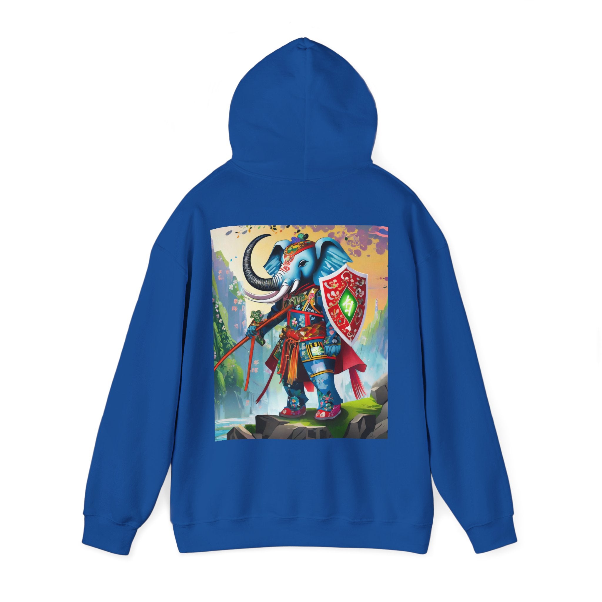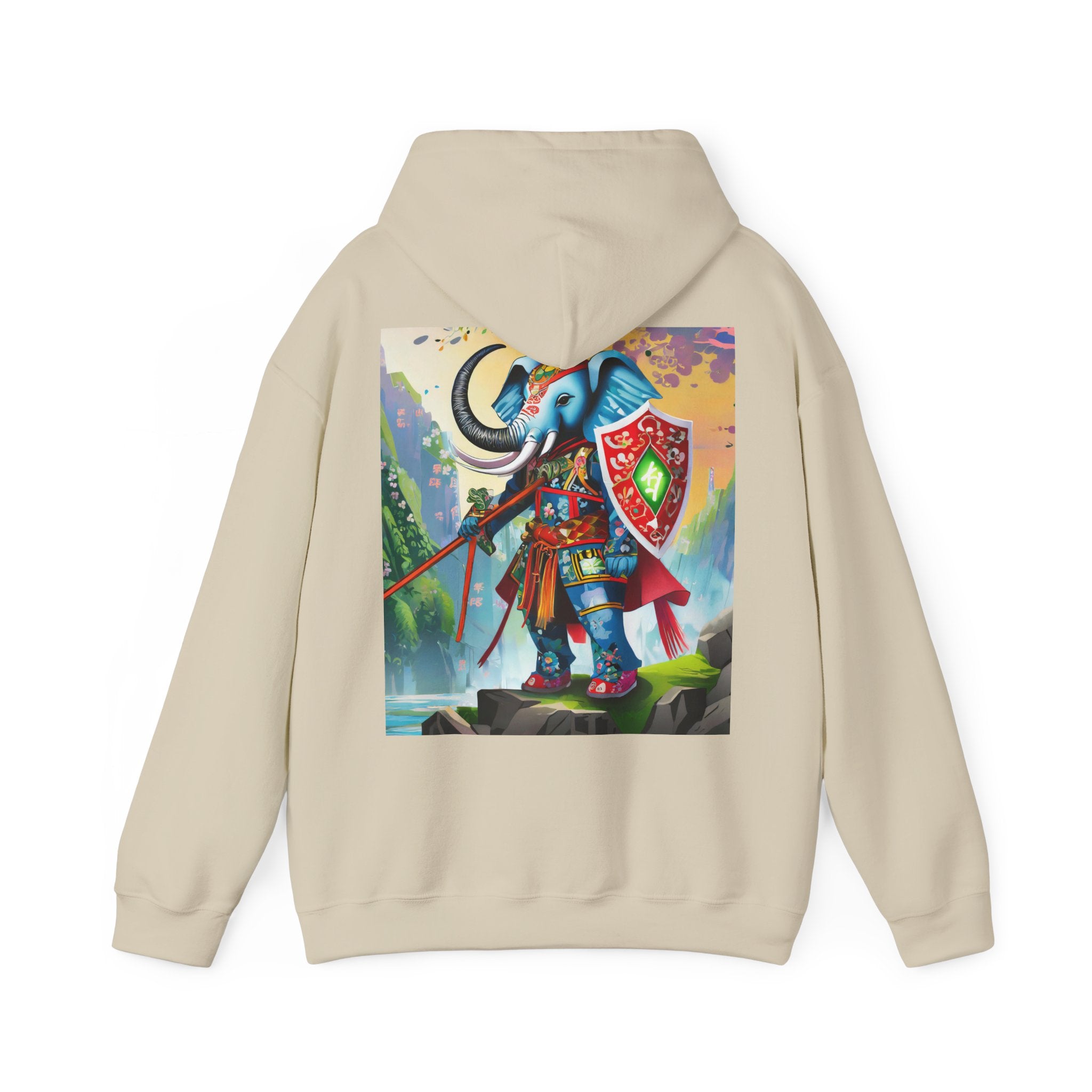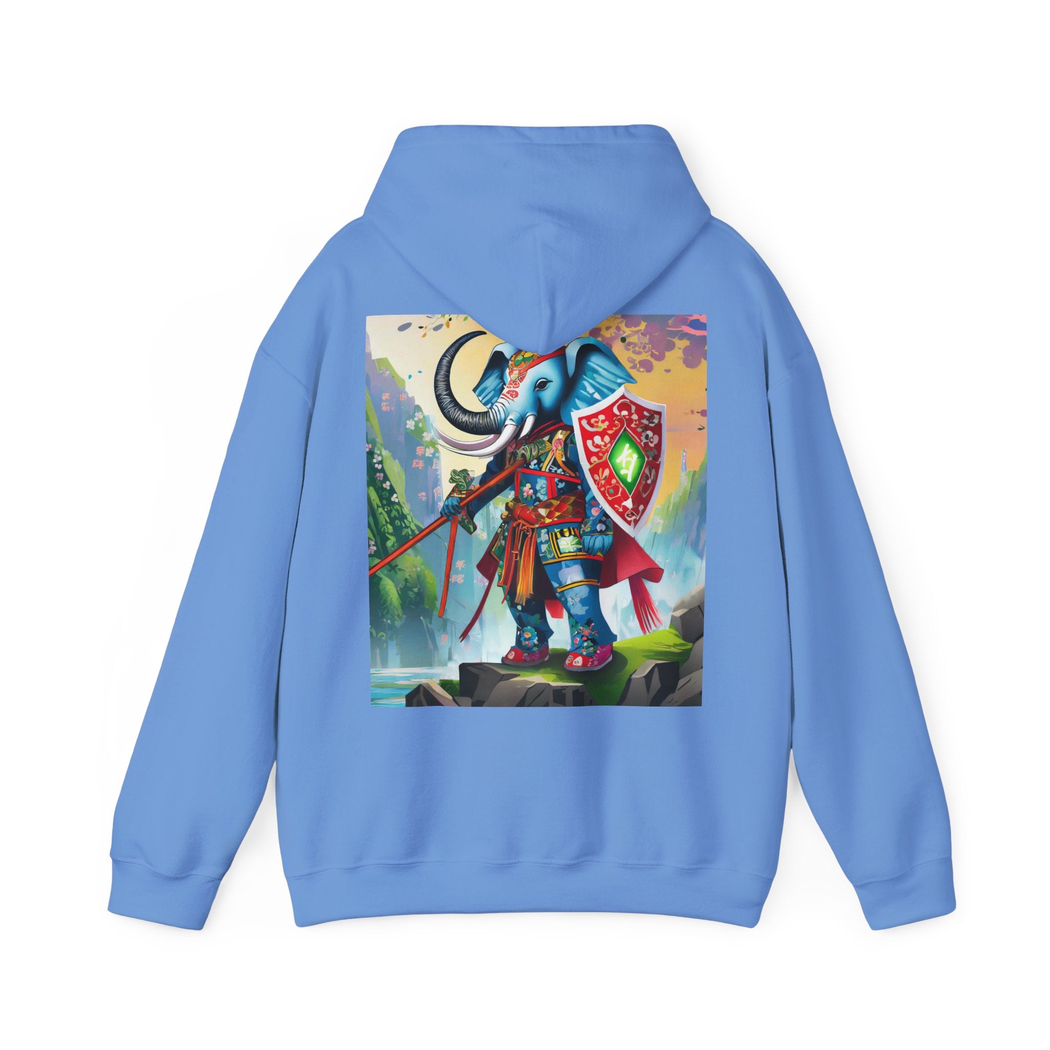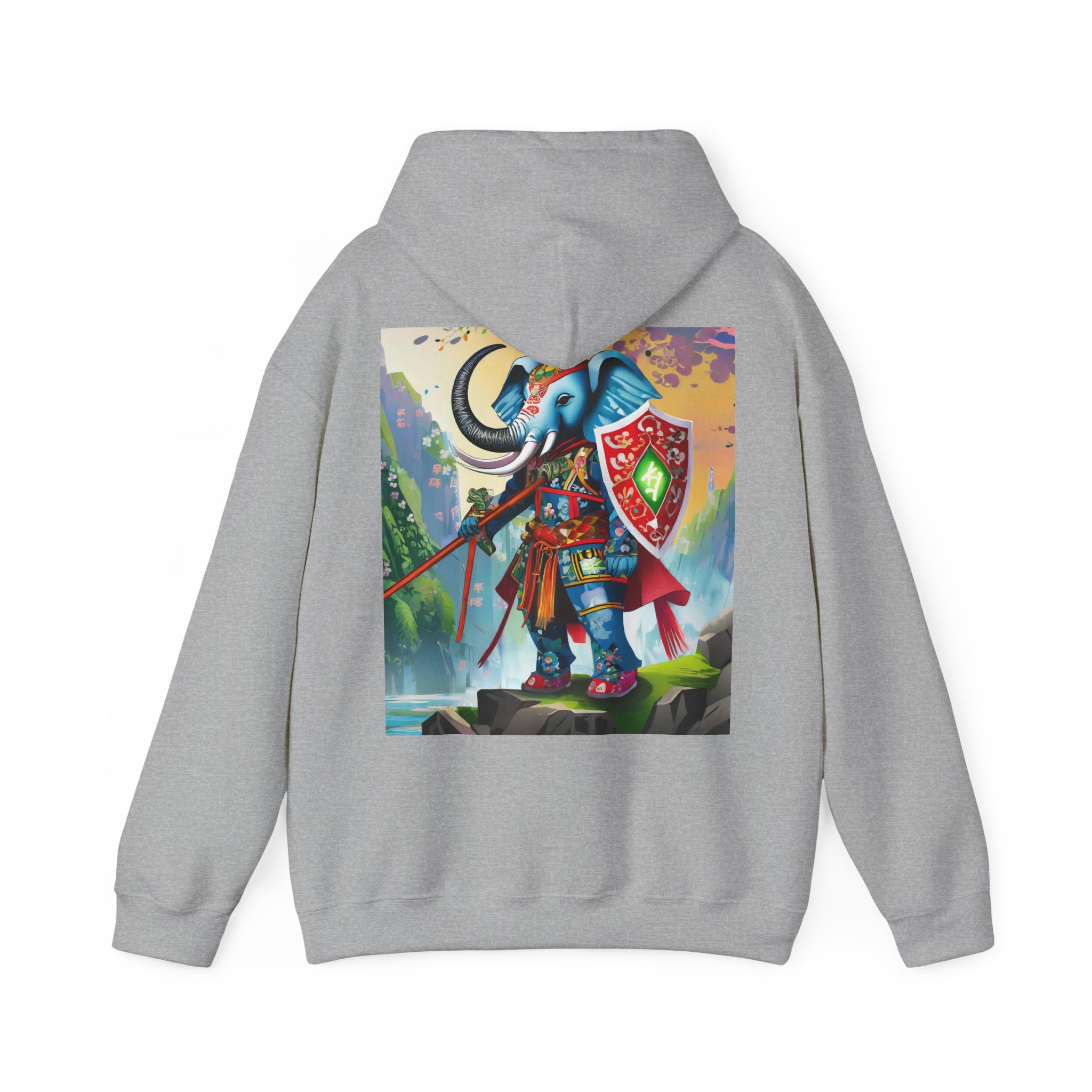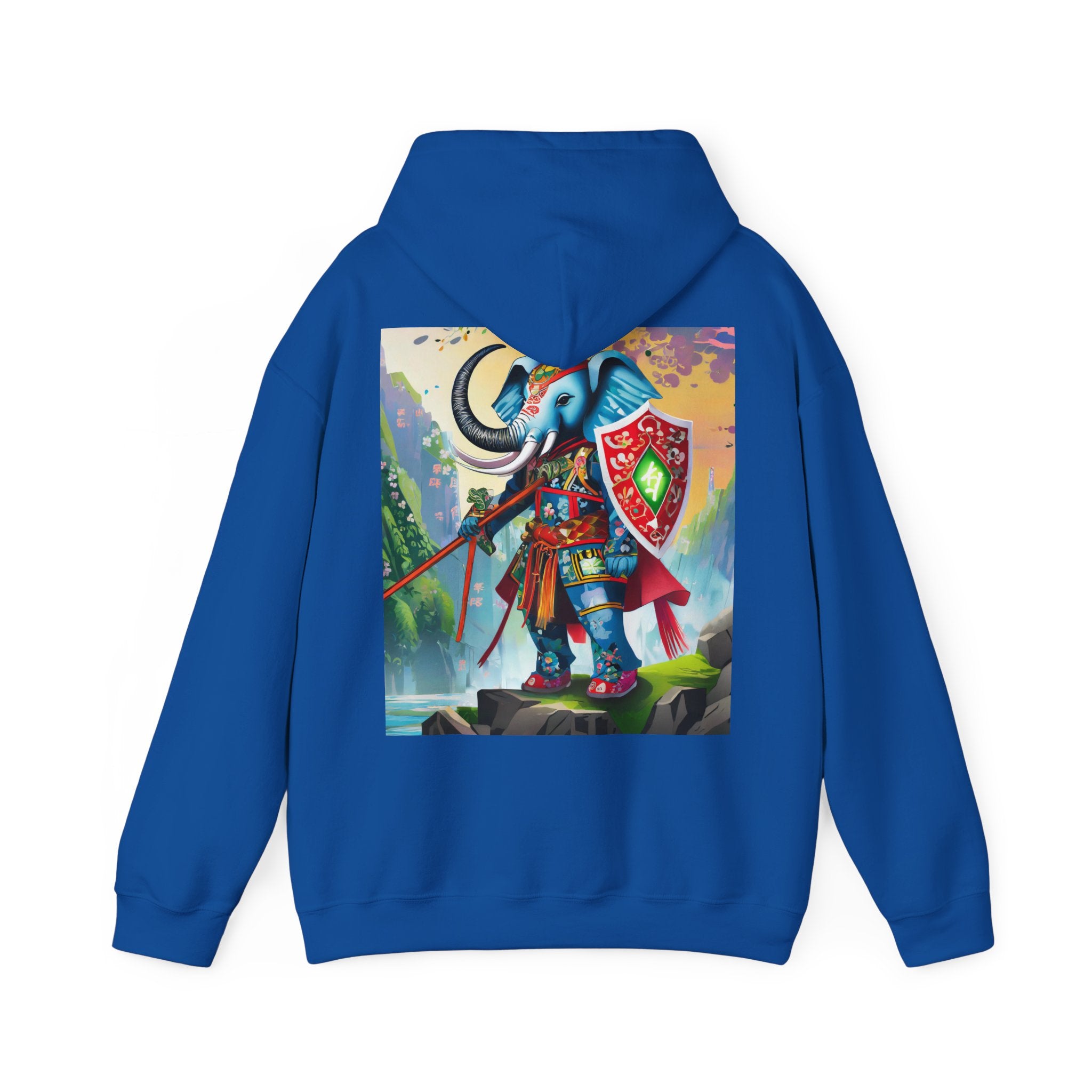 Cyberpunk Elephant blends strength, wisdom, and serenity in a stunning fusion of tradition and futurism. The artwork features a majestic blue elephant warrior standing proudly on rocky terrain, wearing ornate samurai-style armor with red, gold, and jade-green details. In one hand, he holds a long spear; in the other, a decorated shield with glowing emerald accents, symbolizing both courage and protection.