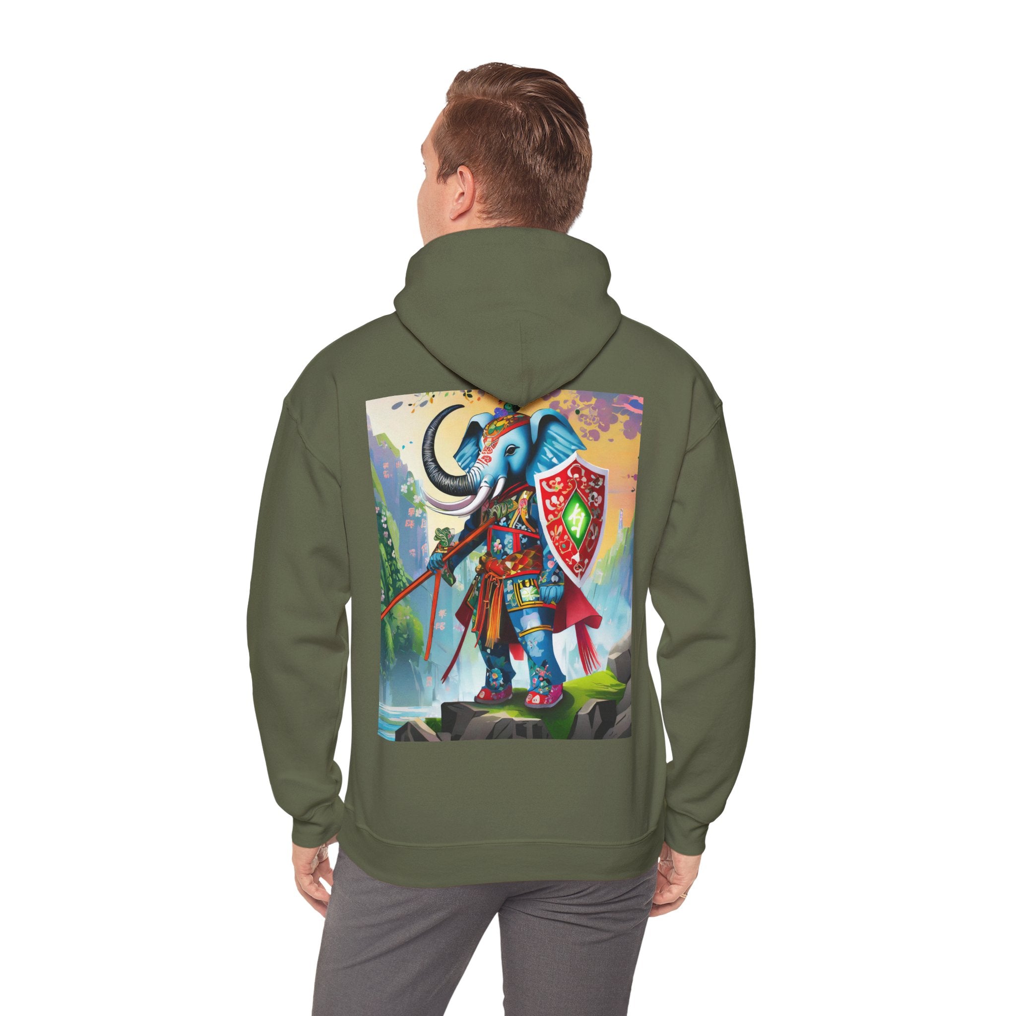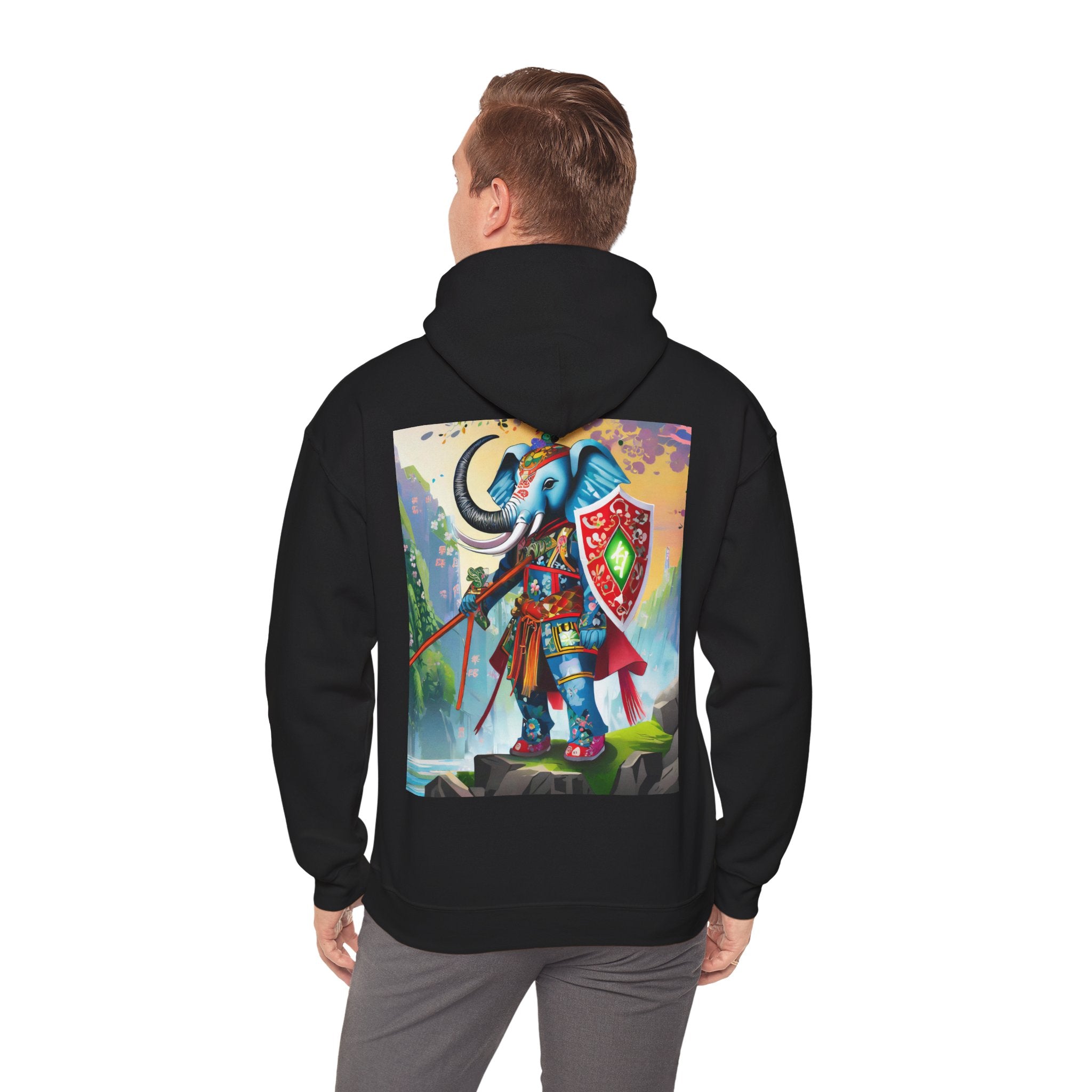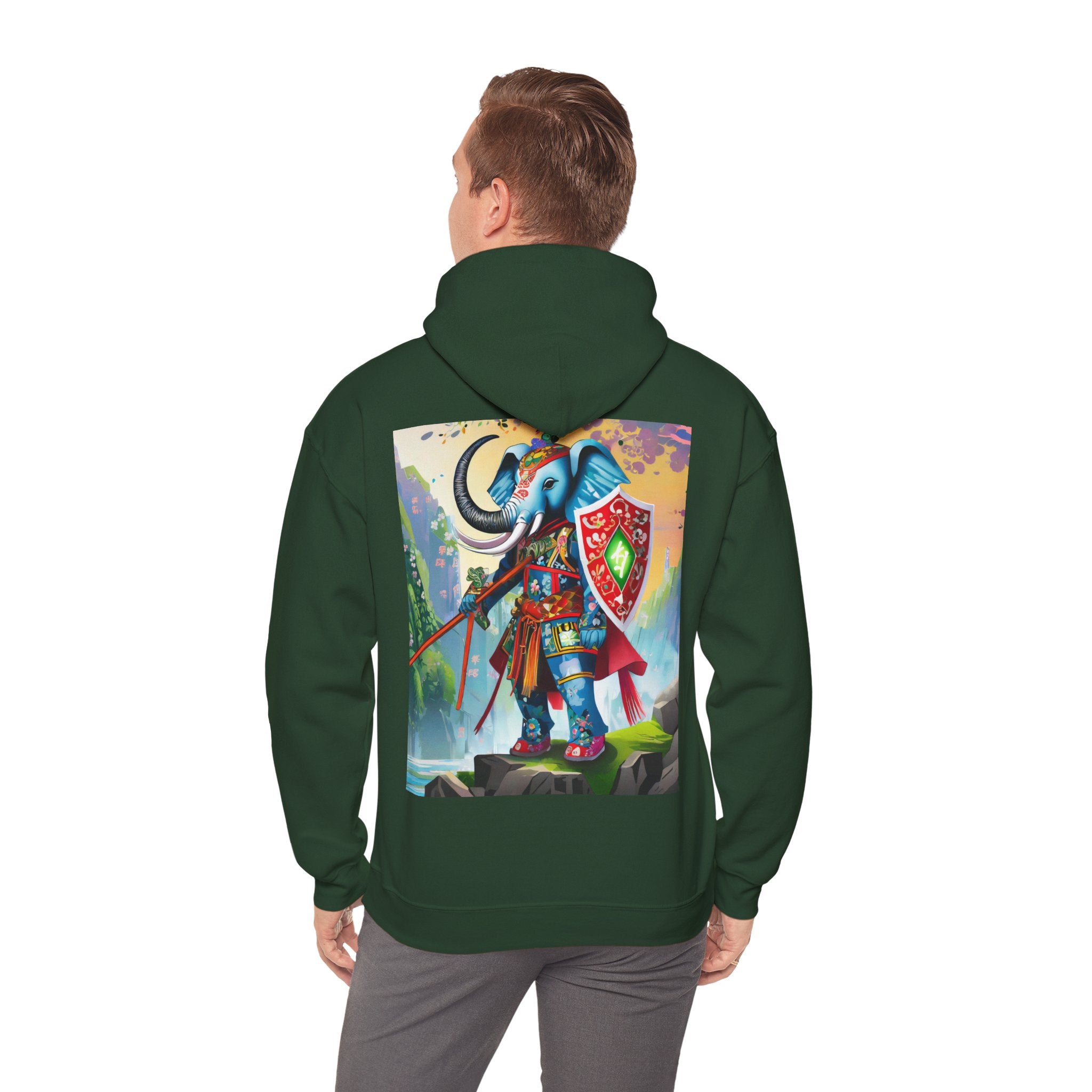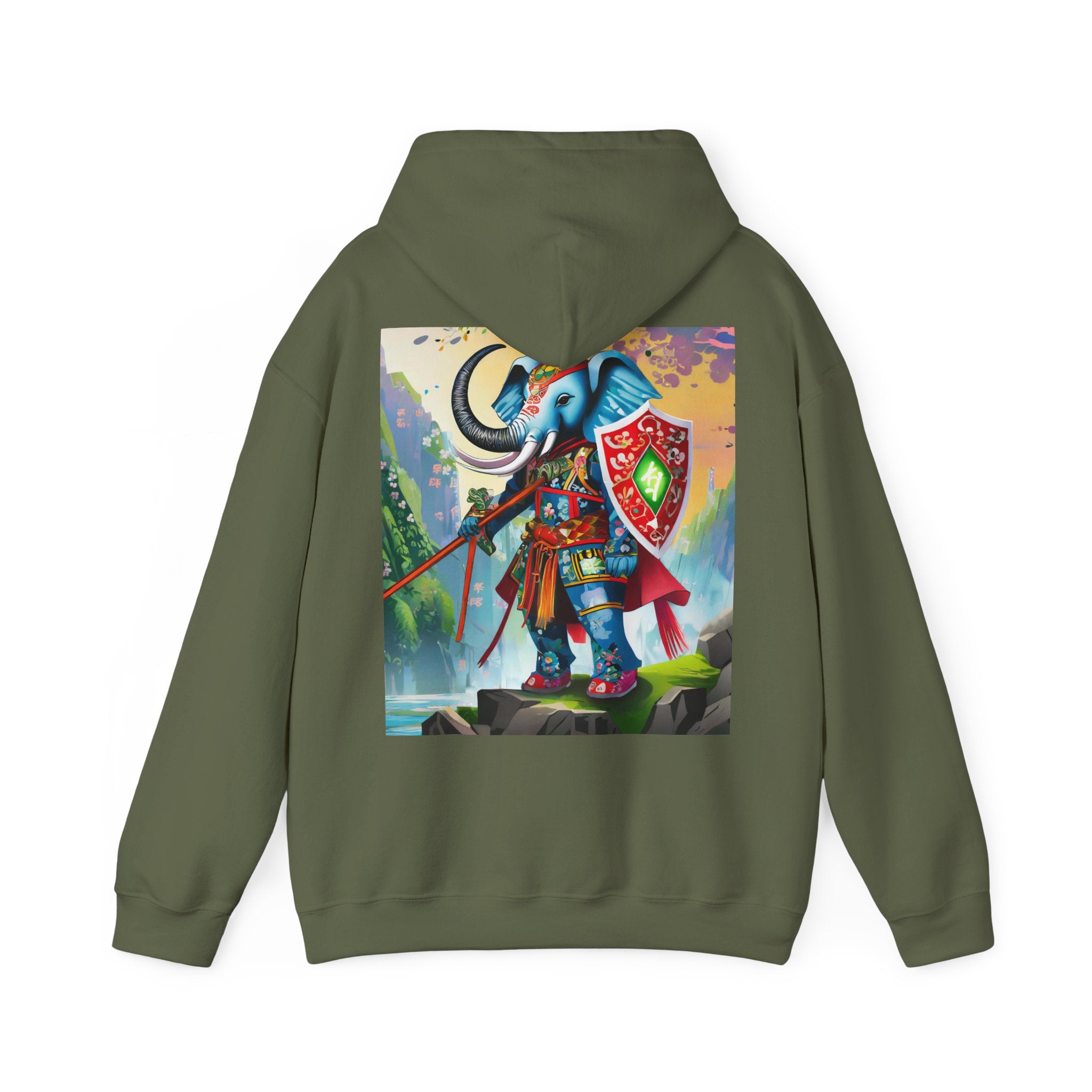 Cyberpunk Elephant blends strength, wisdom, and serenity in a stunning fusion of tradition and futurism. The artwork features a majestic blue elephant warrior standing proudly on rocky terrain, wearing ornate samurai-style armor with red, gold, and jade-green details. In one hand, he holds a long spear; in the other, a decorated shield with glowing emerald accents, symbolizing both courage and protection.