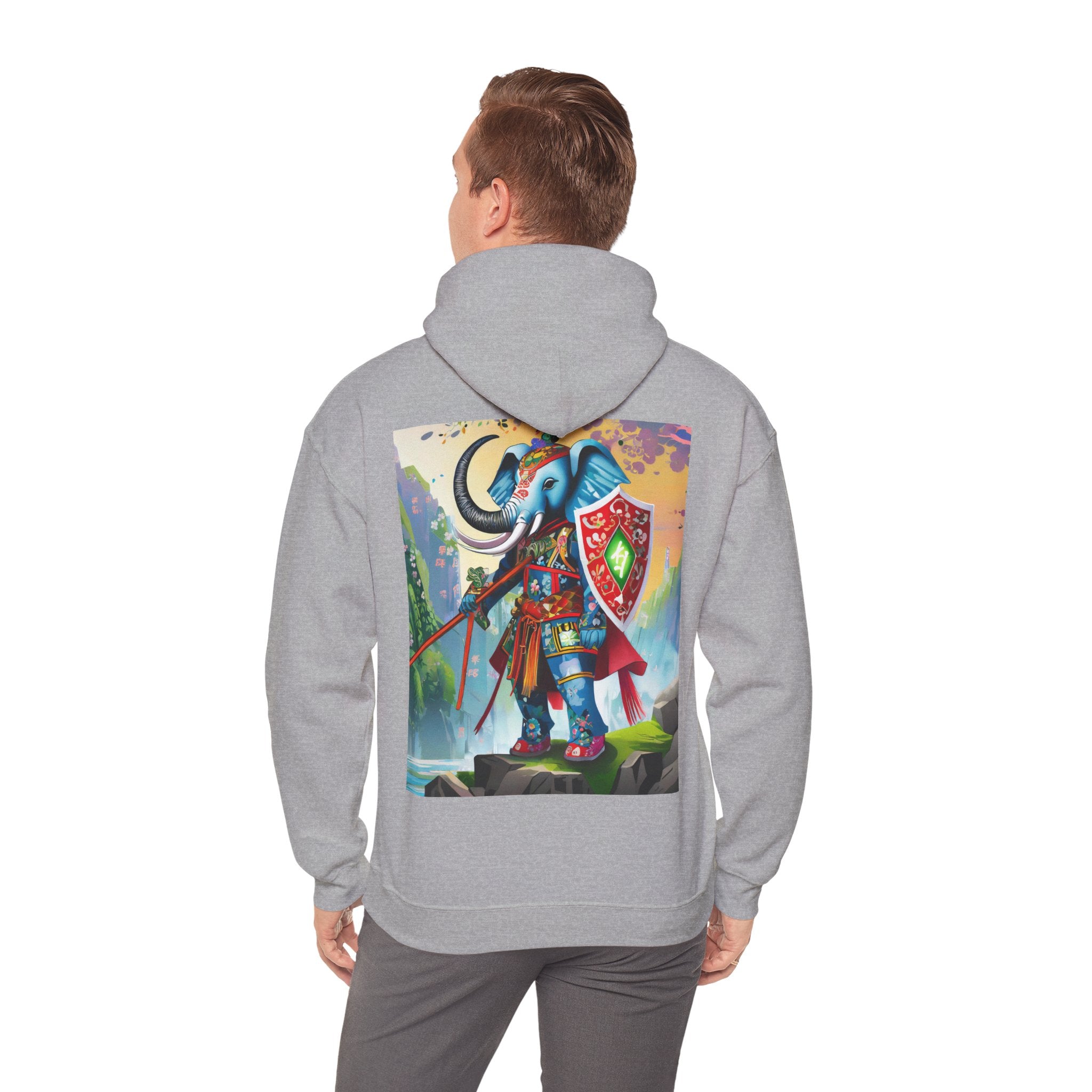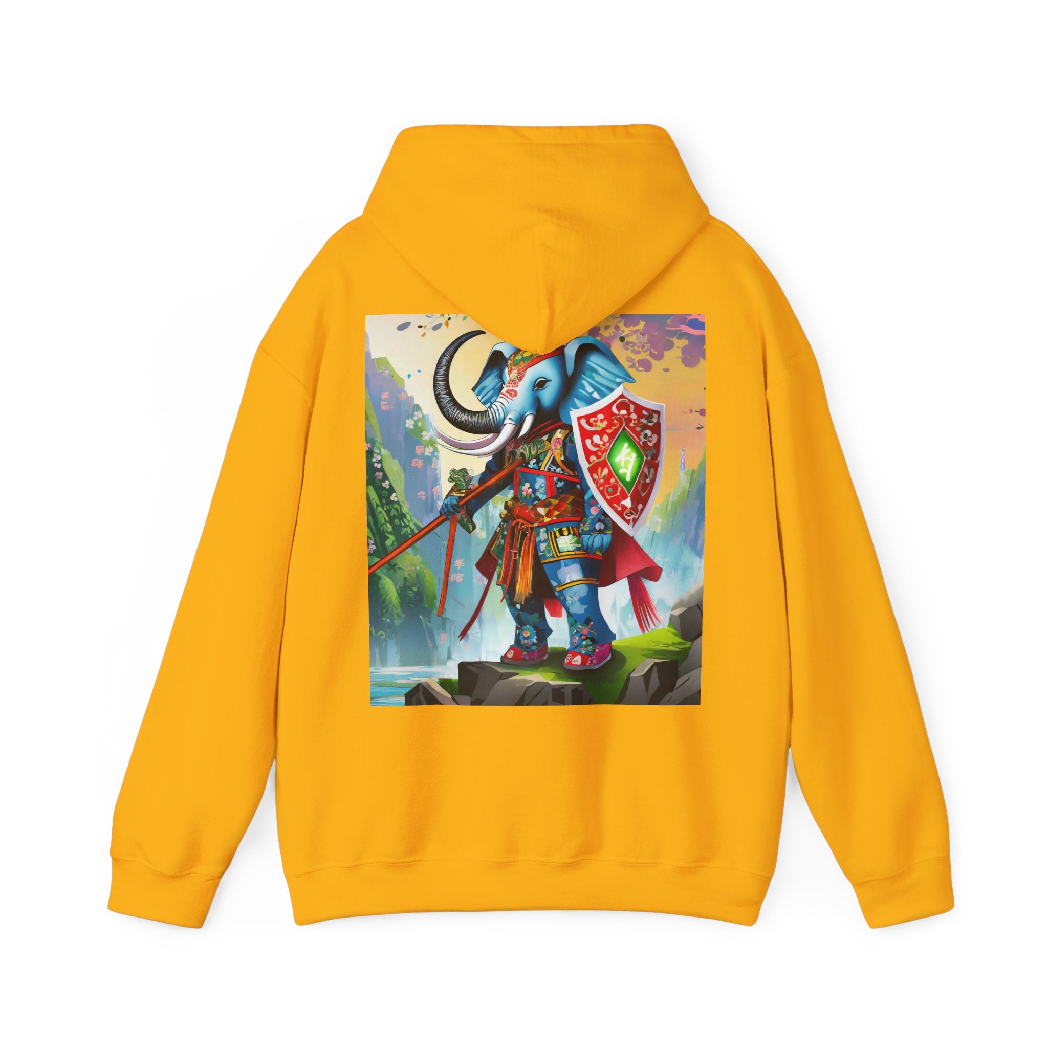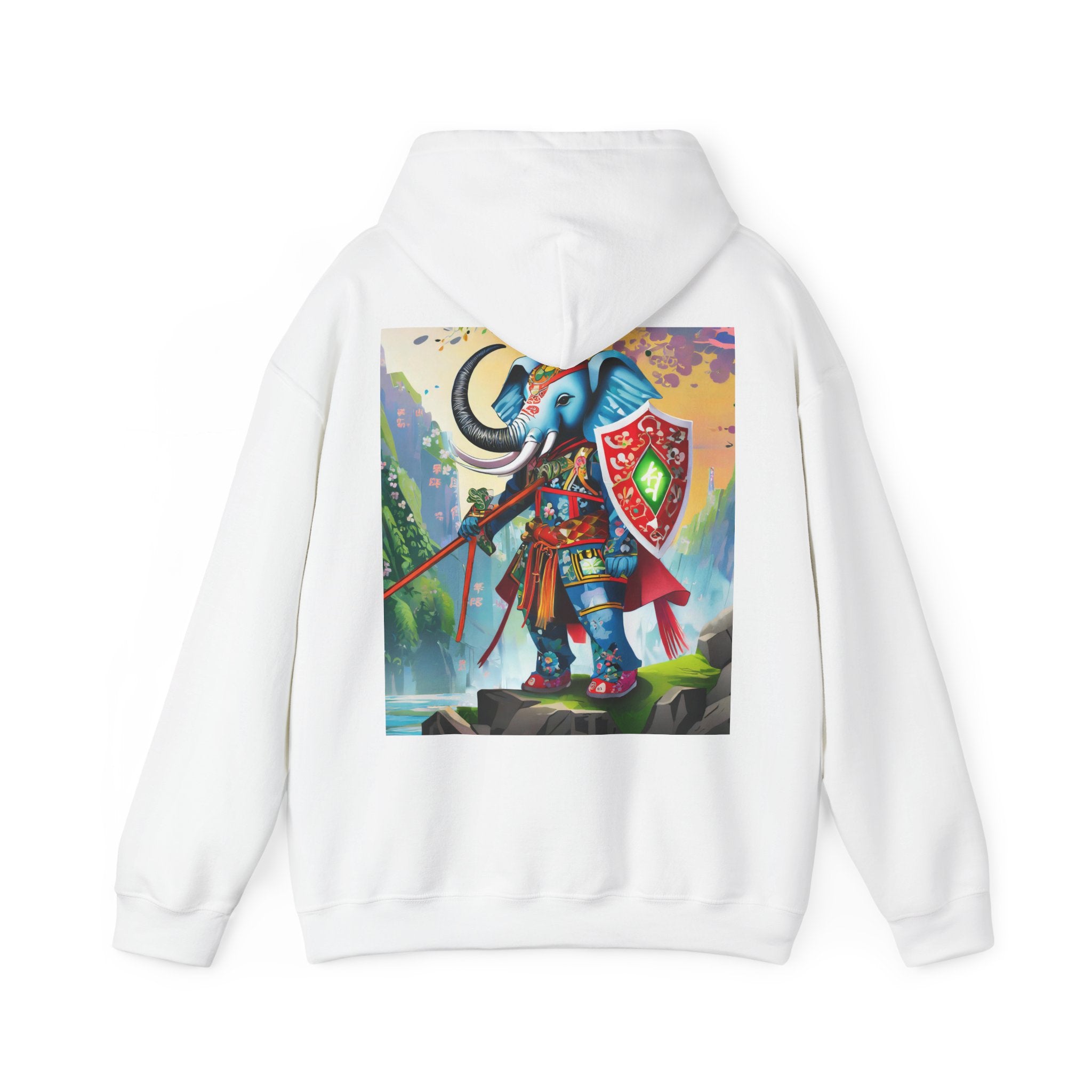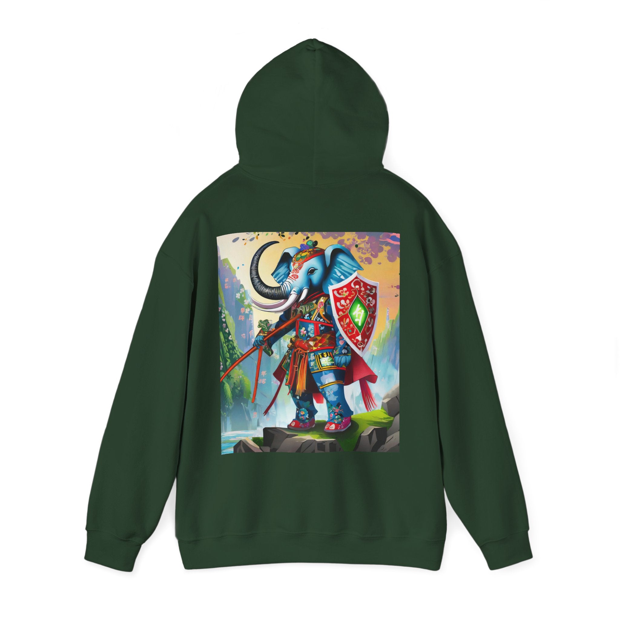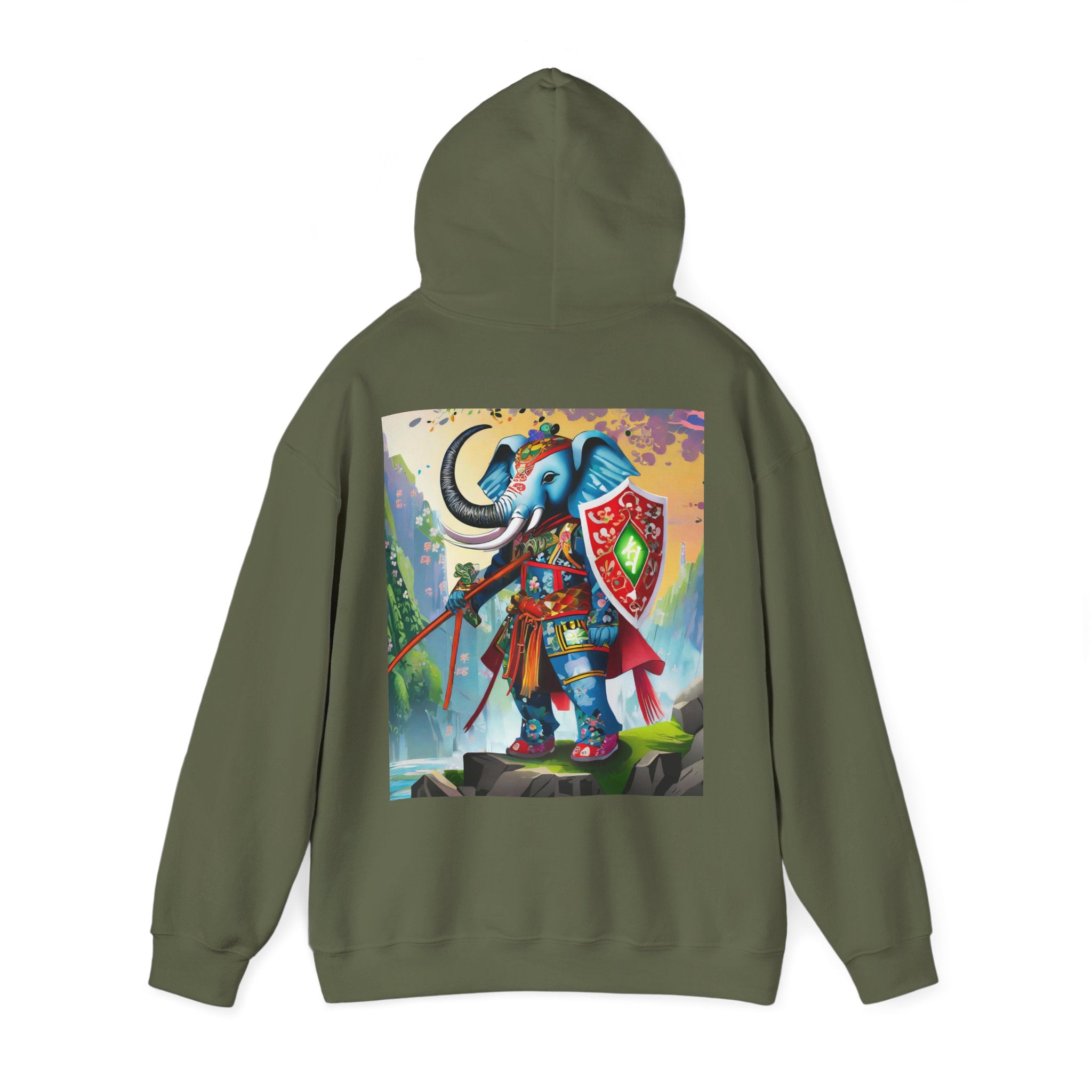 Cyberpunk Elephant blends strength, wisdom, and serenity in a stunning fusion of tradition and futurism. The artwork features a majestic blue elephant warrior standing proudly on rocky terrain, wearing ornate samurai-style armor with red, gold, and jade-green details. In one hand, he holds a long spear; in the other, a decorated shield with glowing emerald accents, symbolizing both courage and protection.