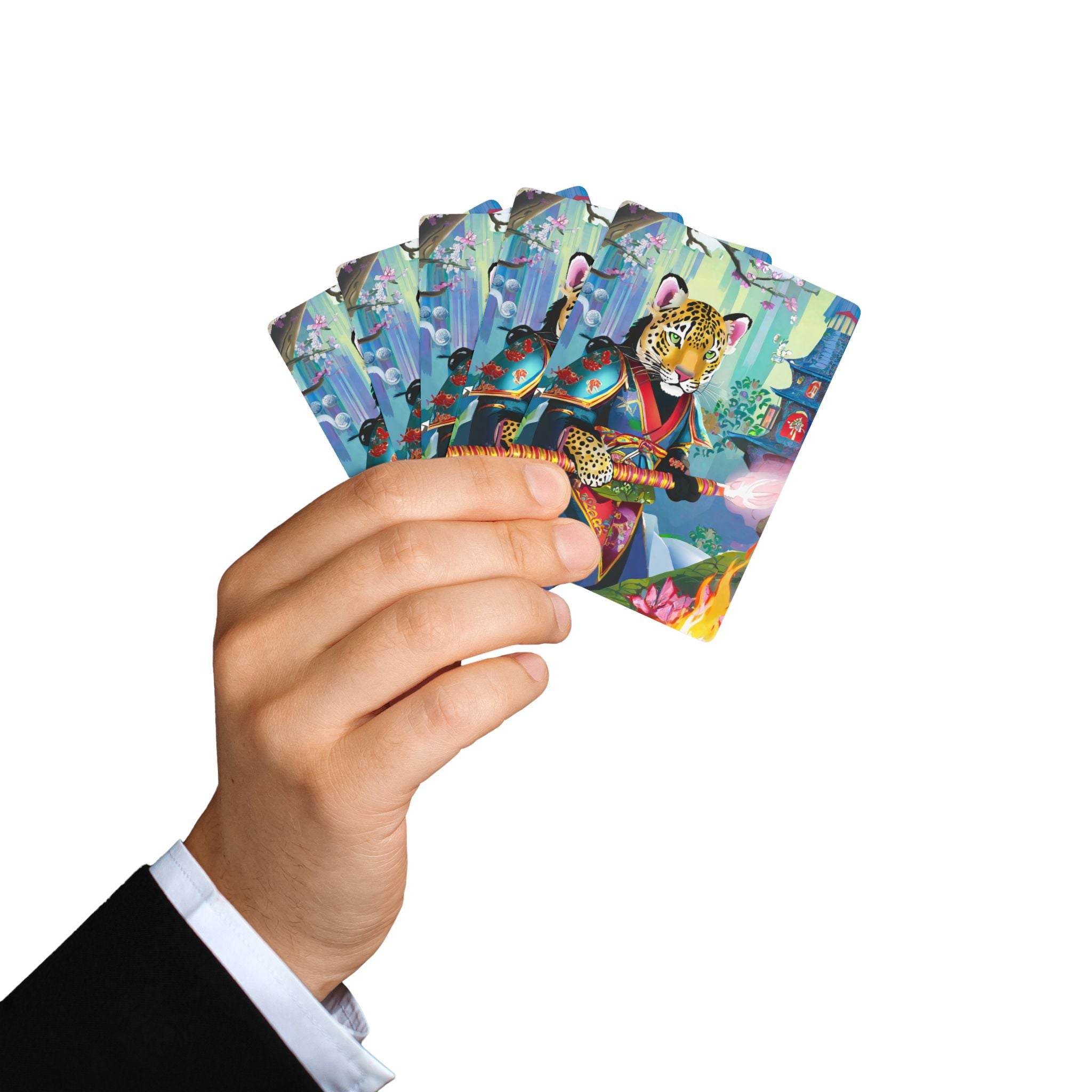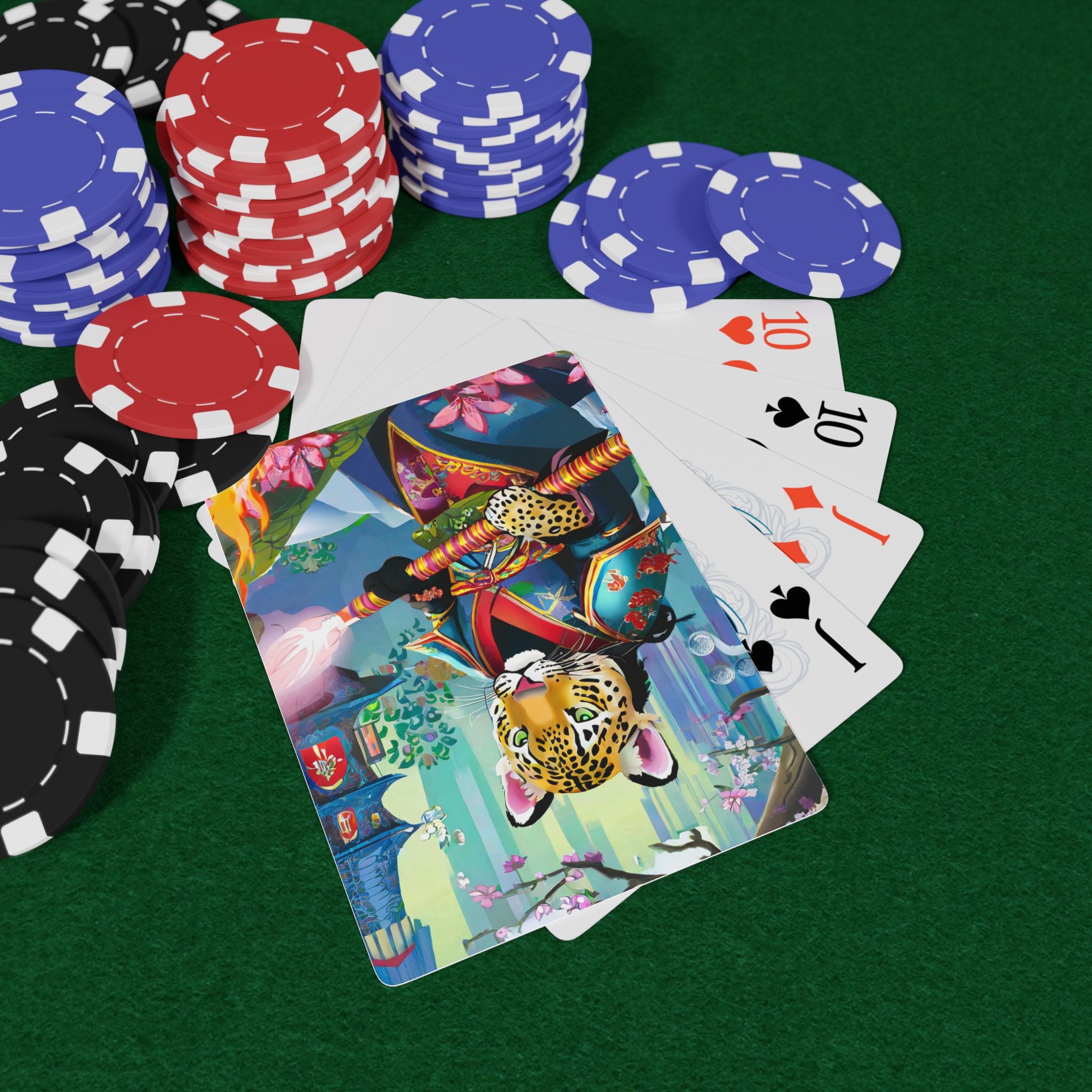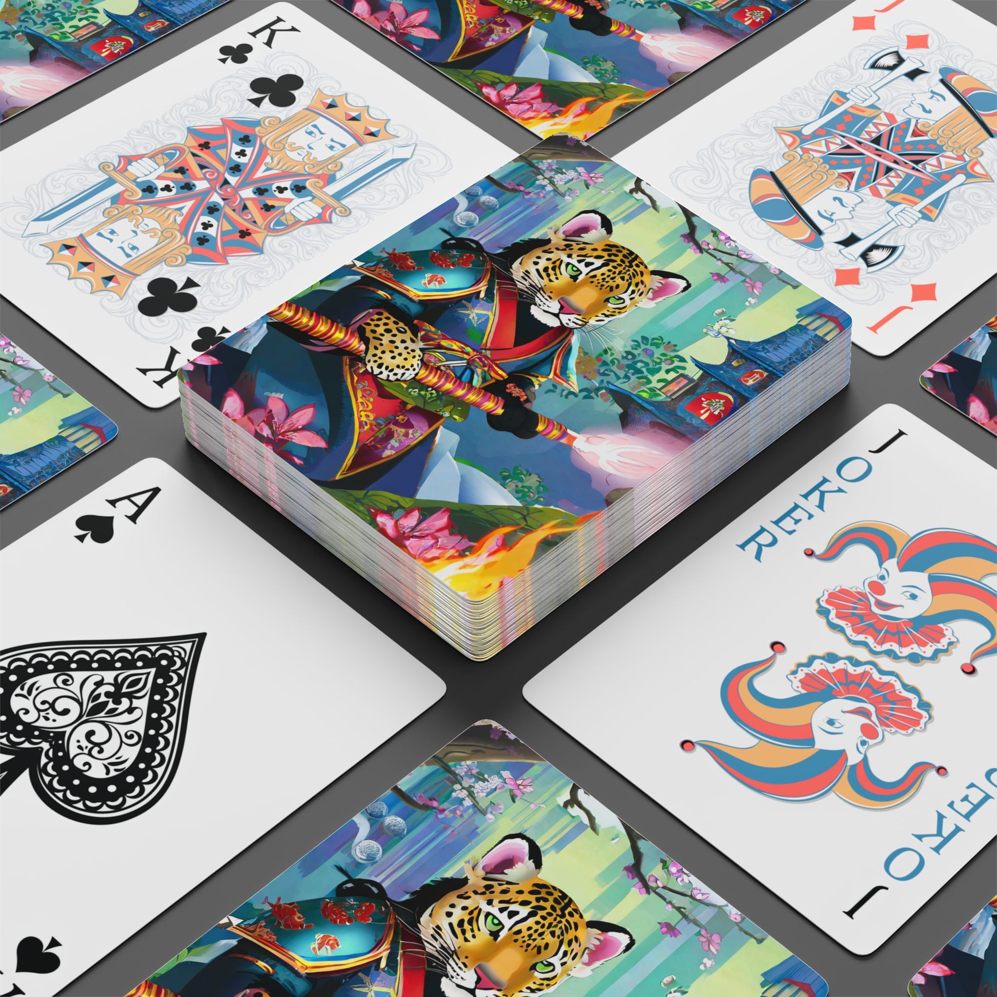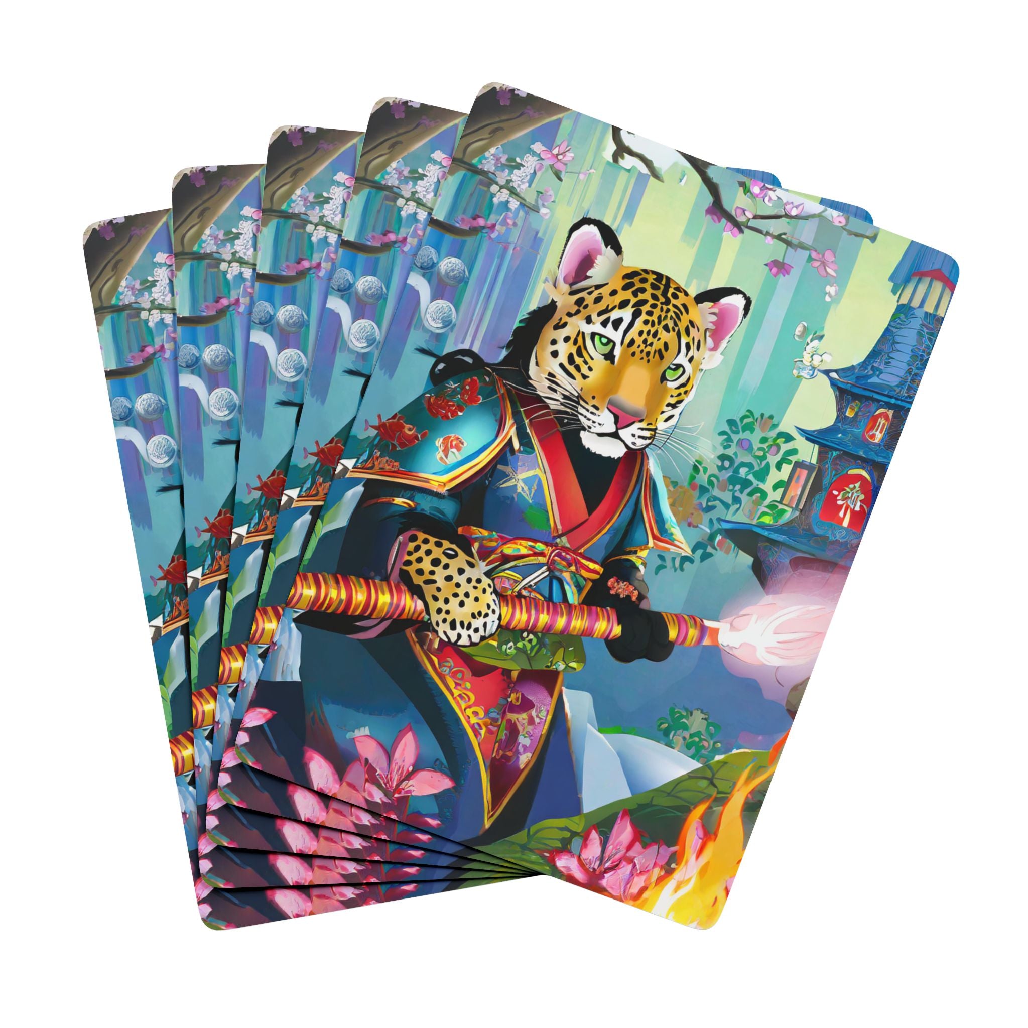 Poker and family game nights are a great deal of fun, but a deck of cards featuring “Cyberpunk Leopard” brings a bold fusion of magic and technology to the table. In front of a cyberpunk magical castle, a cyber-enhanced leopard practices wizardry—blending ancient spells with futuristic tech amidst neon-lit corridors. This enchanting design captures the wild elegance of the leopard alongside the mystique of sorcery in a glowing digital realm.