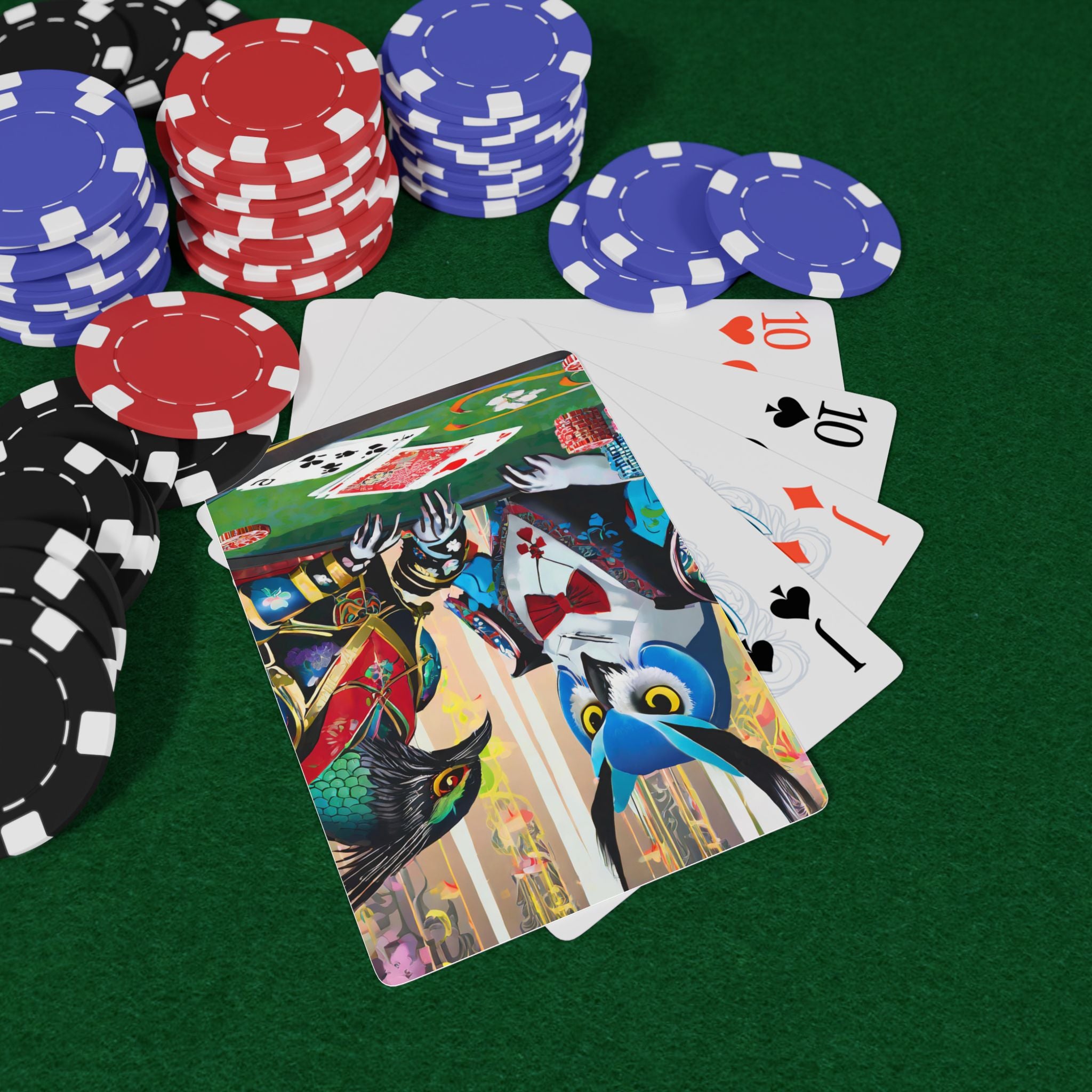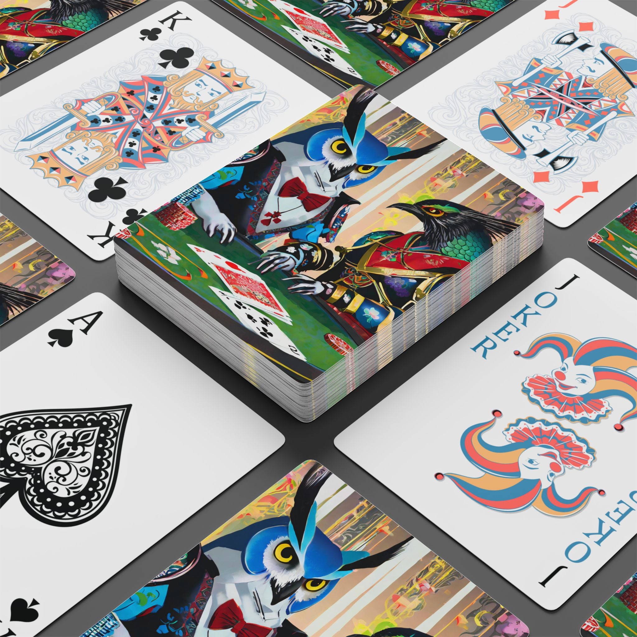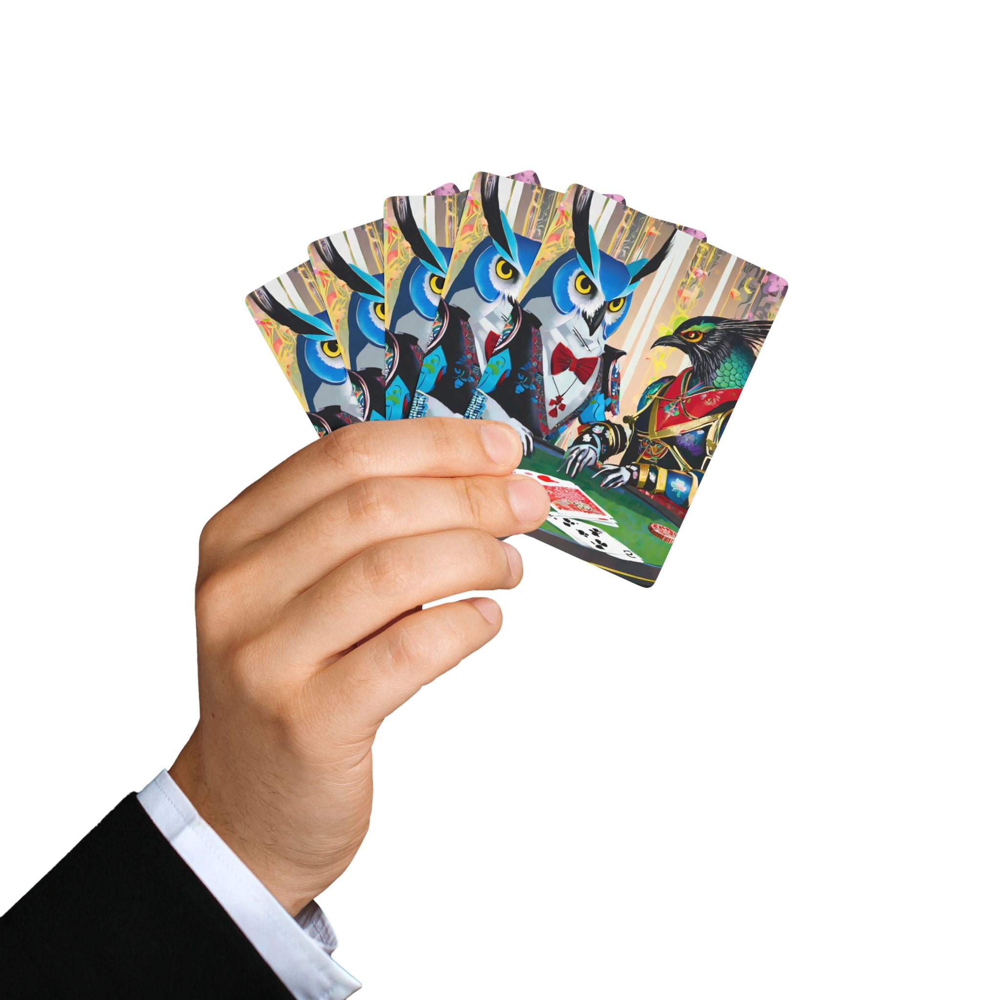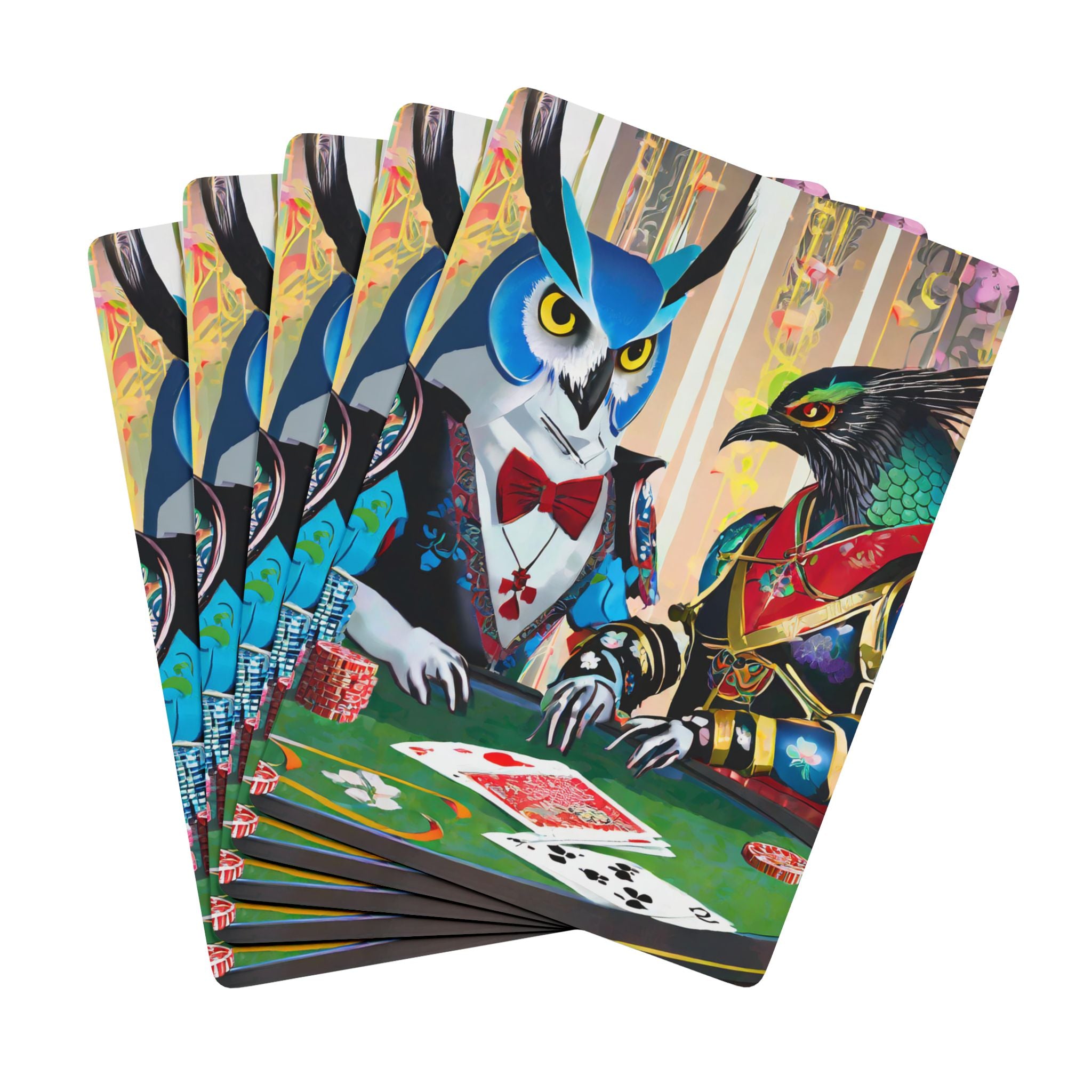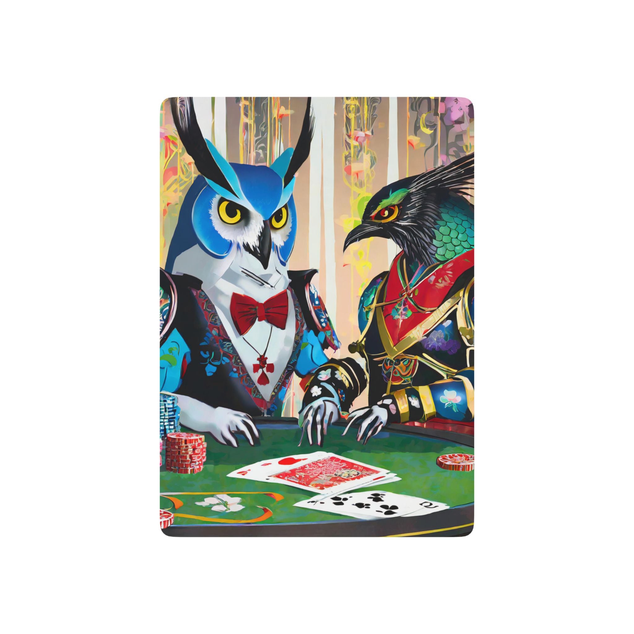 Poker and family game nights are a great deal of fun, but a deck of cards featuring high fashion cyber punk samurai owl and raven characters takes it to the next level. These bold, imaginative designs capture the intensity of a Texas Hold 'Em showdown at a futuristic cyberpunk casino, where sleek, armored owls and ravens bring style and strategy to the table.